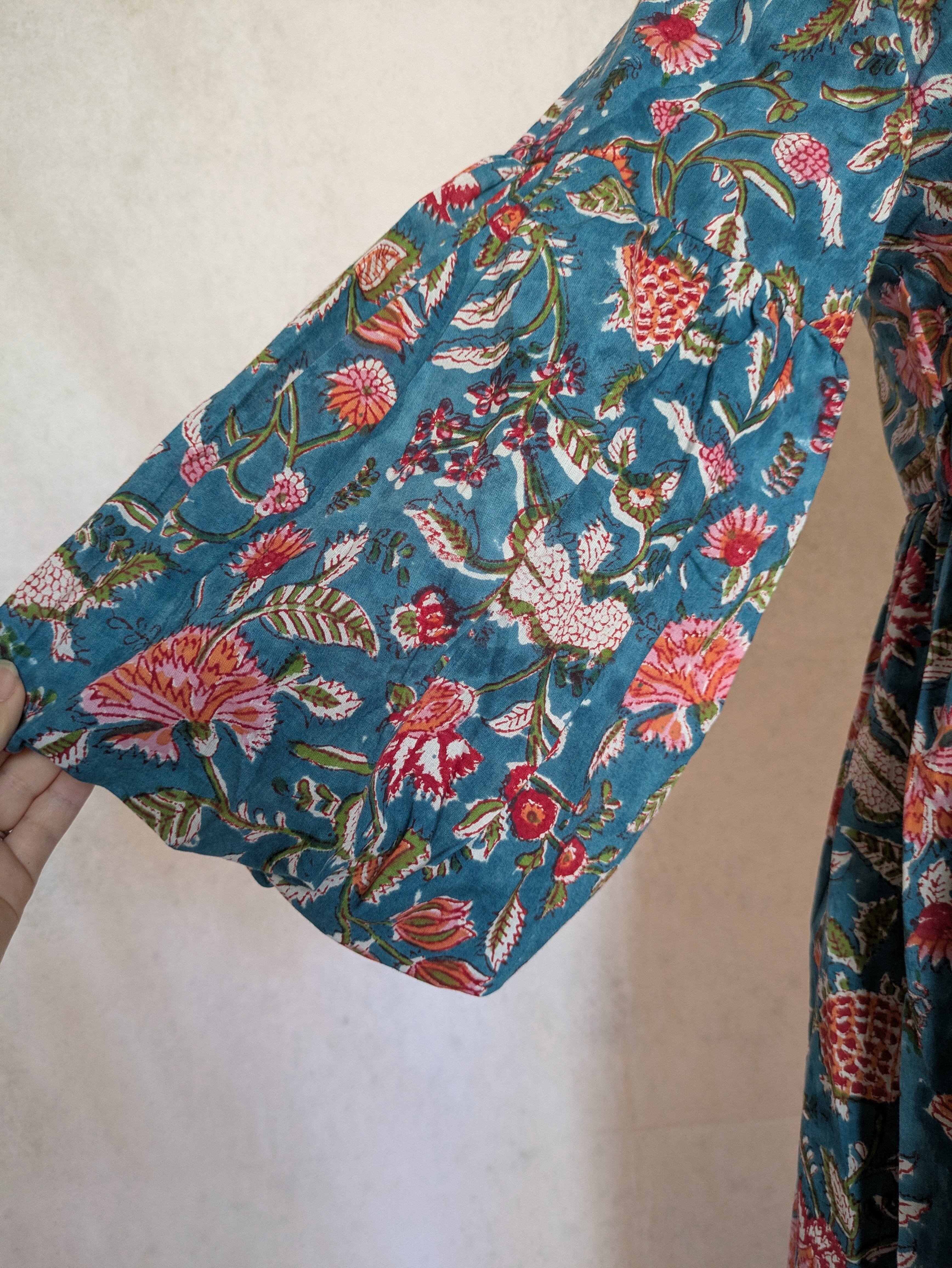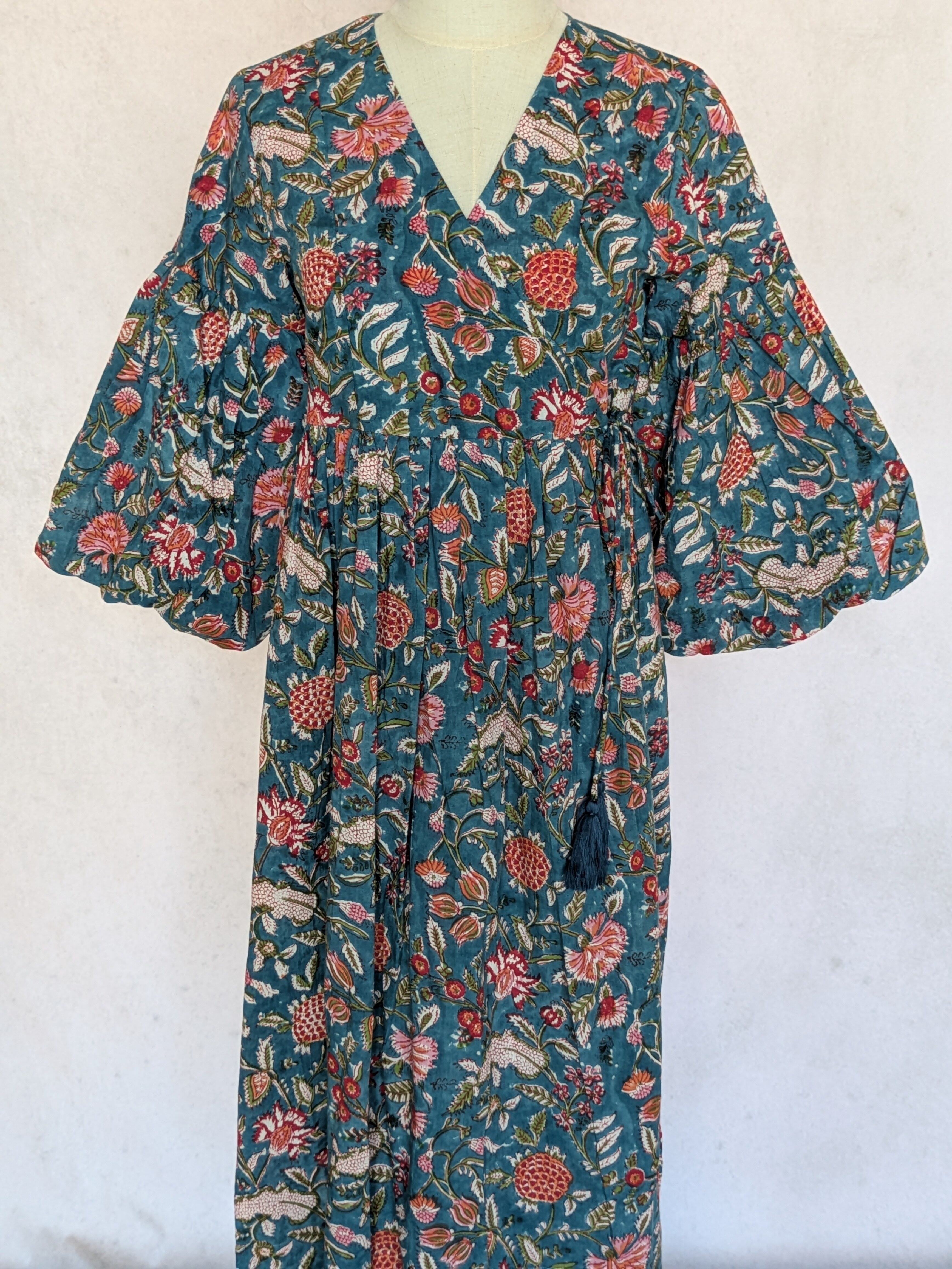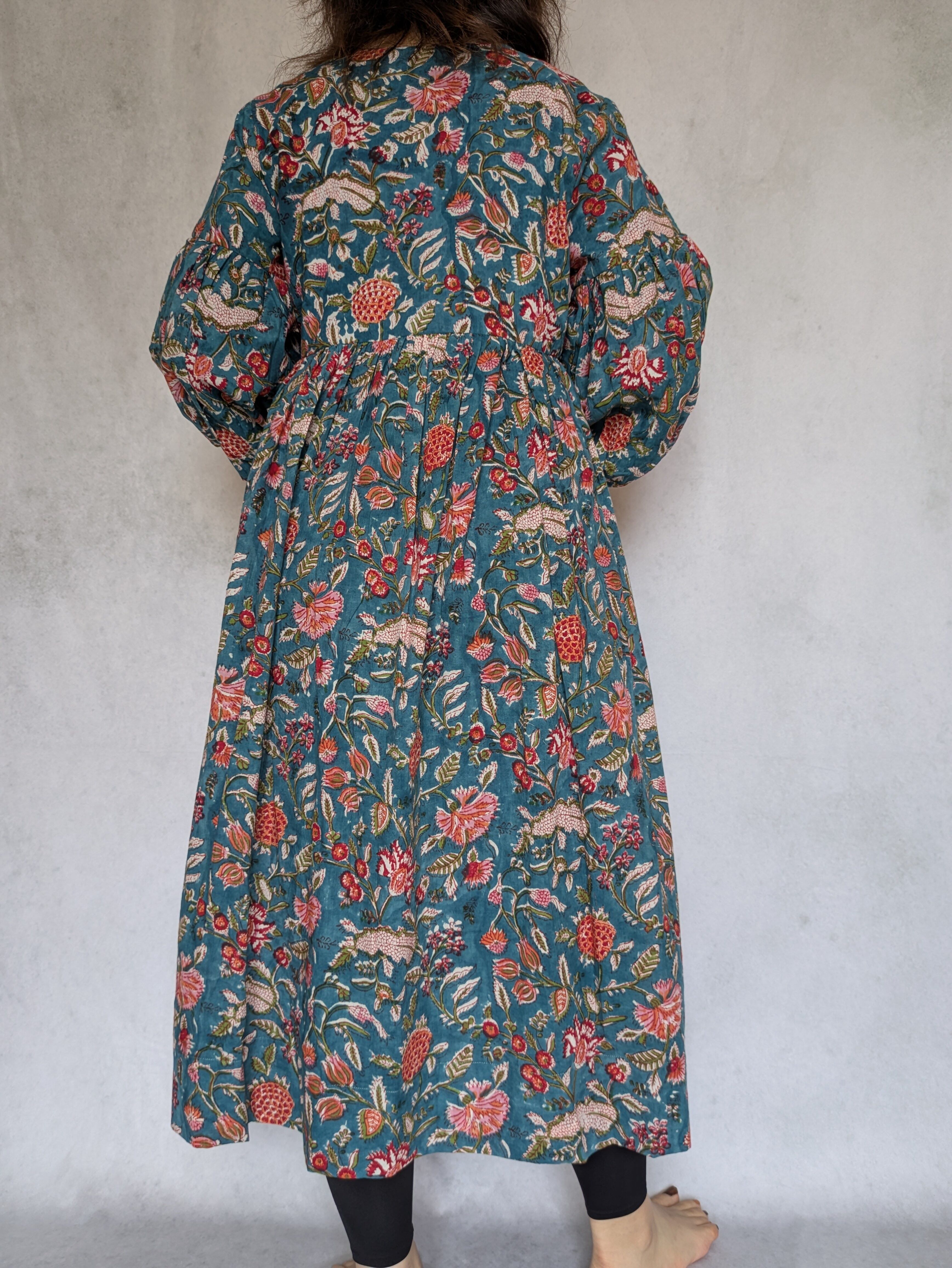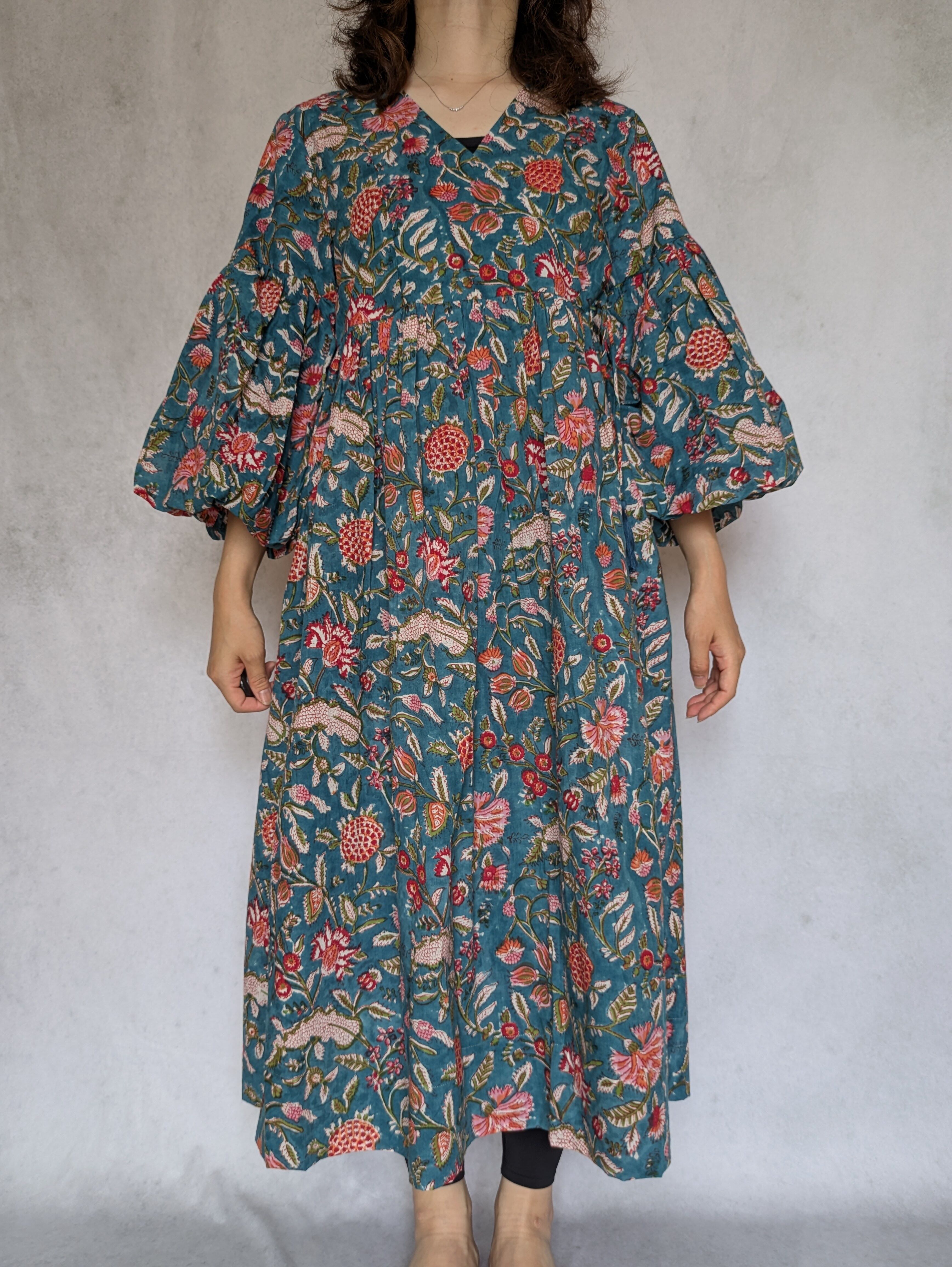 こちらは、インドの伝統工芸であるハンドブロックプリントで作られたワンピースです。