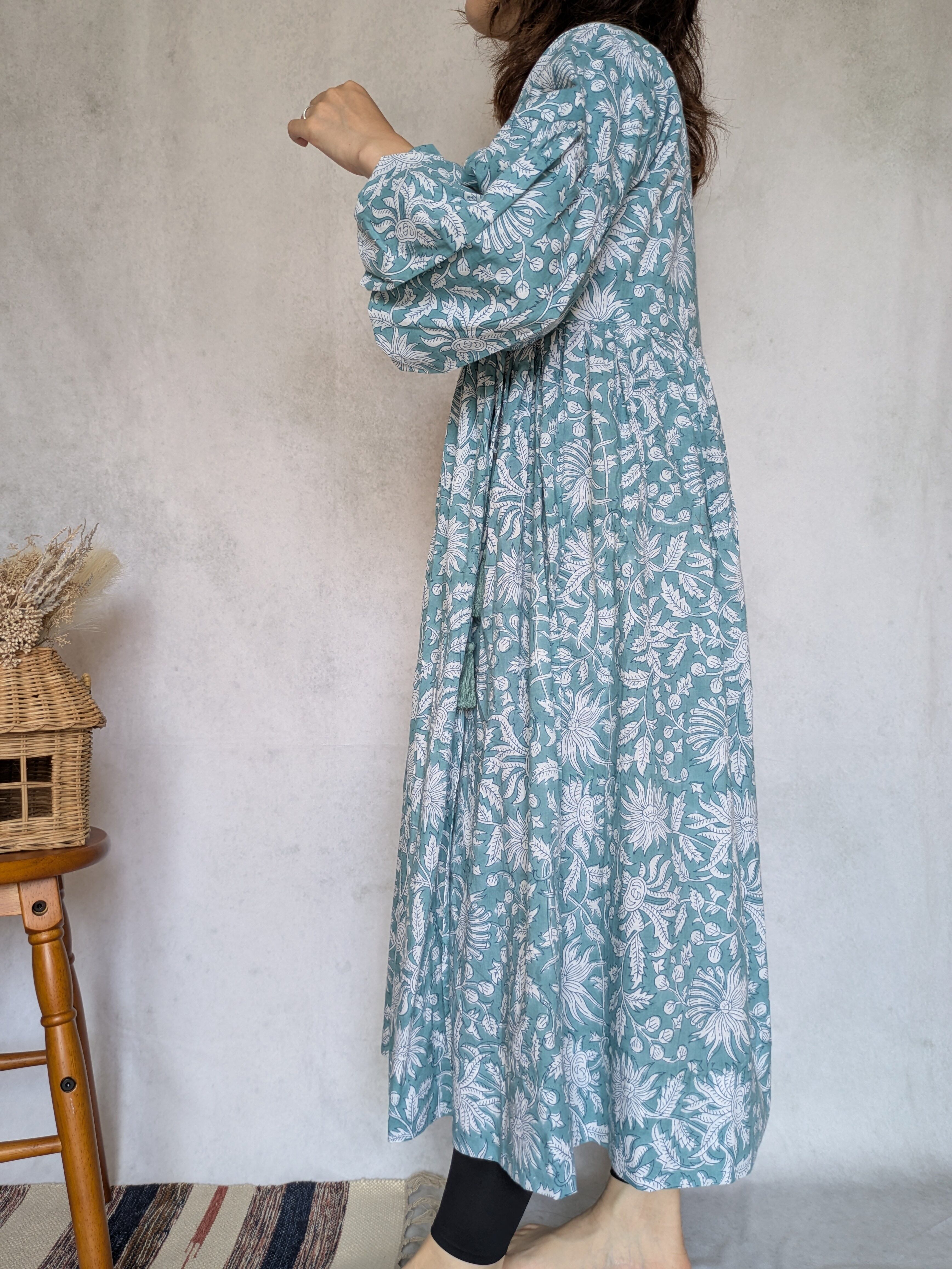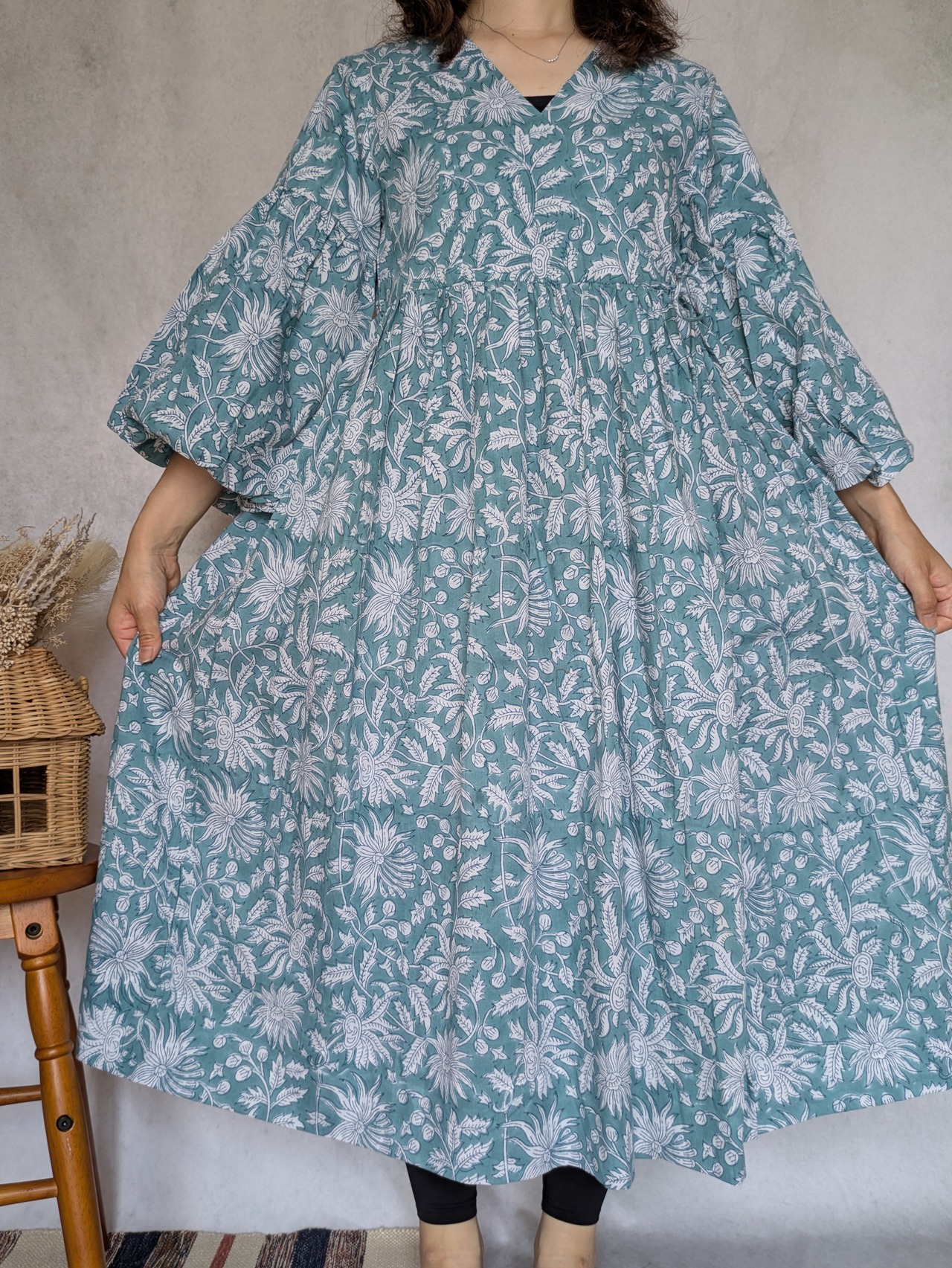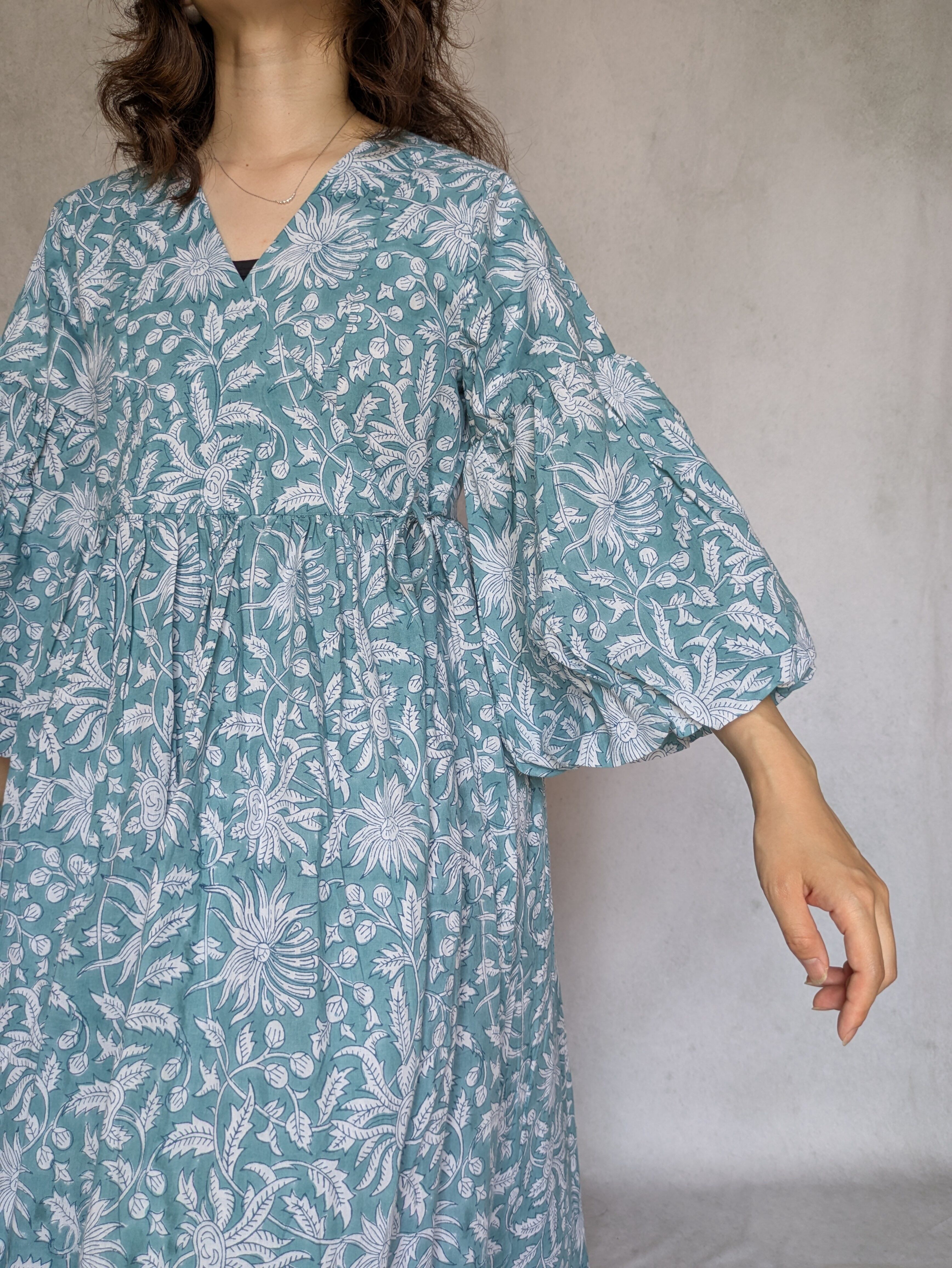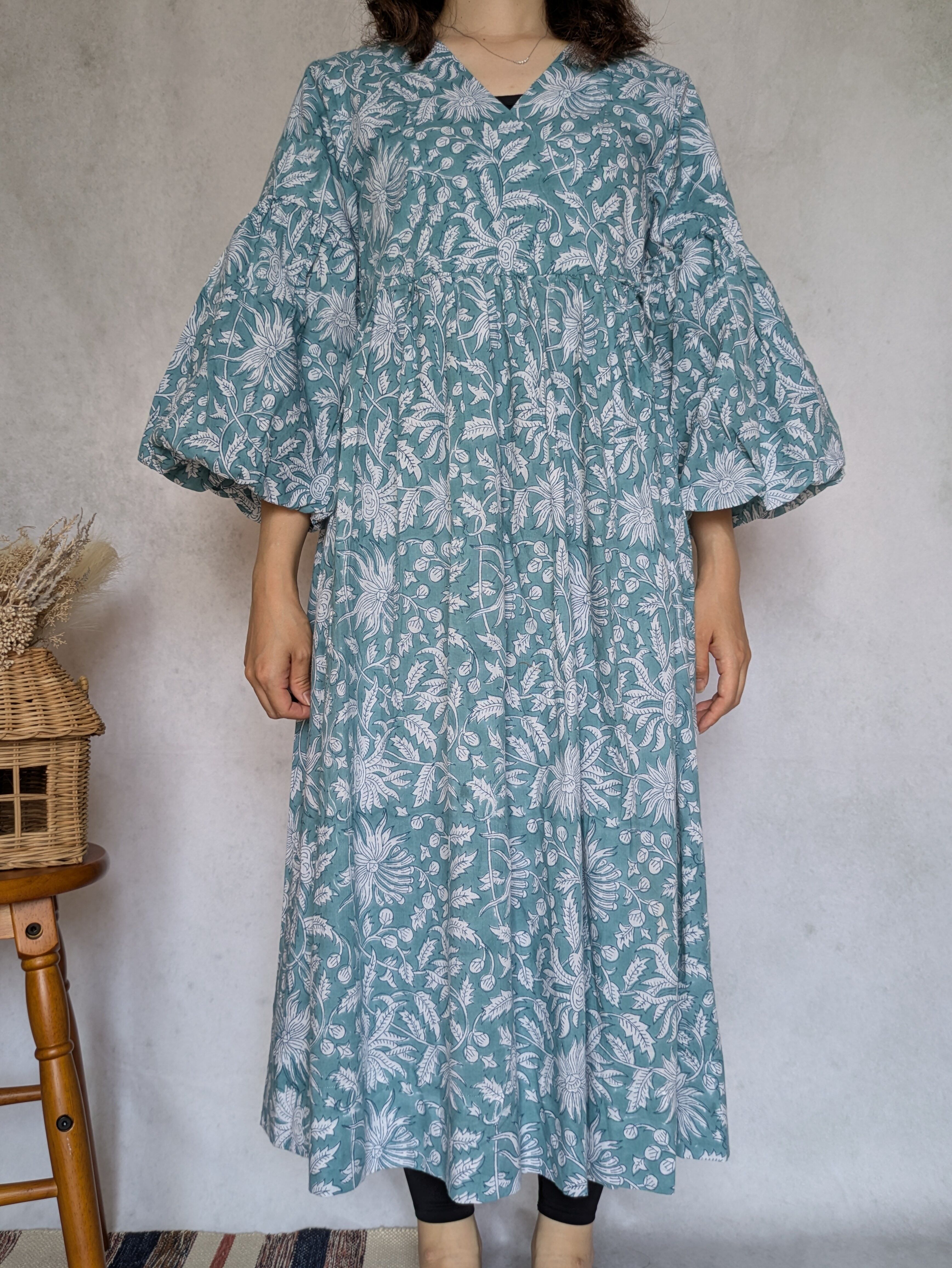 こちらは、インドの伝統工芸であるハンドブロックプリントで作られたワンピースです。