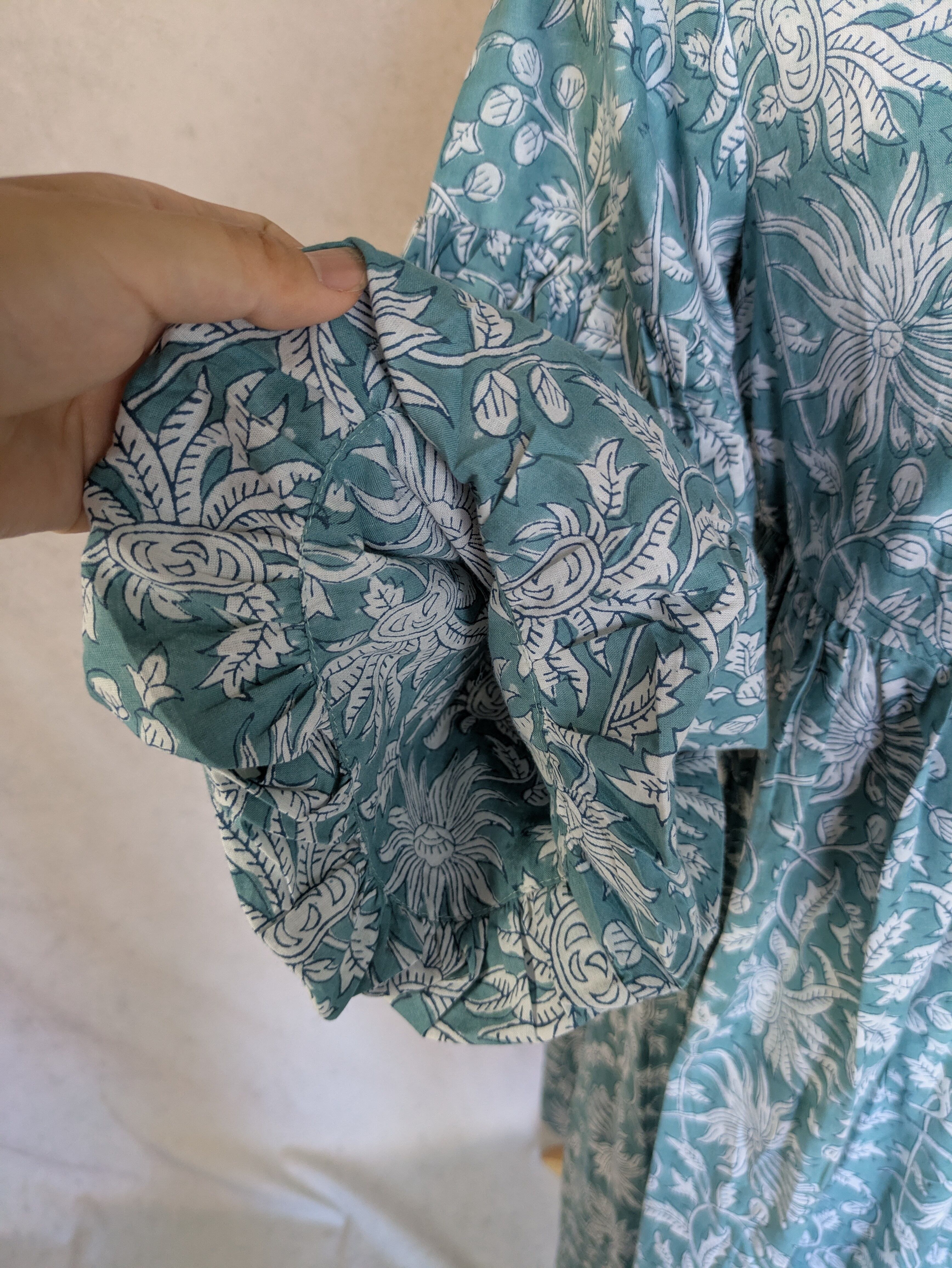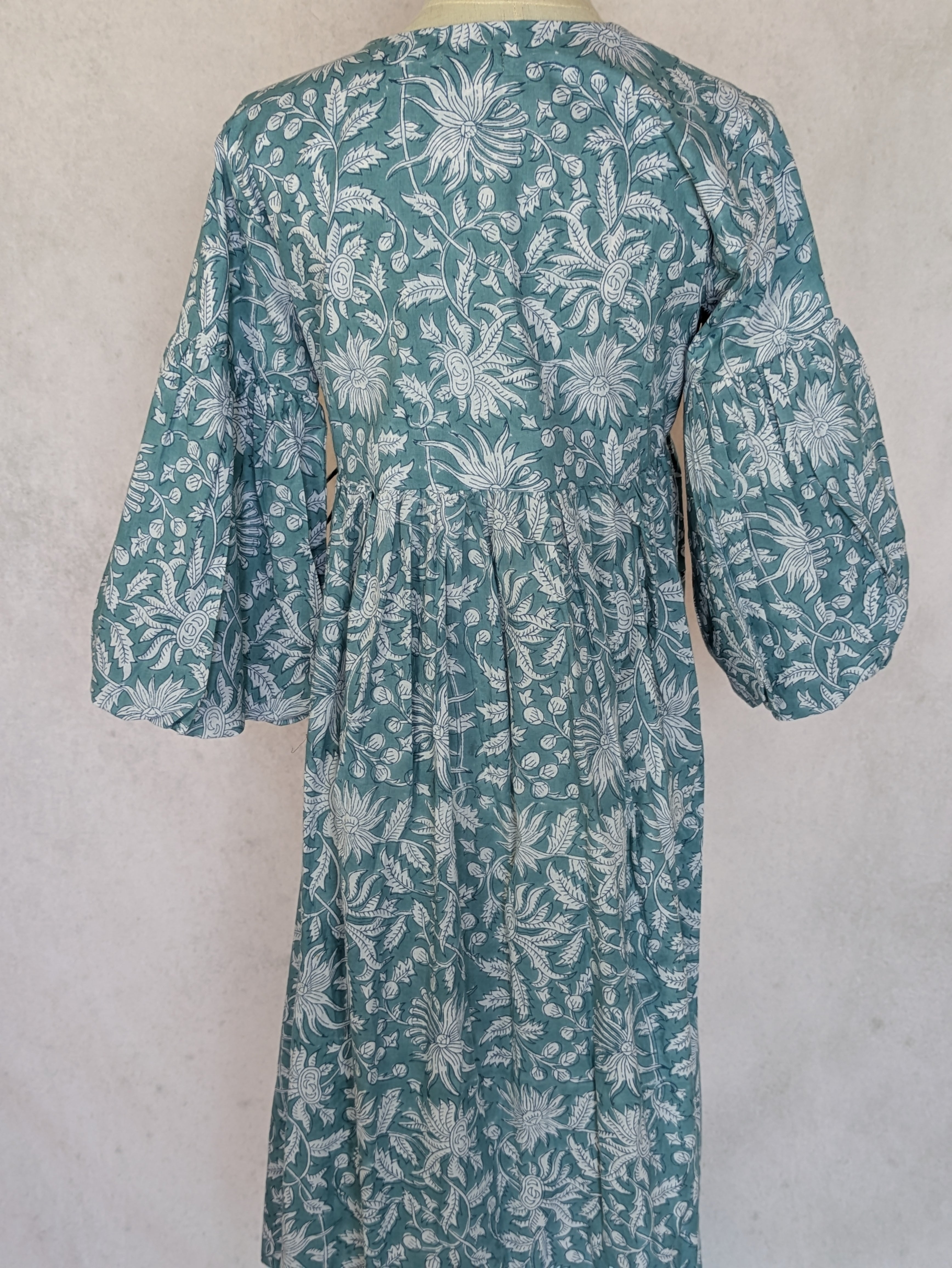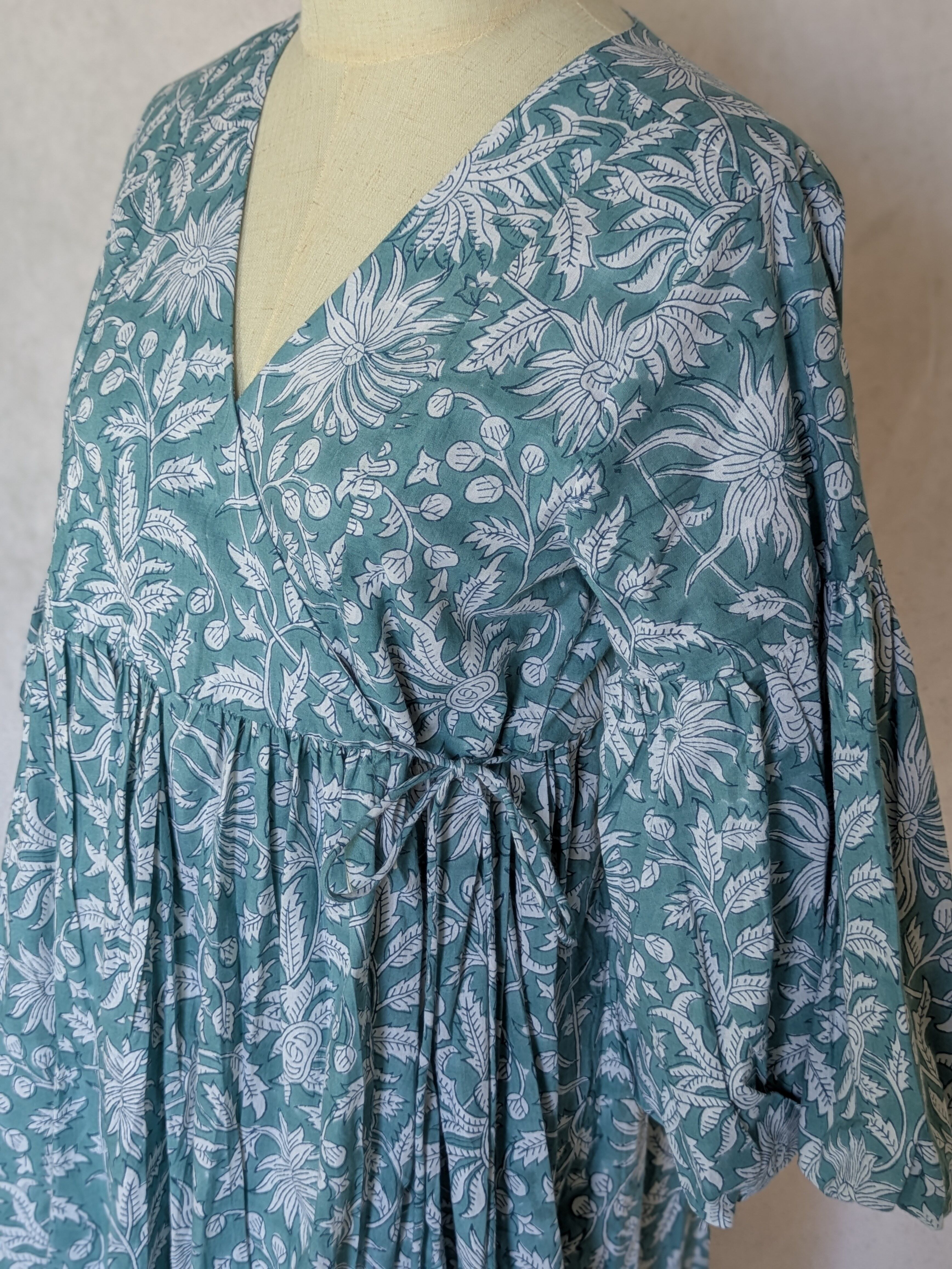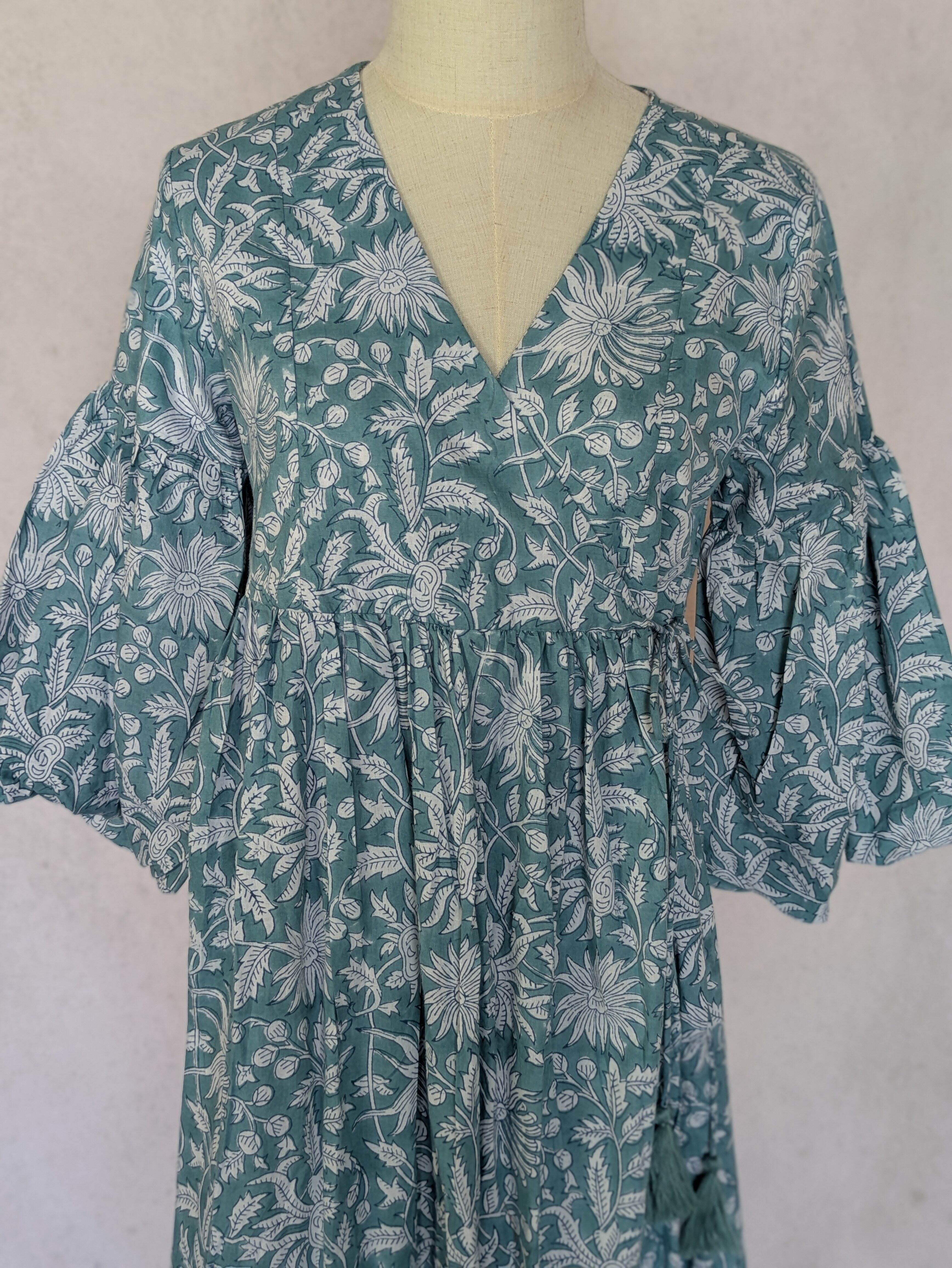 こちらは、インドの伝統工芸であるハンドブロックプリントで作られたワンピースです。
