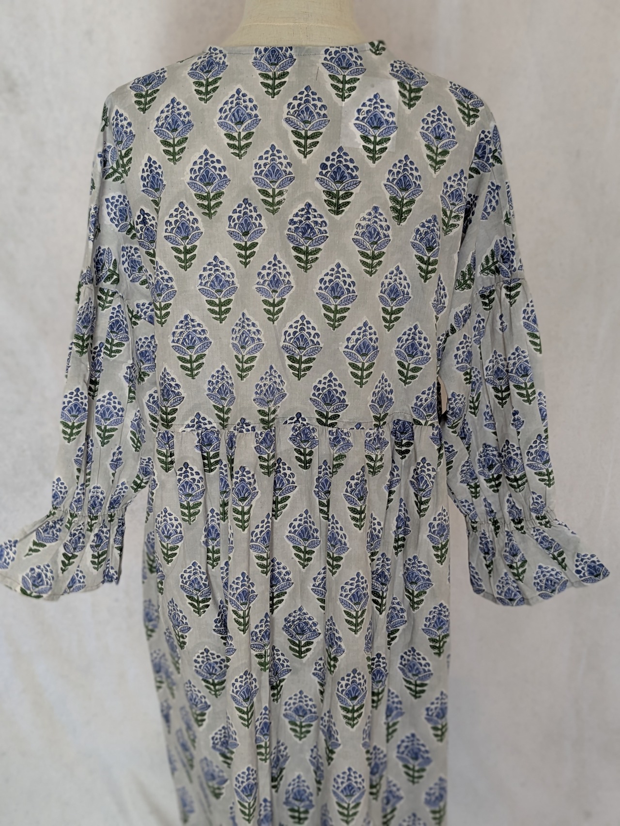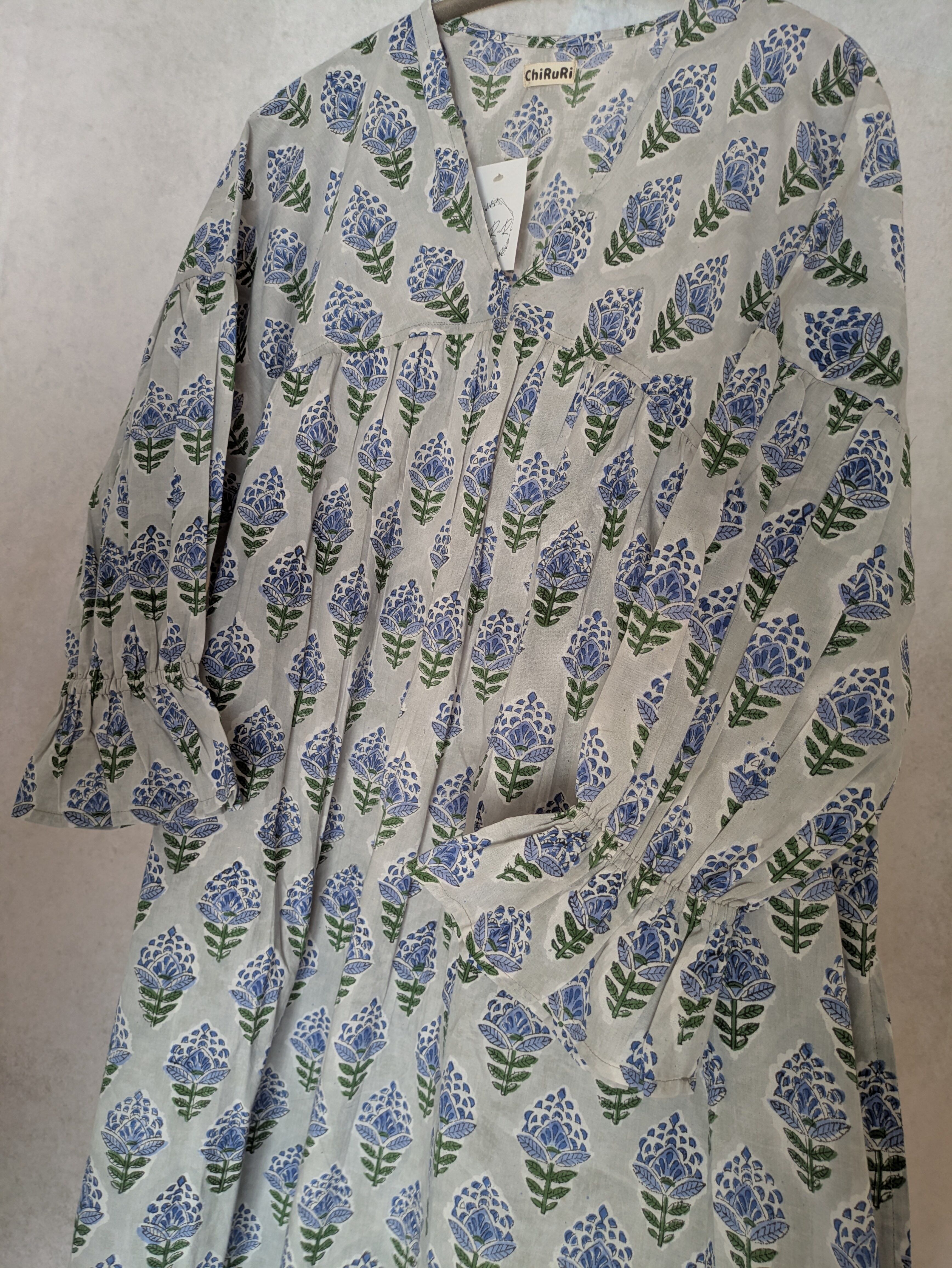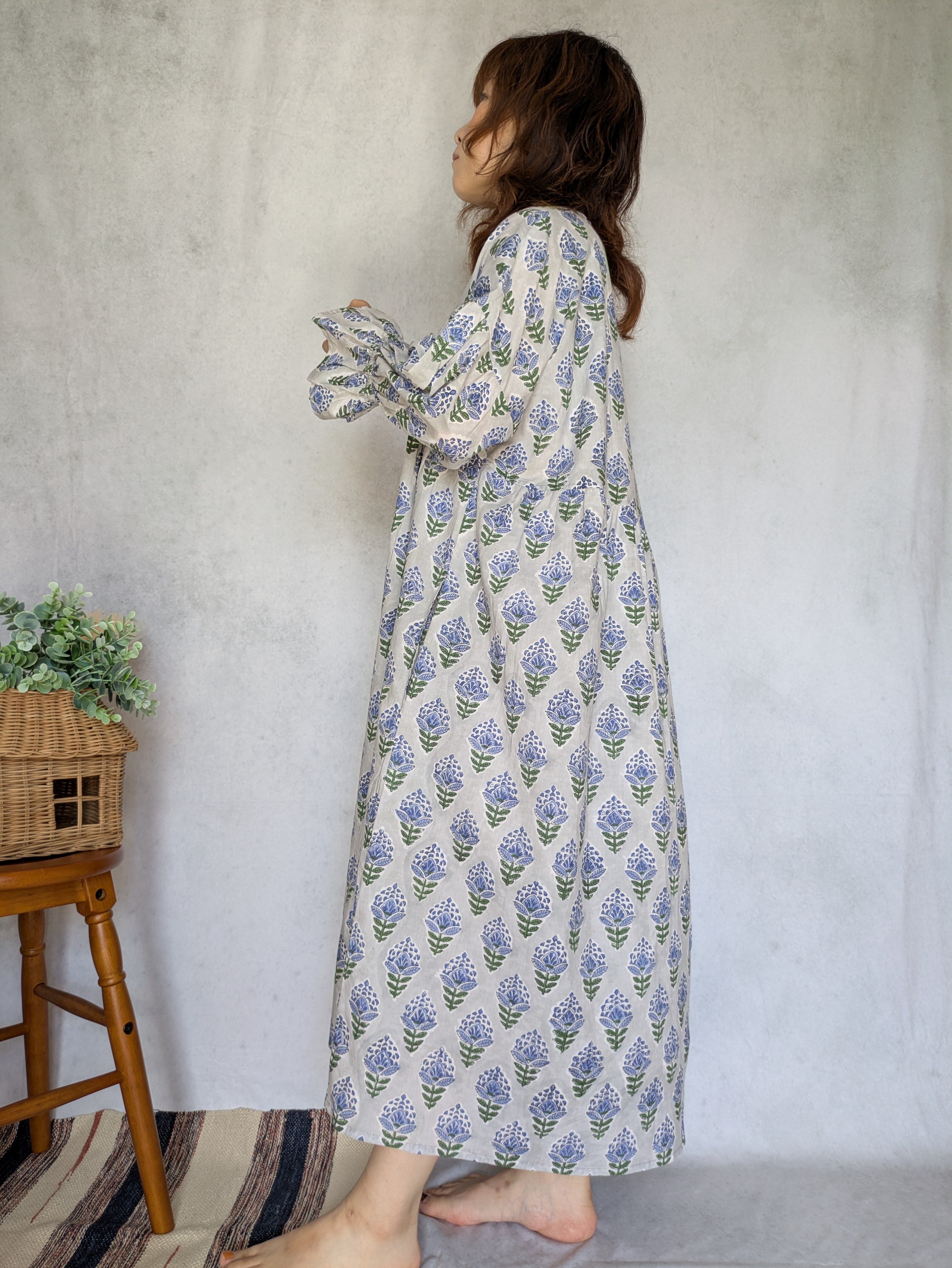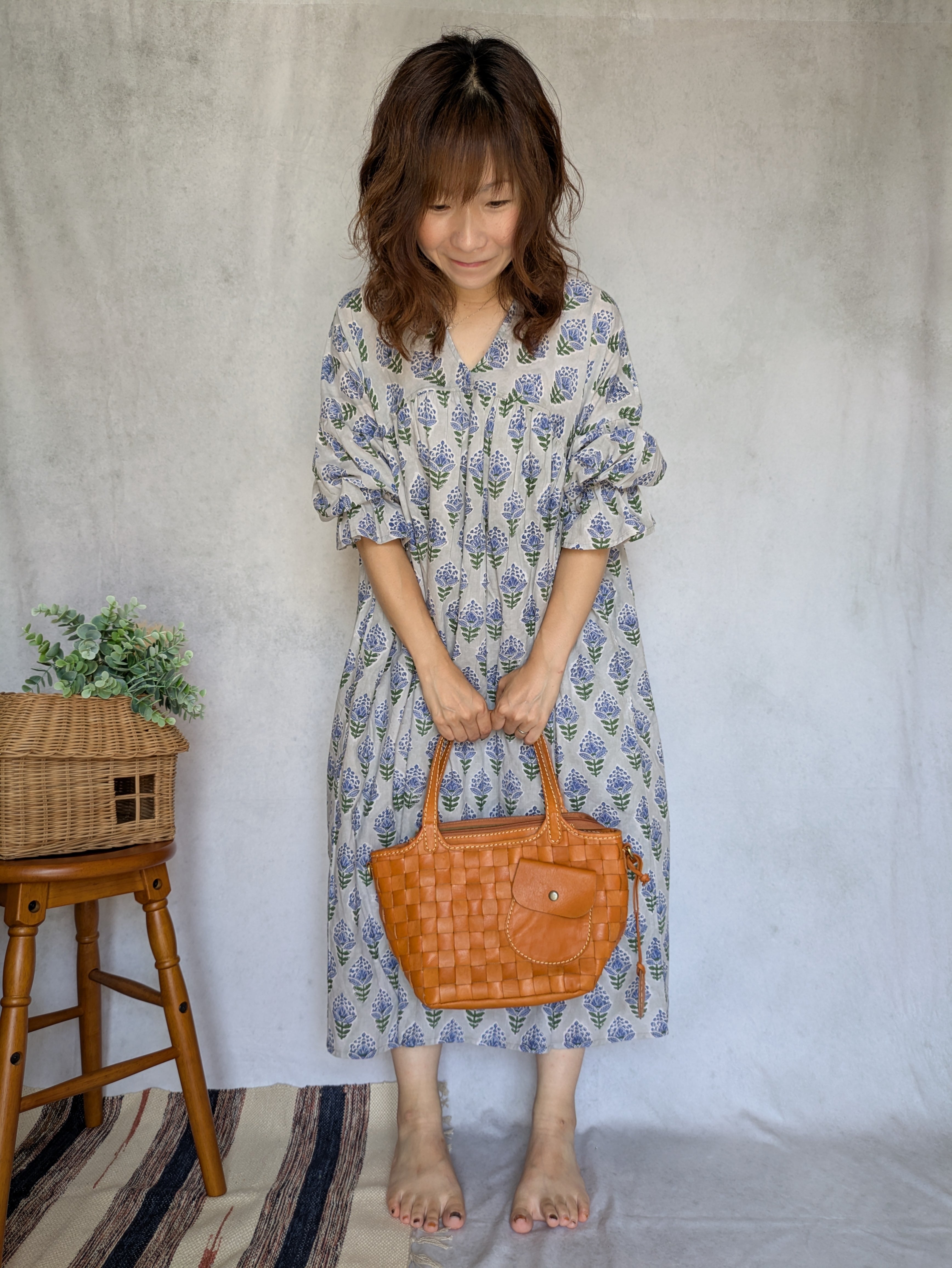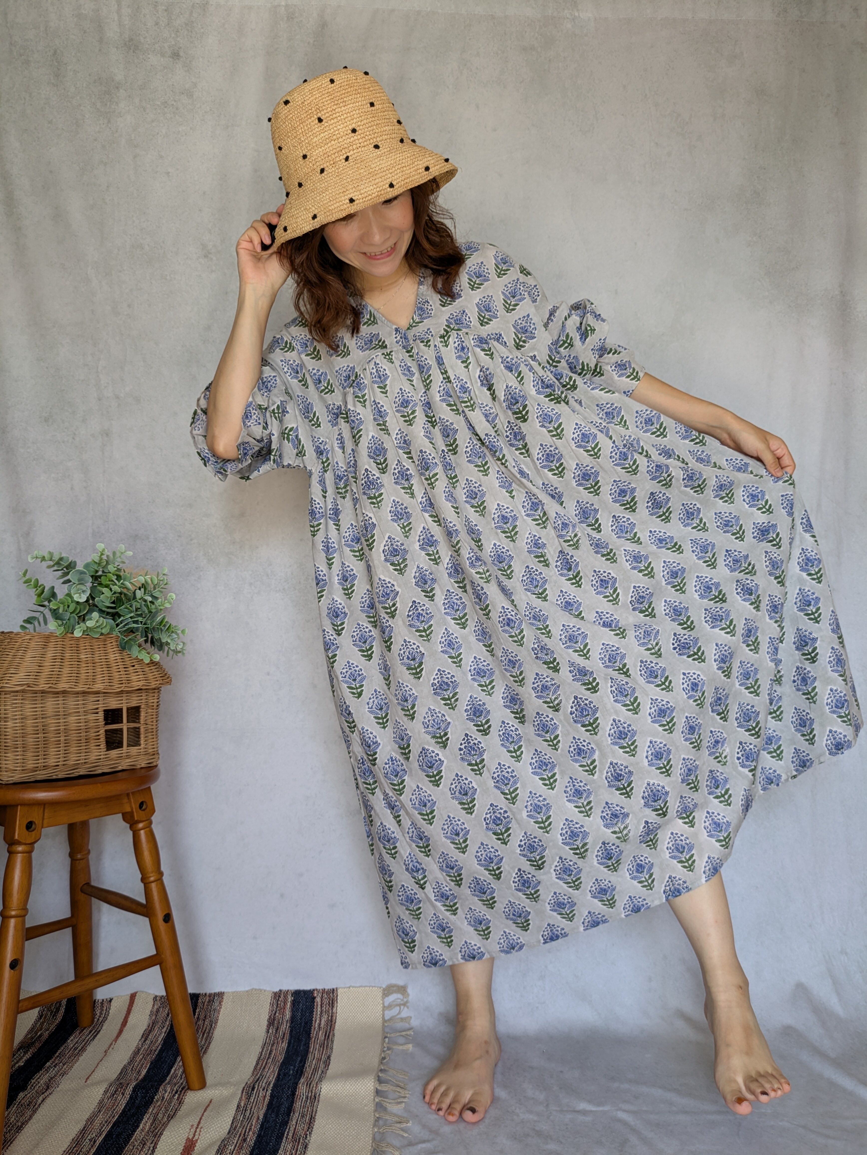 こちらは、インドの伝統工芸であるハンドブロックプリントで作られたワンピースです。