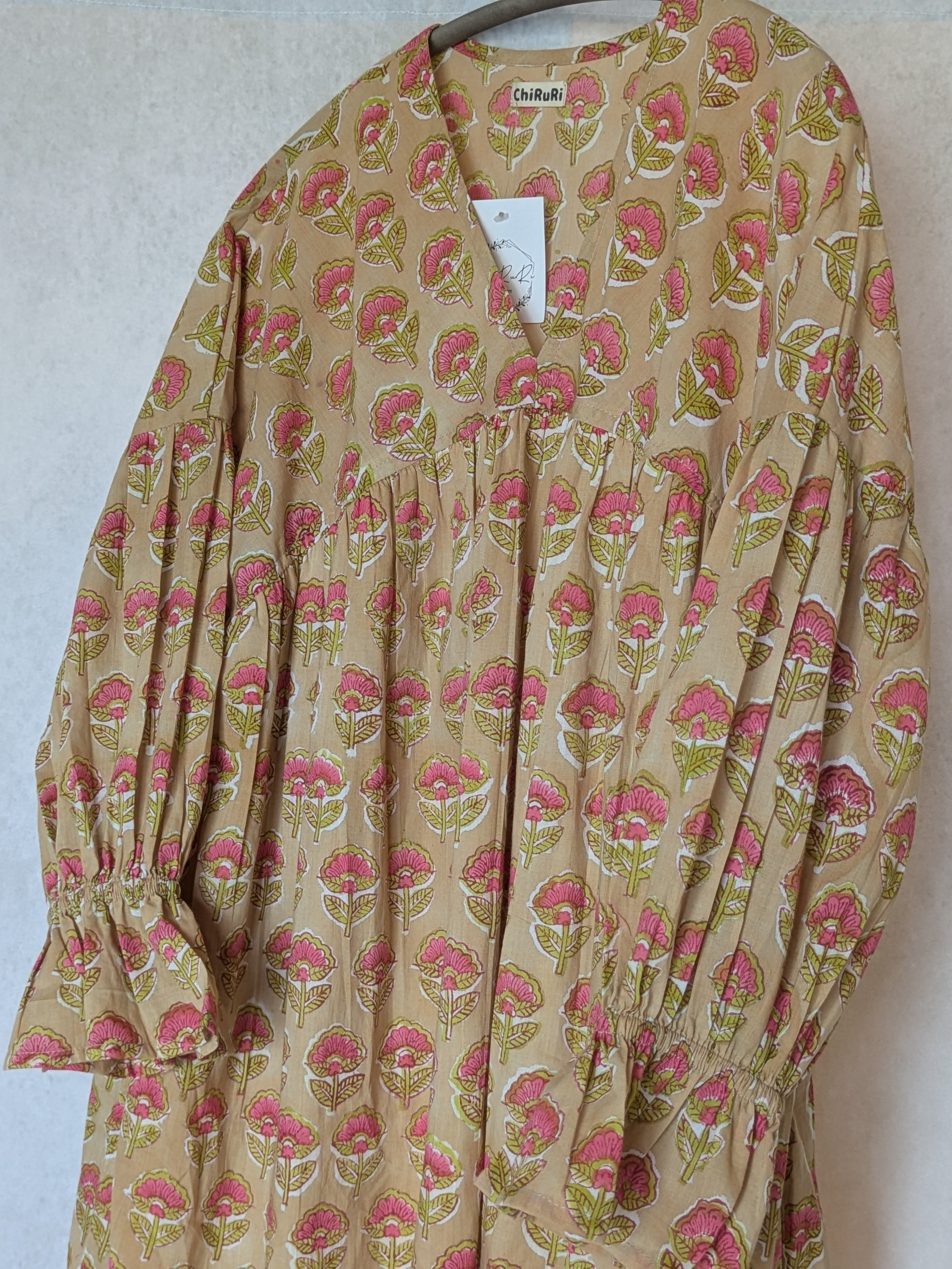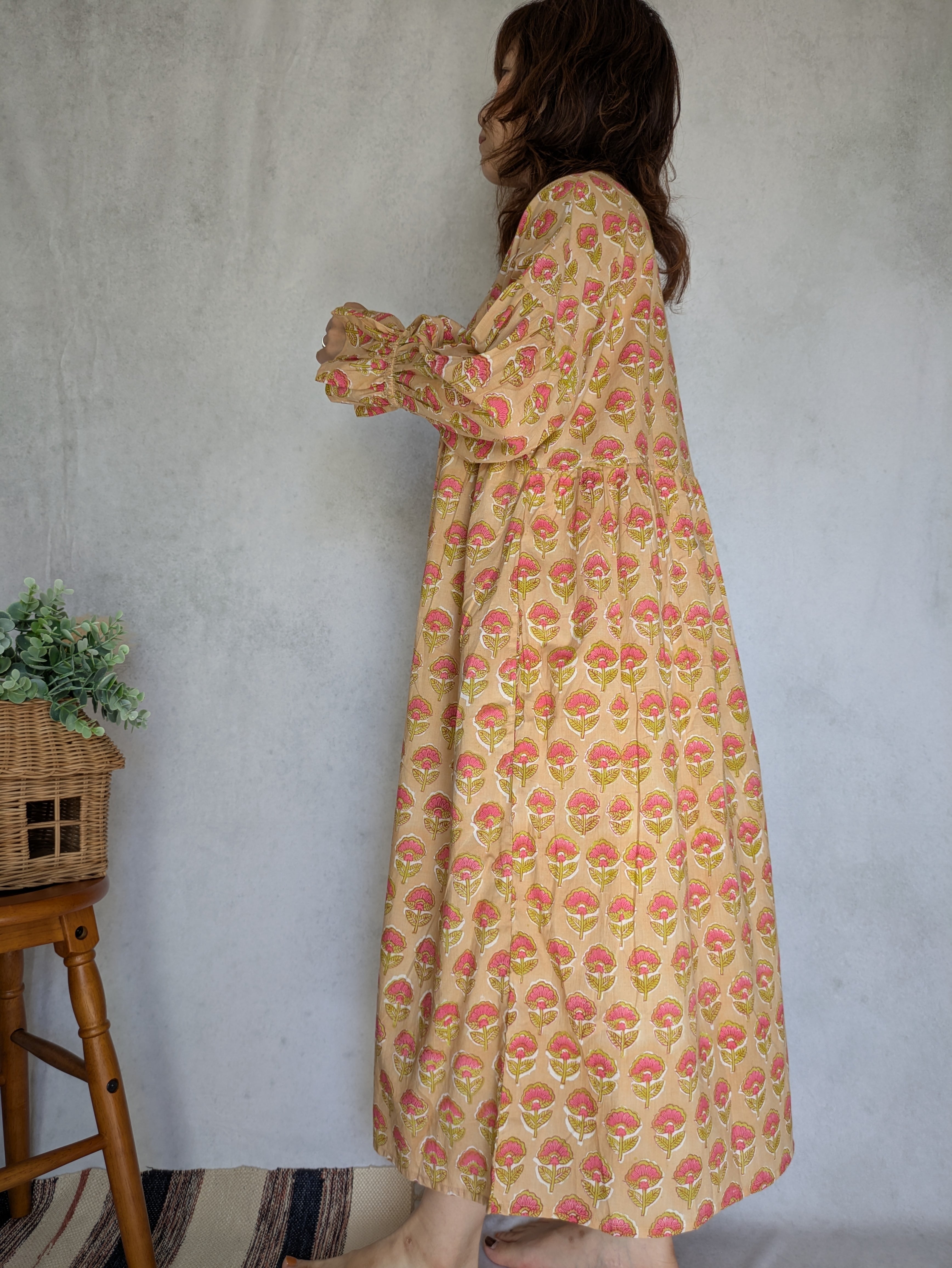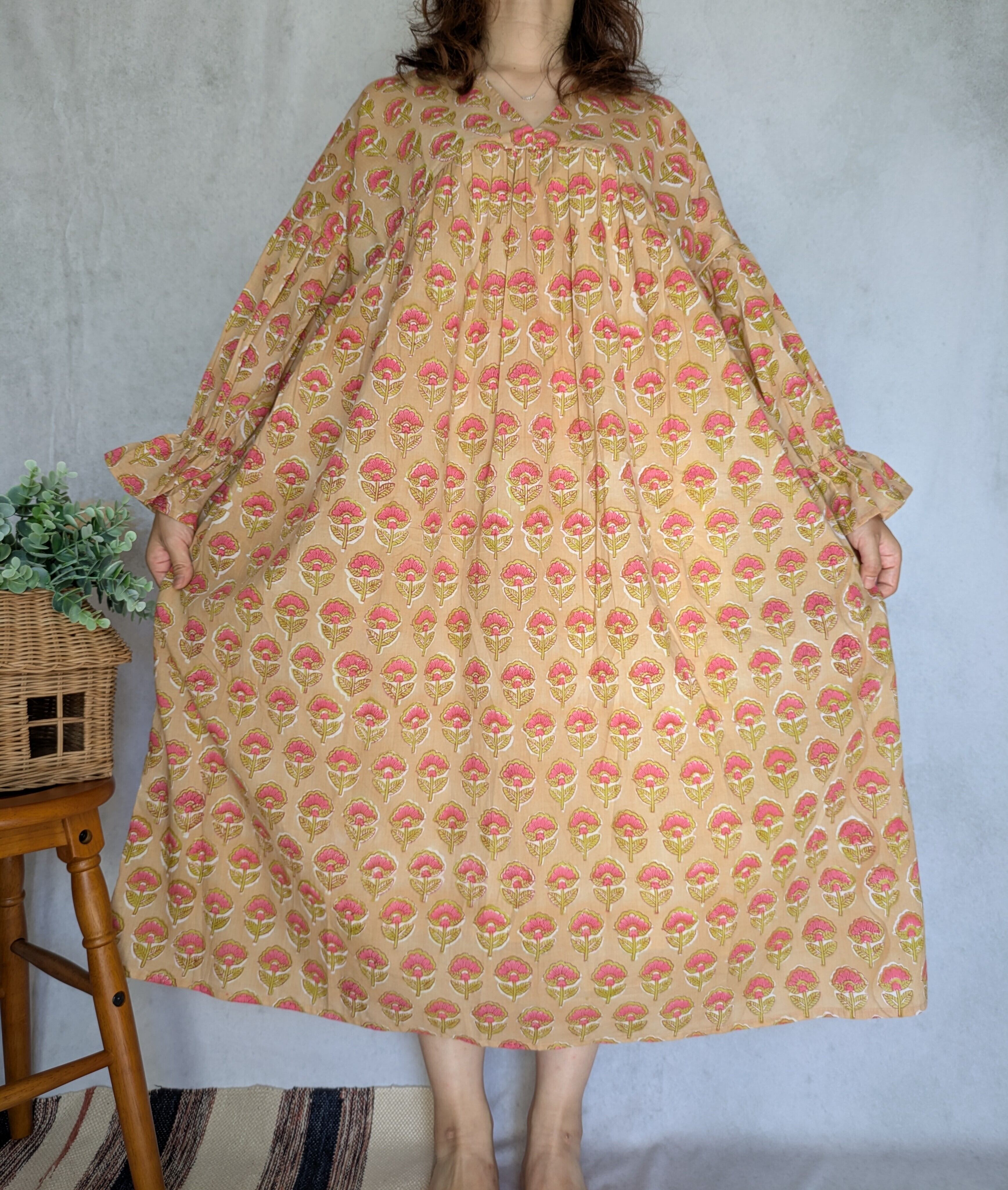 こちらは、インドの伝統工芸であるハンドブロックプリントで作られたワンピースです。