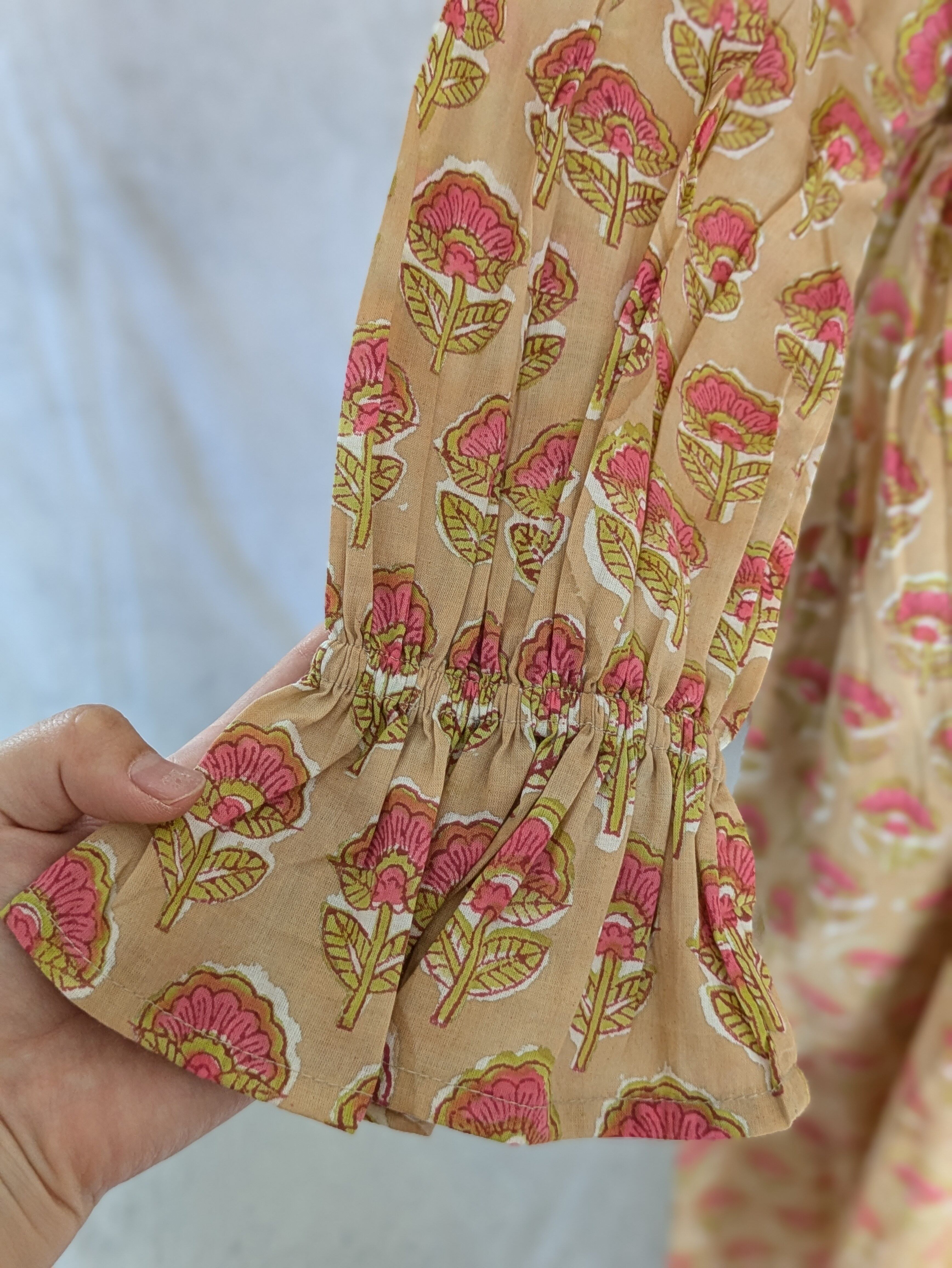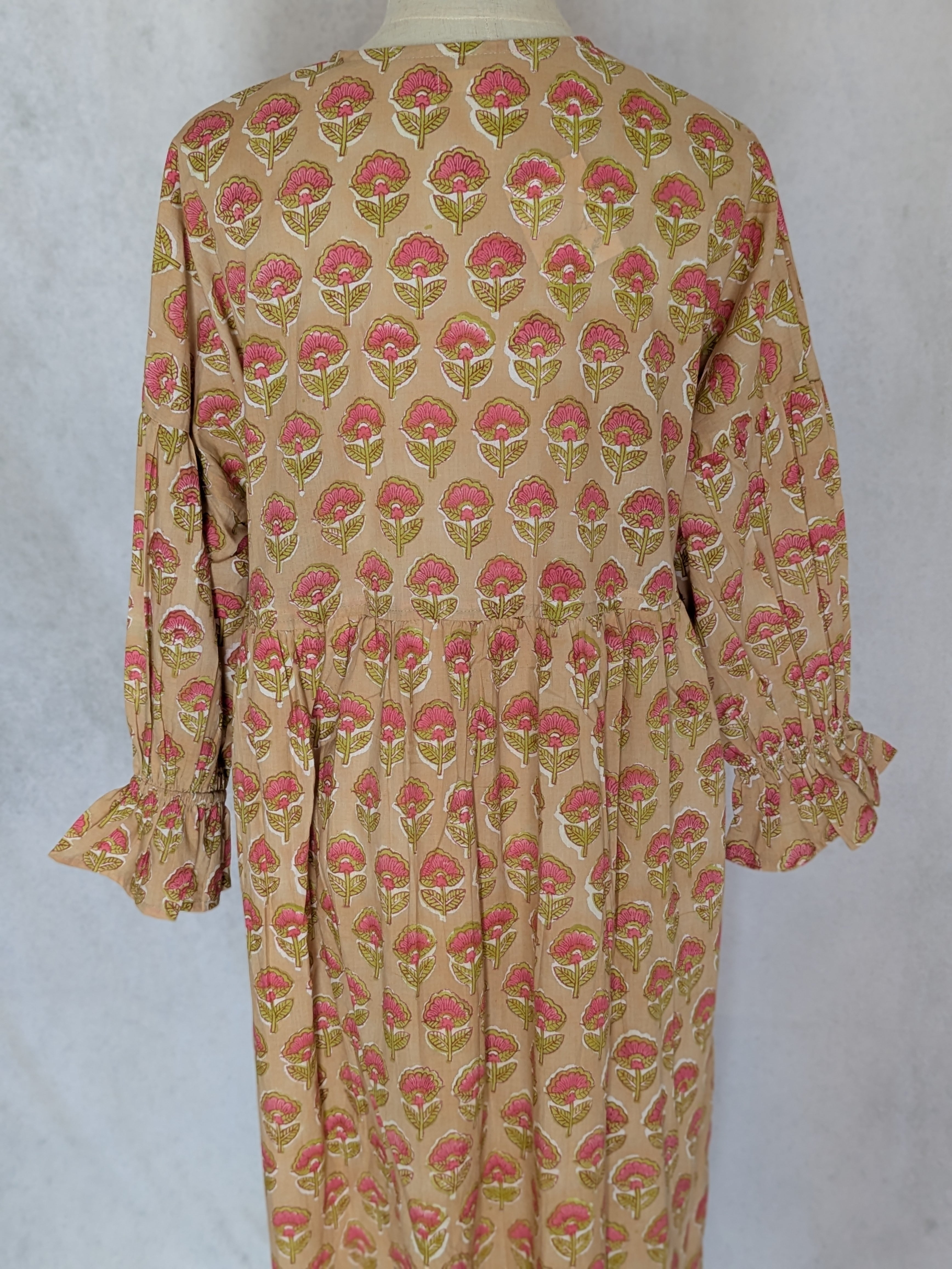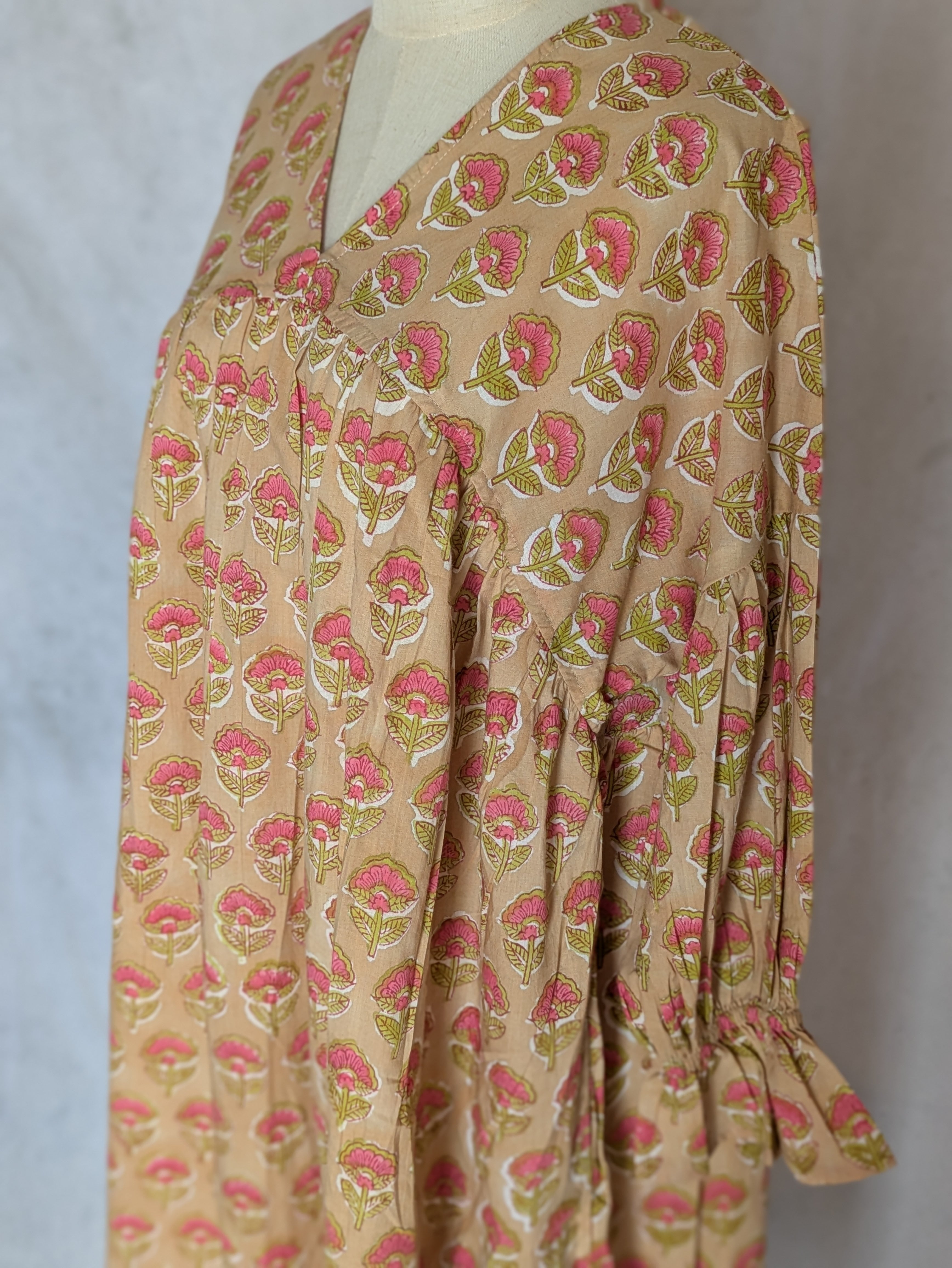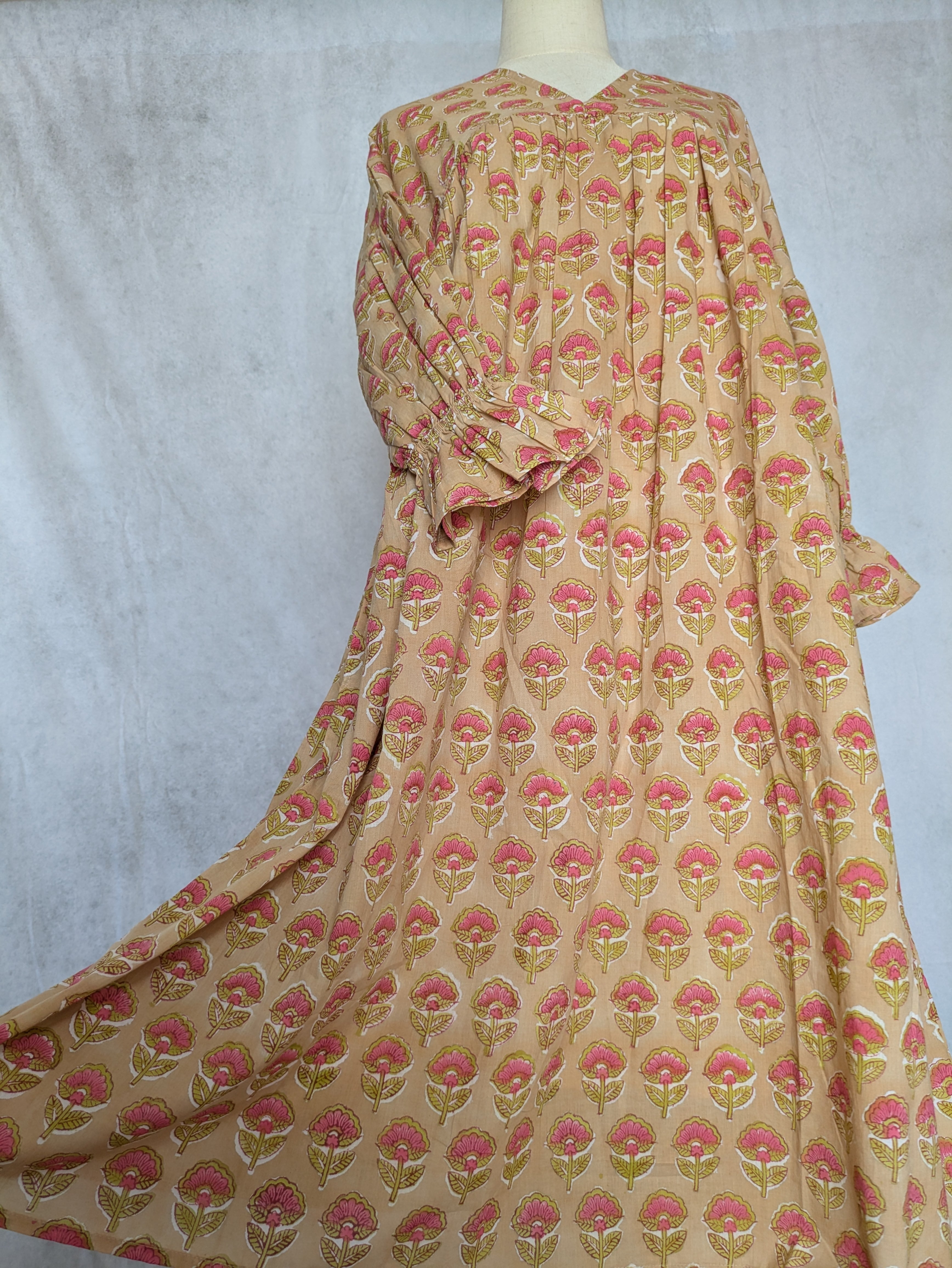 こちらは、インドの伝統工芸であるハンドブロックプリントで作られたワンピースです。
