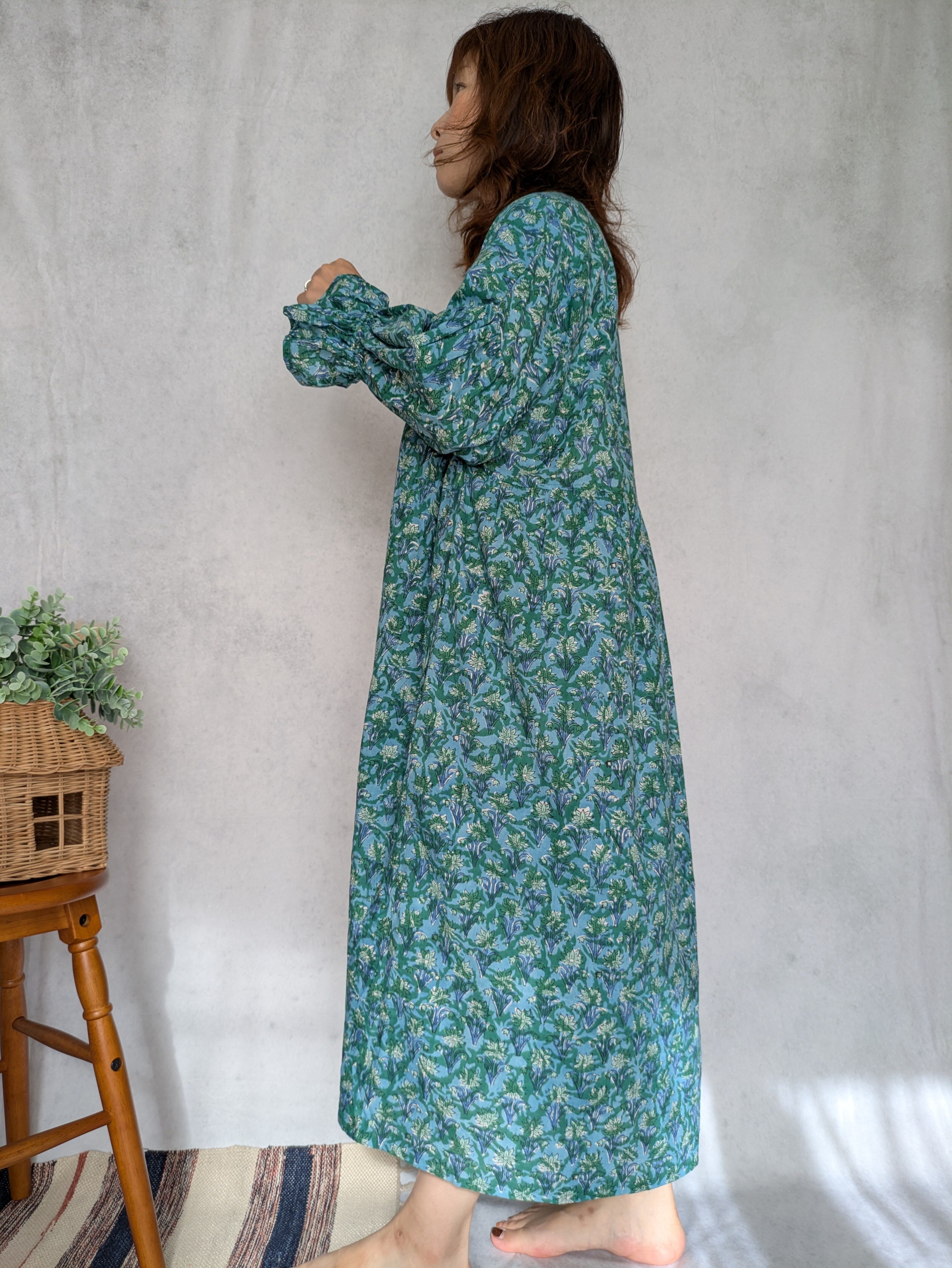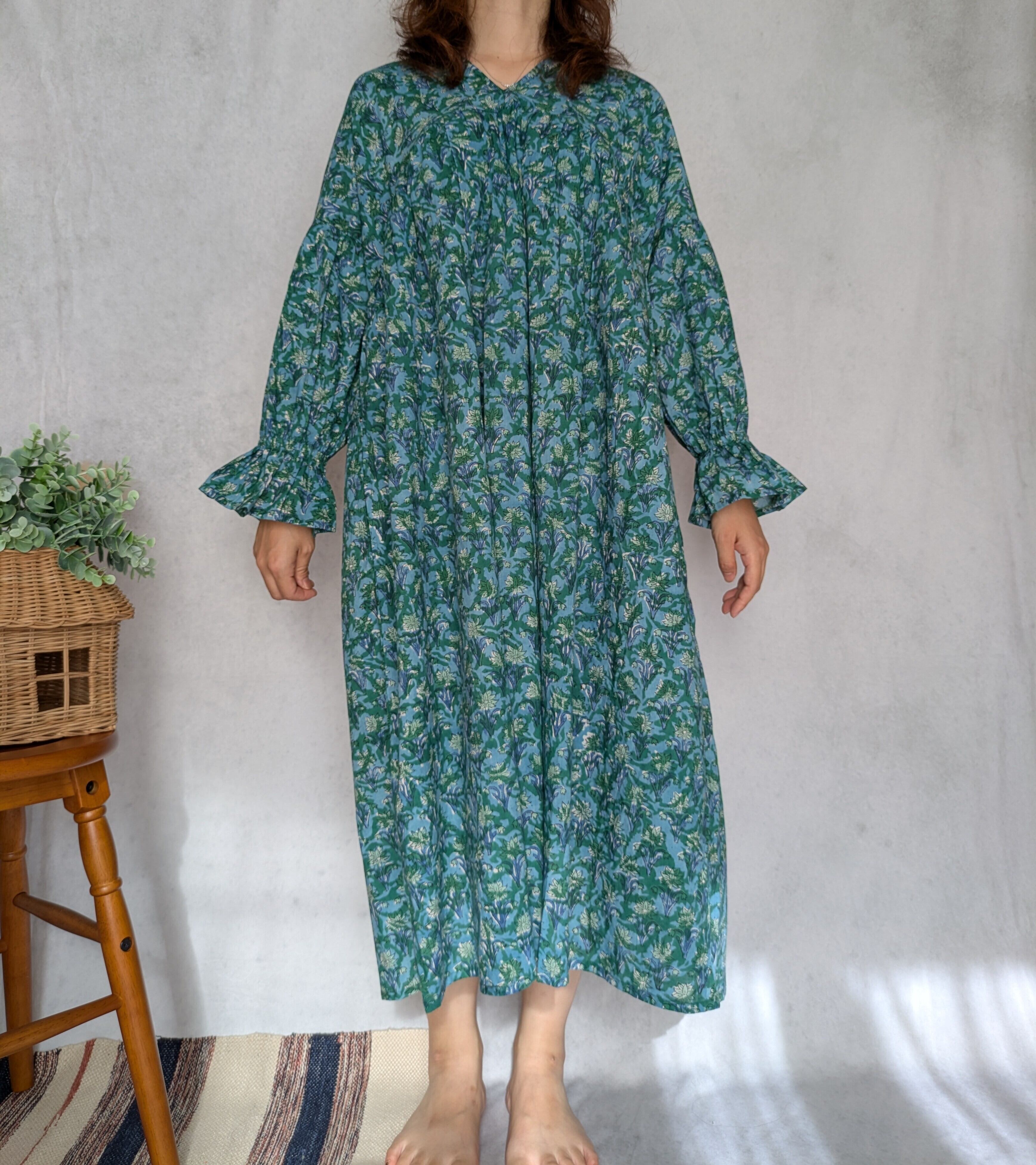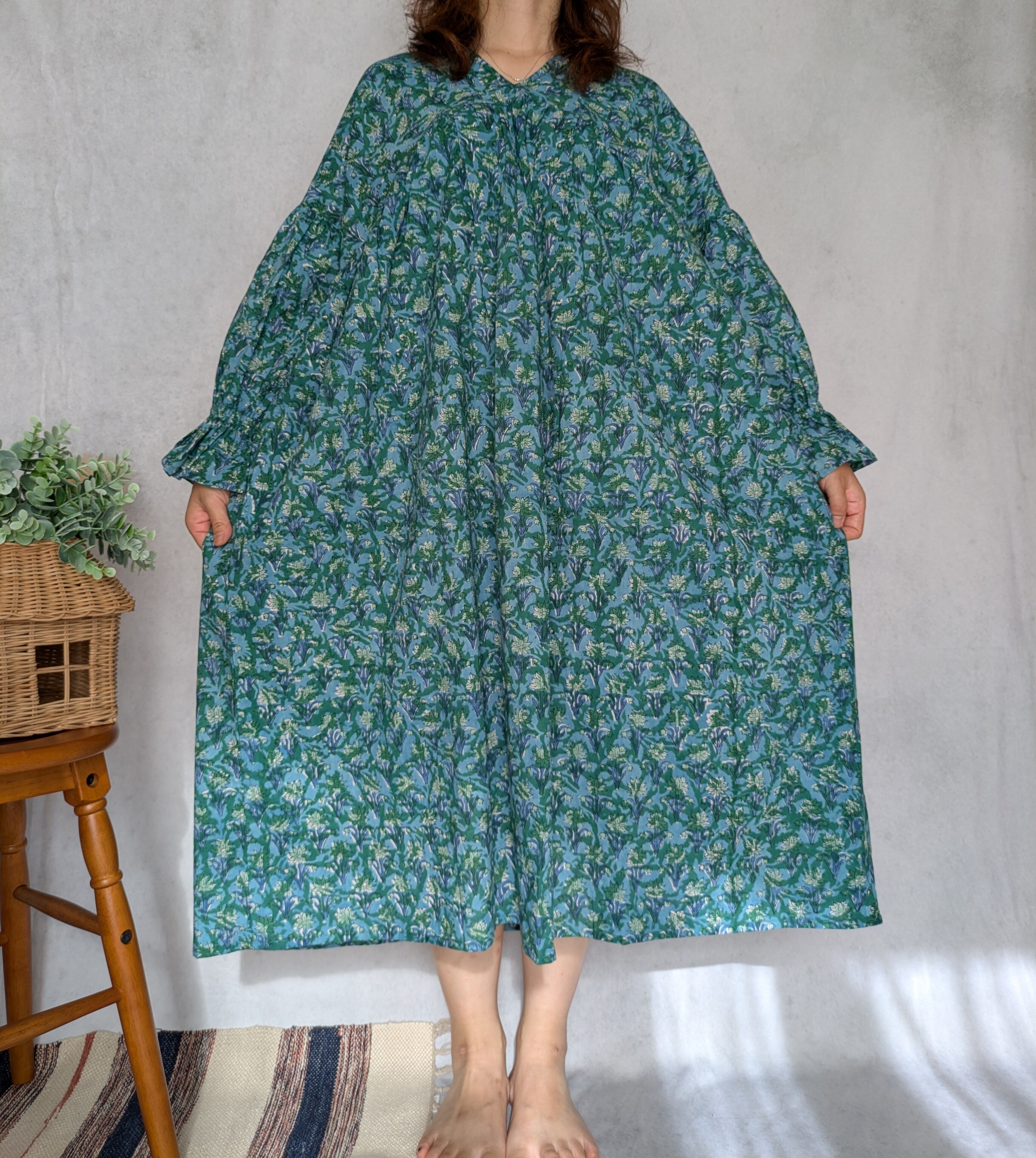 こちらは、インドの伝統工芸であるハンドブロックプリントで作られたワンピースです。