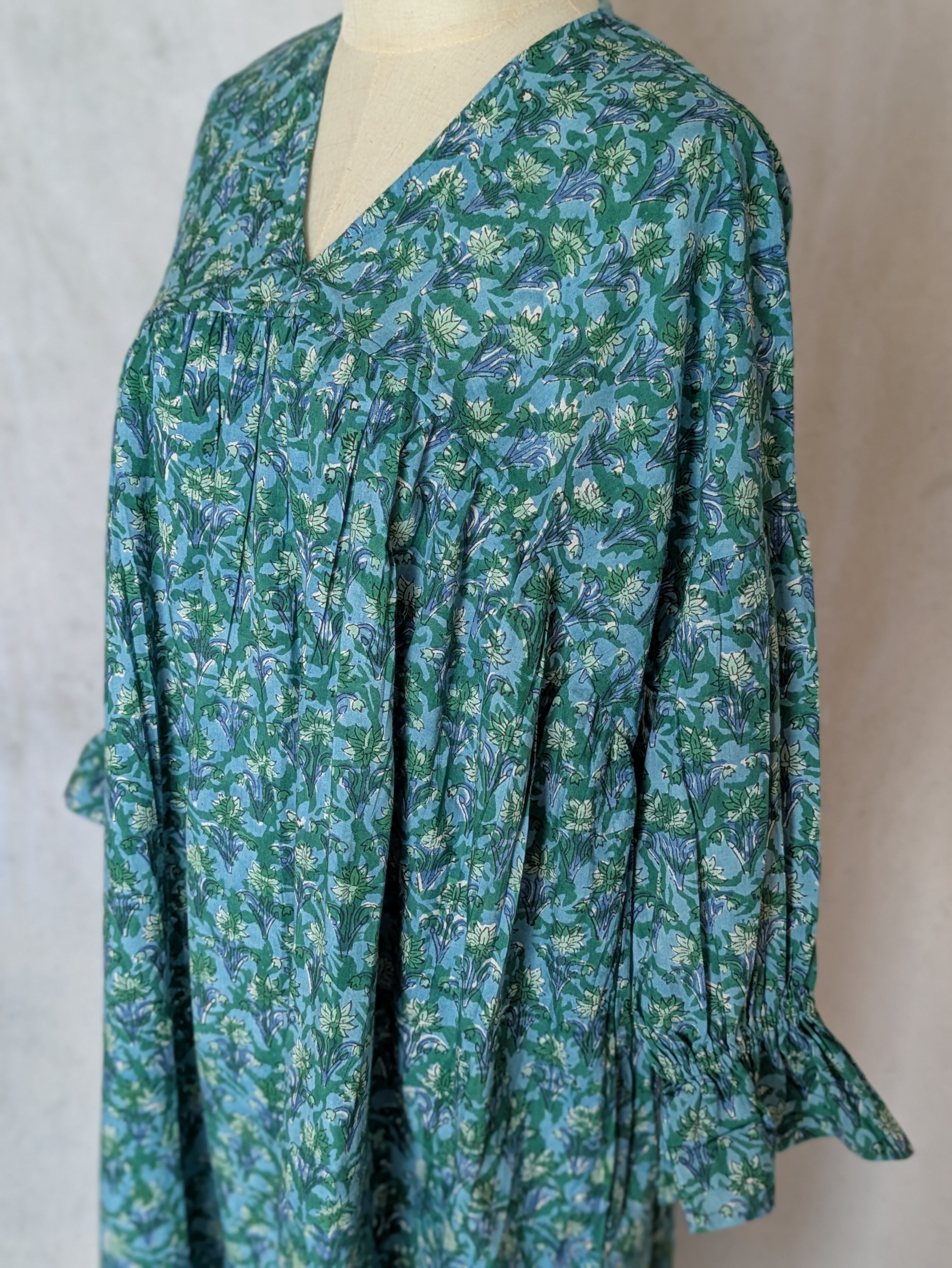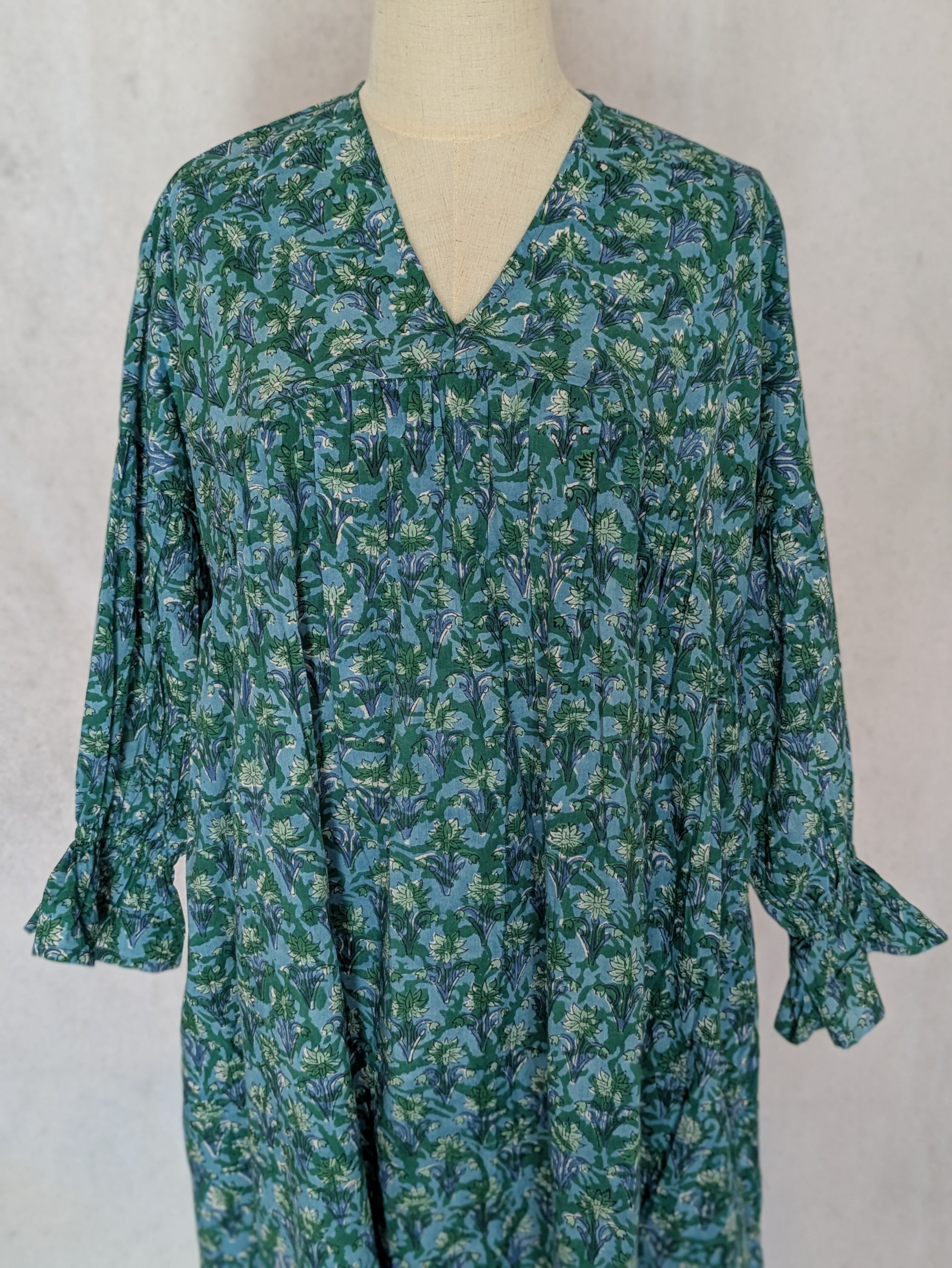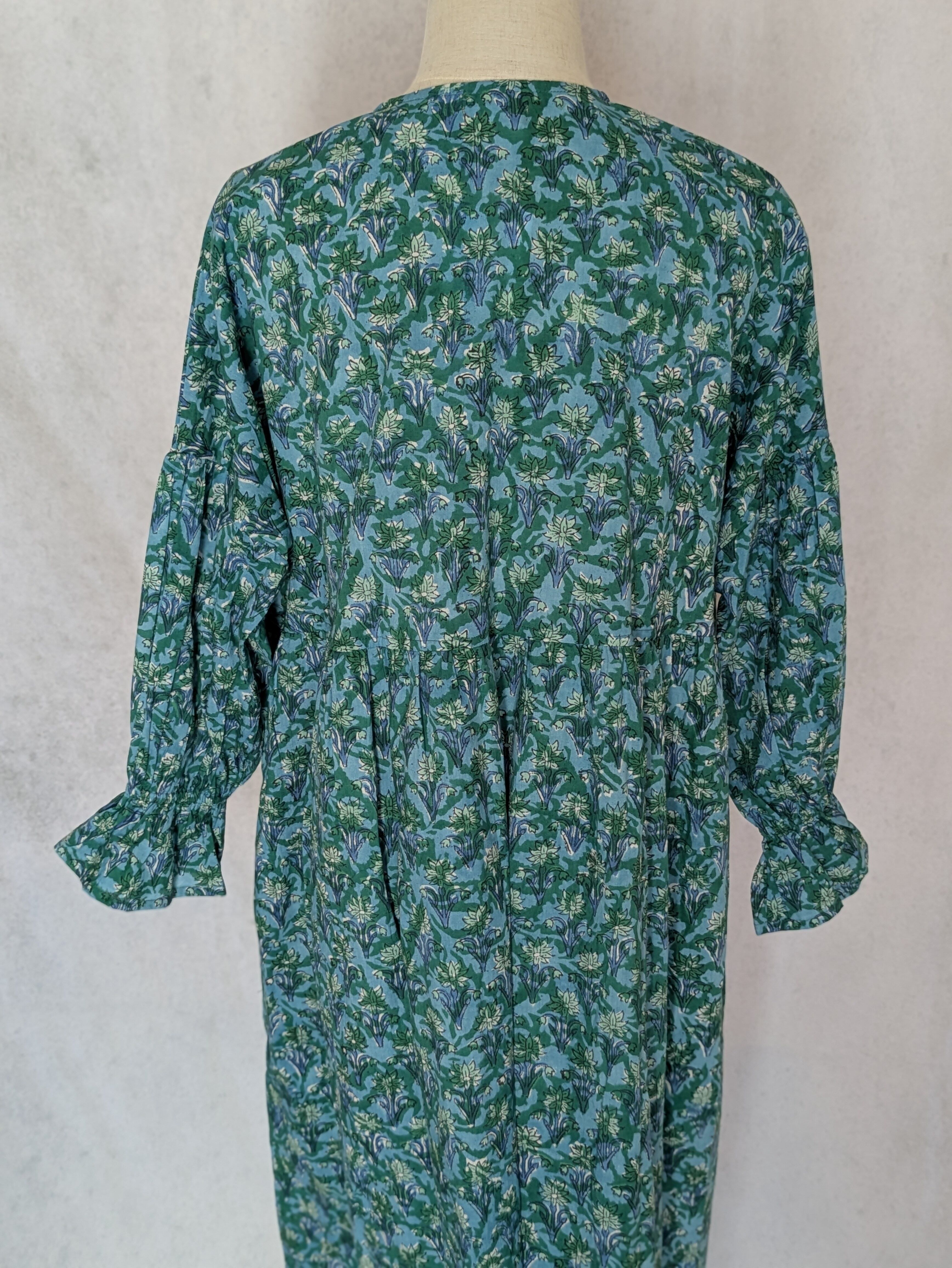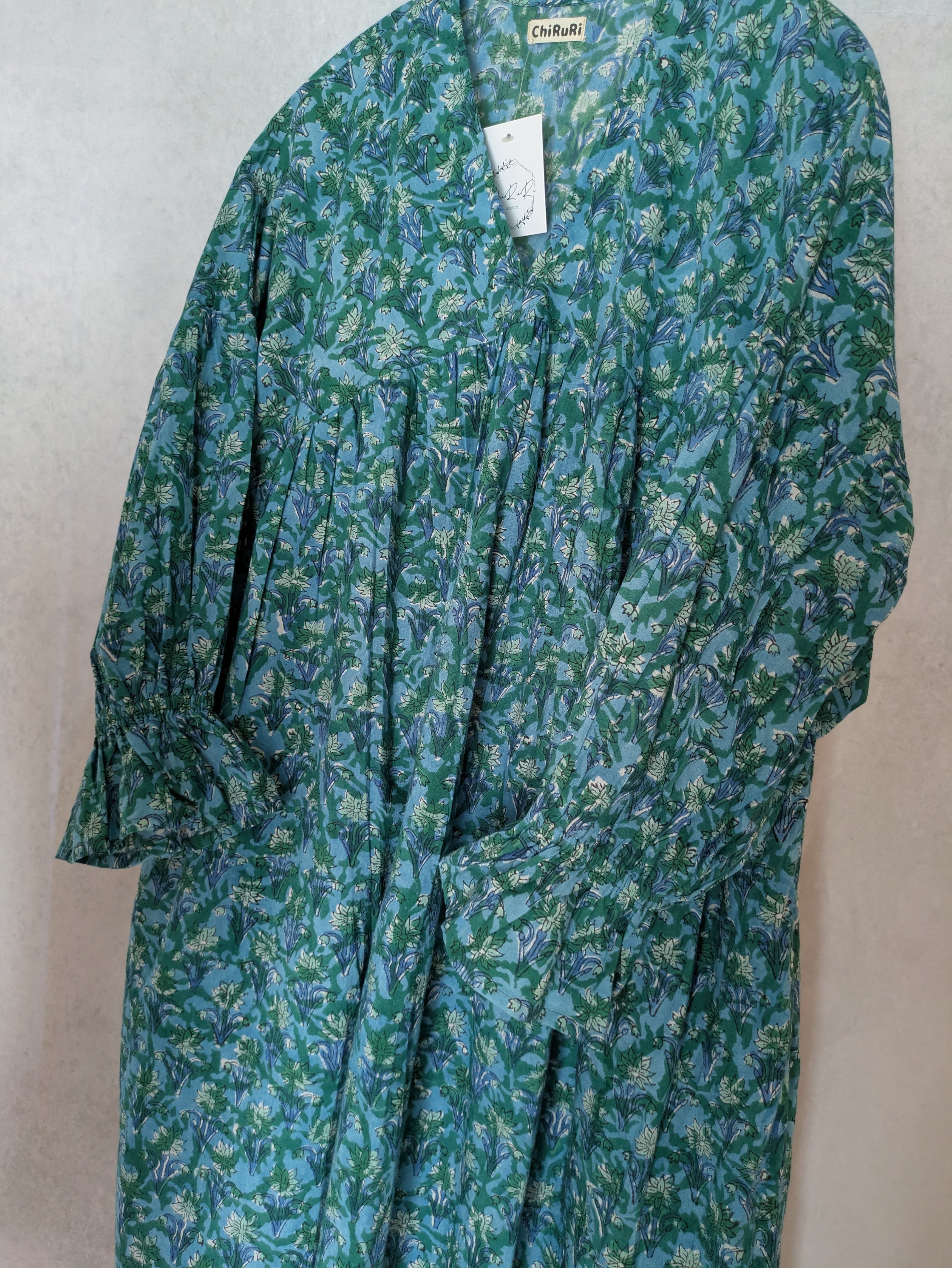 こちらは、インドの伝統工芸であるハンドブロックプリントで作られたワンピースです。
