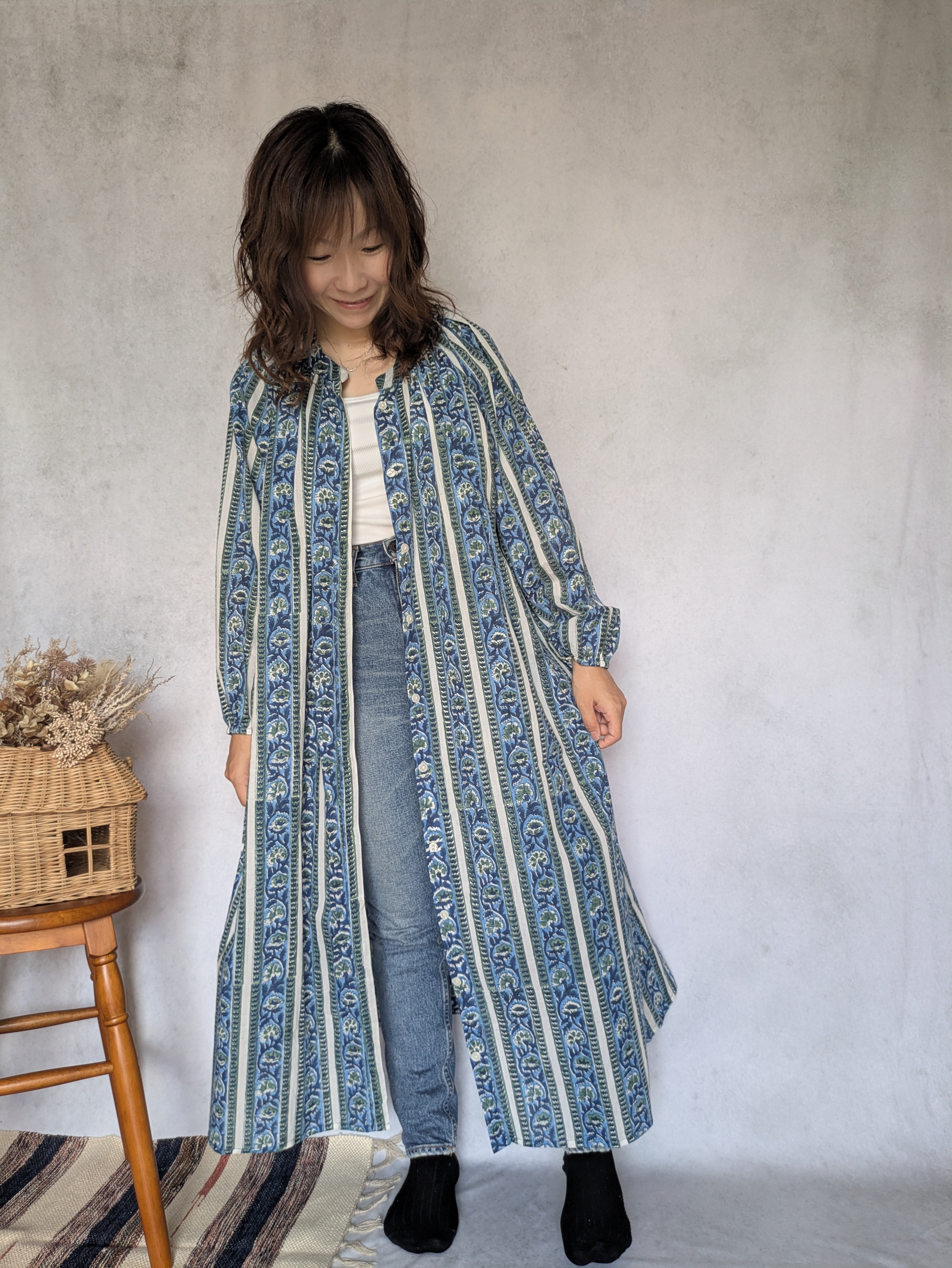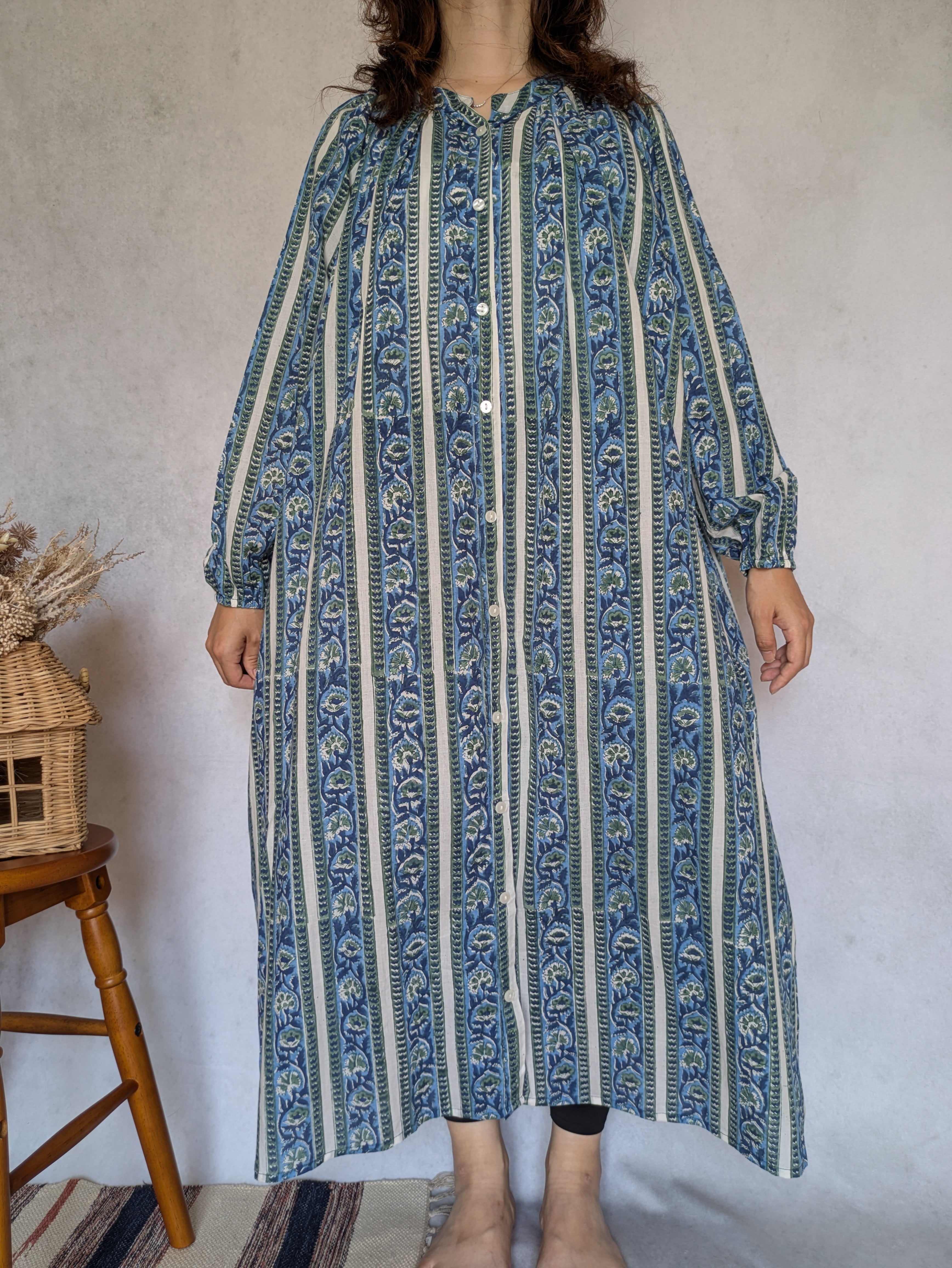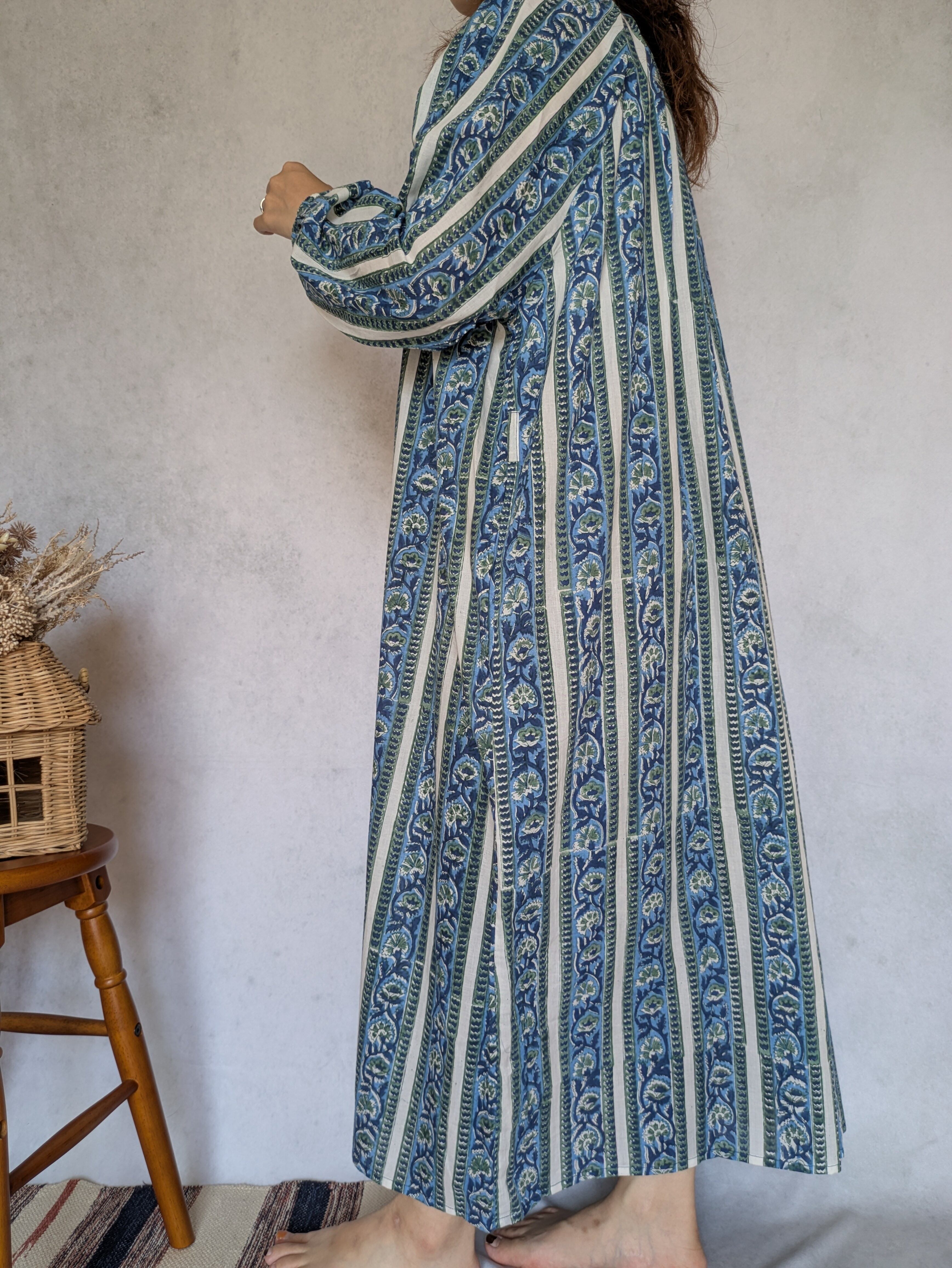 こちらは、インドの伝統工芸であるハンドブロックプリントで作られたワンピースです。