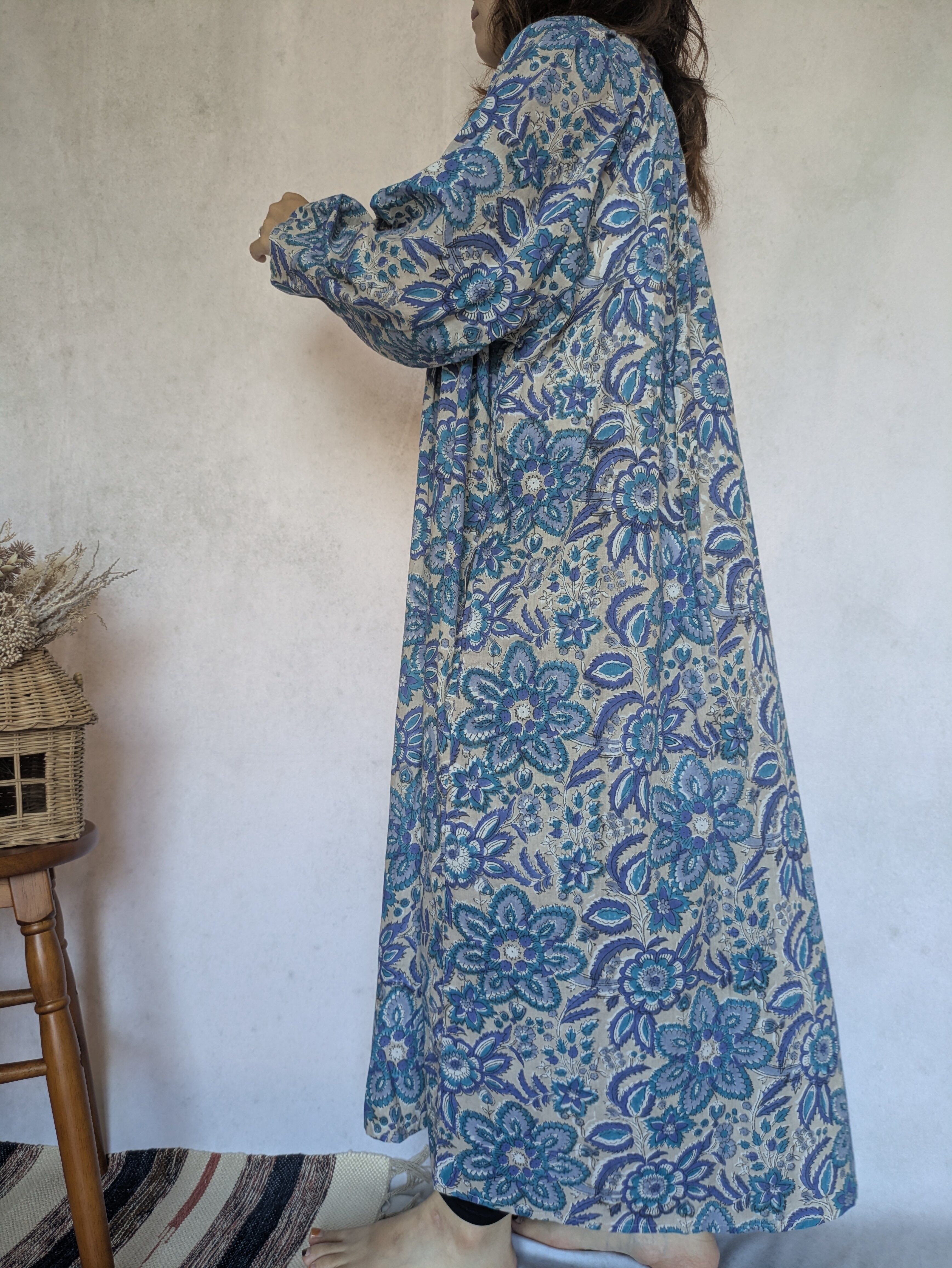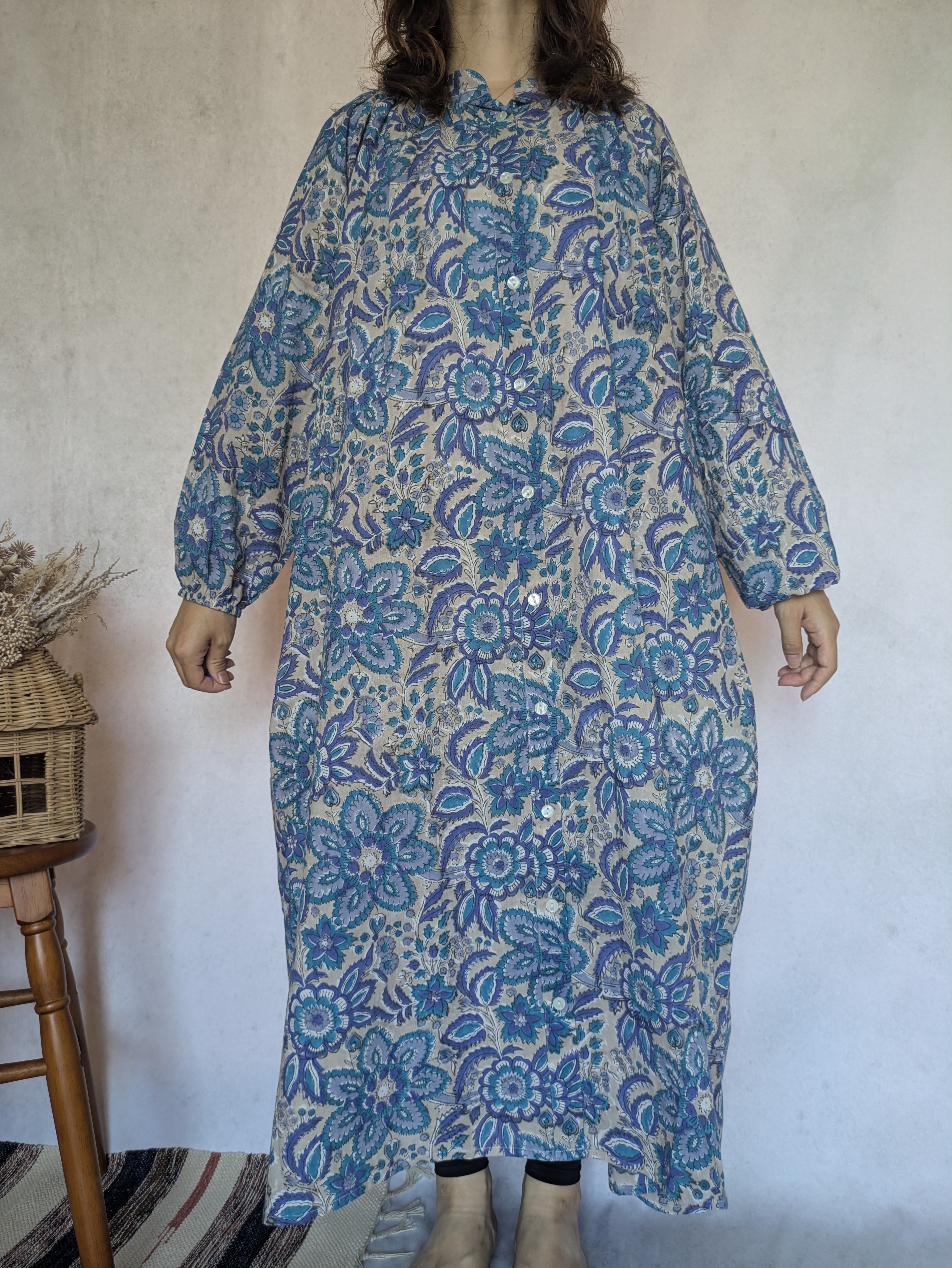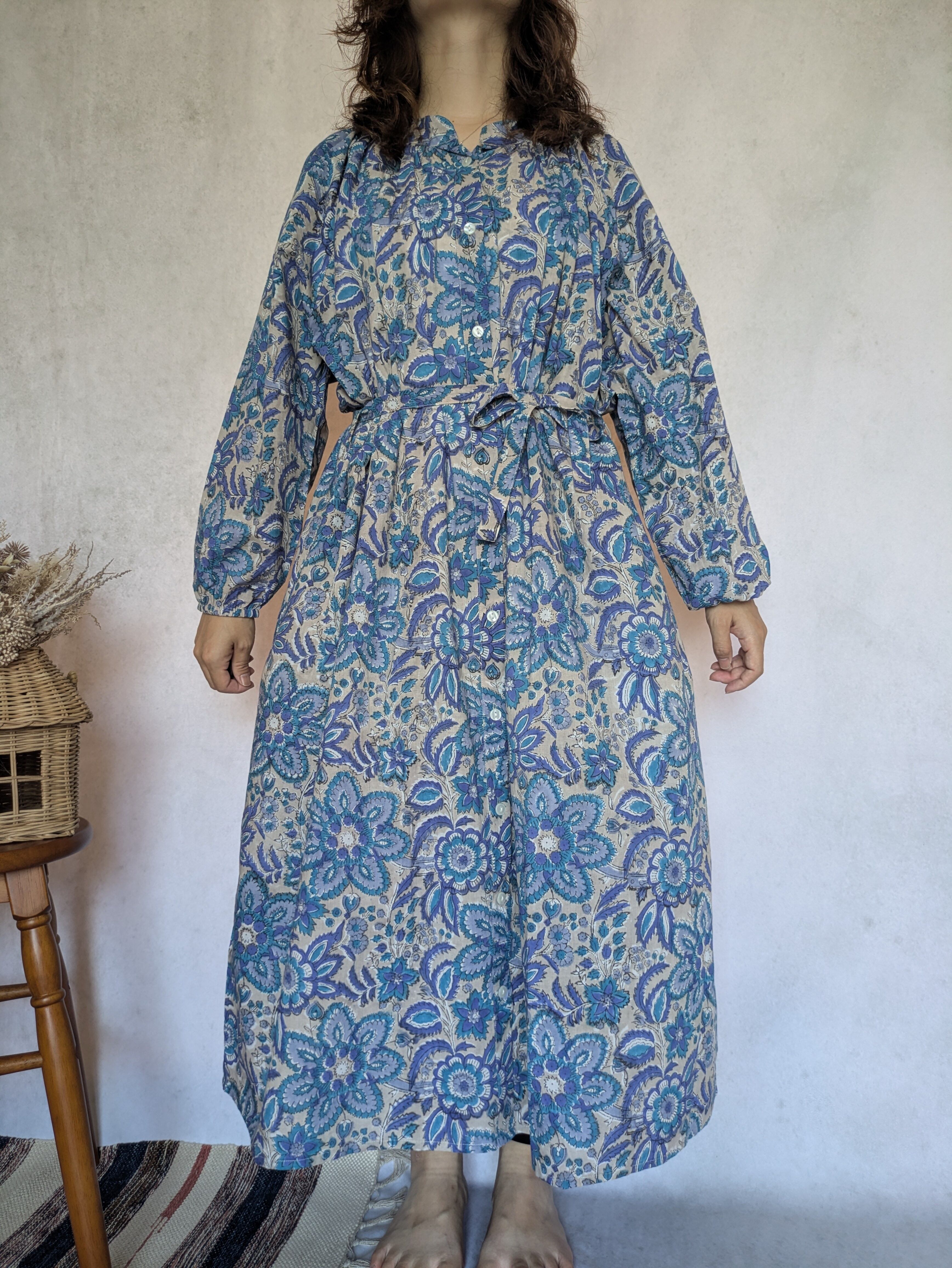 こちらは、インドの伝統工芸であるハンドブロックプリントで作られたワンピースです。