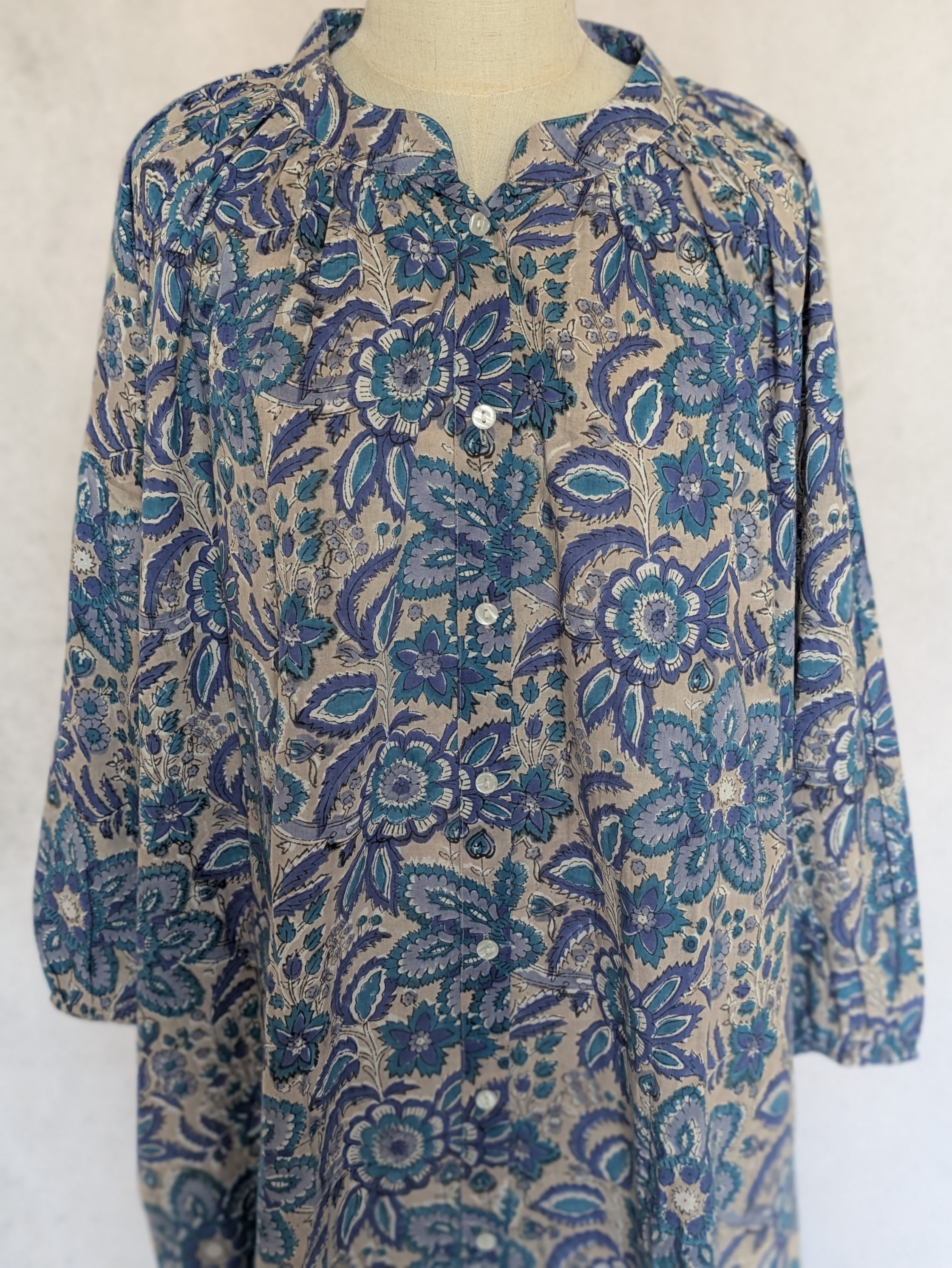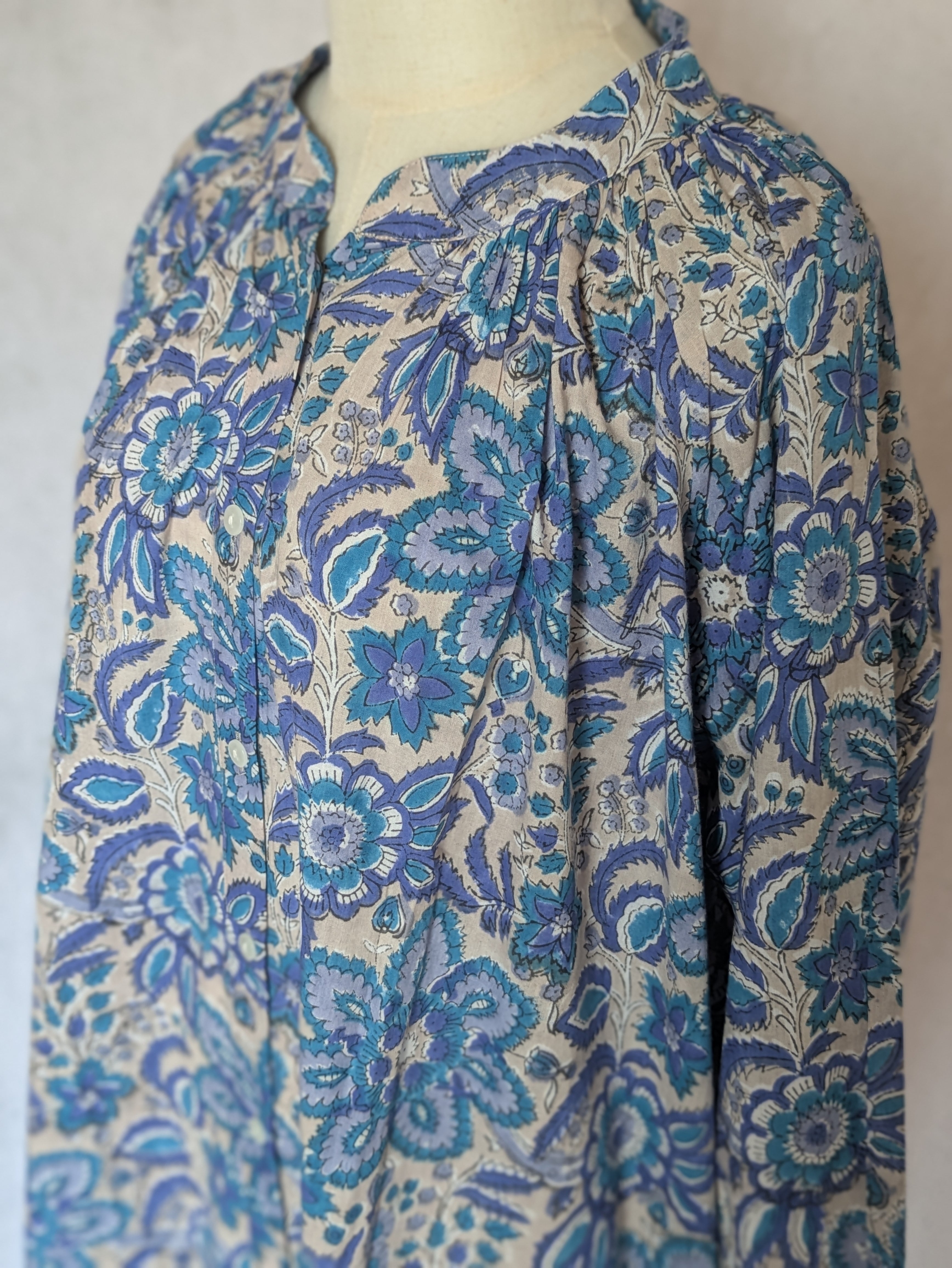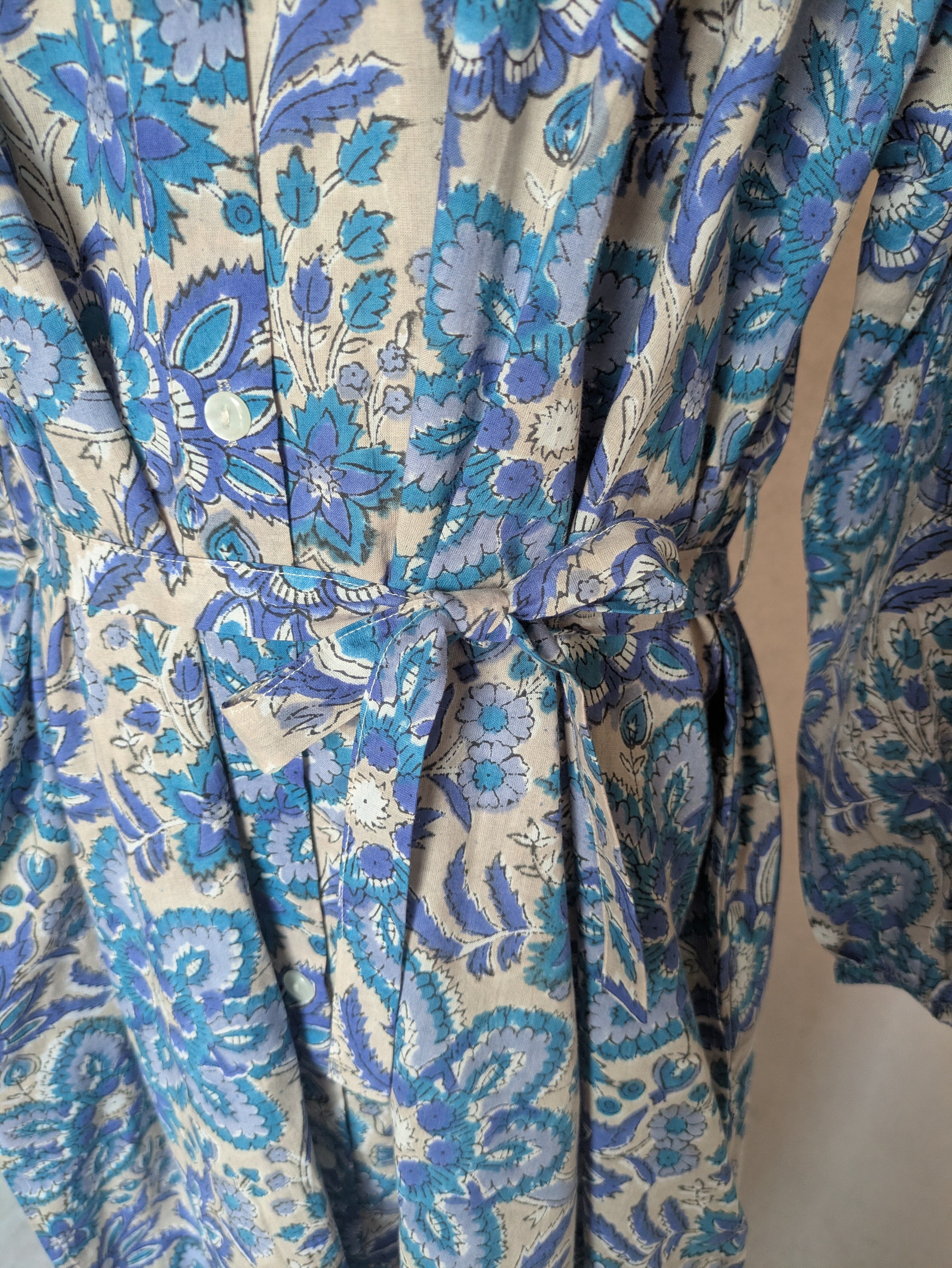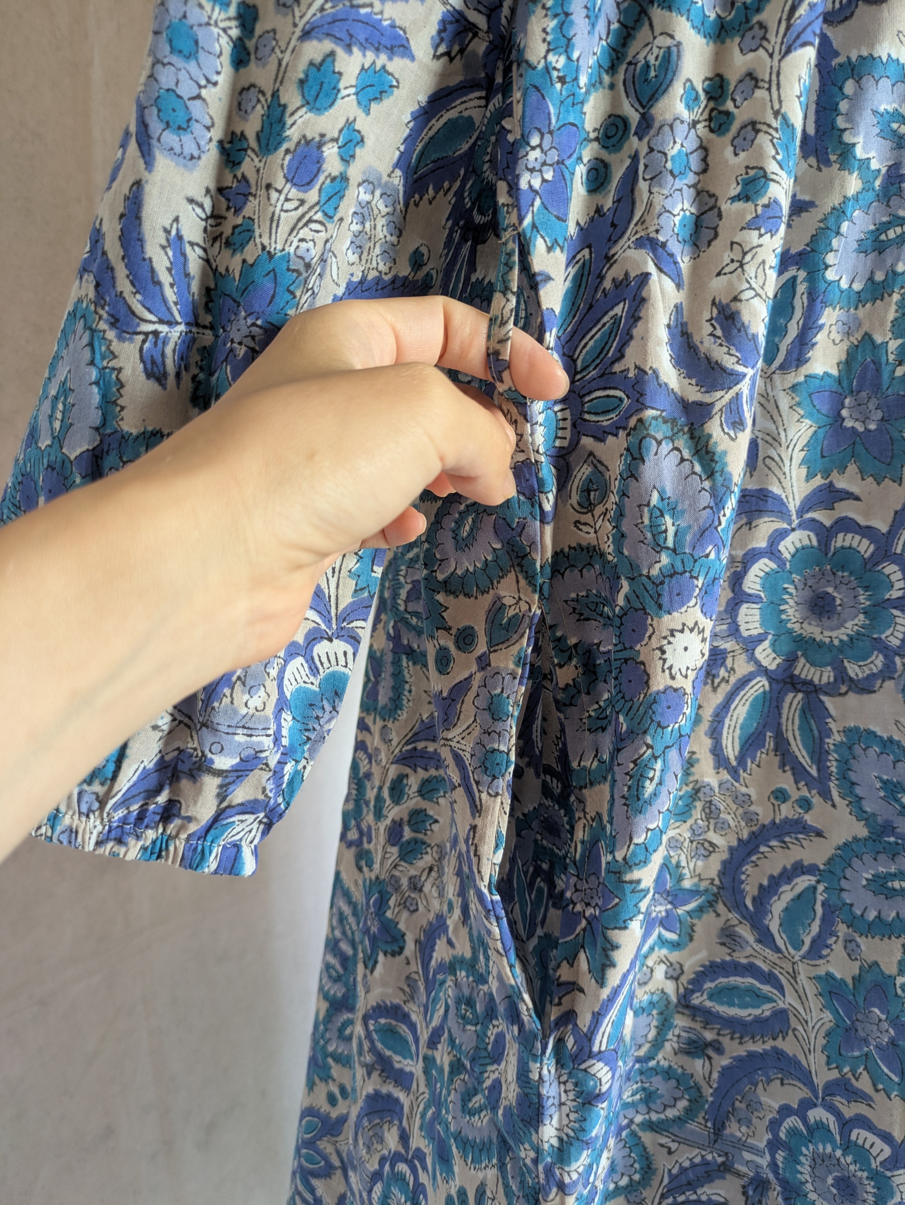 こちらは、インドの伝統工芸であるハンドブロックプリントで作られたワンピースです。