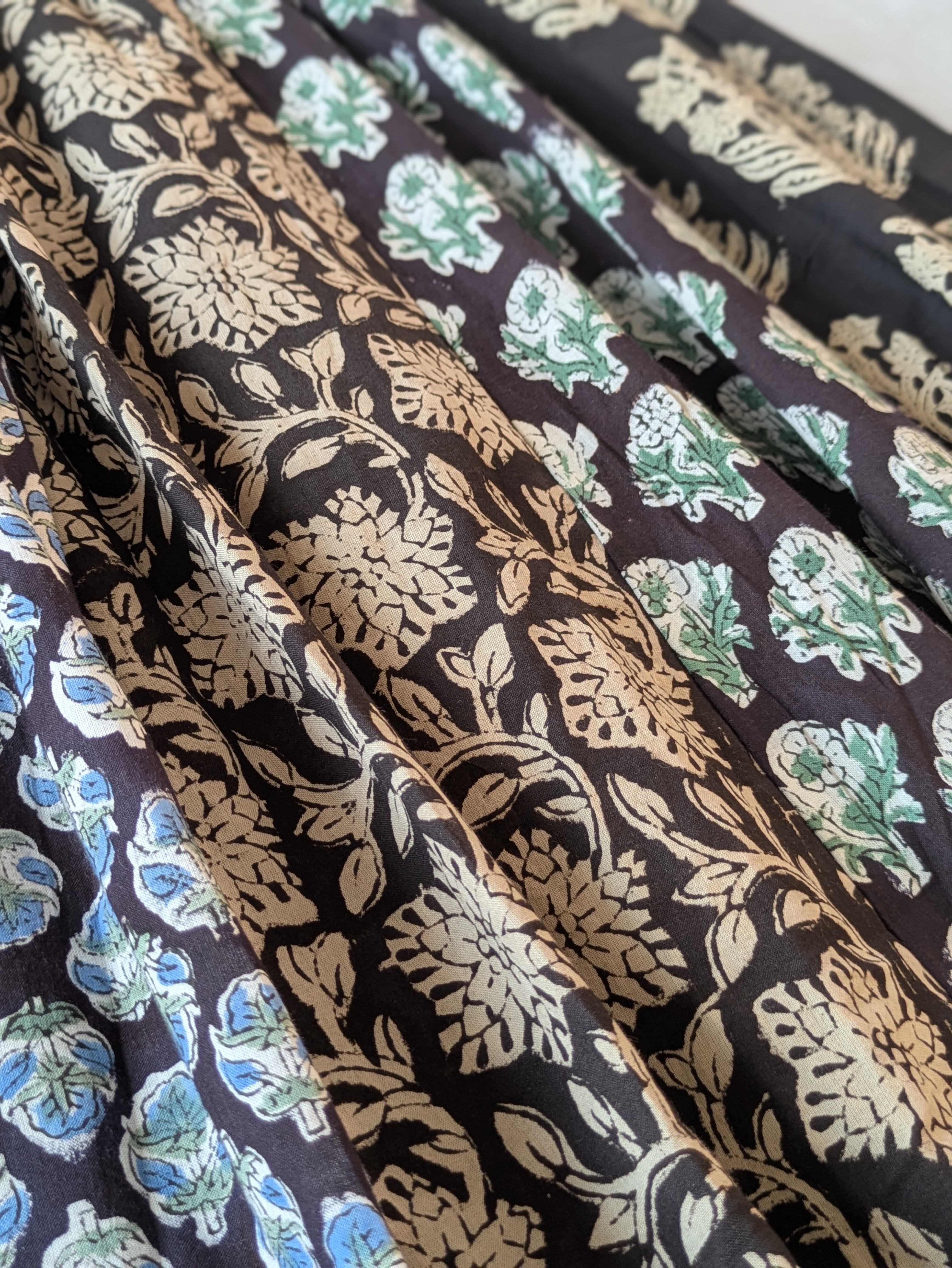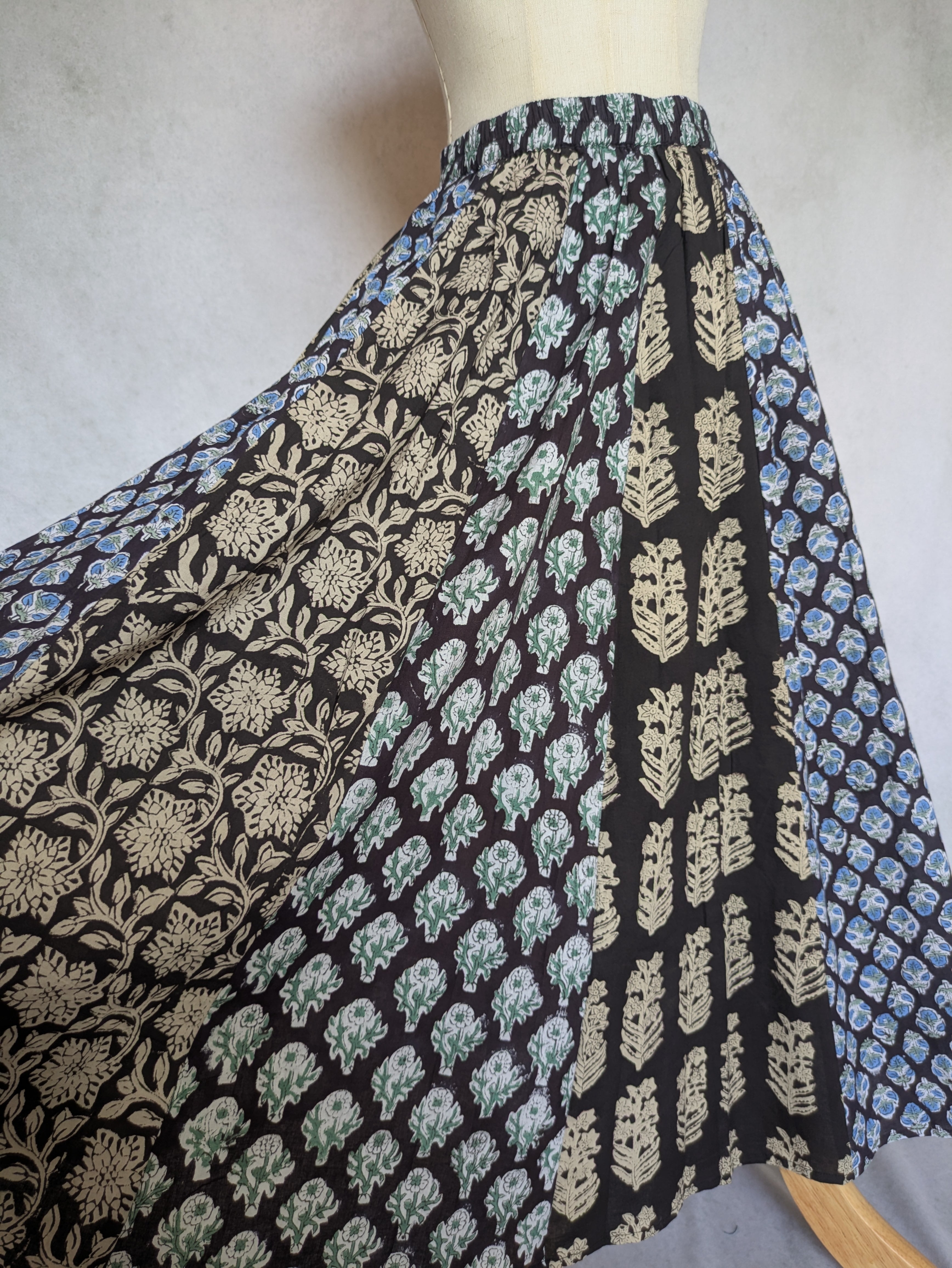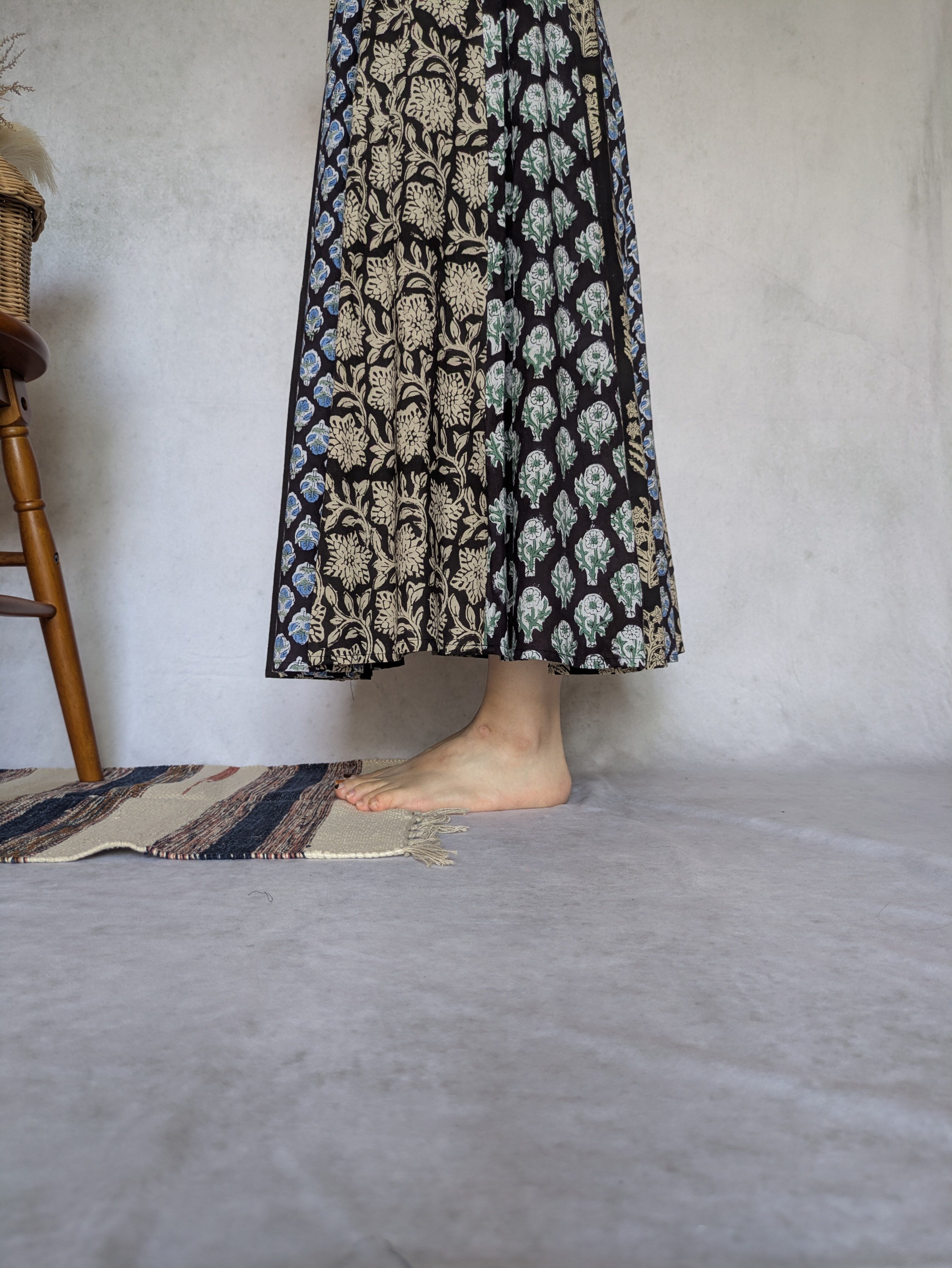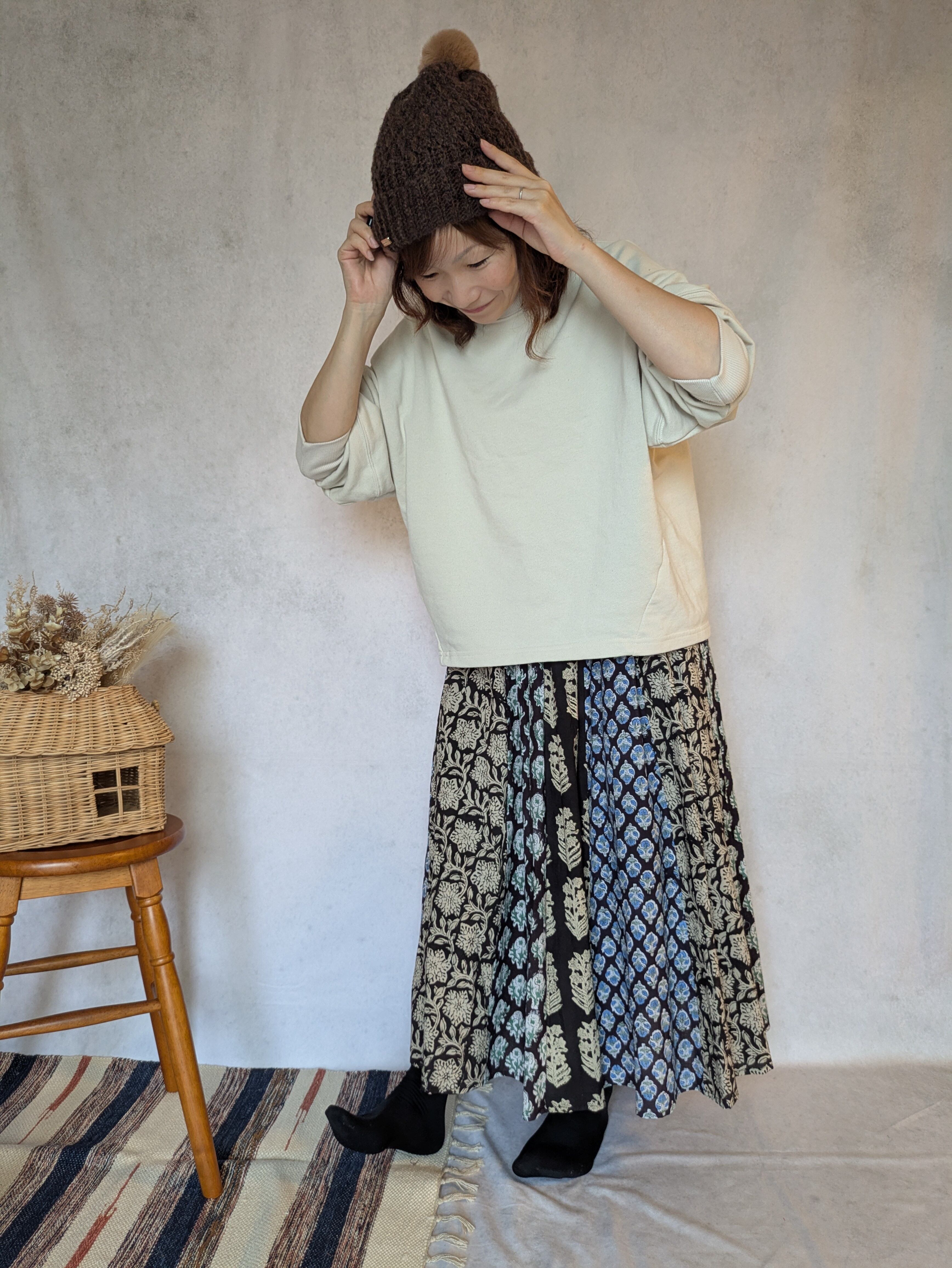 こちらは、インドの伝統工芸であるハンドブロックプリントで作られたスカートです。