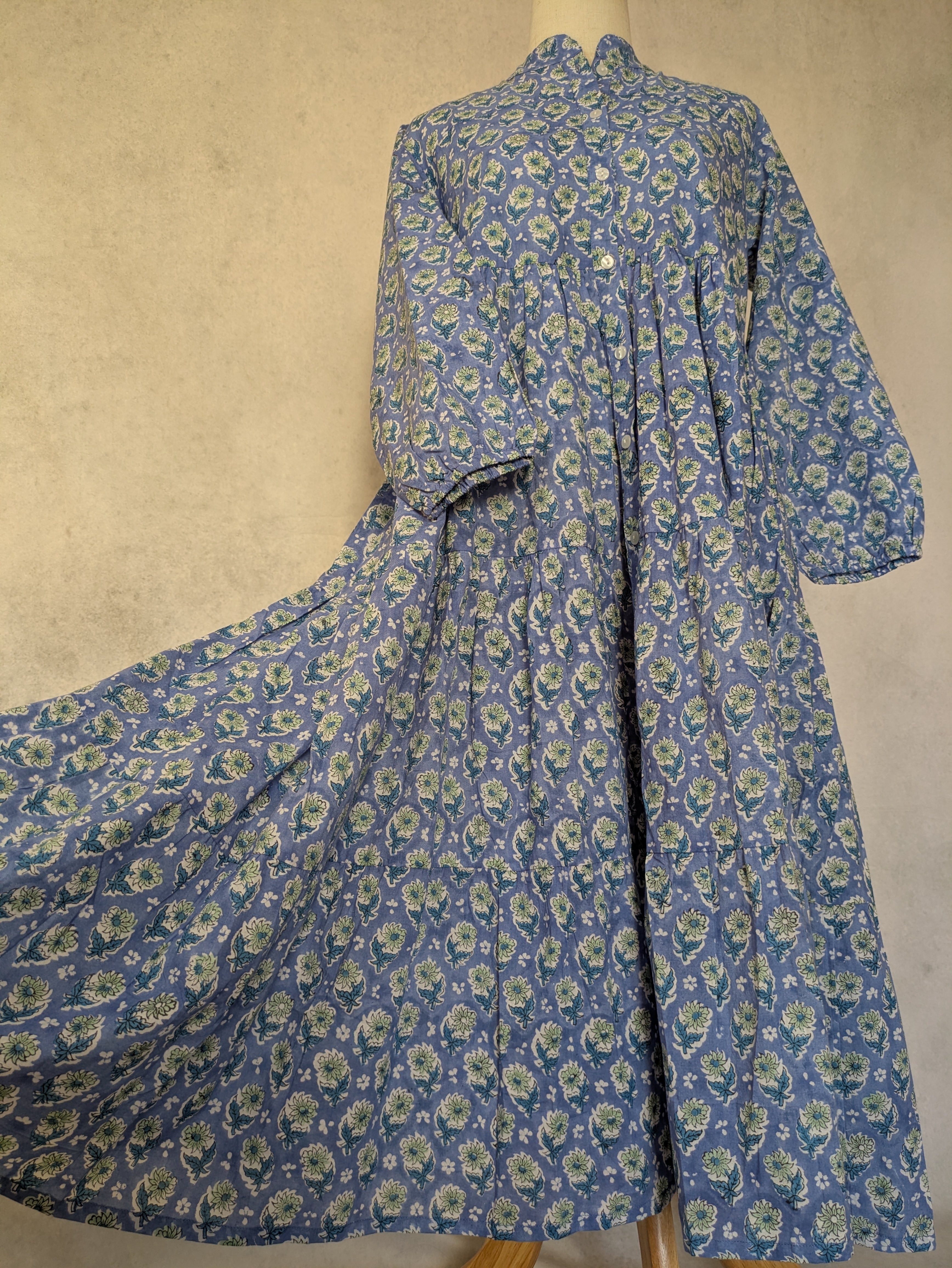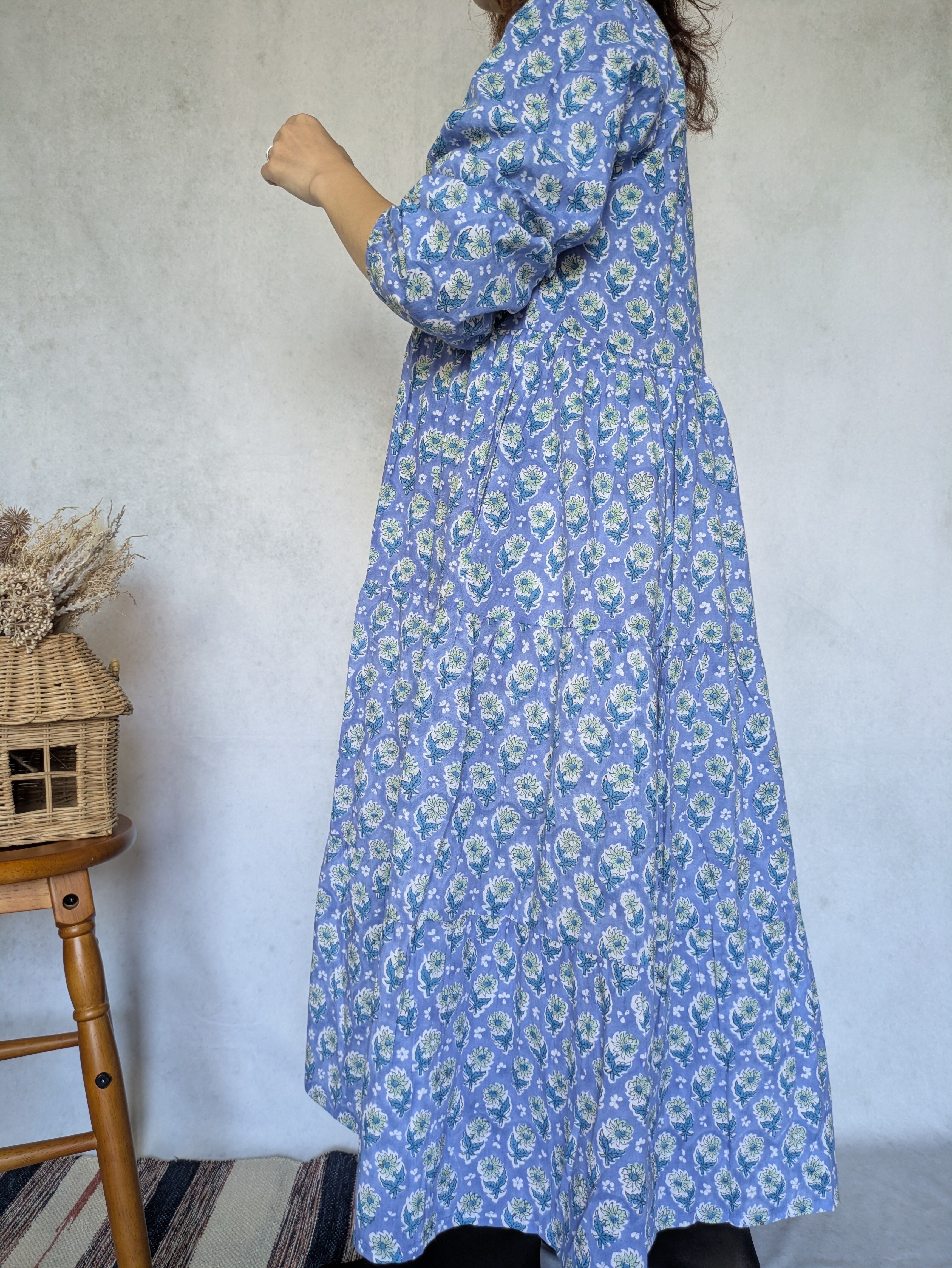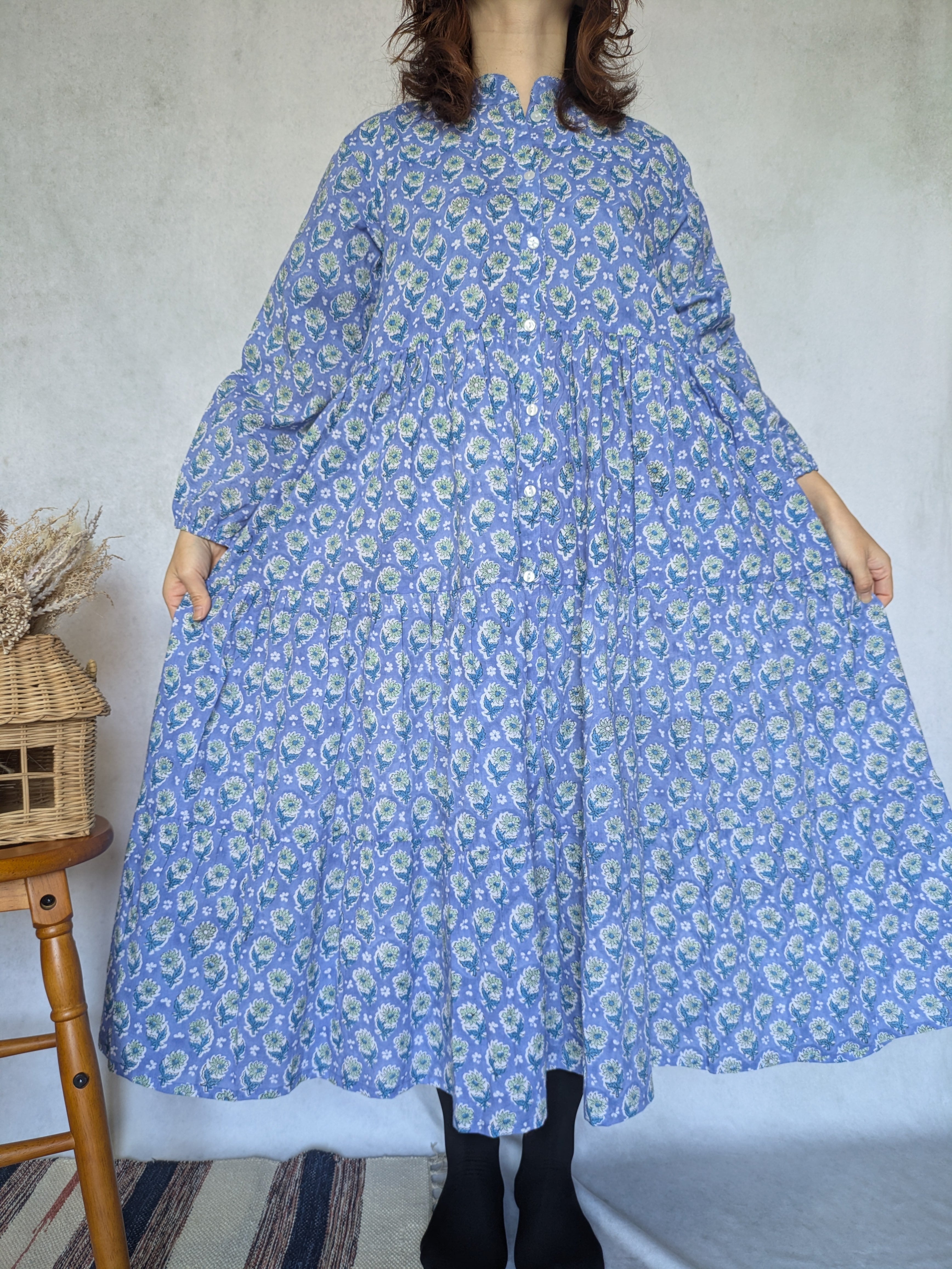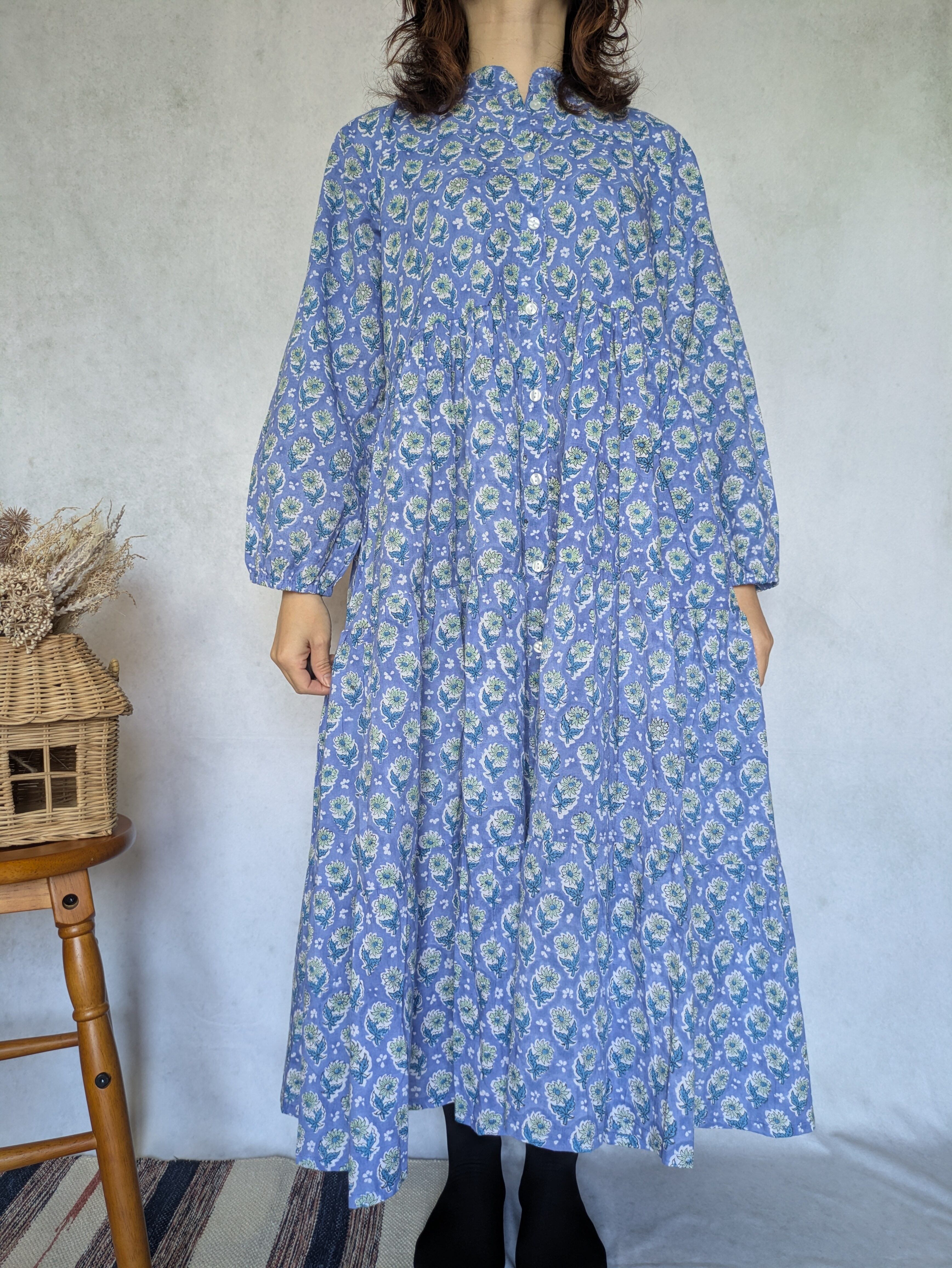 こちらは、インドの伝統工芸であるハンドブロックプリントで作られたワンピースです。