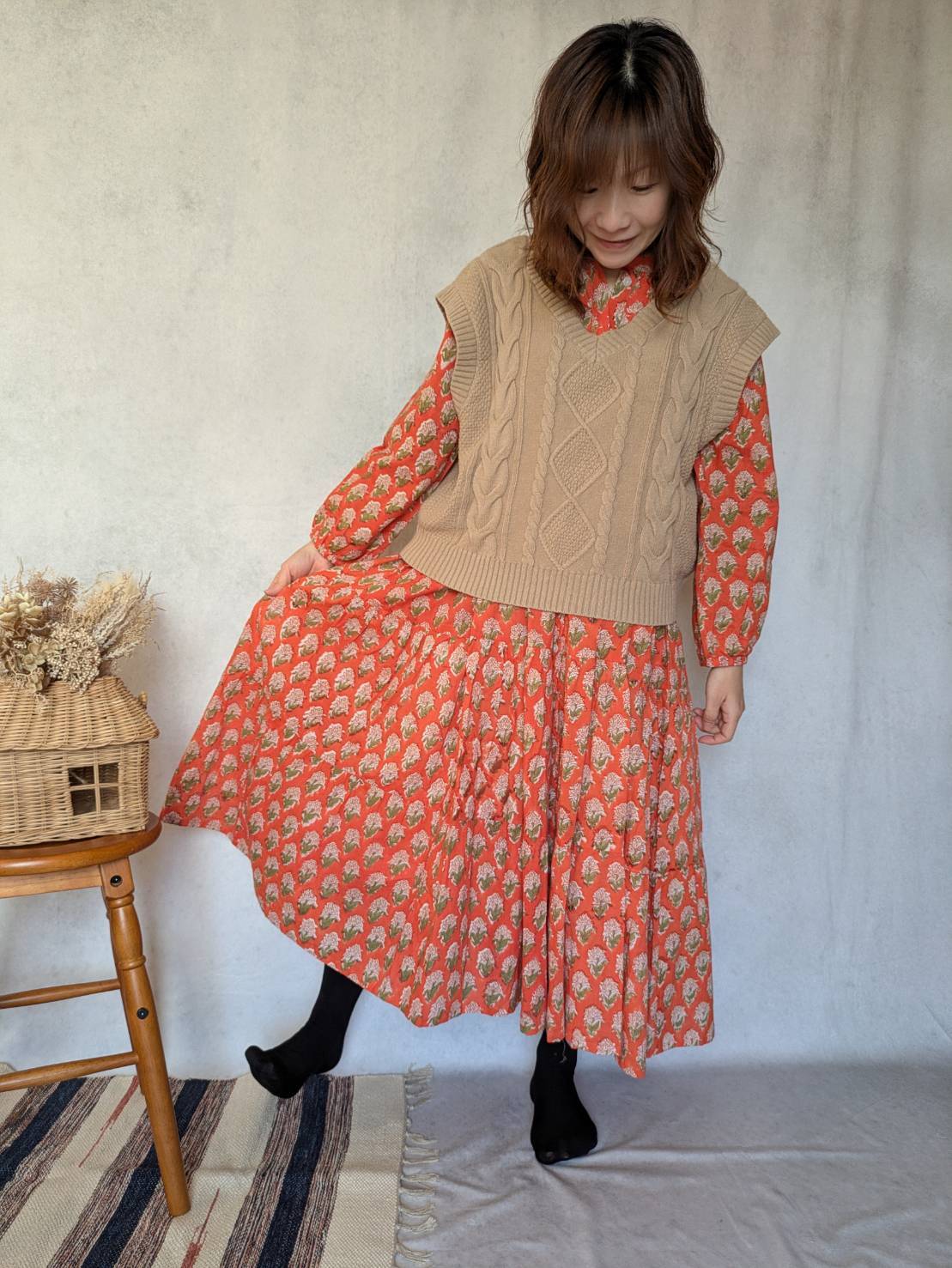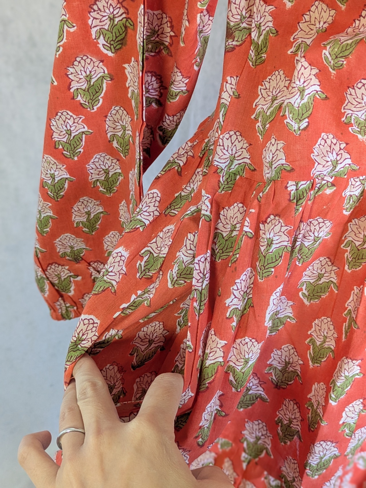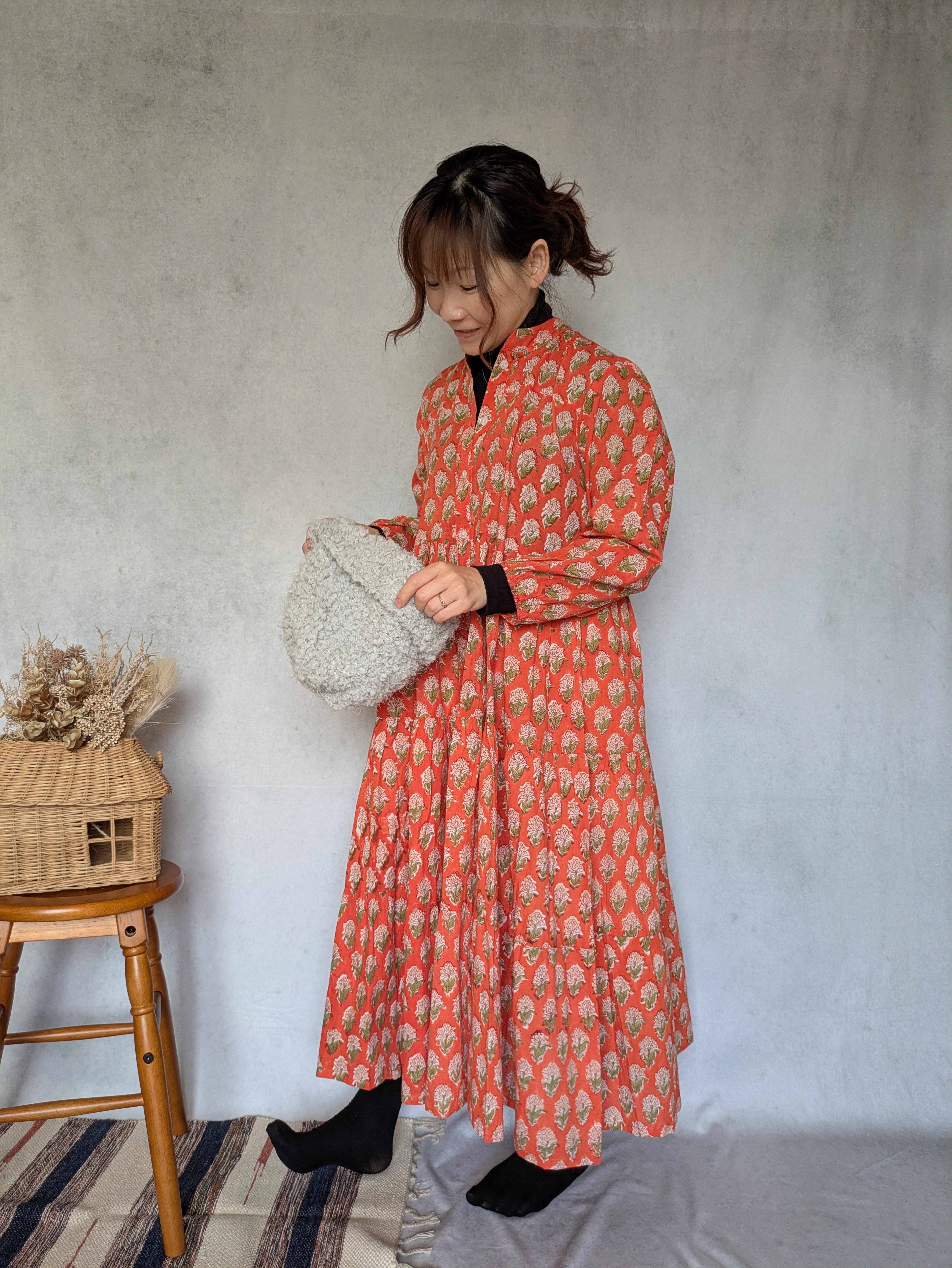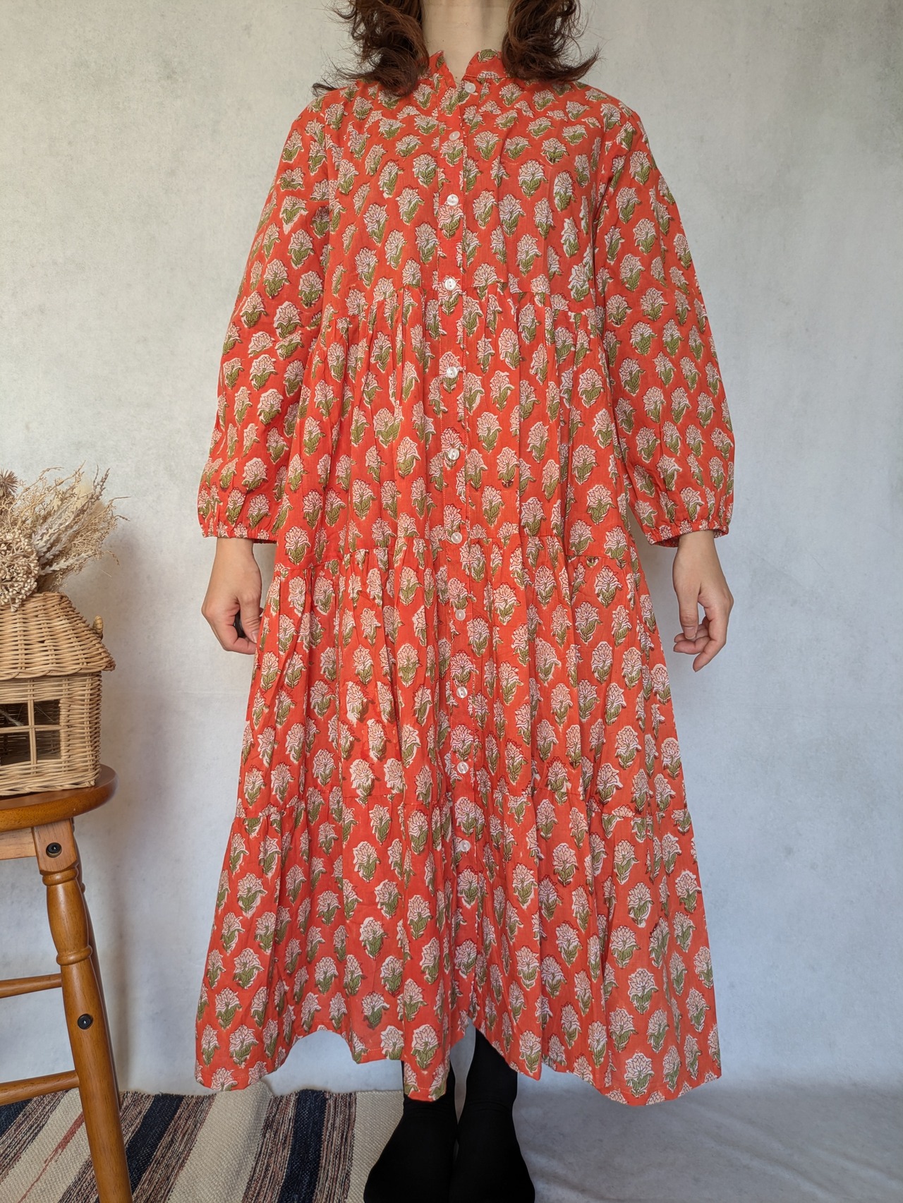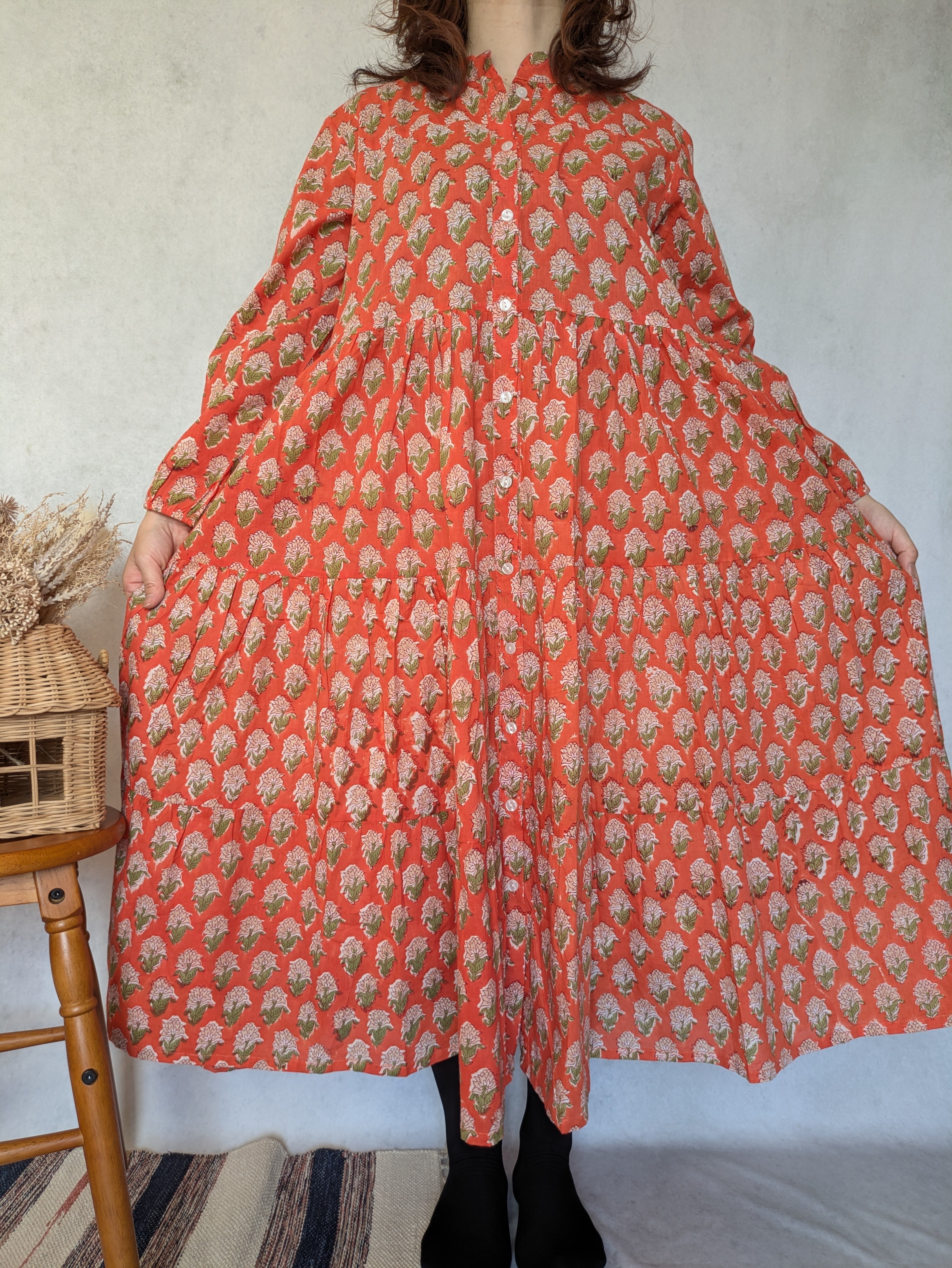 こちらは、インドの伝統工芸であるハンドブロックプリントで作られたワンピースです。