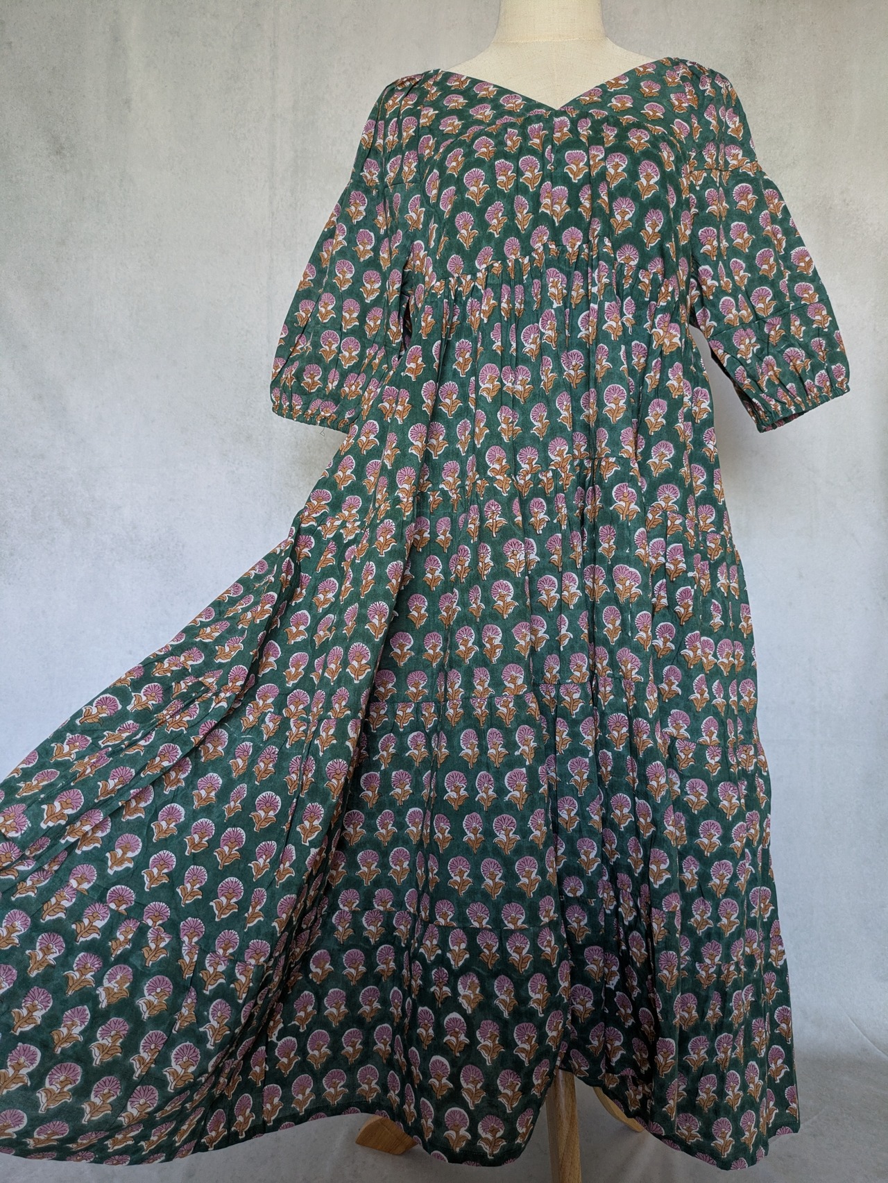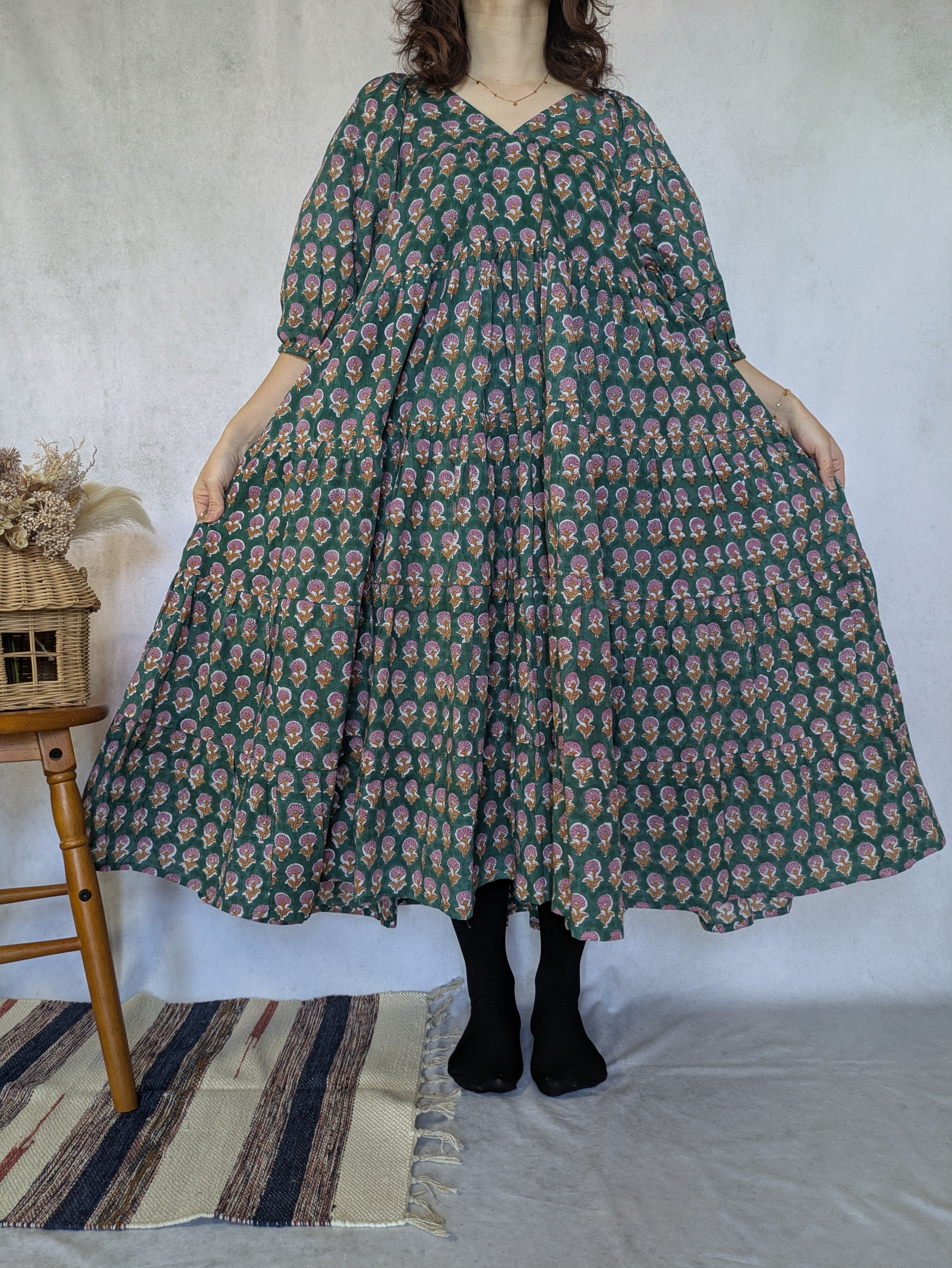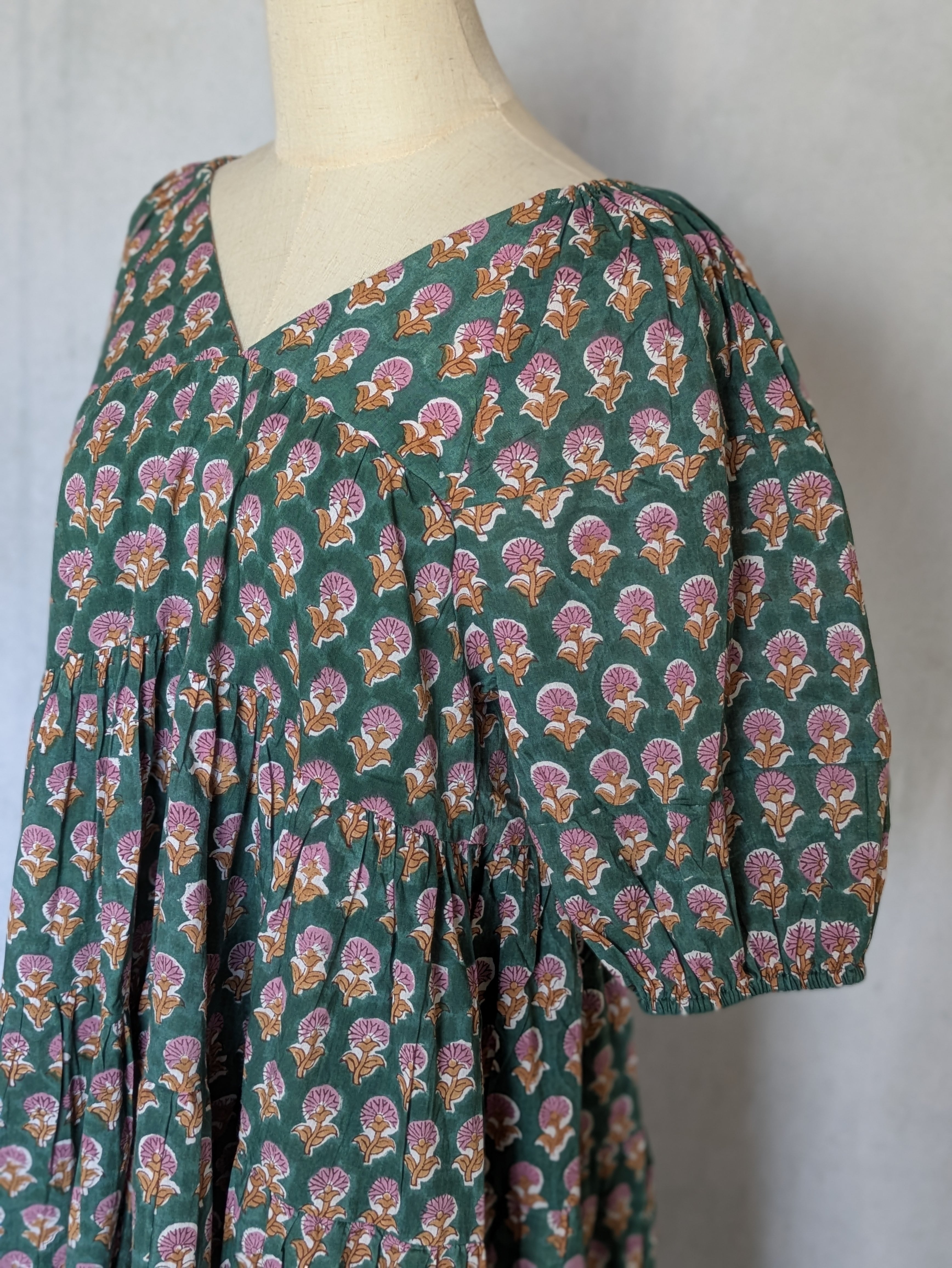 こちらは、インドの伝統工芸であるハンドブロックプリントで作られたワンピースです。
