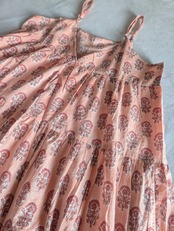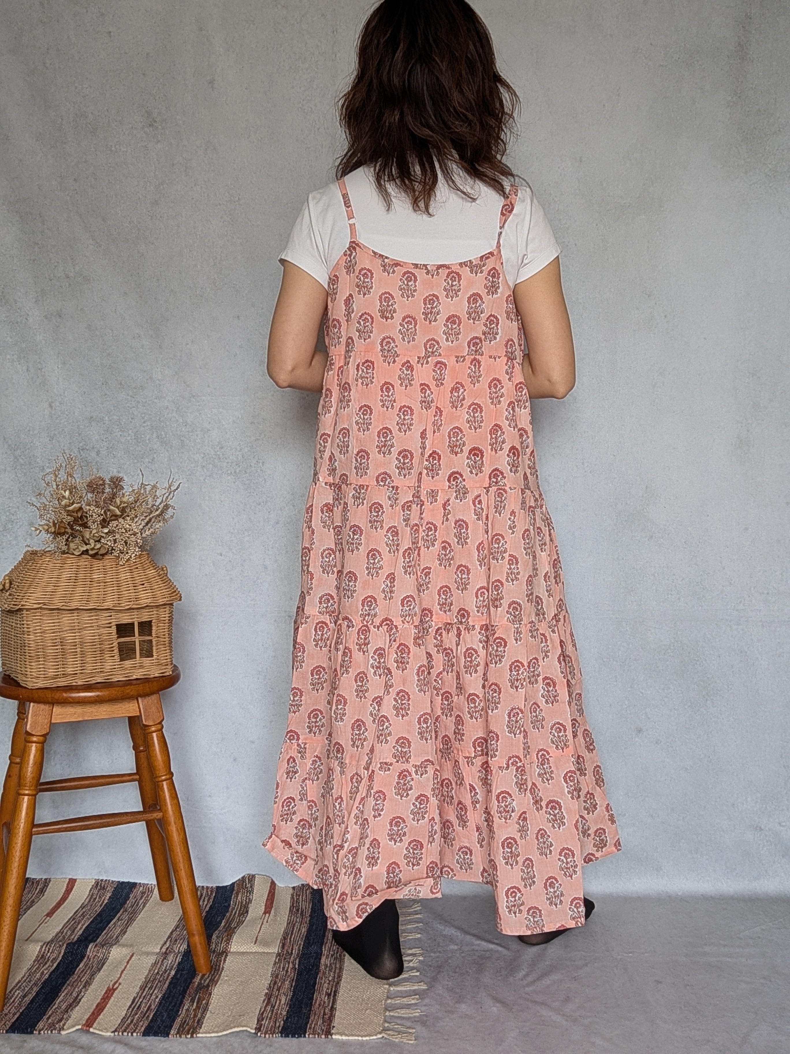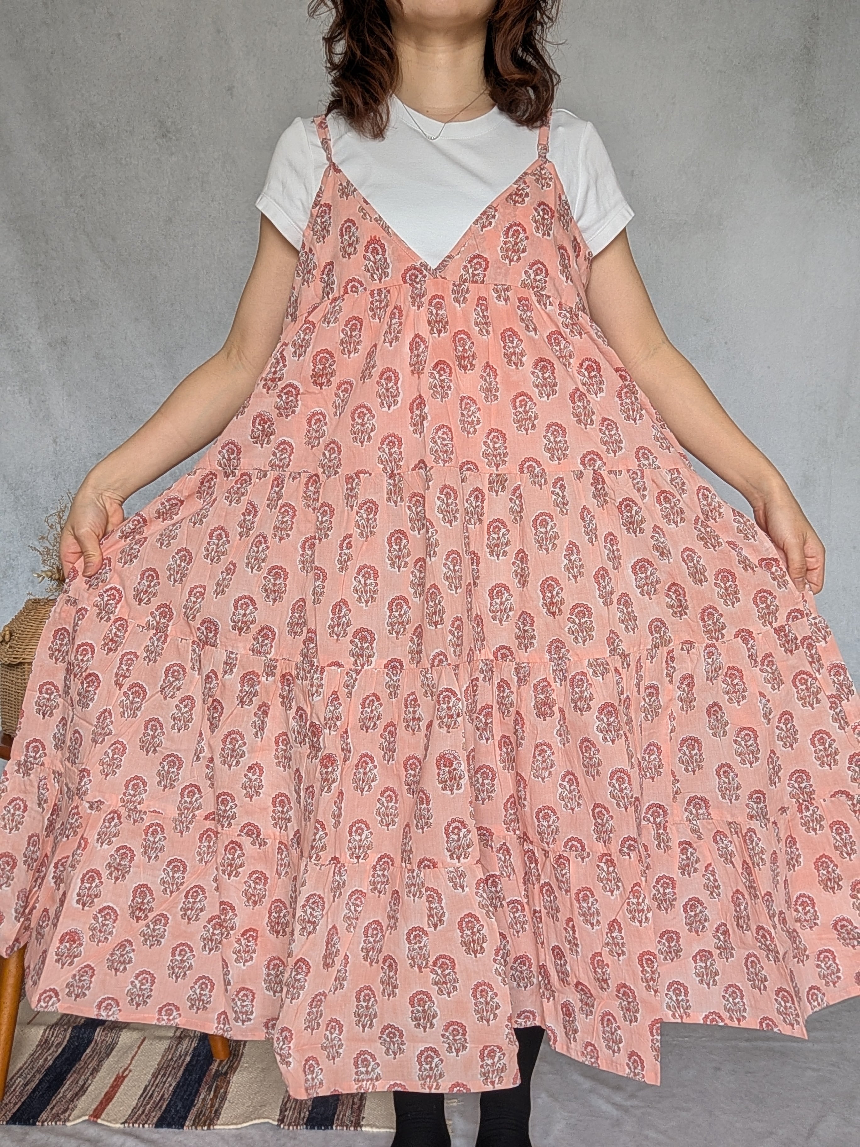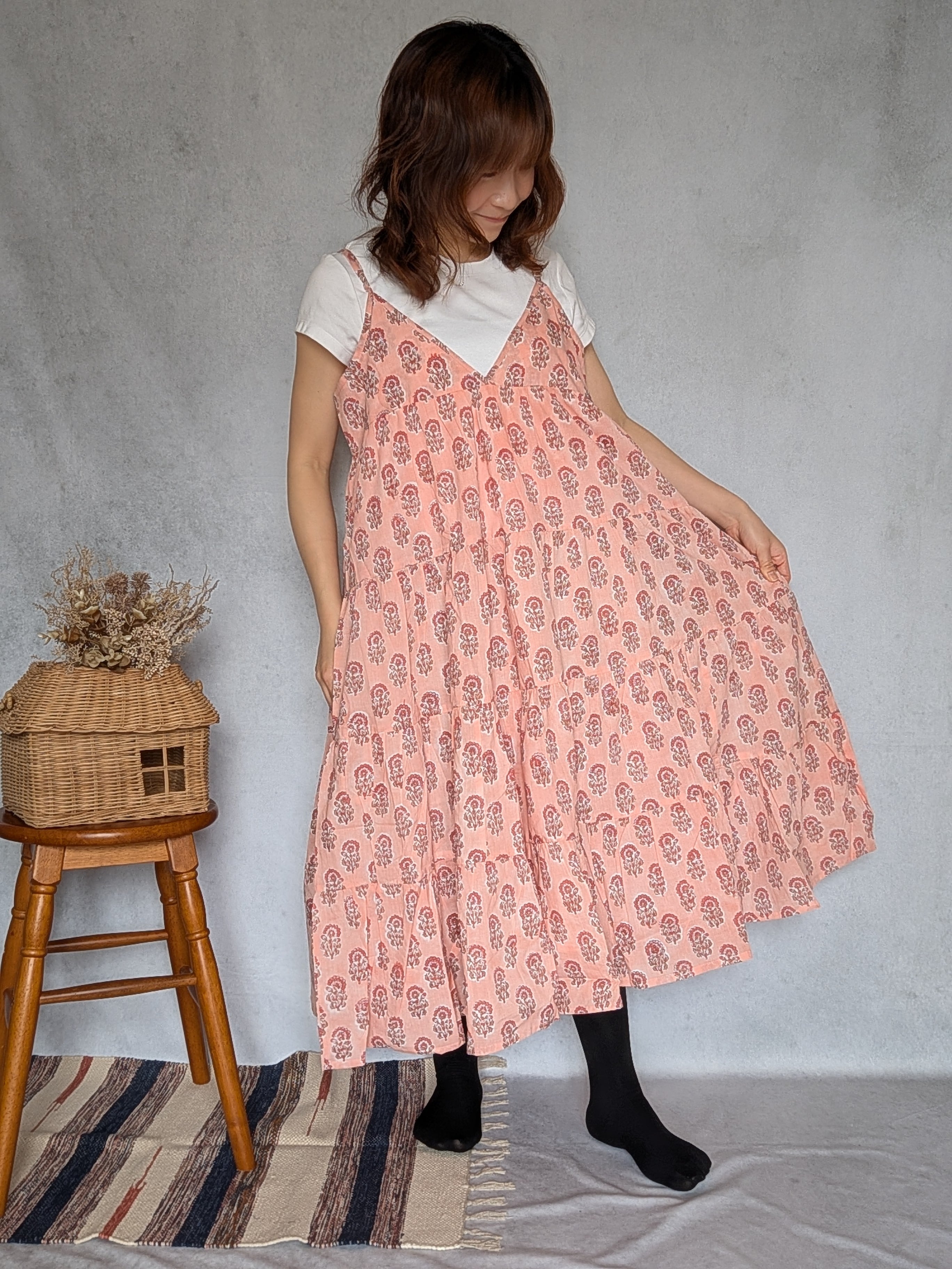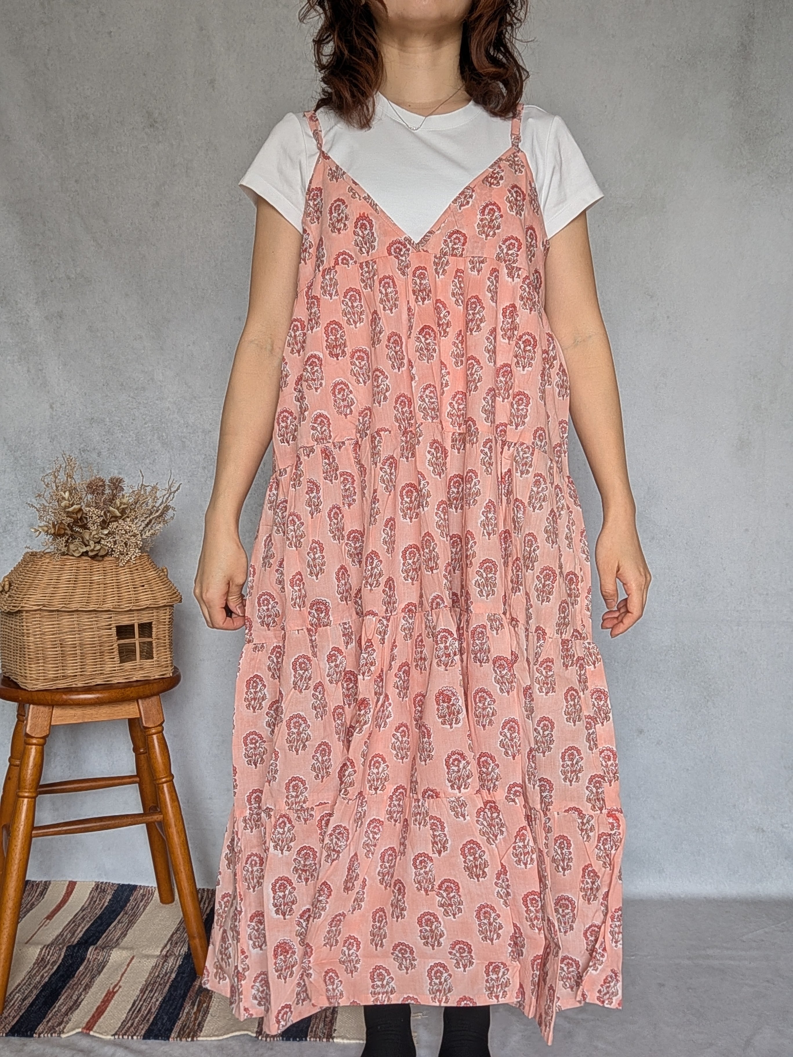 こちらは、インドの伝統工芸であるハンドブロックプリントで作られたワンピースです。