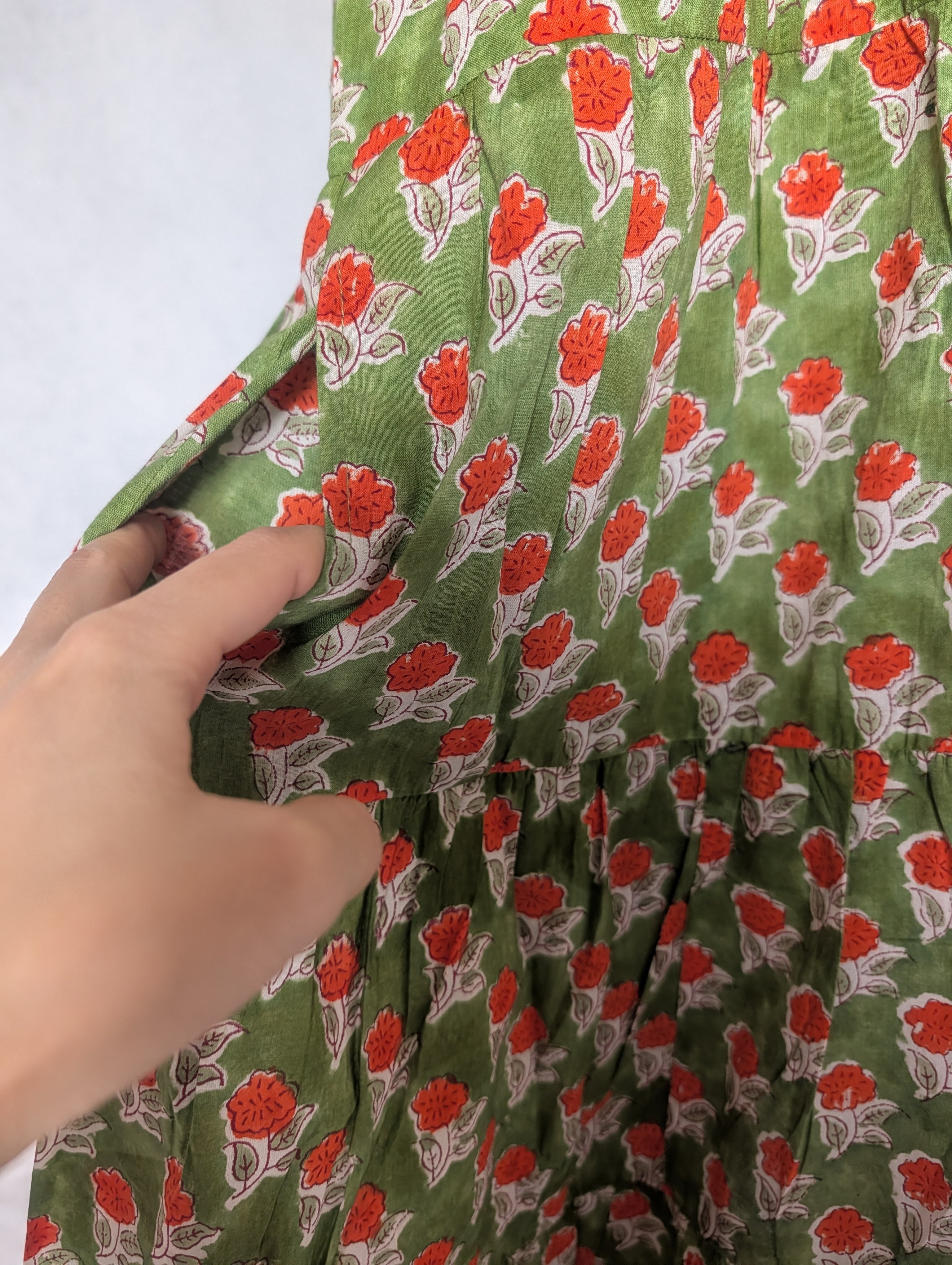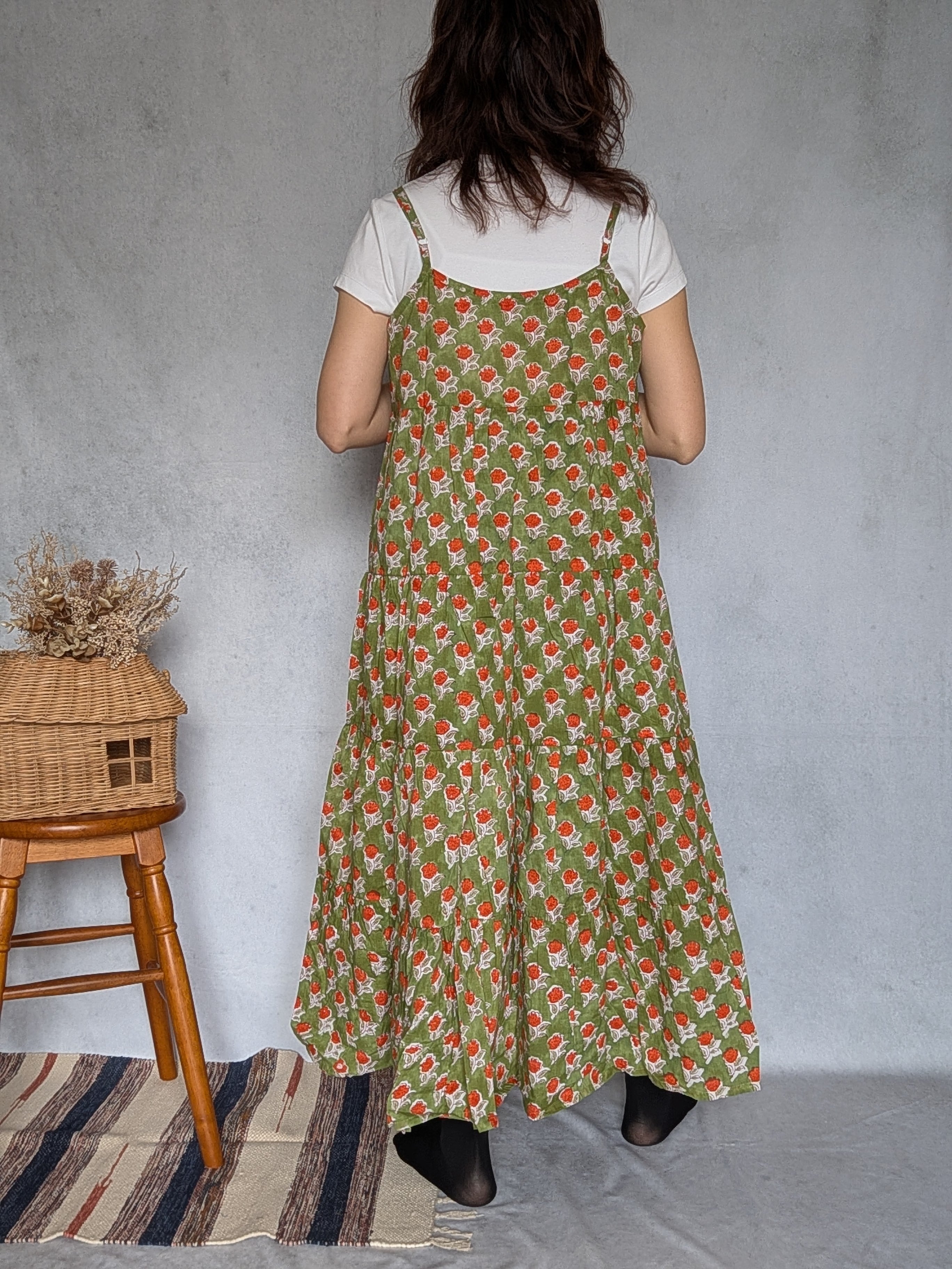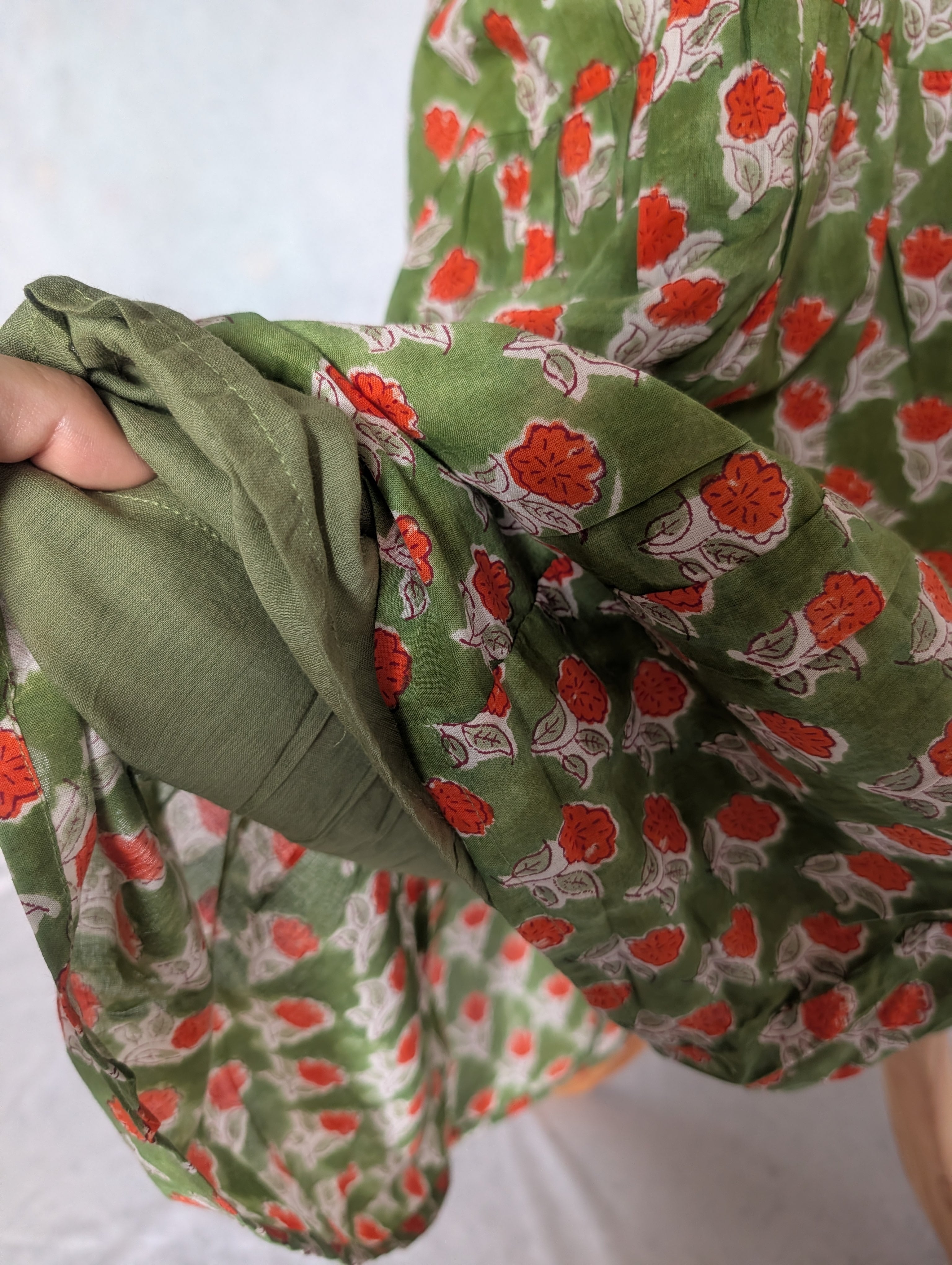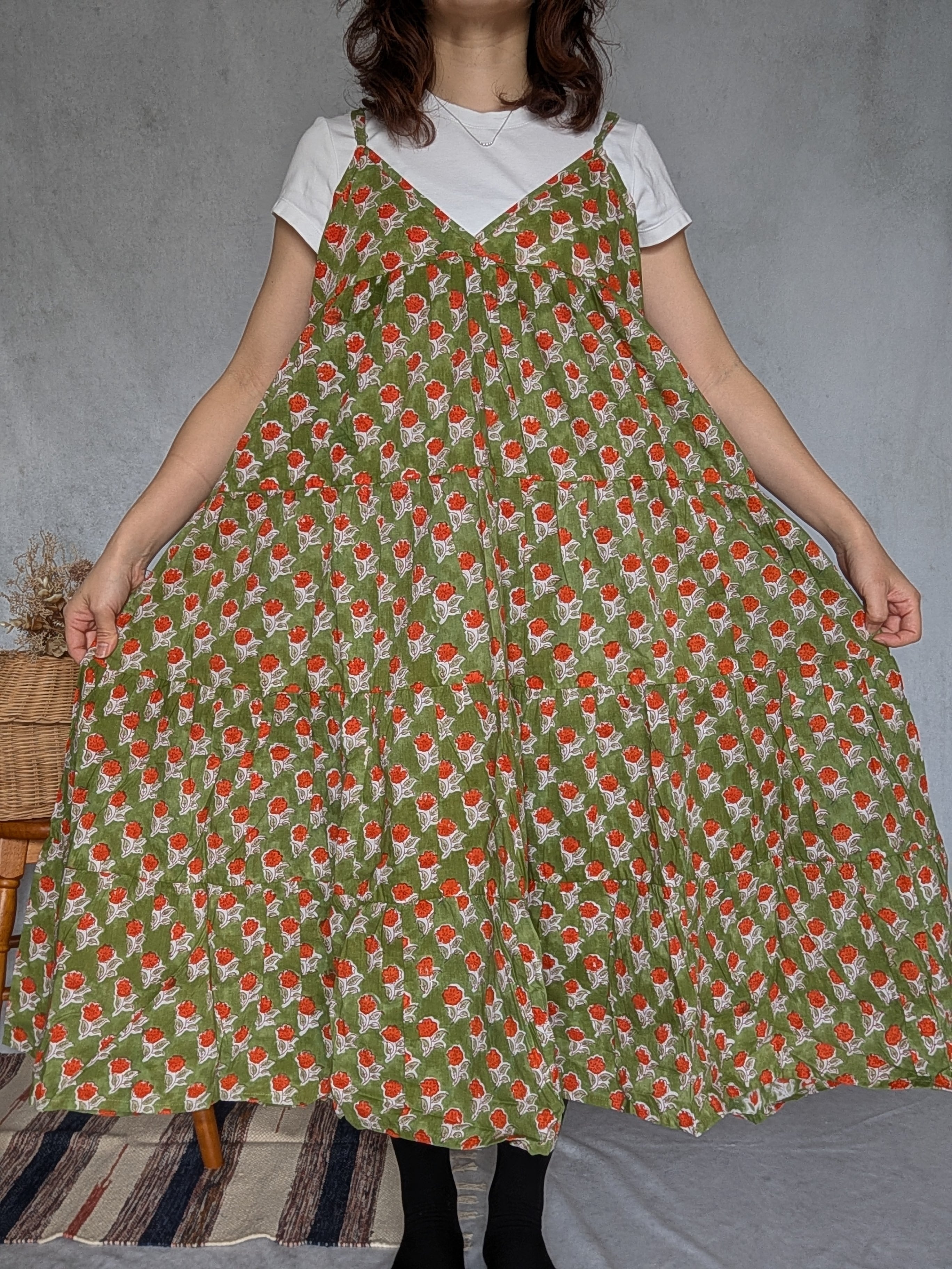 こちらは、インドの伝統工芸であるハンドブロックプリントで作られたワンピースです。