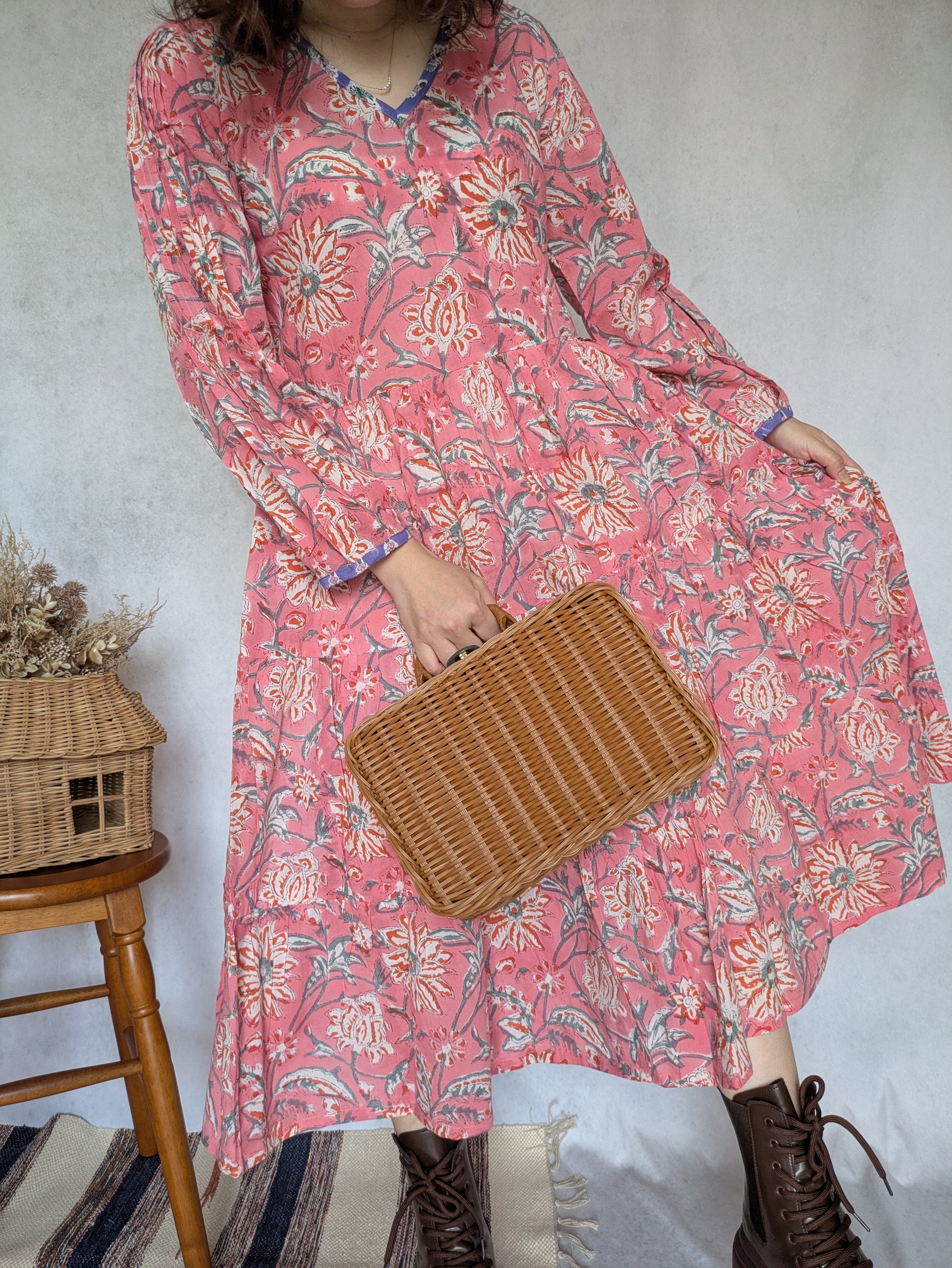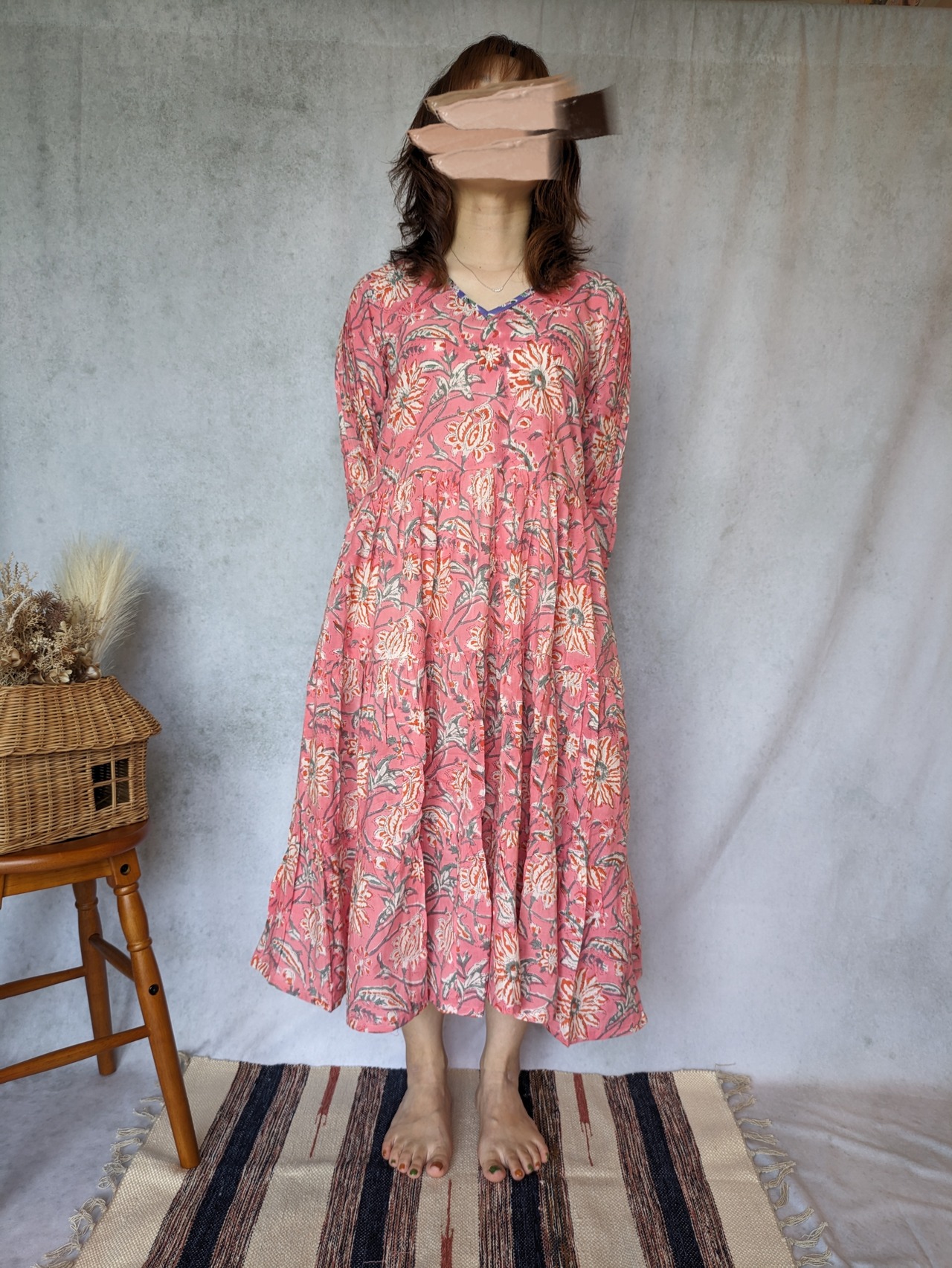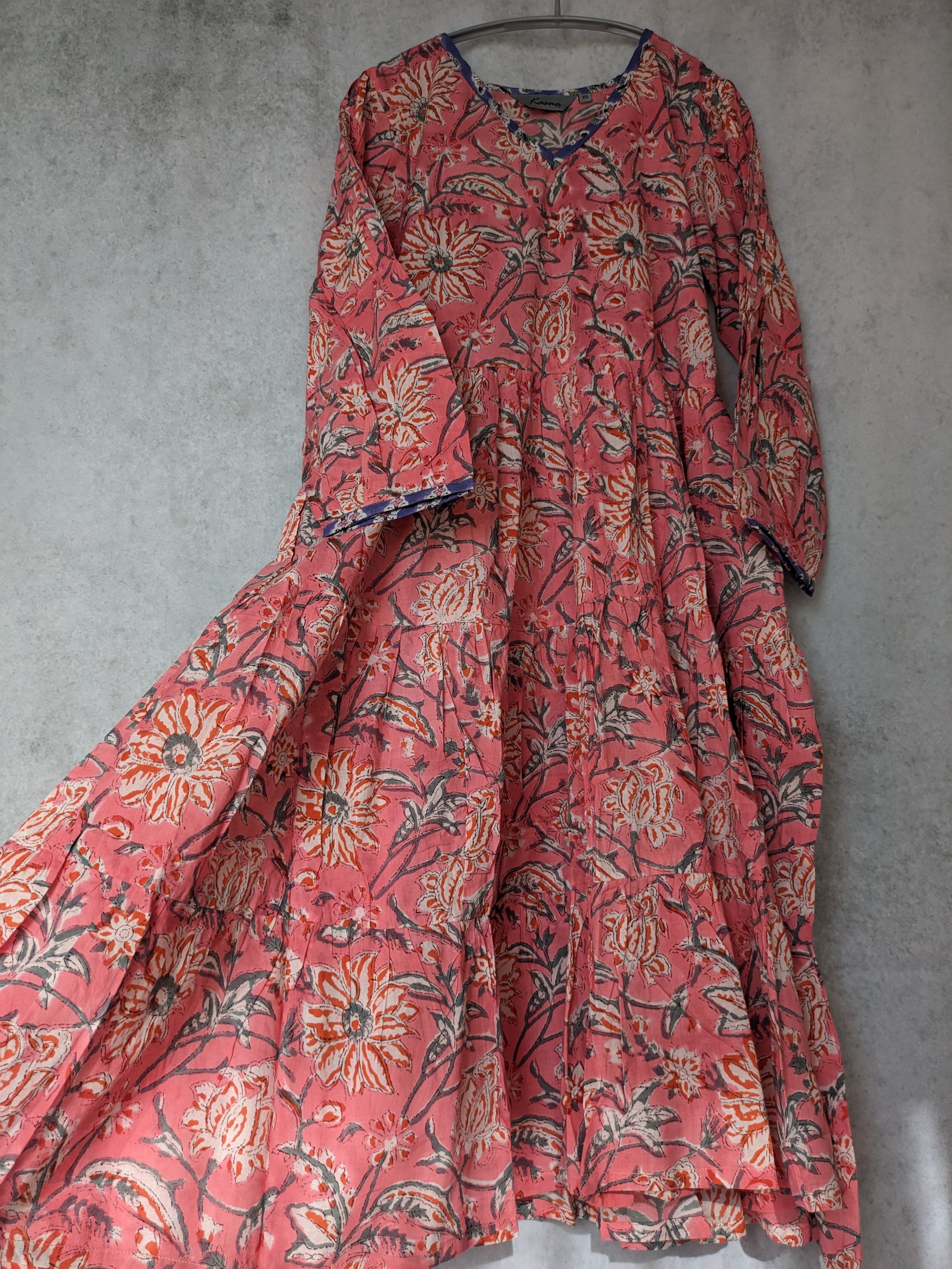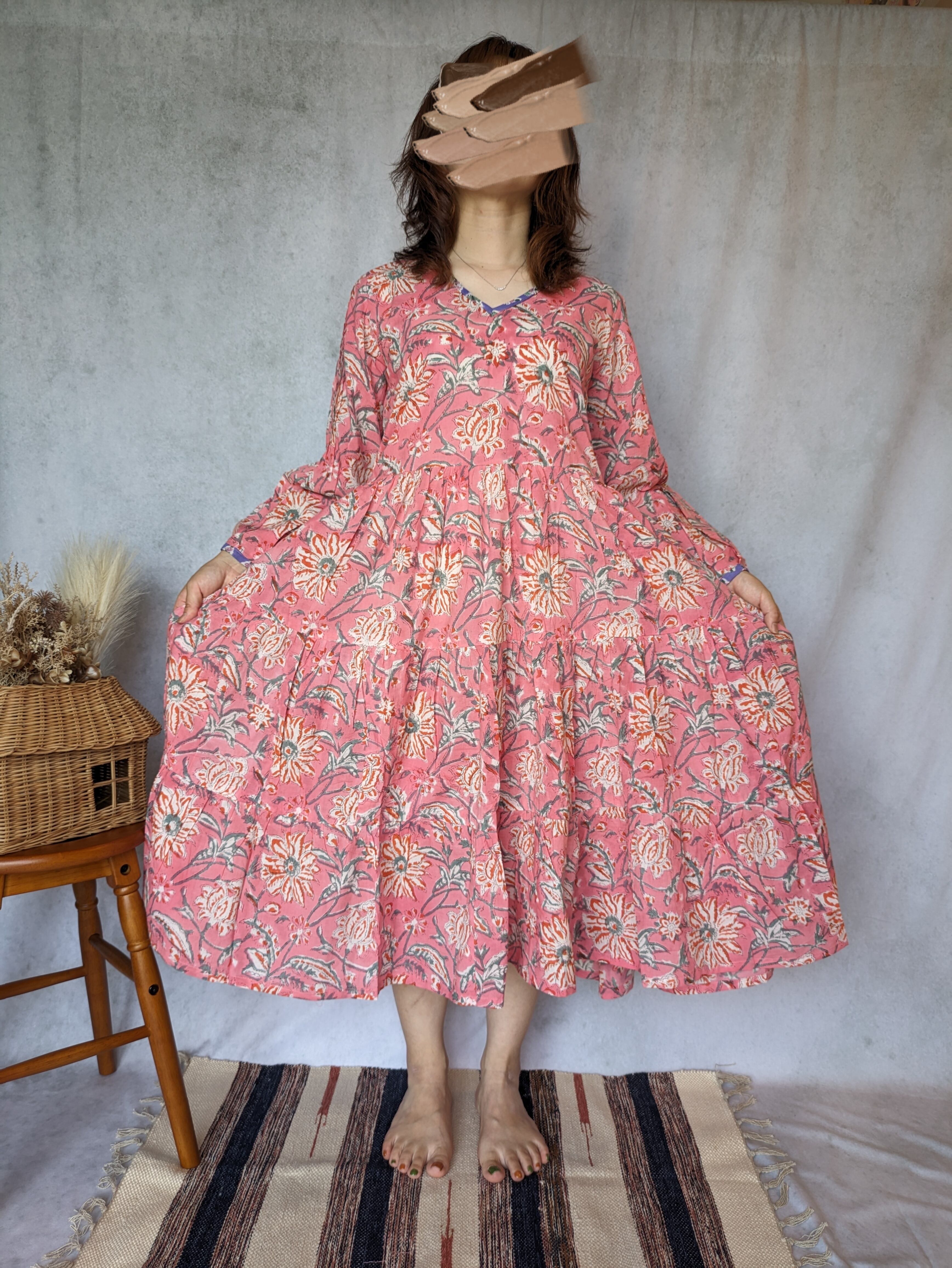 こちらは、インドの伝統工芸であるハンドブロックプリントで作られたワンピースです。