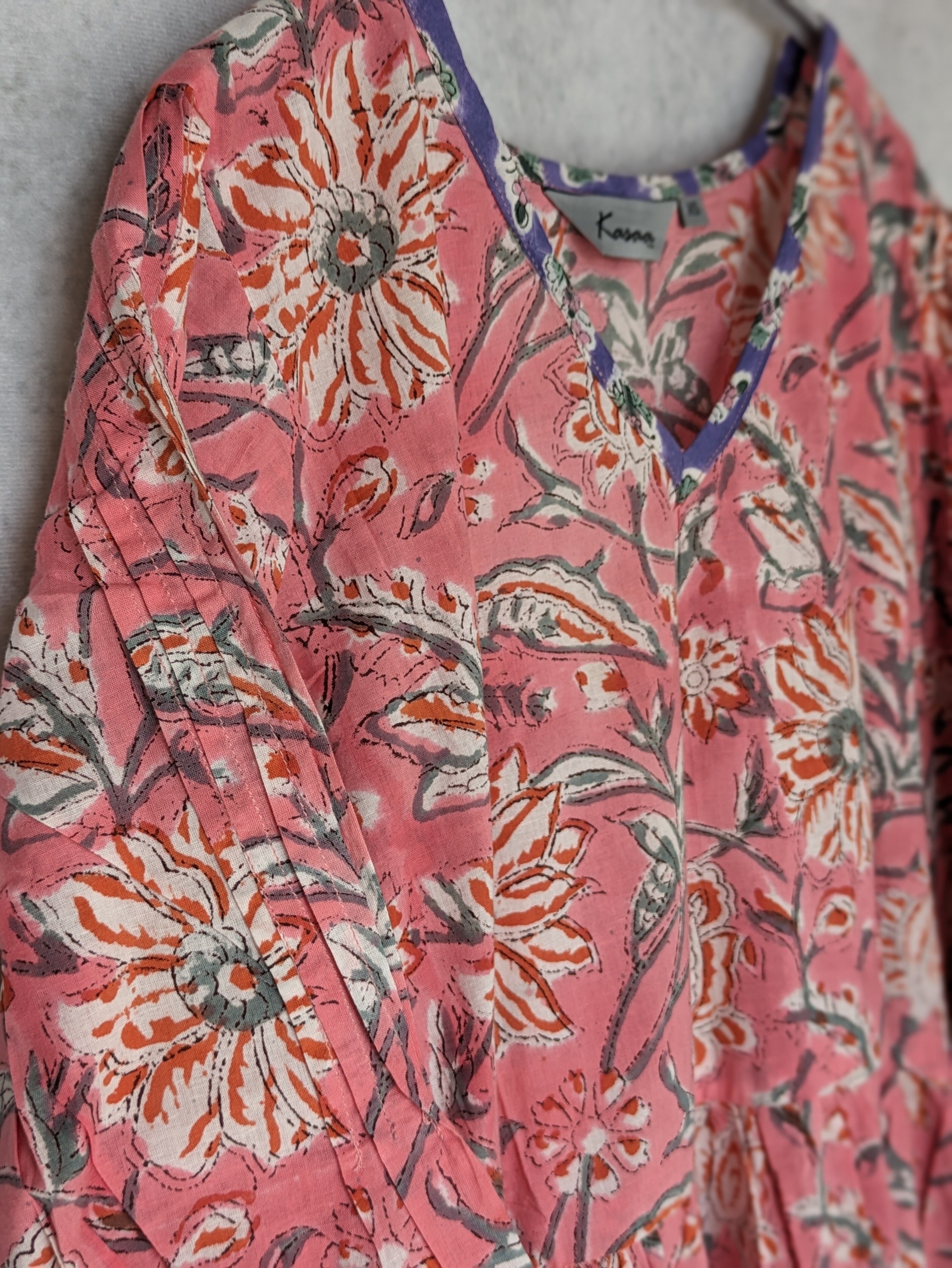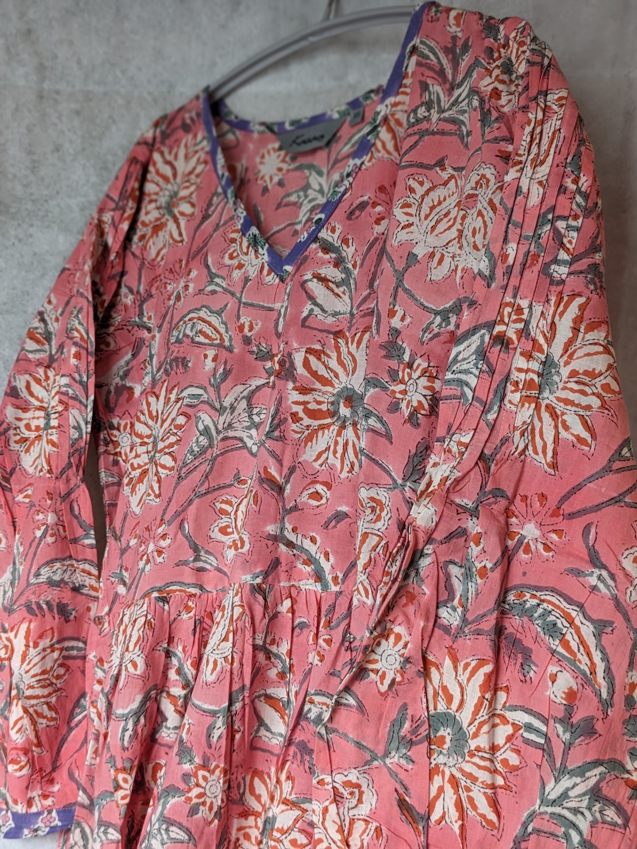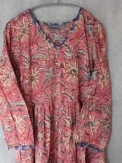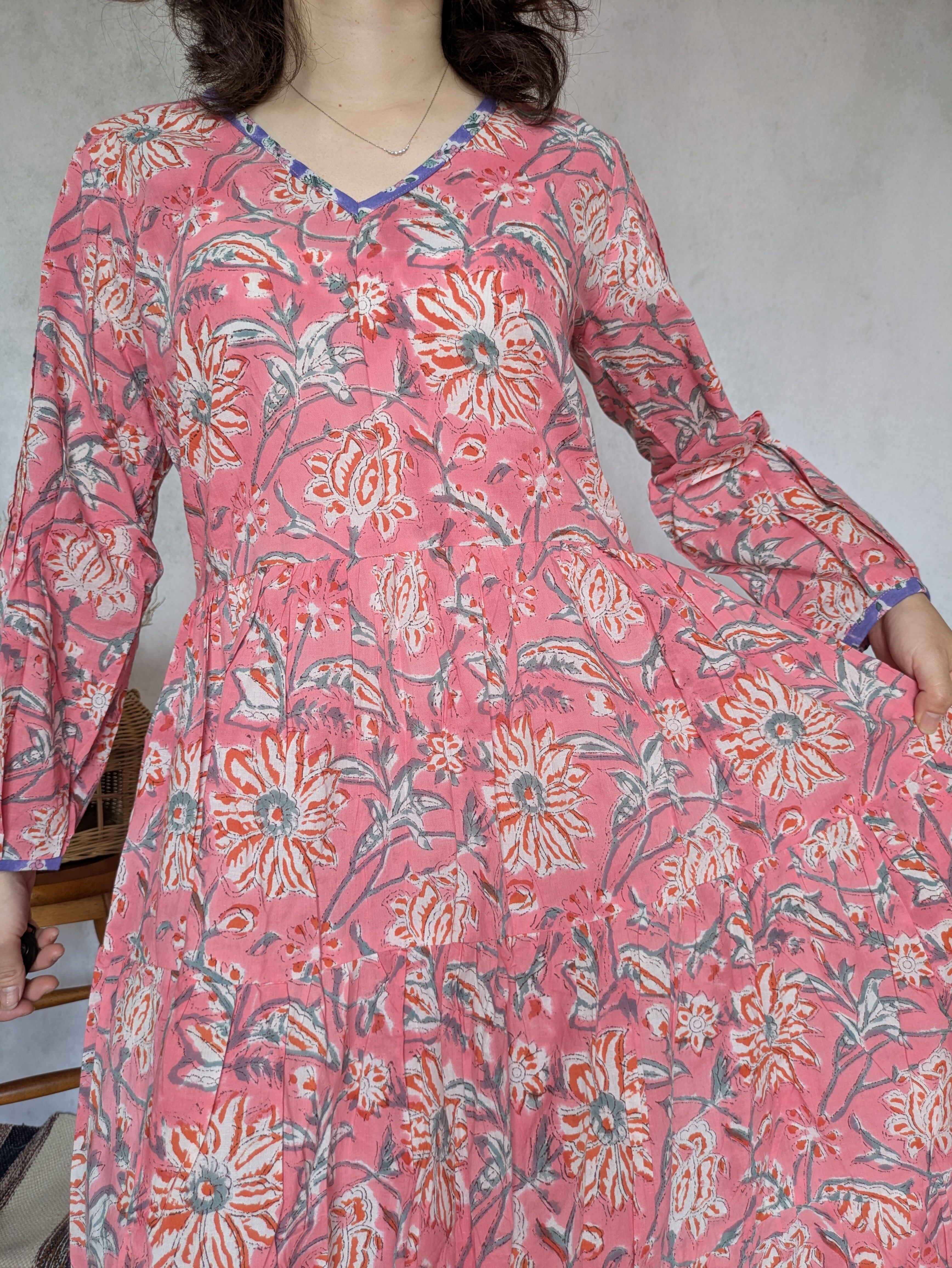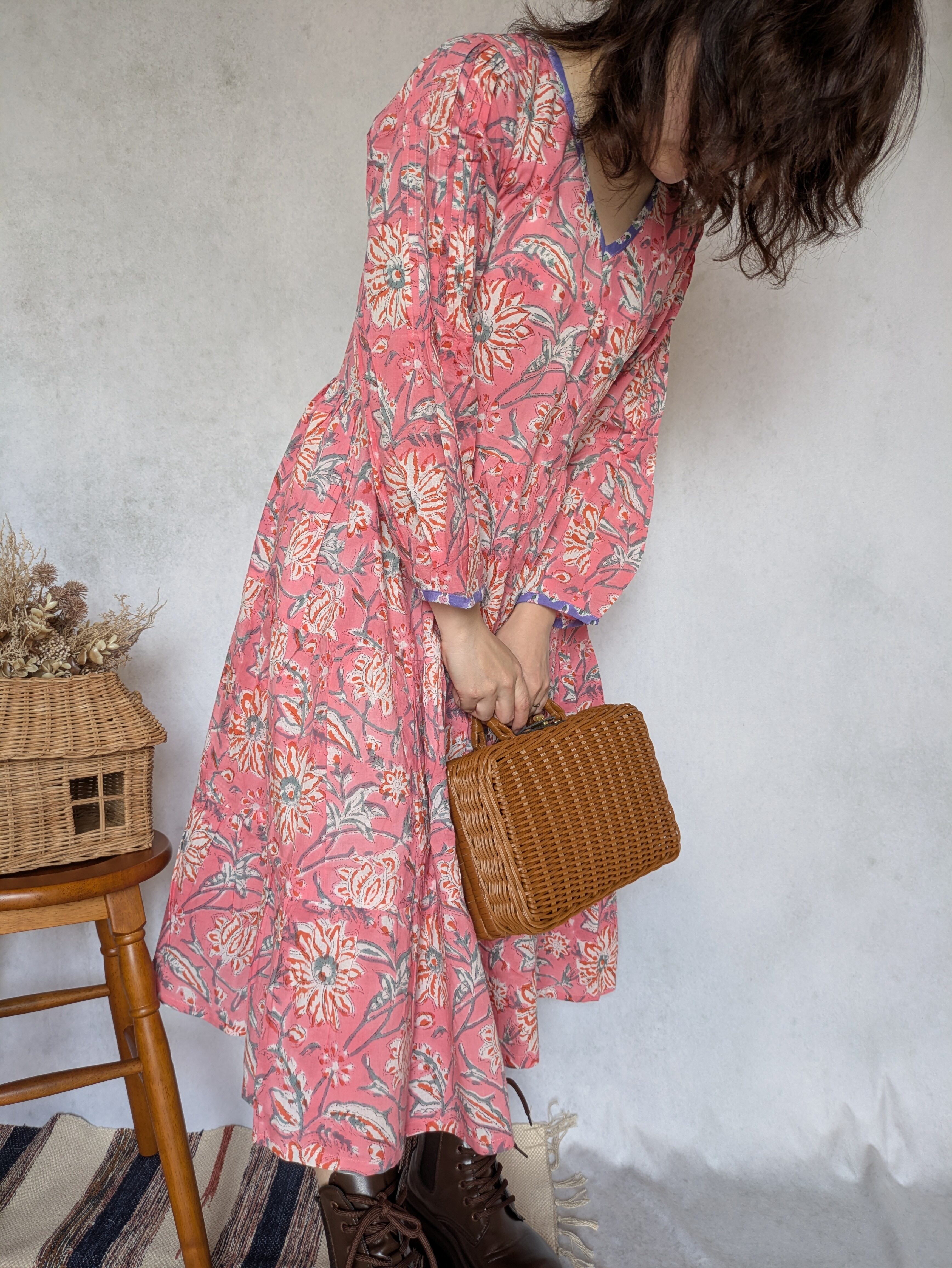 こちらは、インドの伝統工芸であるハンドブロックプリントで作られたワンピースです。