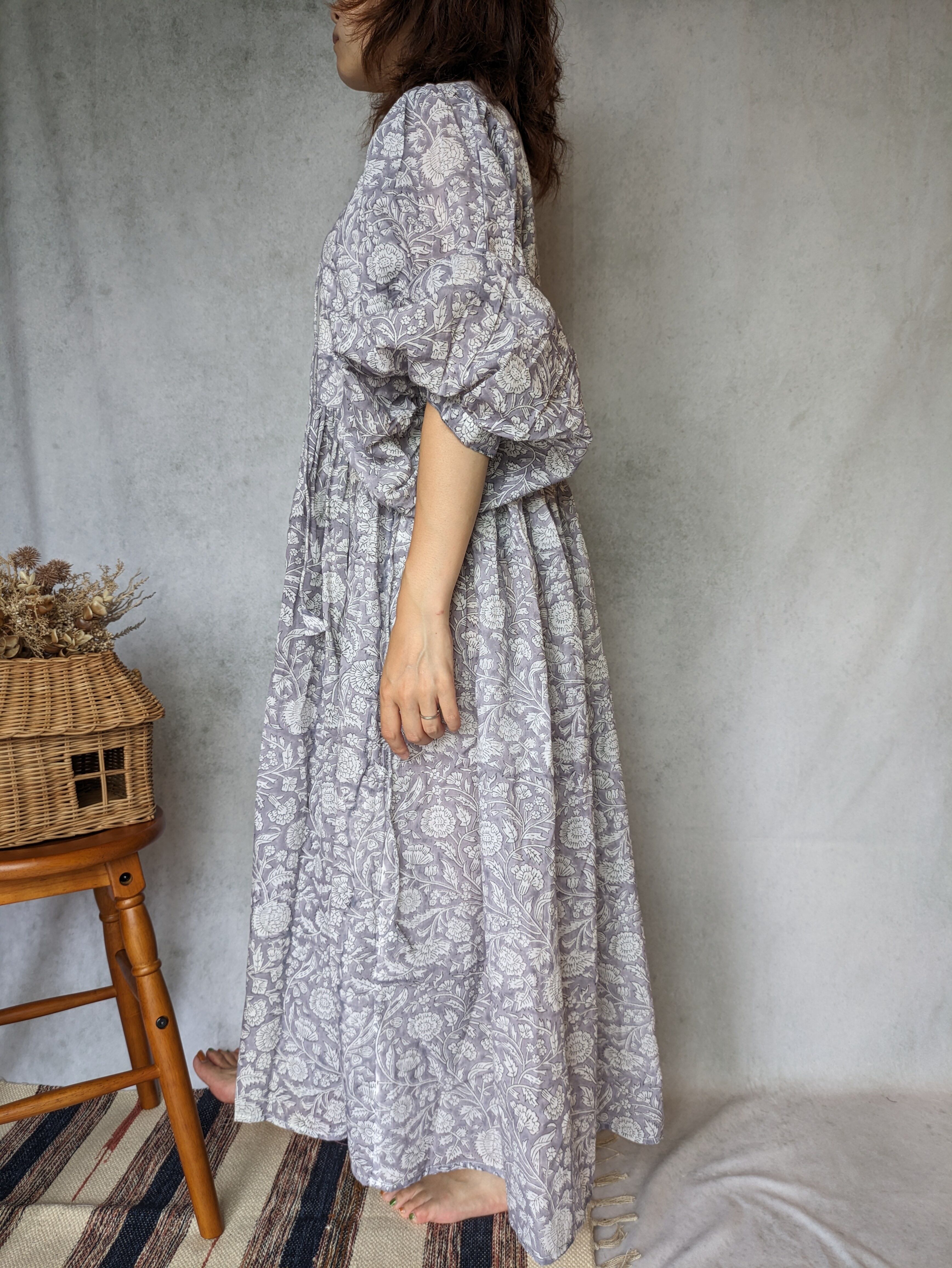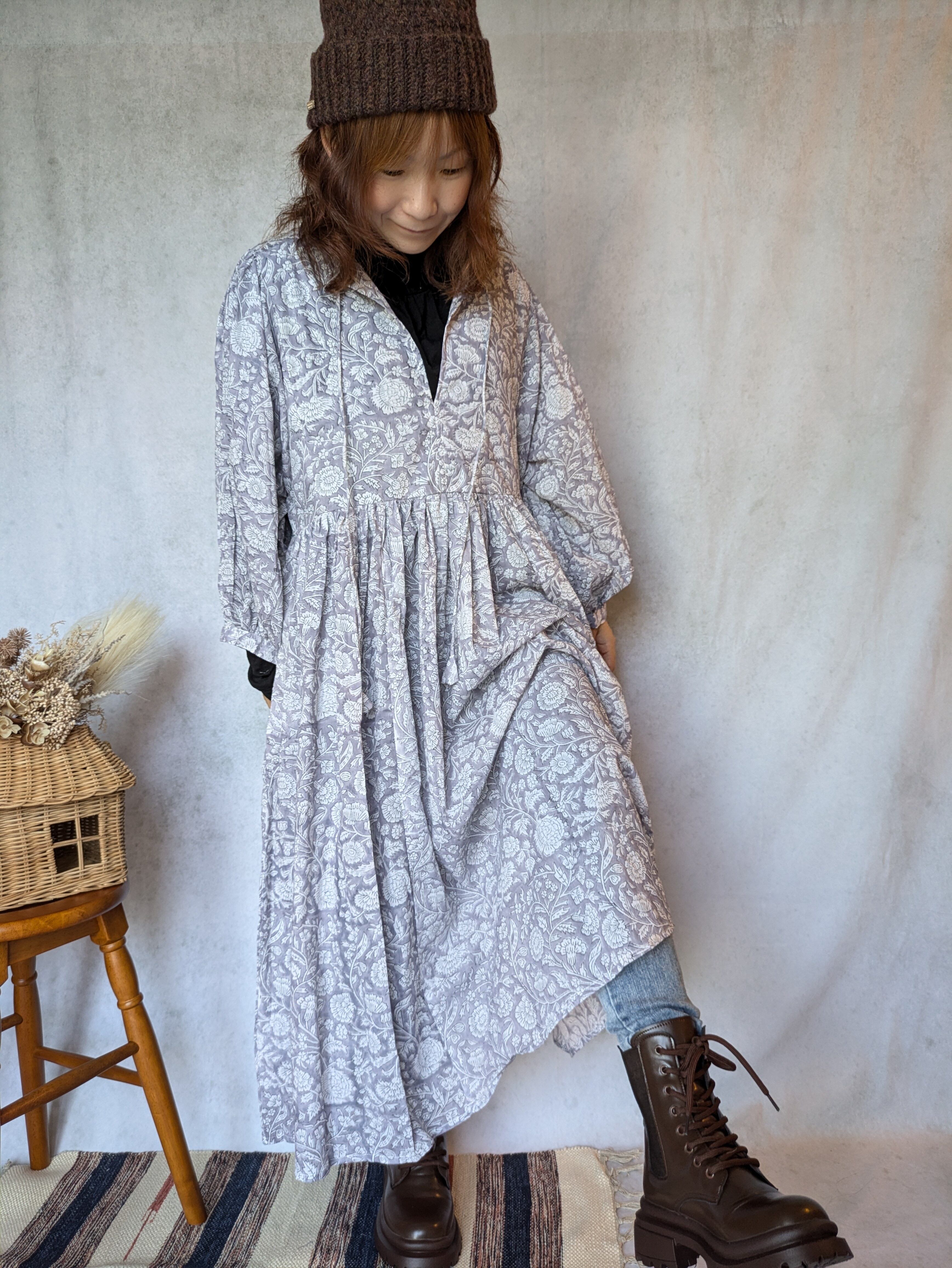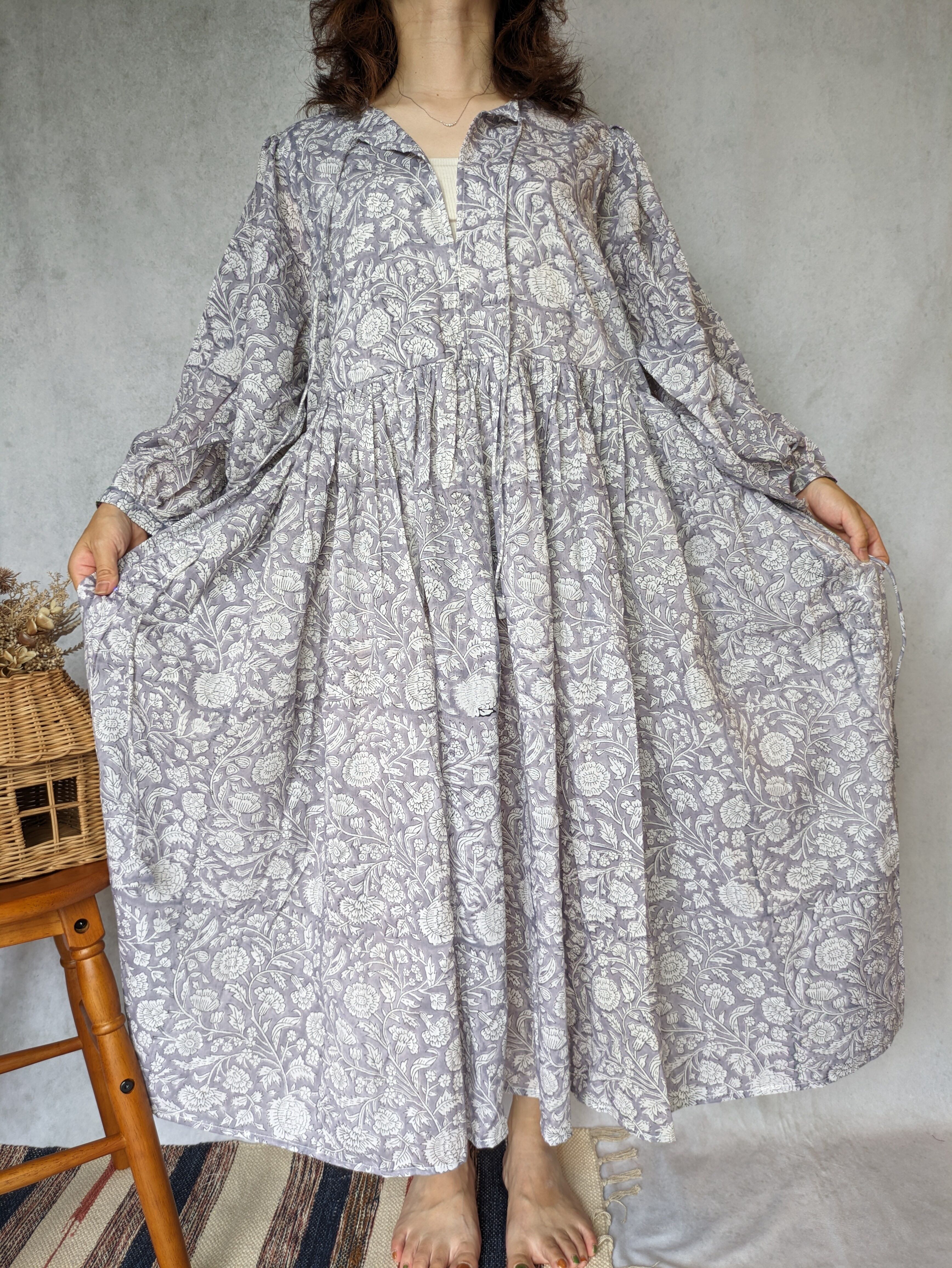 こちらは、インドの伝統工芸であるハンドブロックプリントで作られたワンピースです。