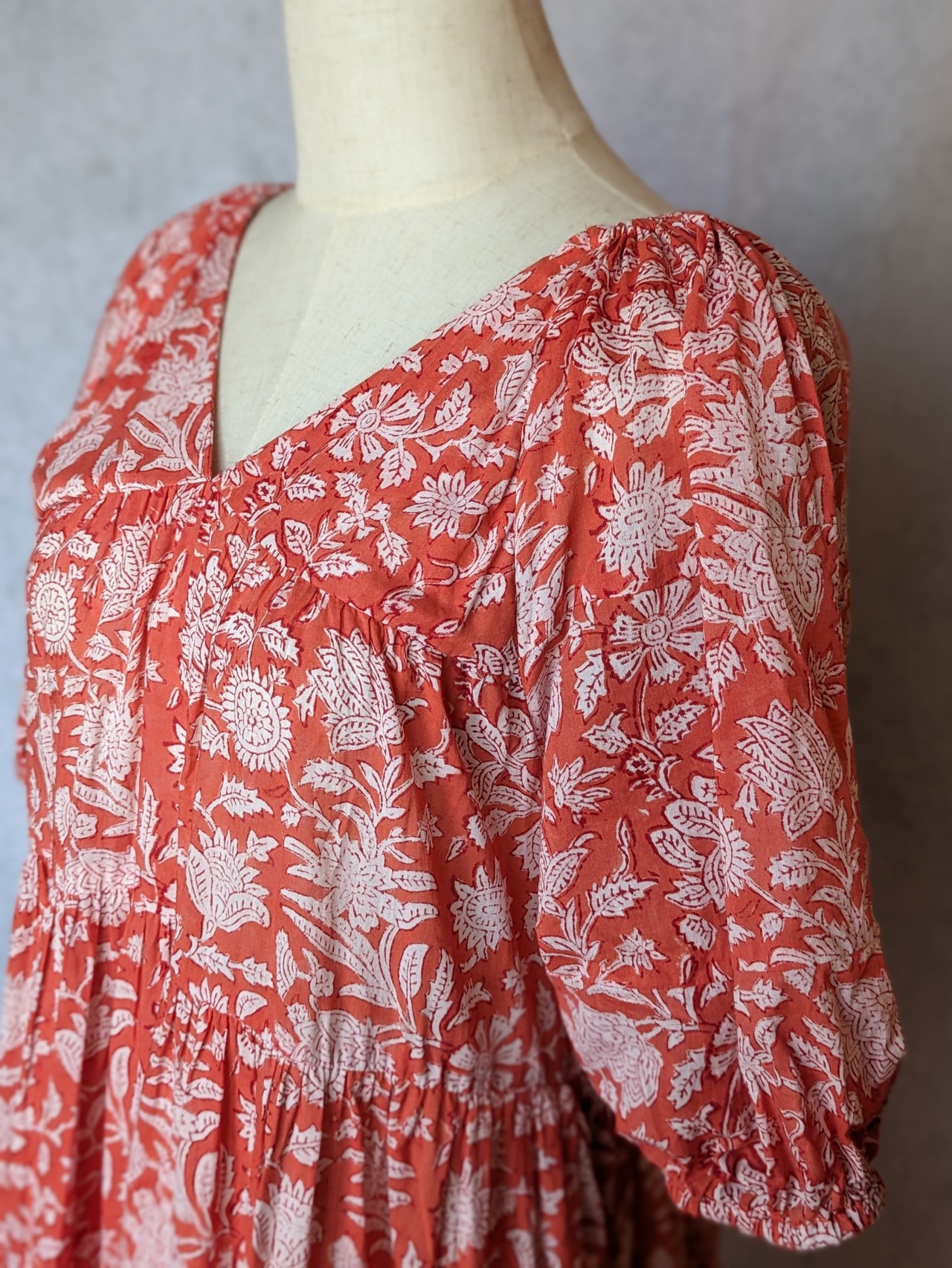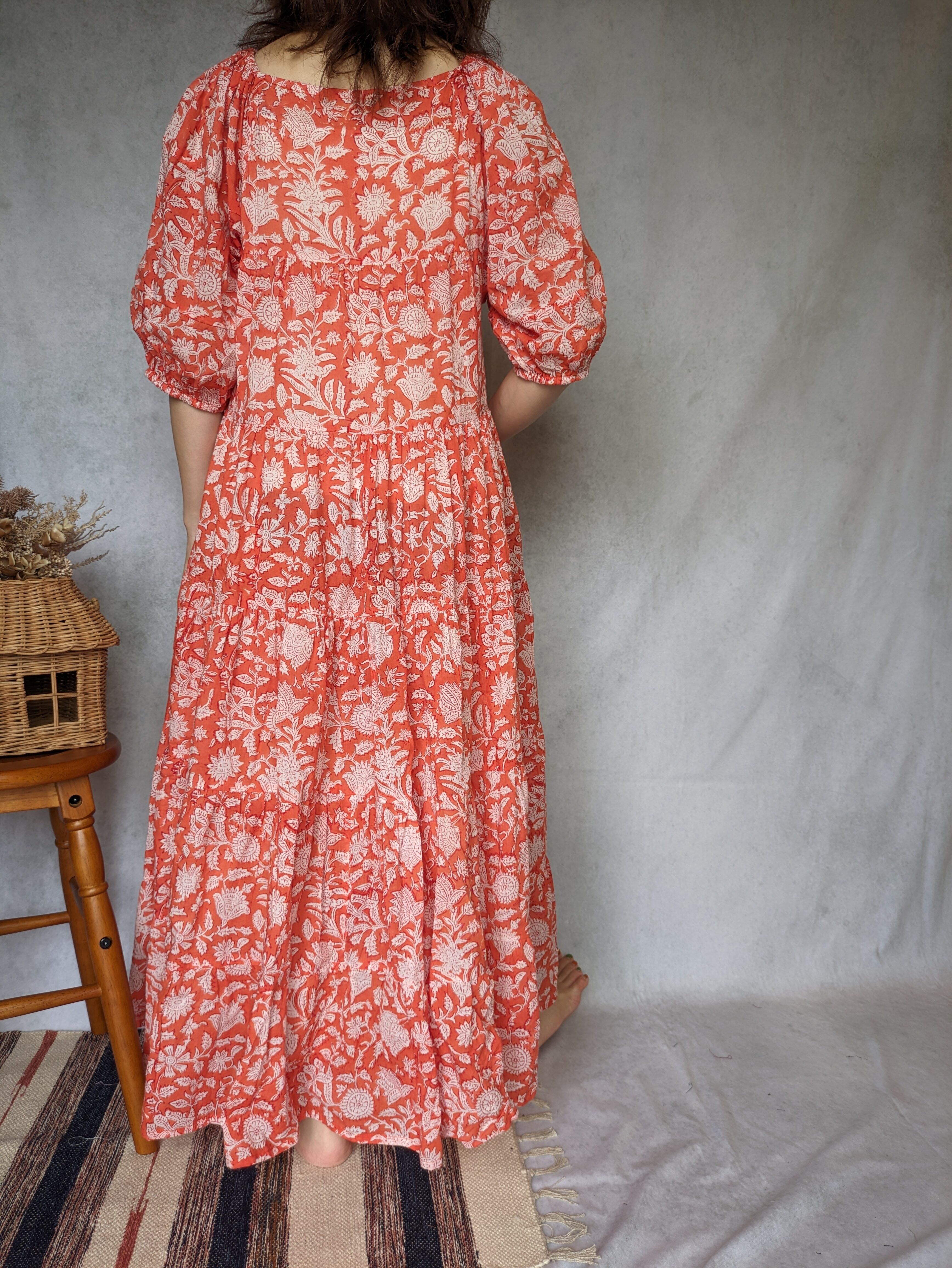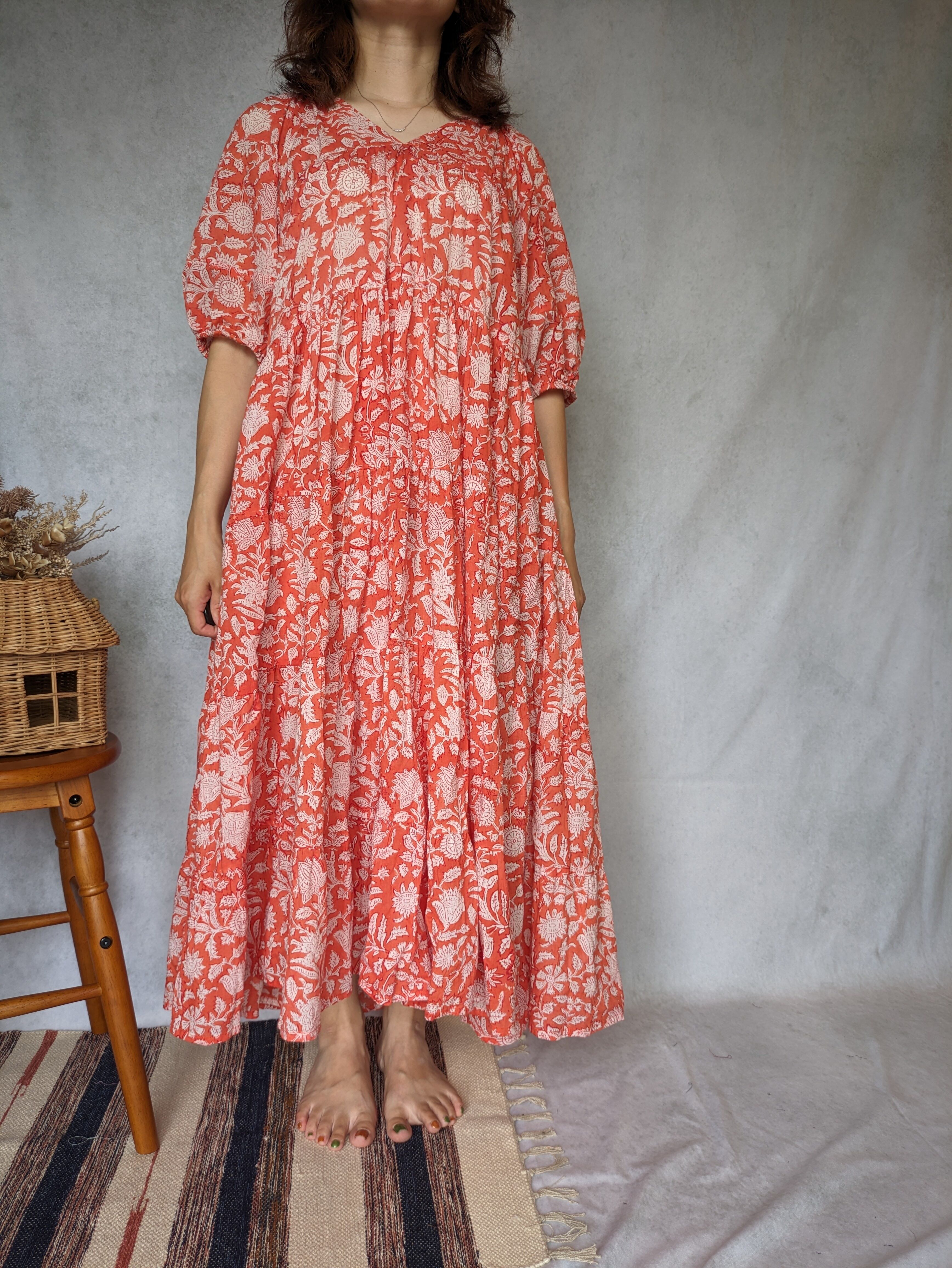 こちらは、インドの伝統工芸であるハンドブロックプリントで作られたワンピースです。