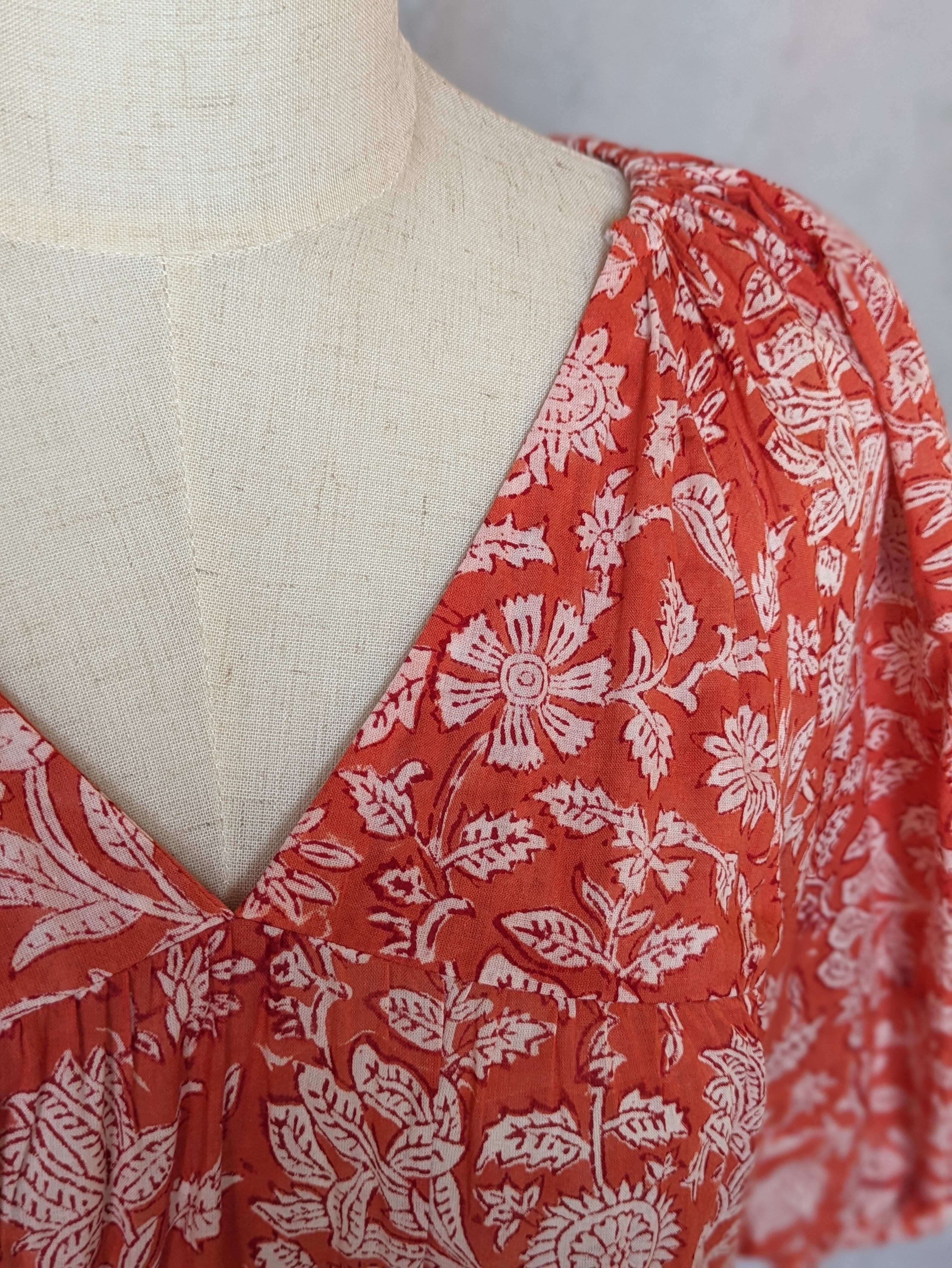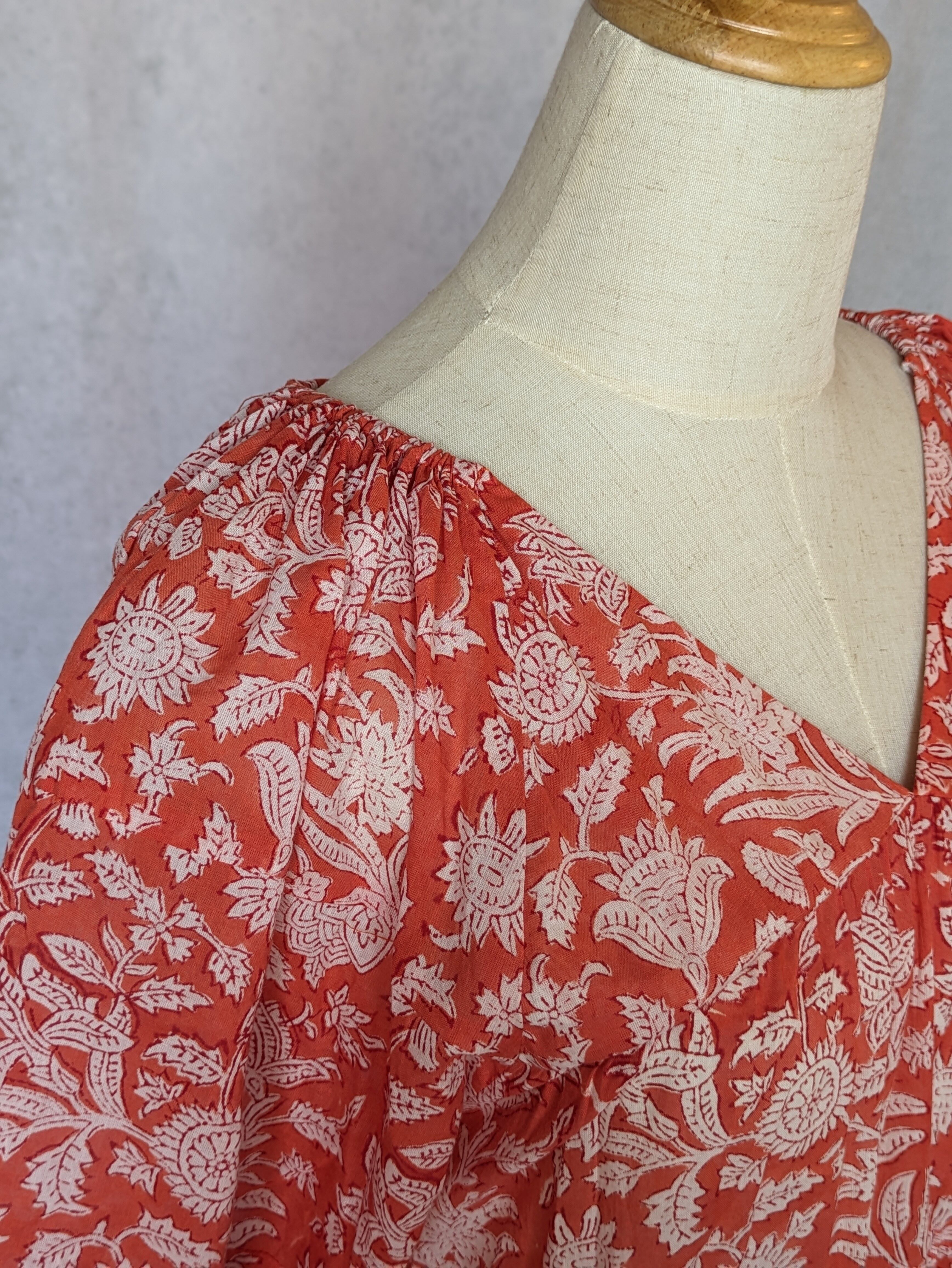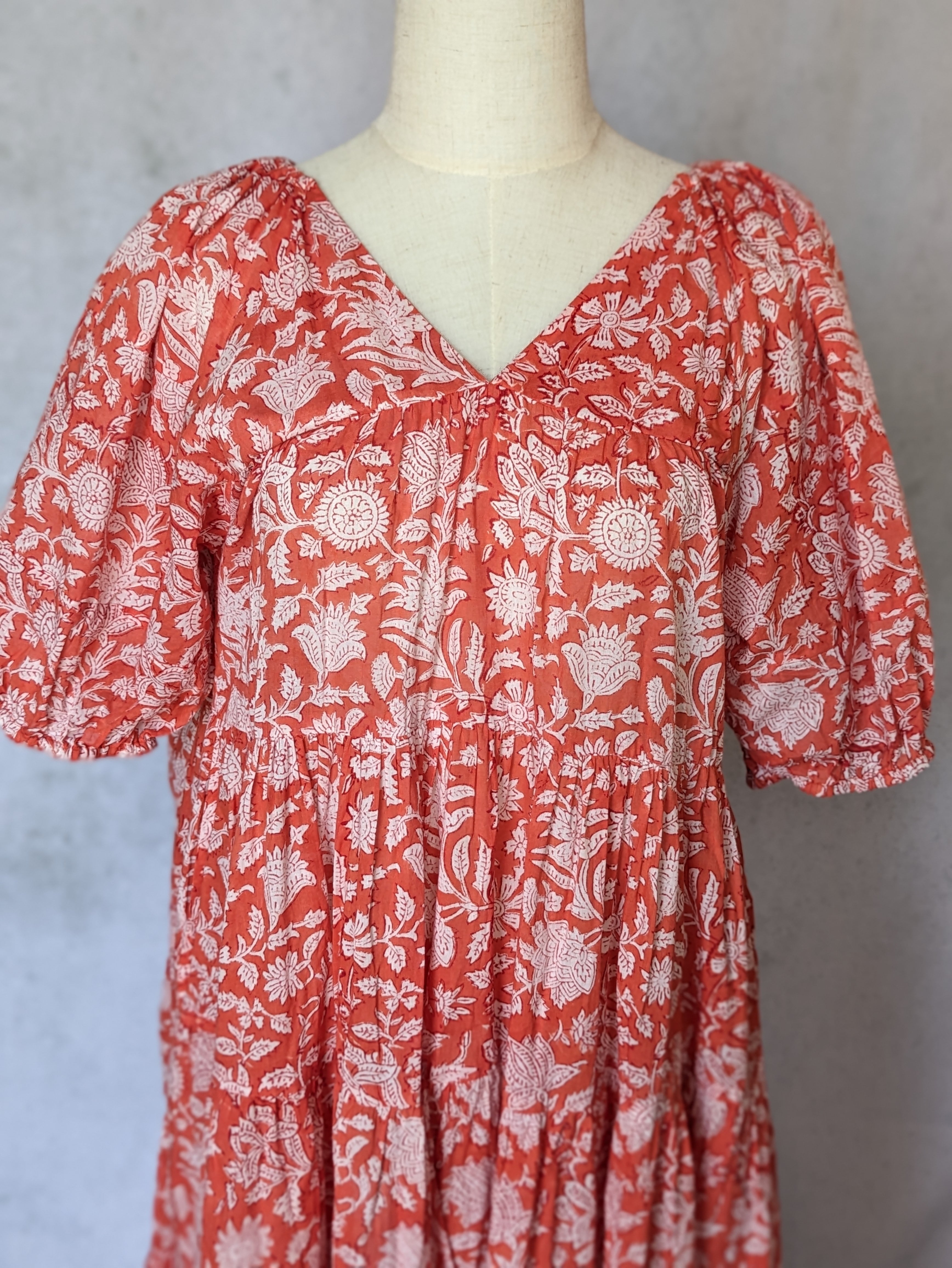 こちらは、インドの伝統工芸であるハンドブロックプリントで作られたワンピースです。