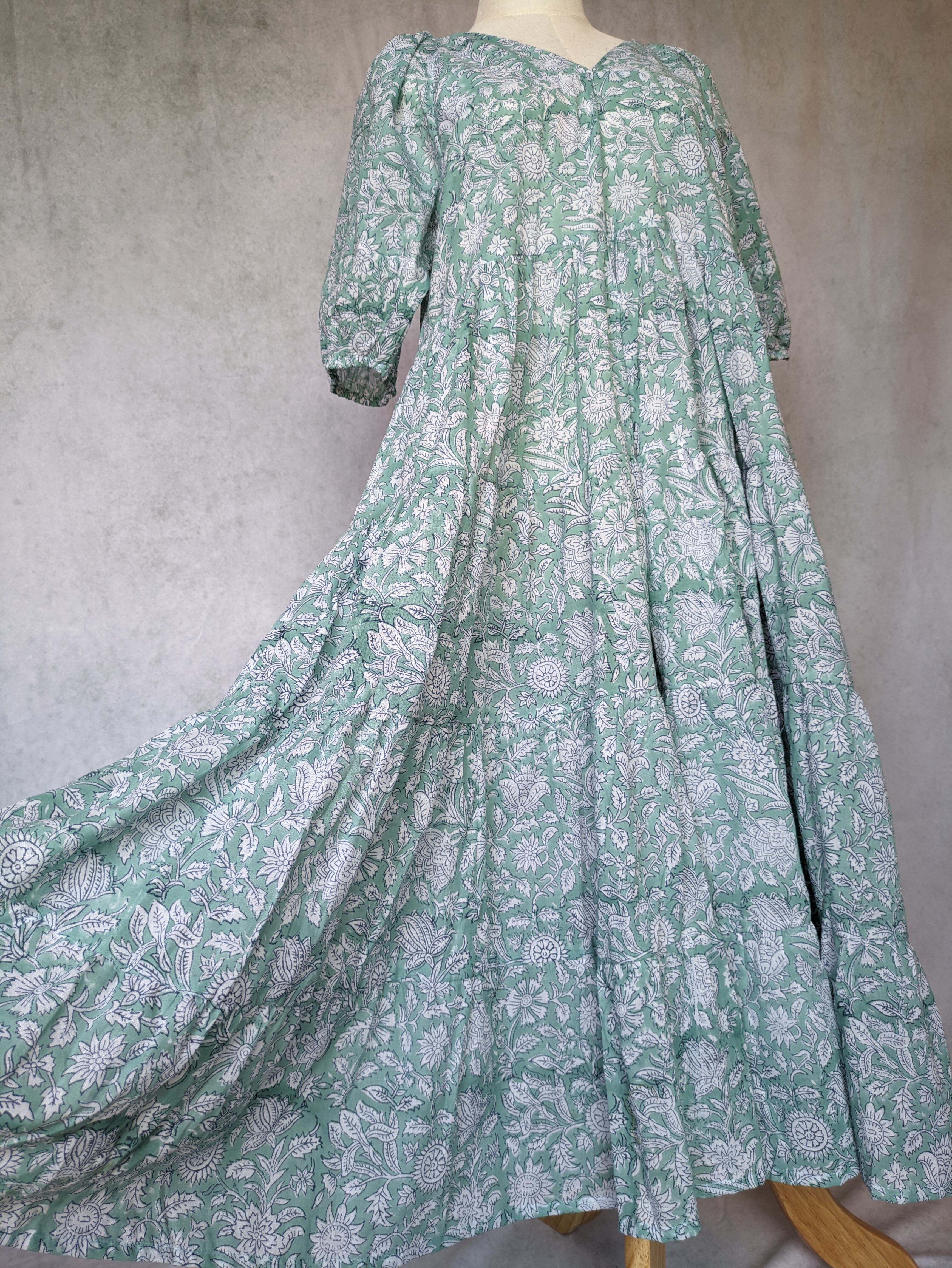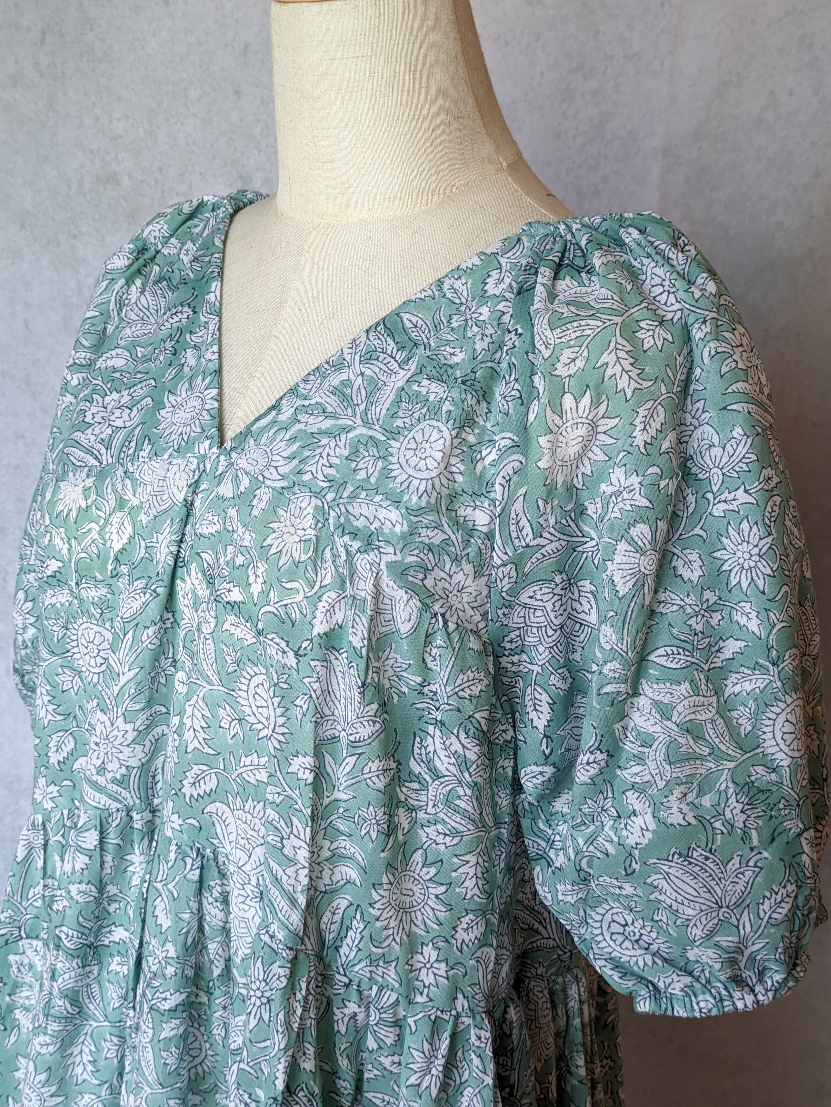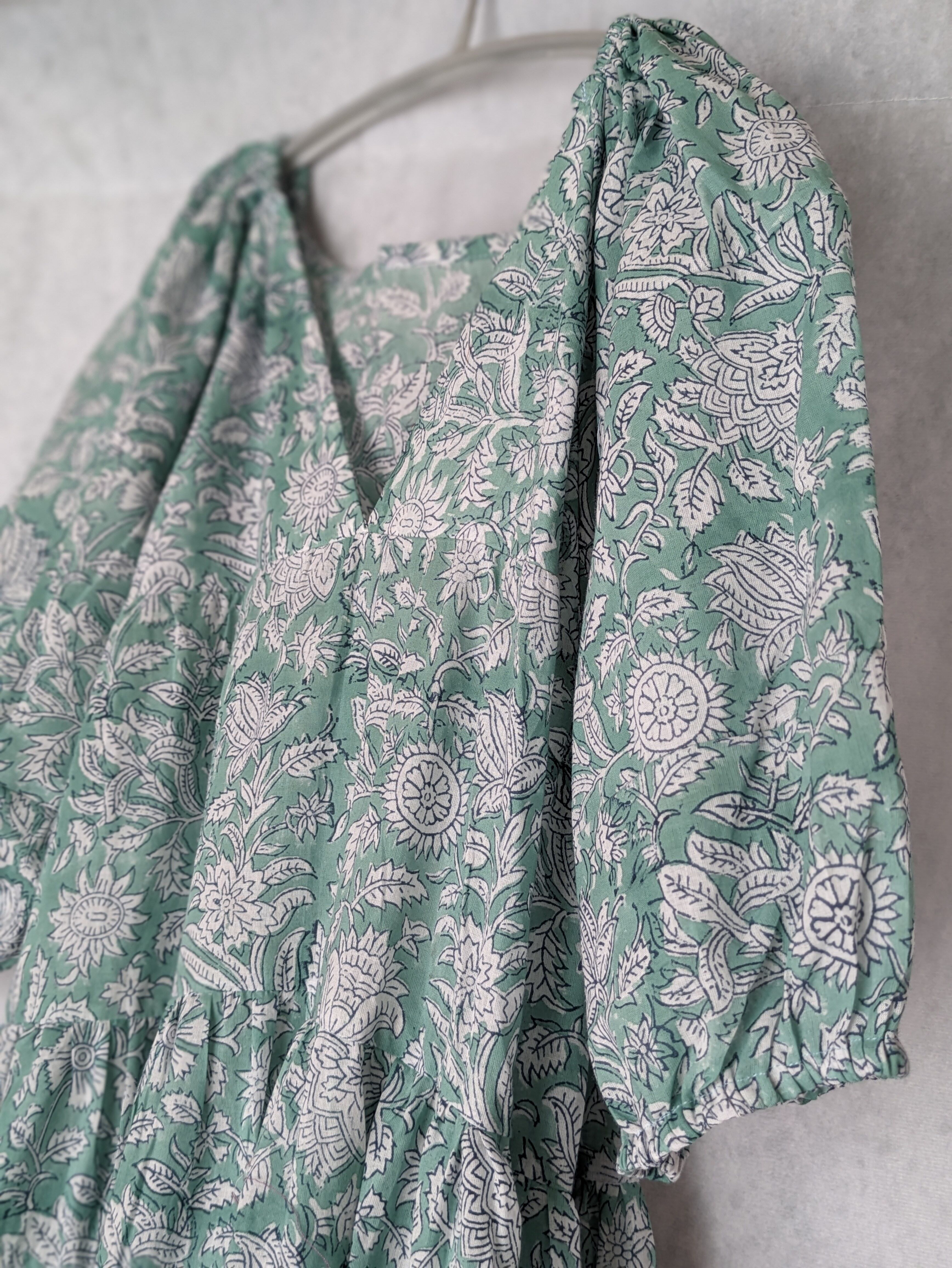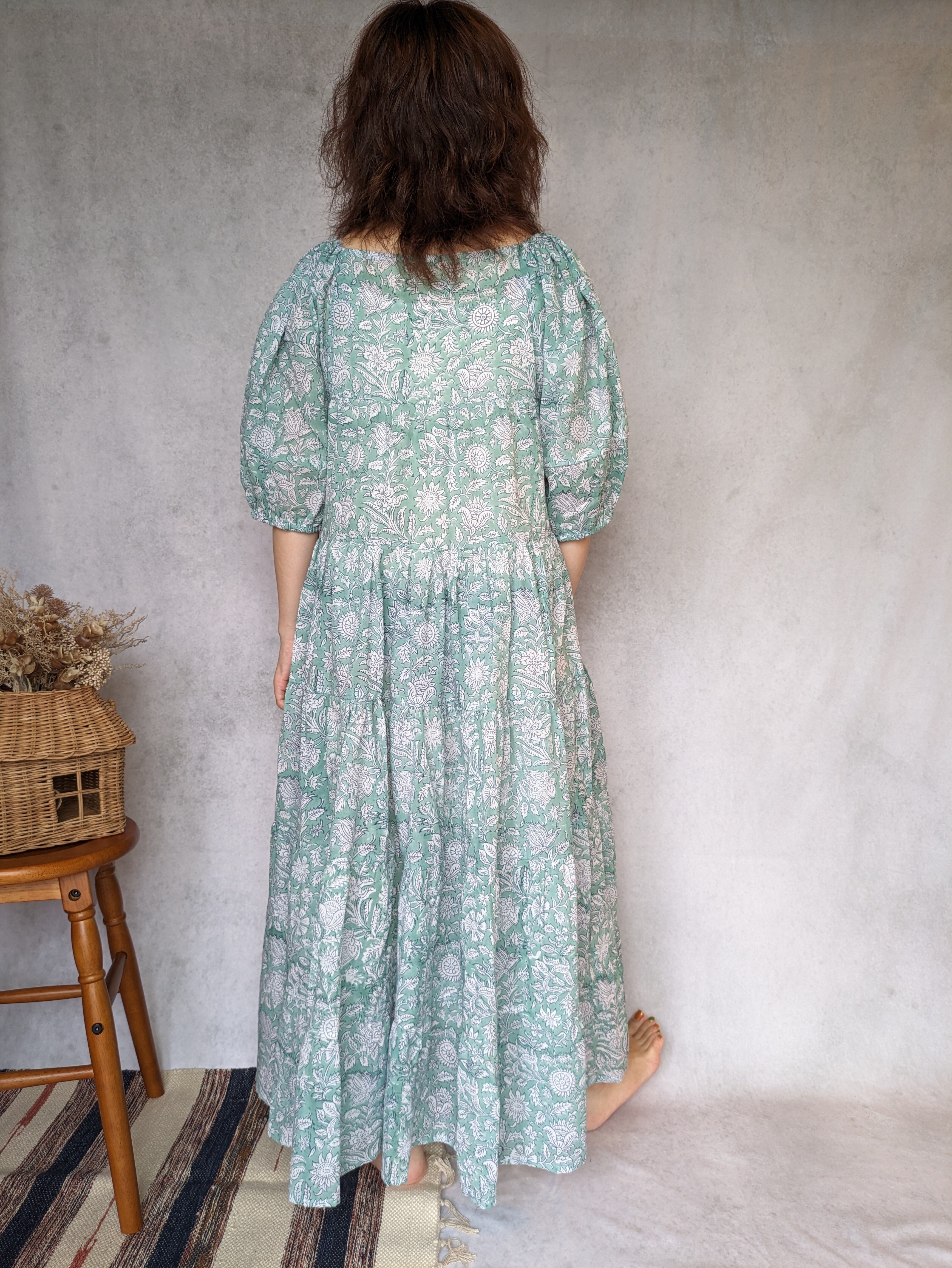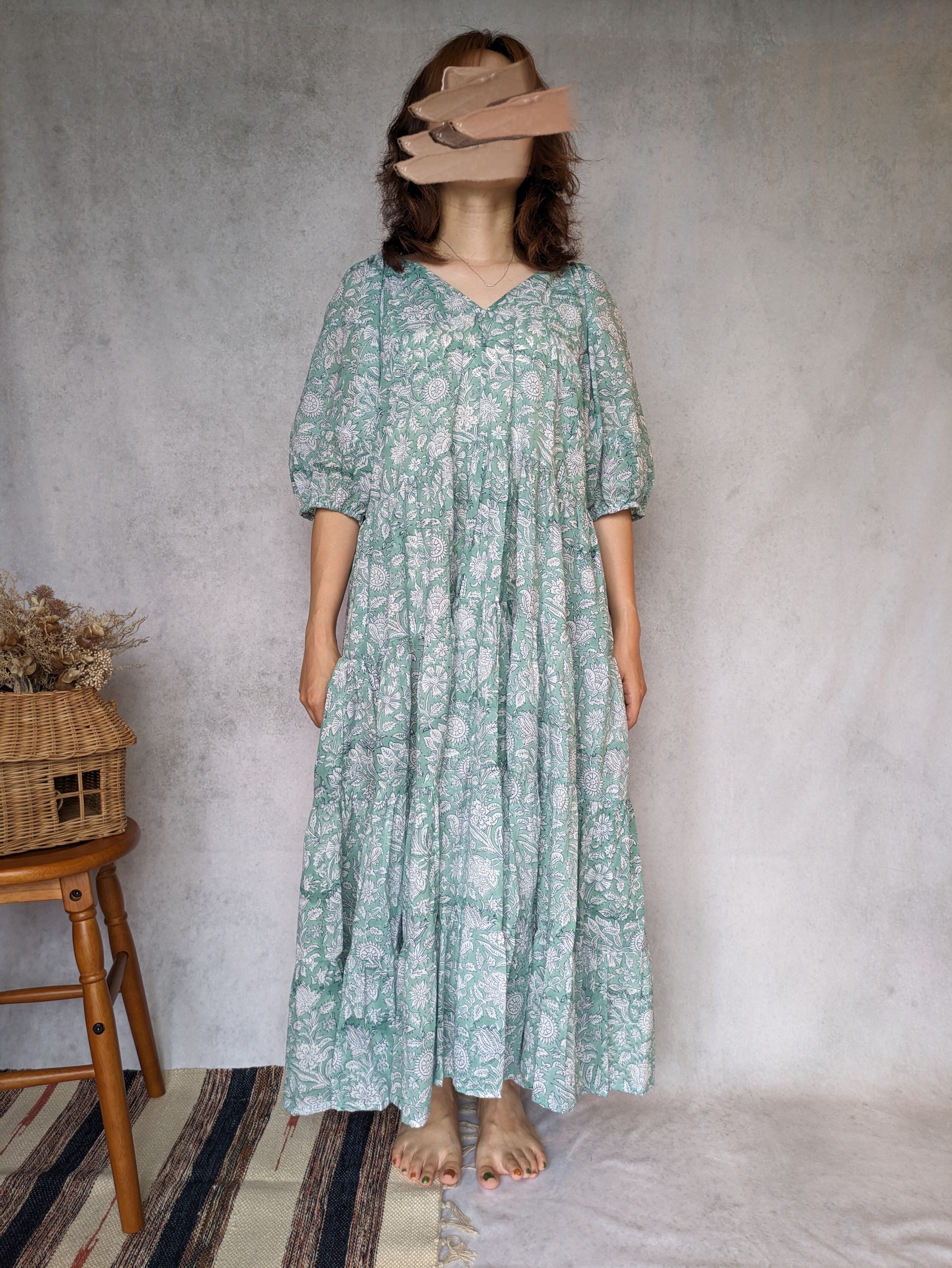 こちらは、インドの伝統工芸であるハンドブロックプリントで作られたワンピースです。