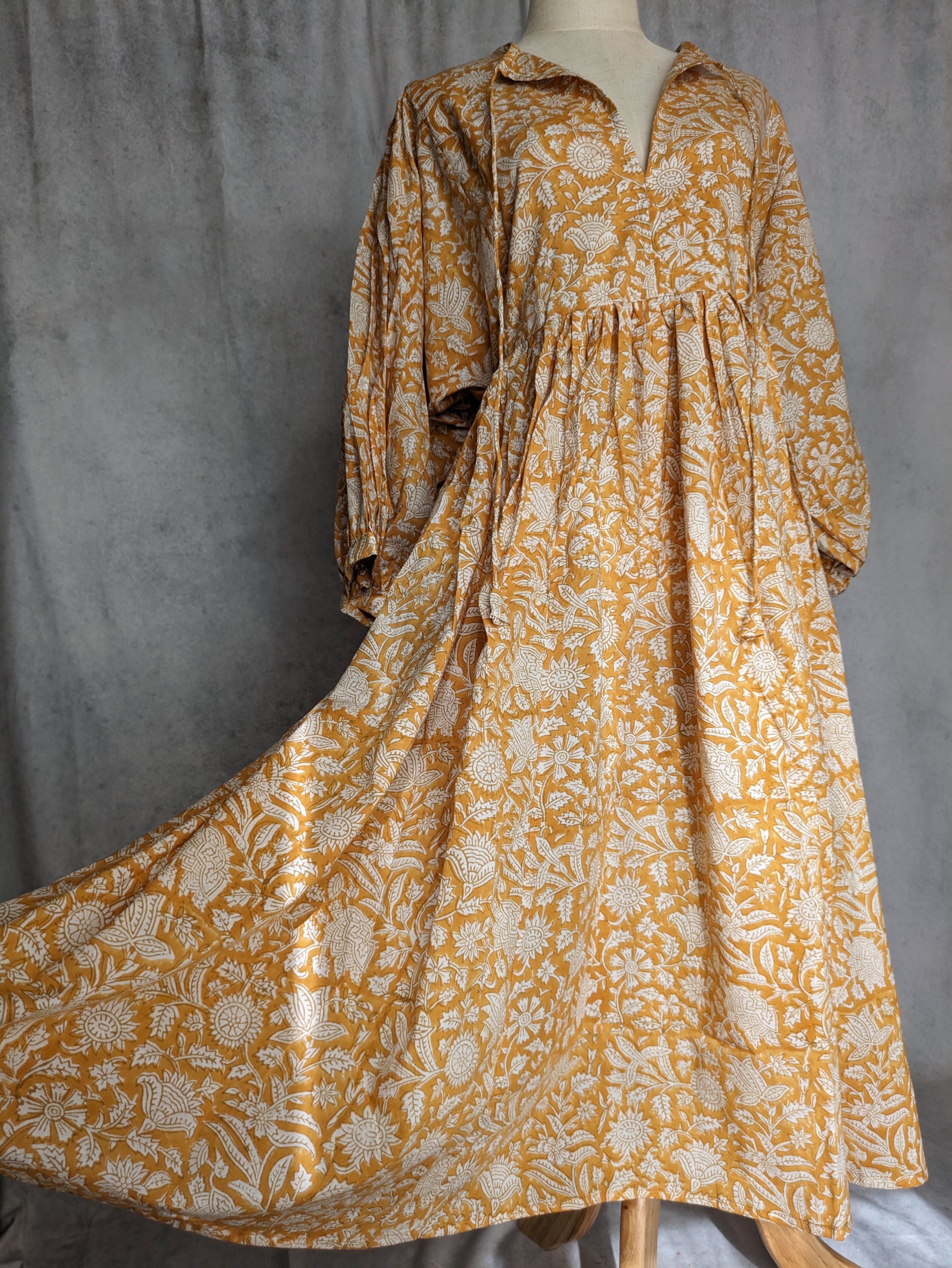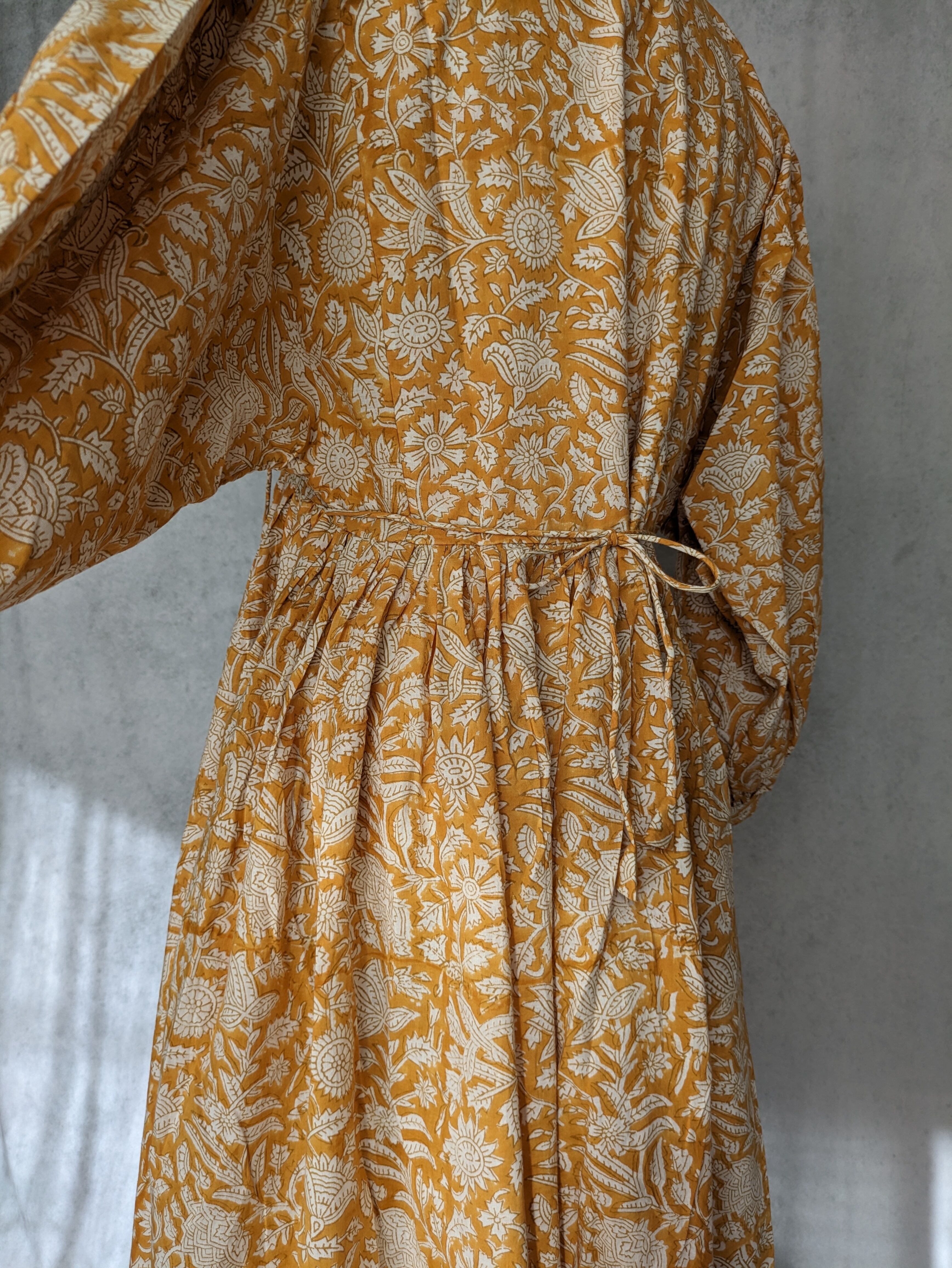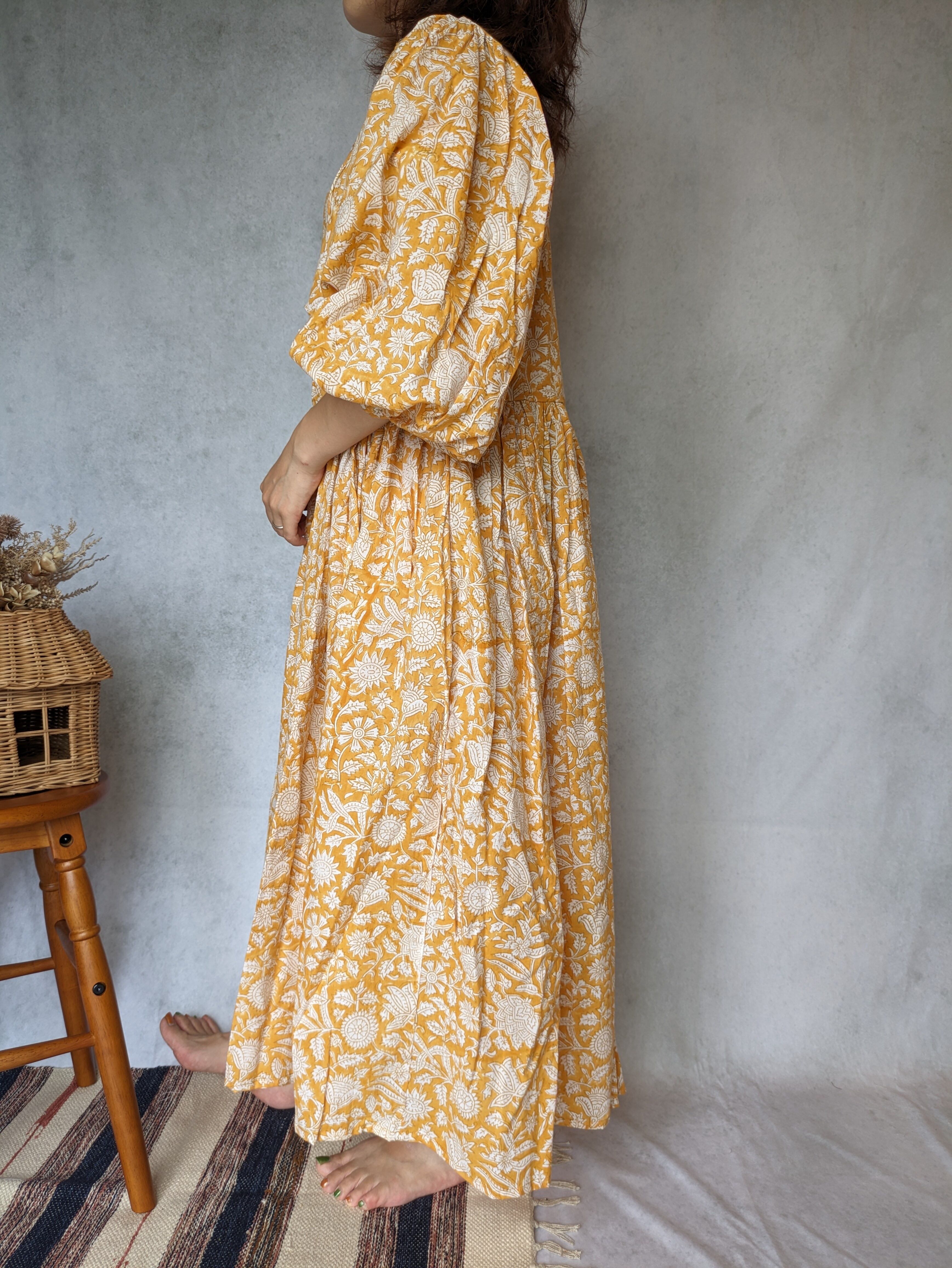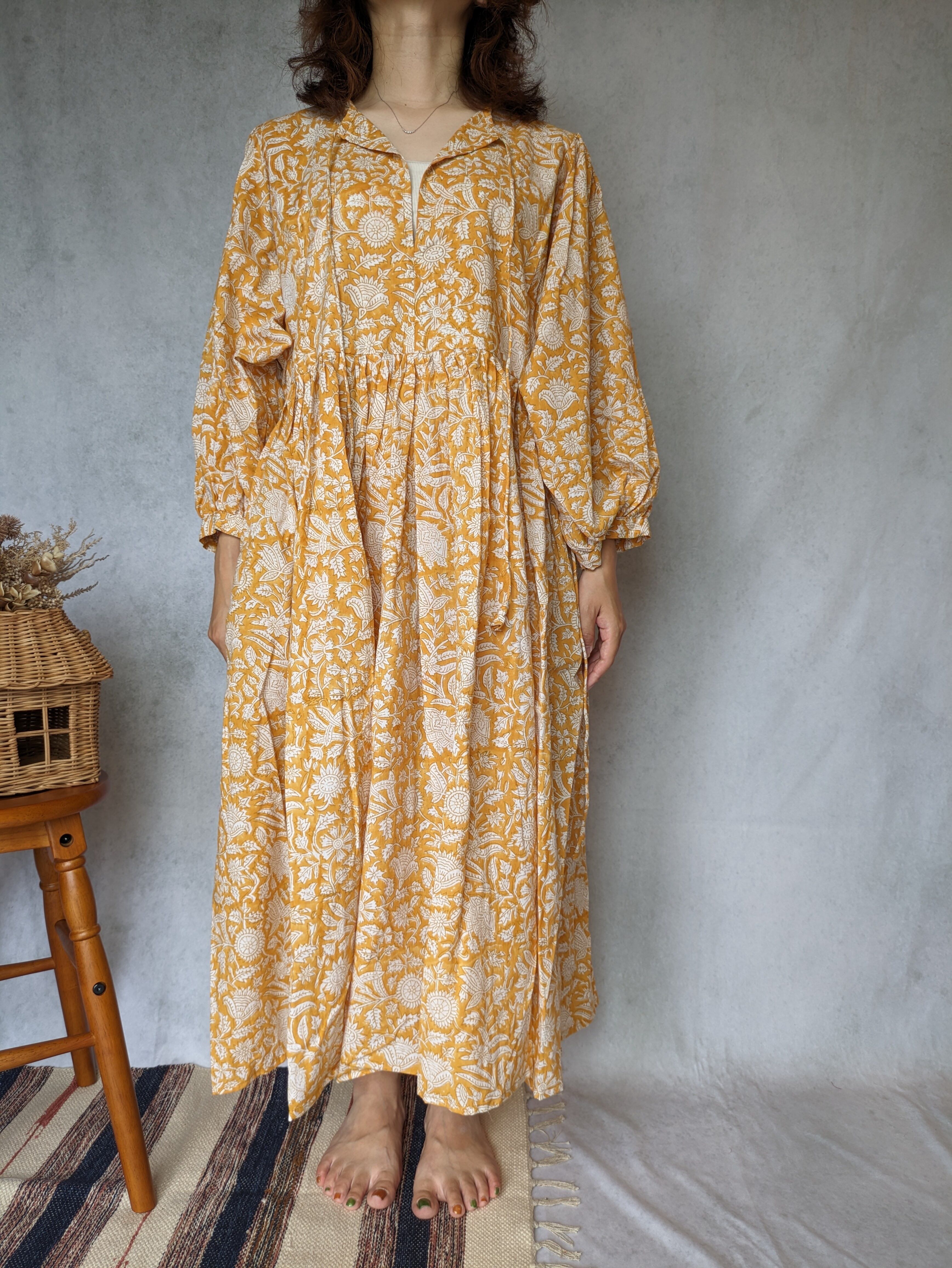 こちらは、インドの伝統工芸であるハンドブロックプリントで作られたワンピースです。