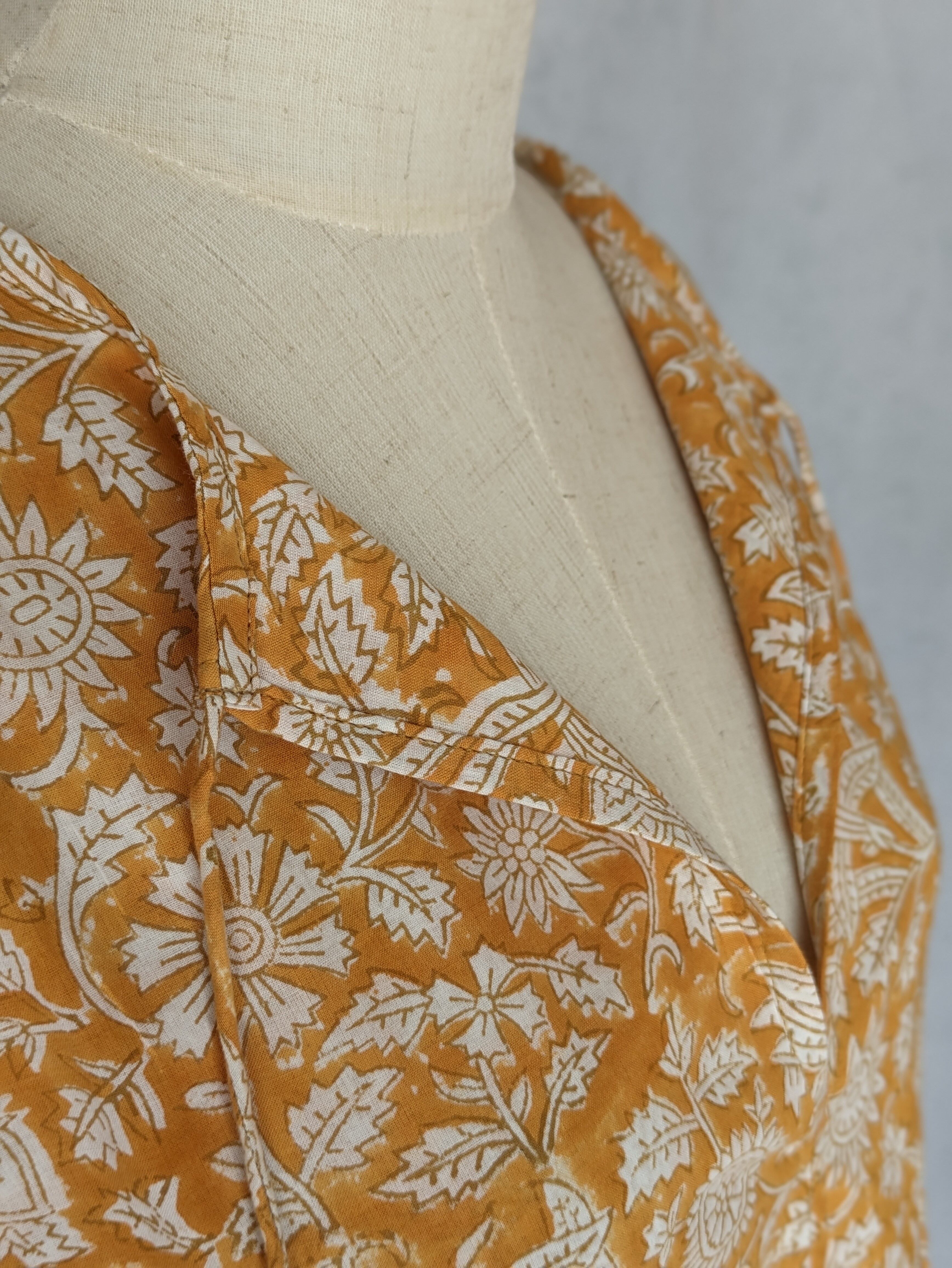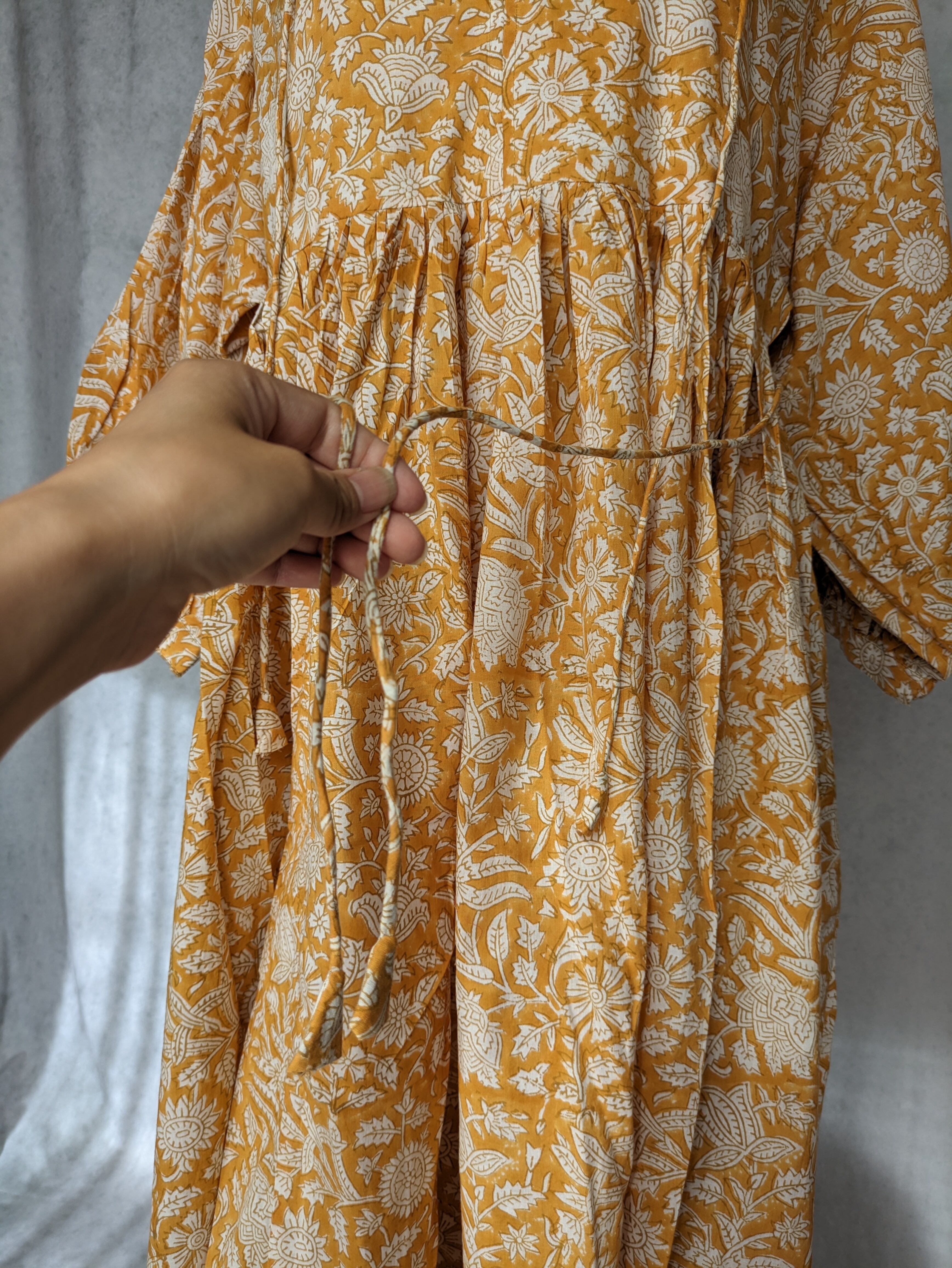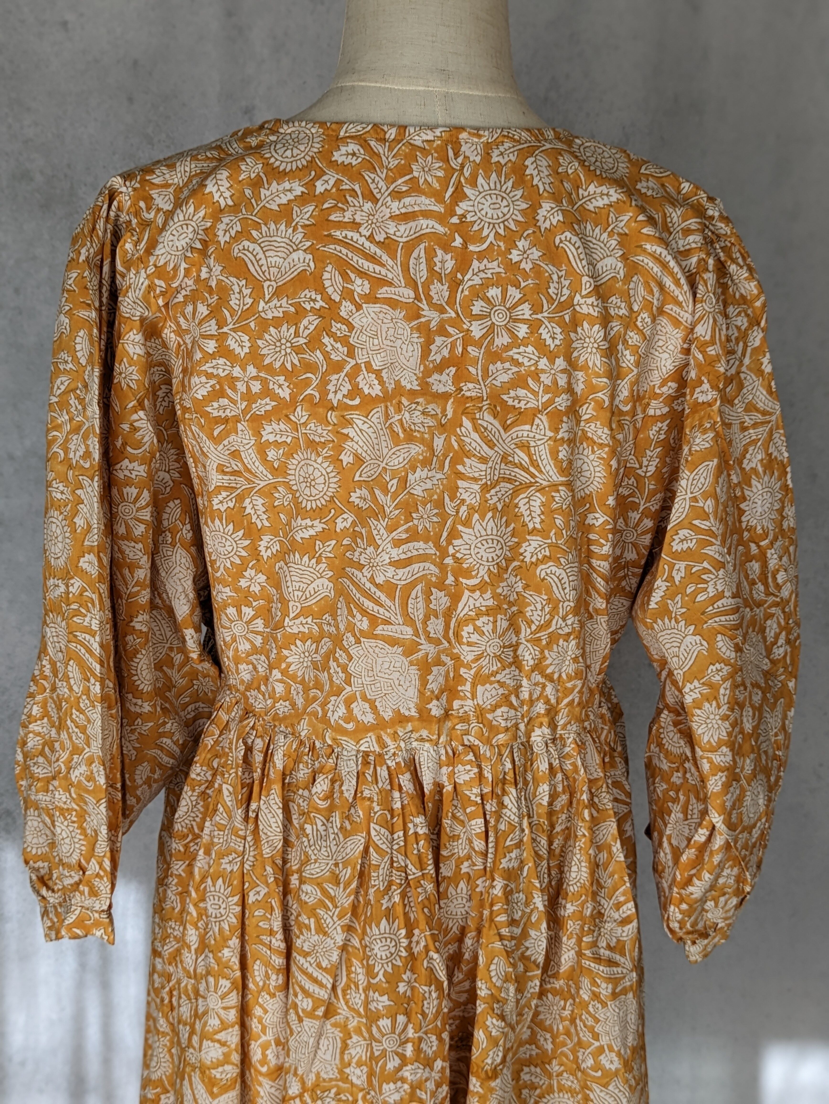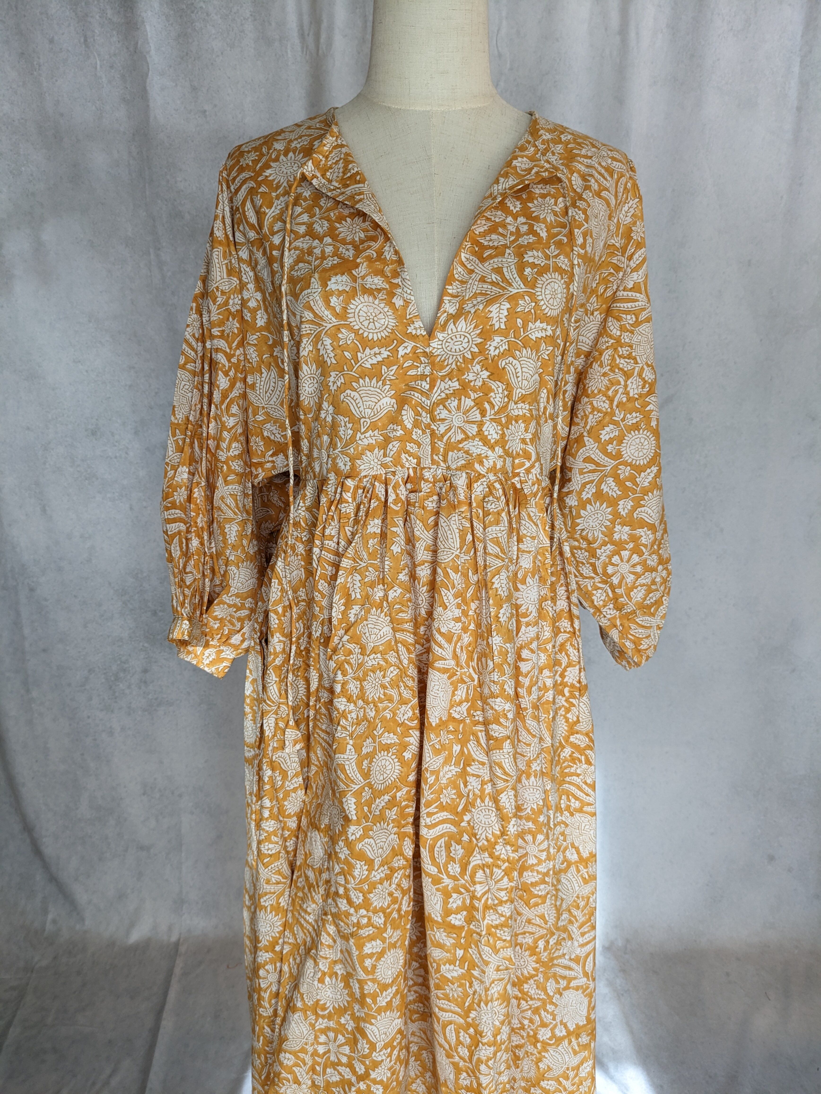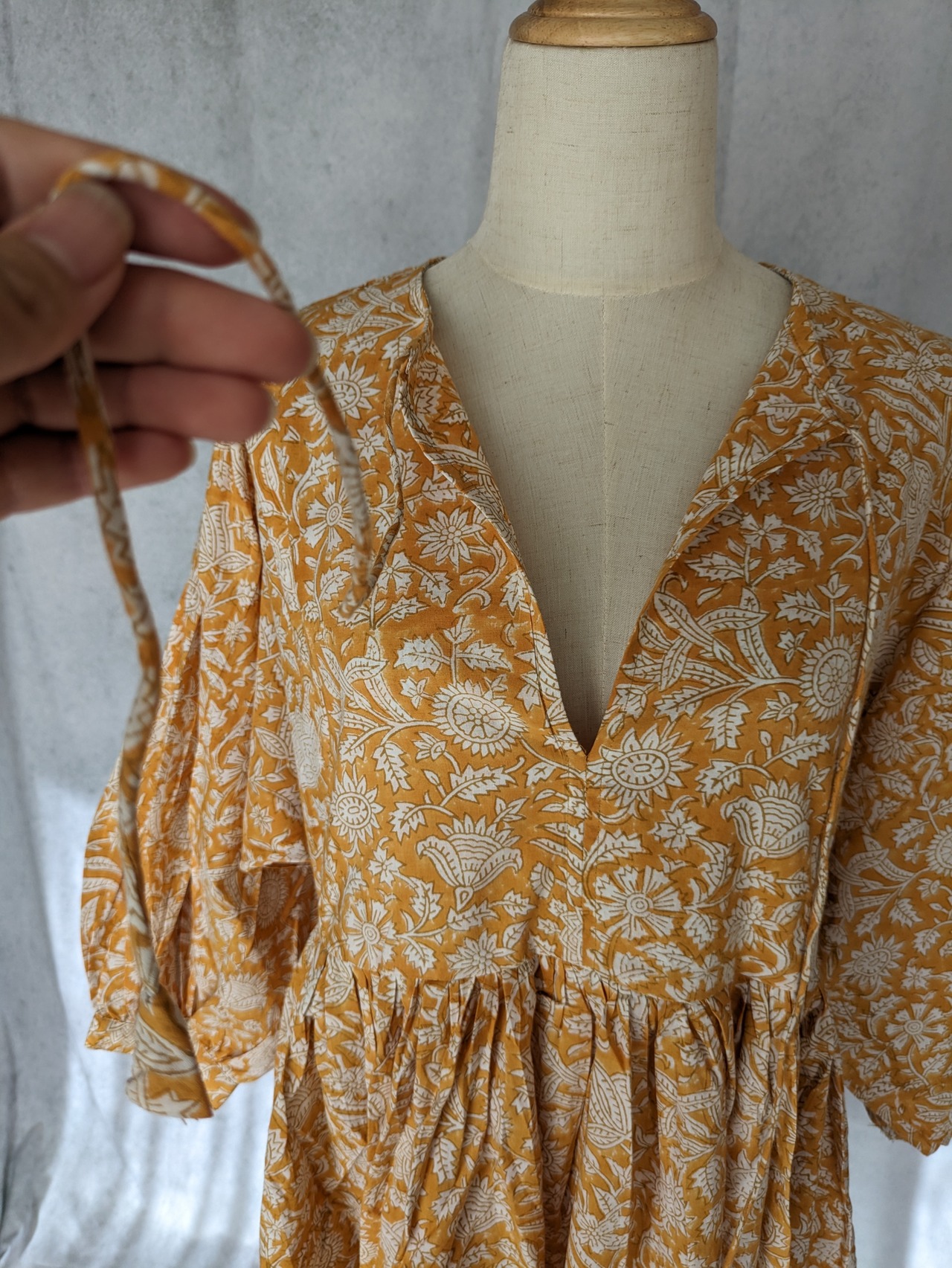 こちらは、インドの伝統工芸であるハンドブロックプリントで作られたワンピースです。
