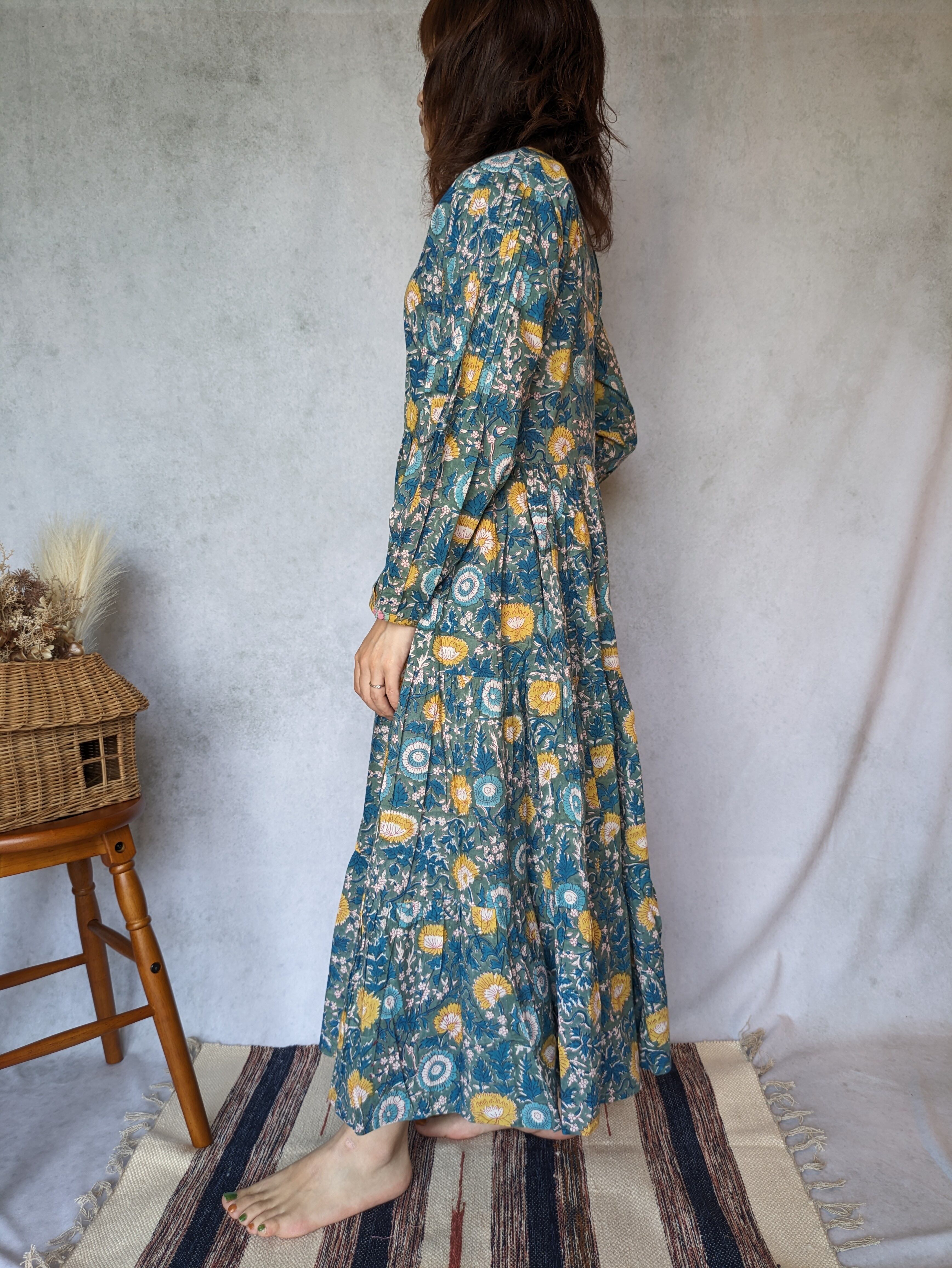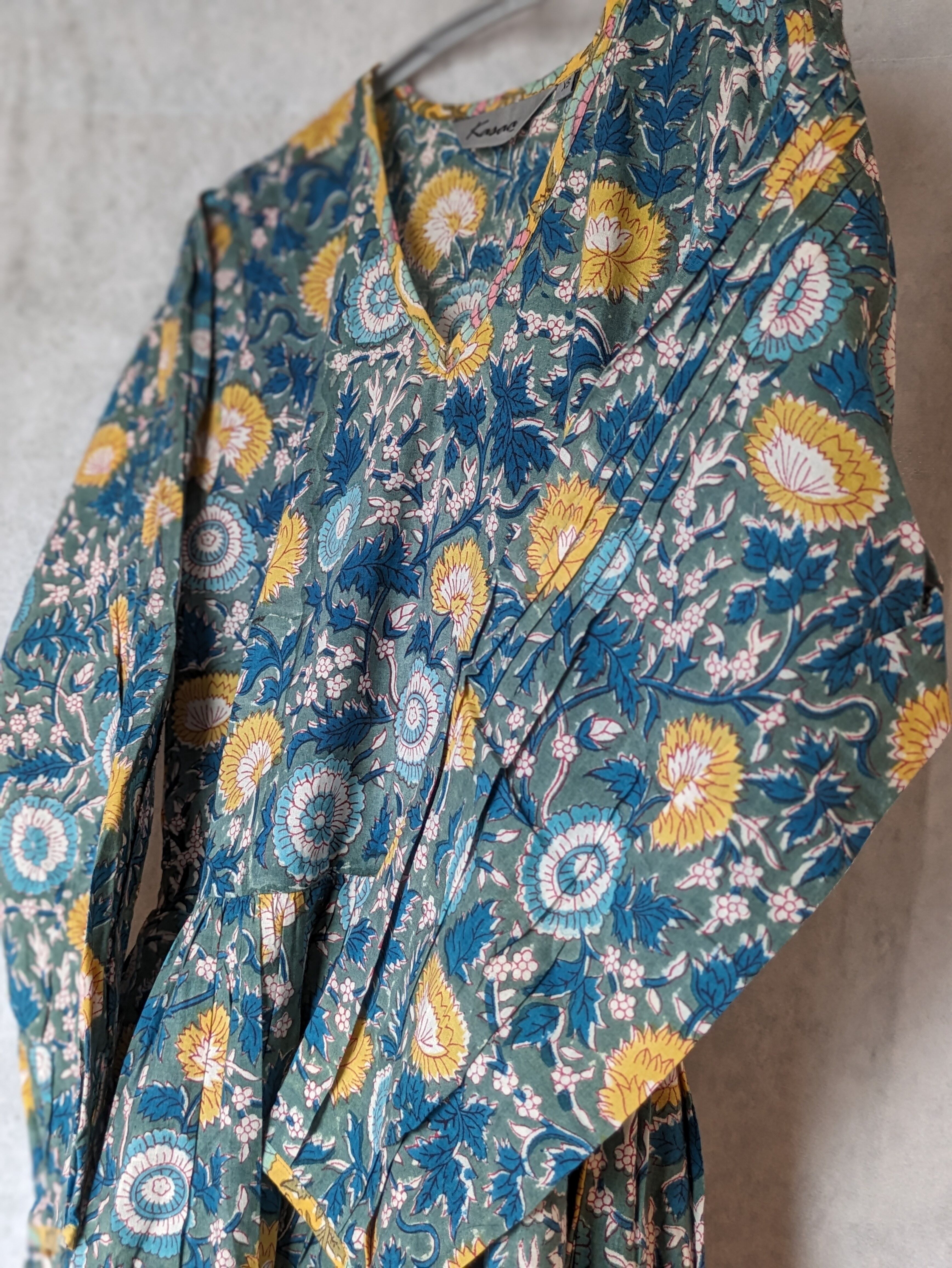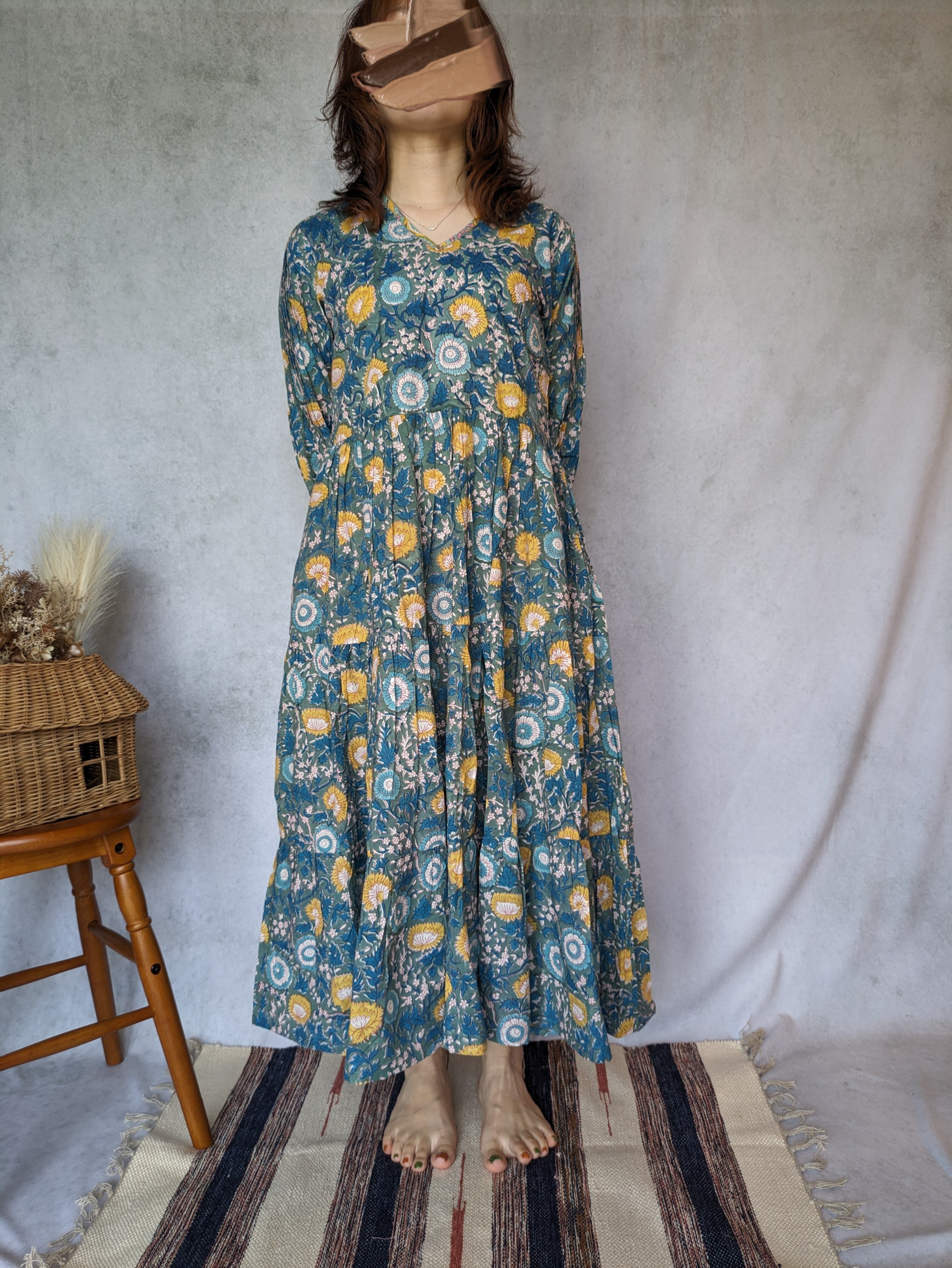 こちらは、インドの伝統工芸であるハンドブロックプリントで作られたワンピースです。
