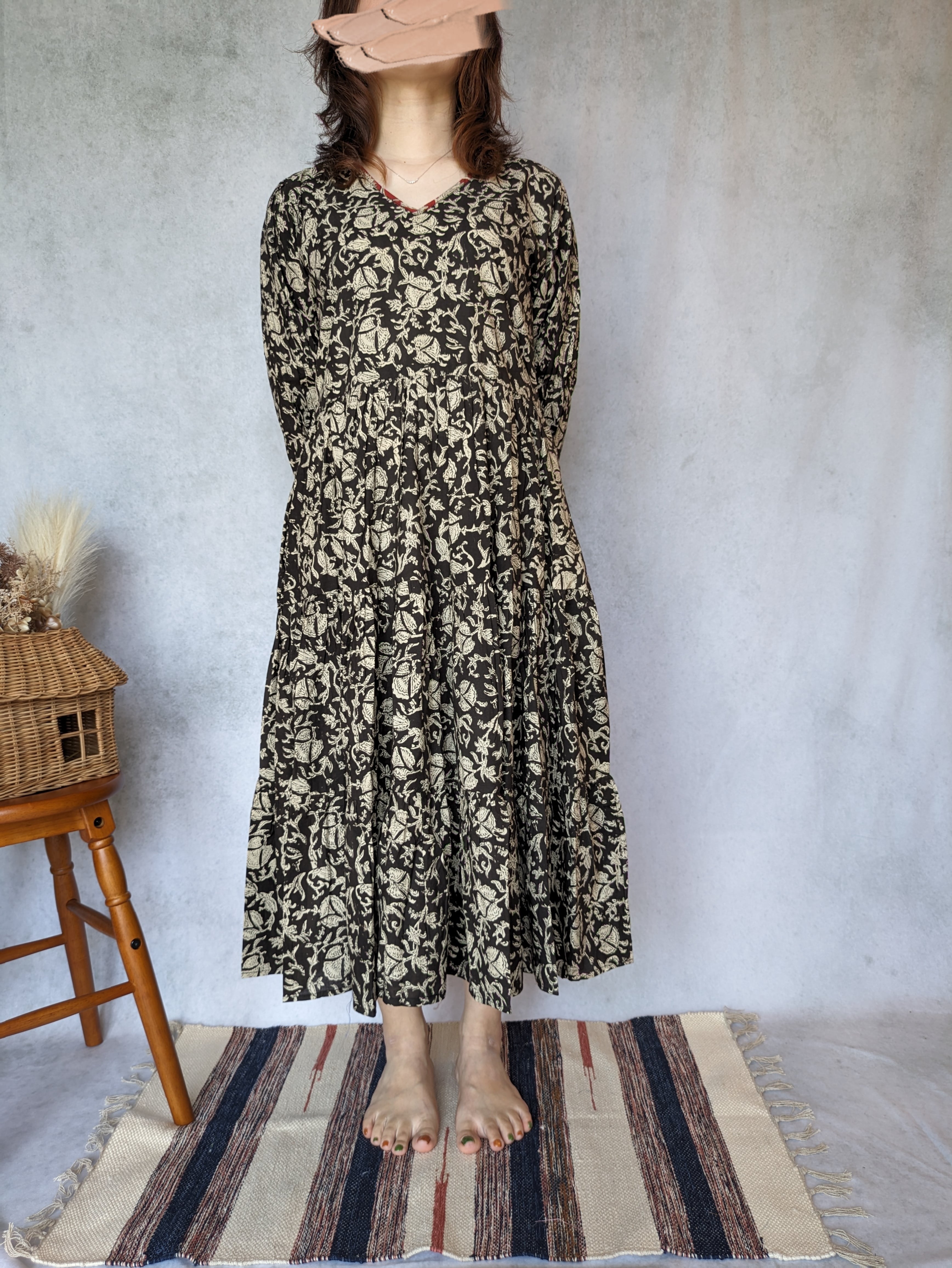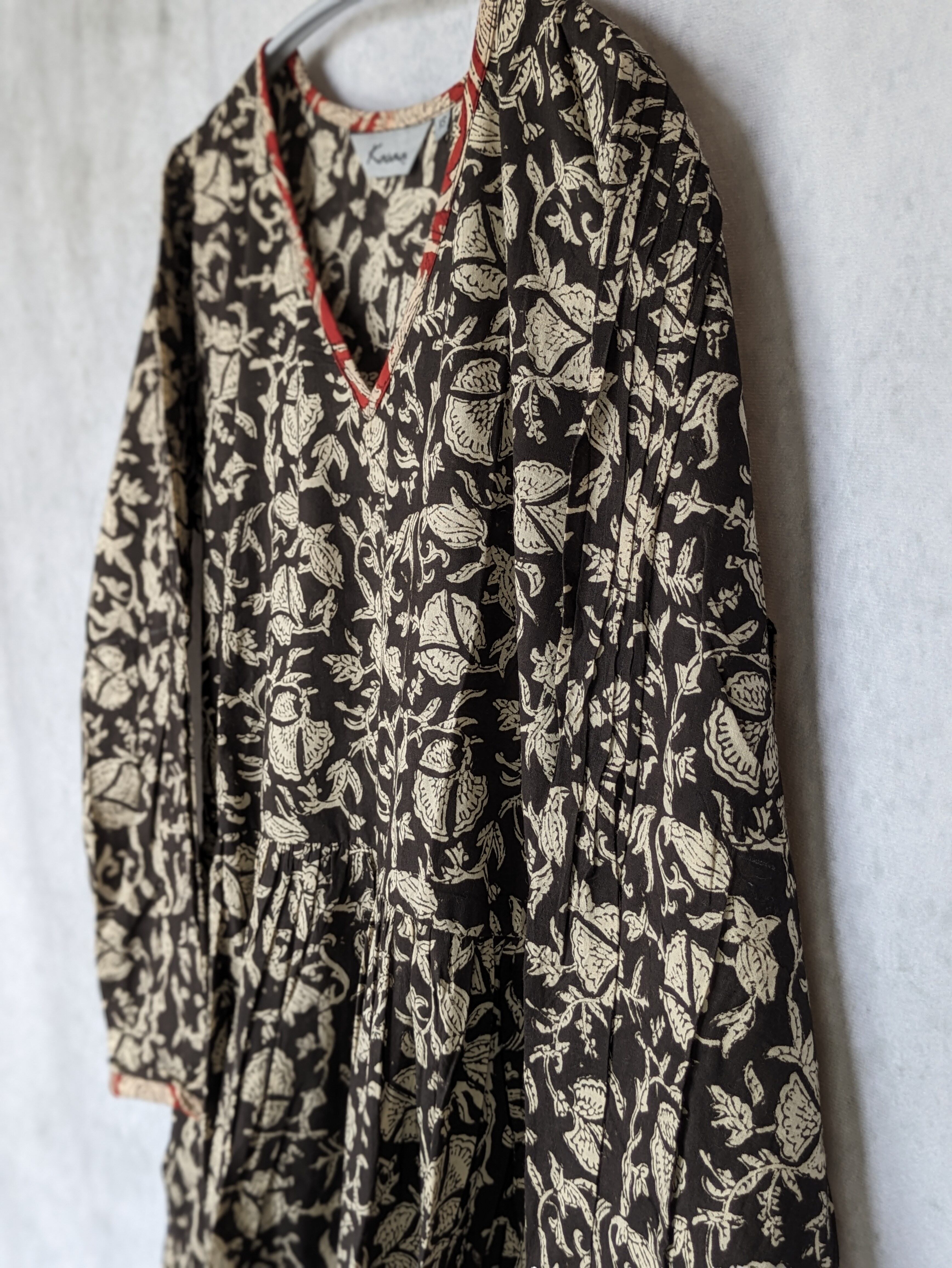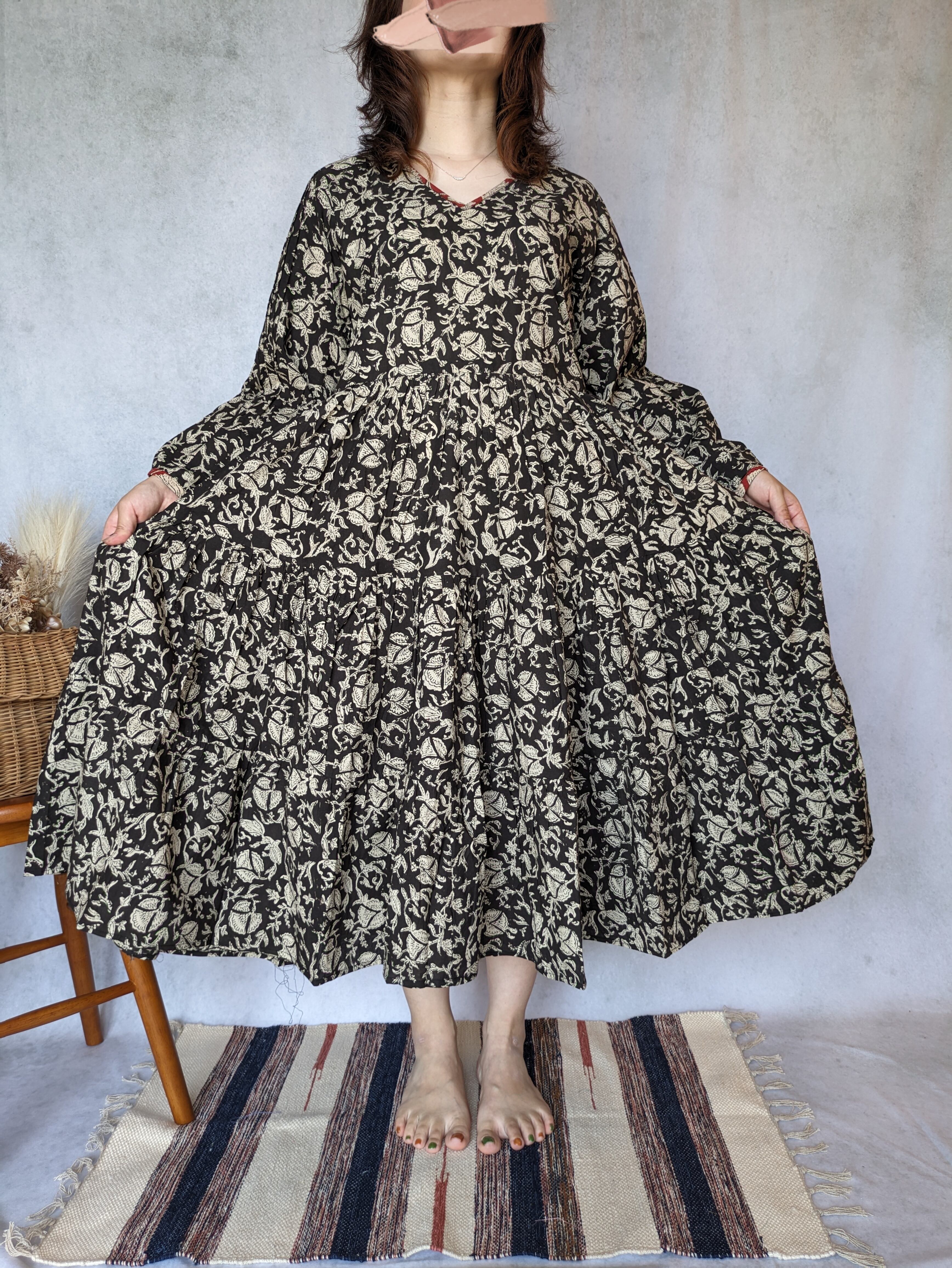 こちらは、インドの伝統工芸であるハンドブロックプリントで作られたワンピースです。