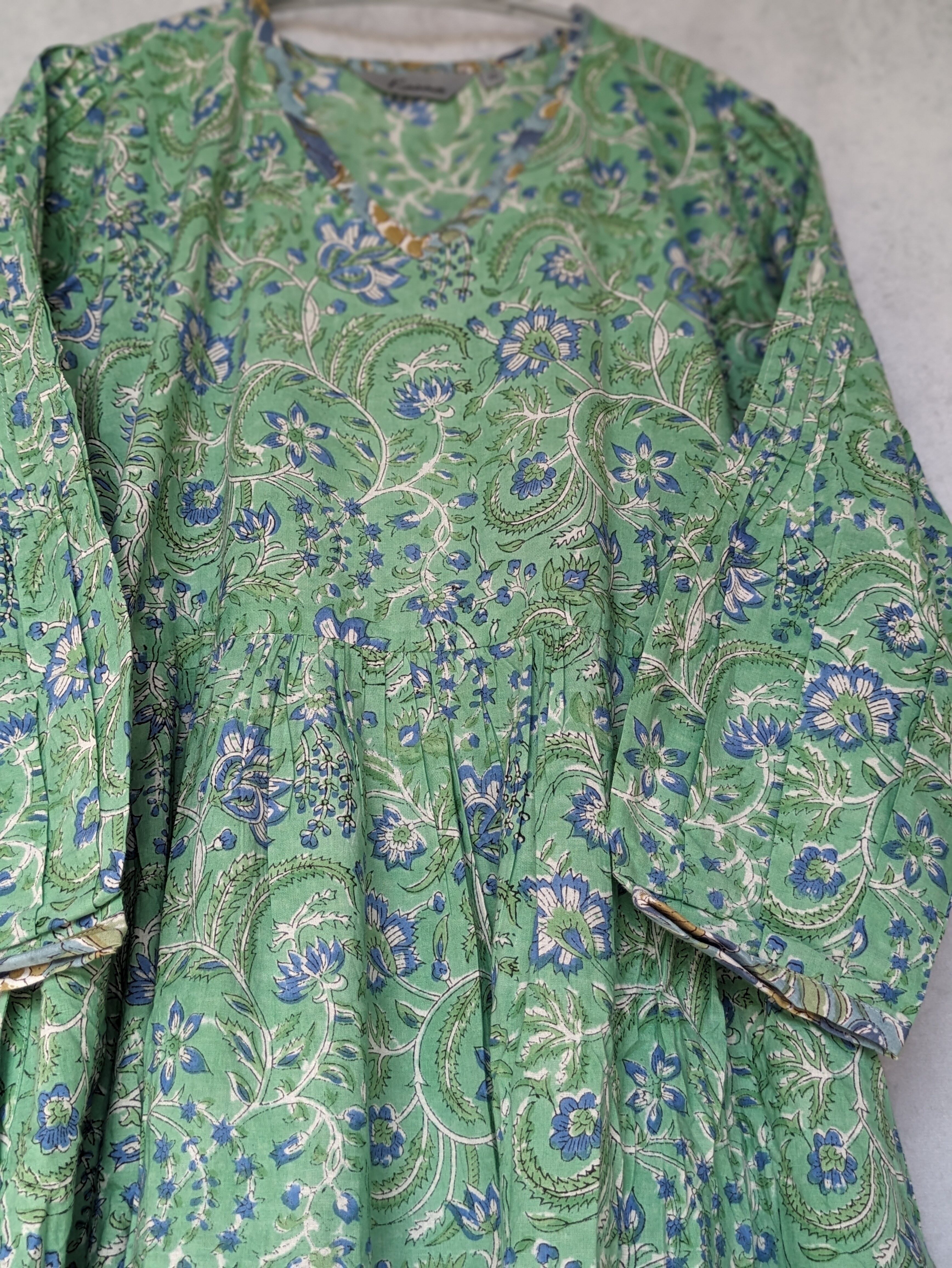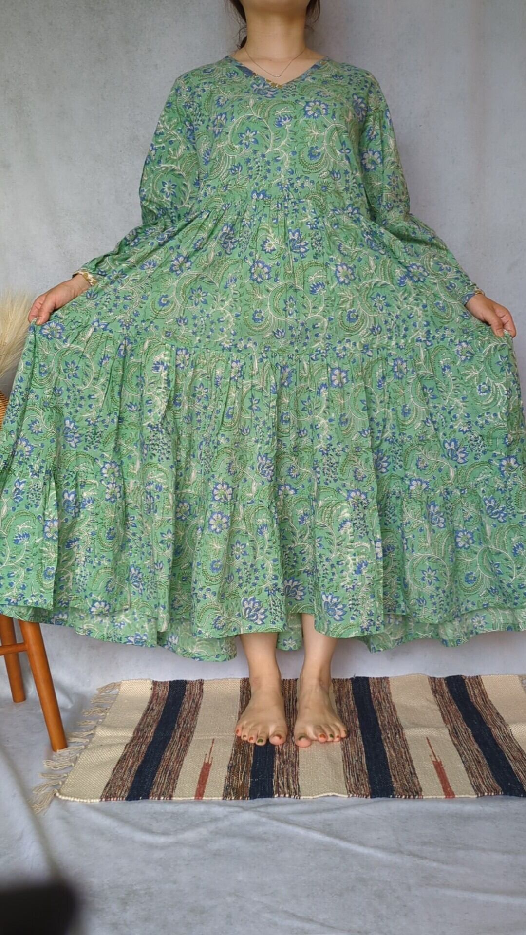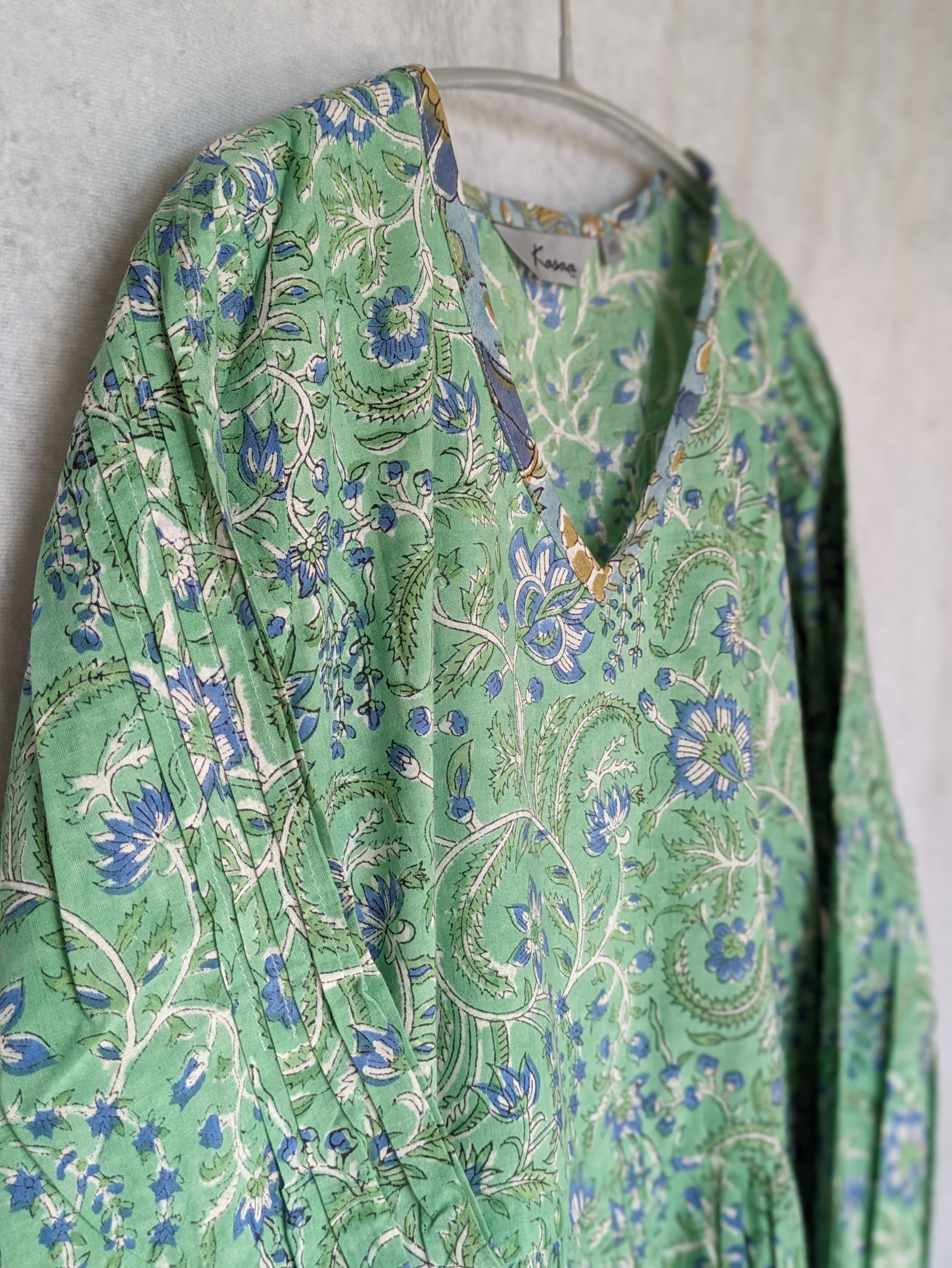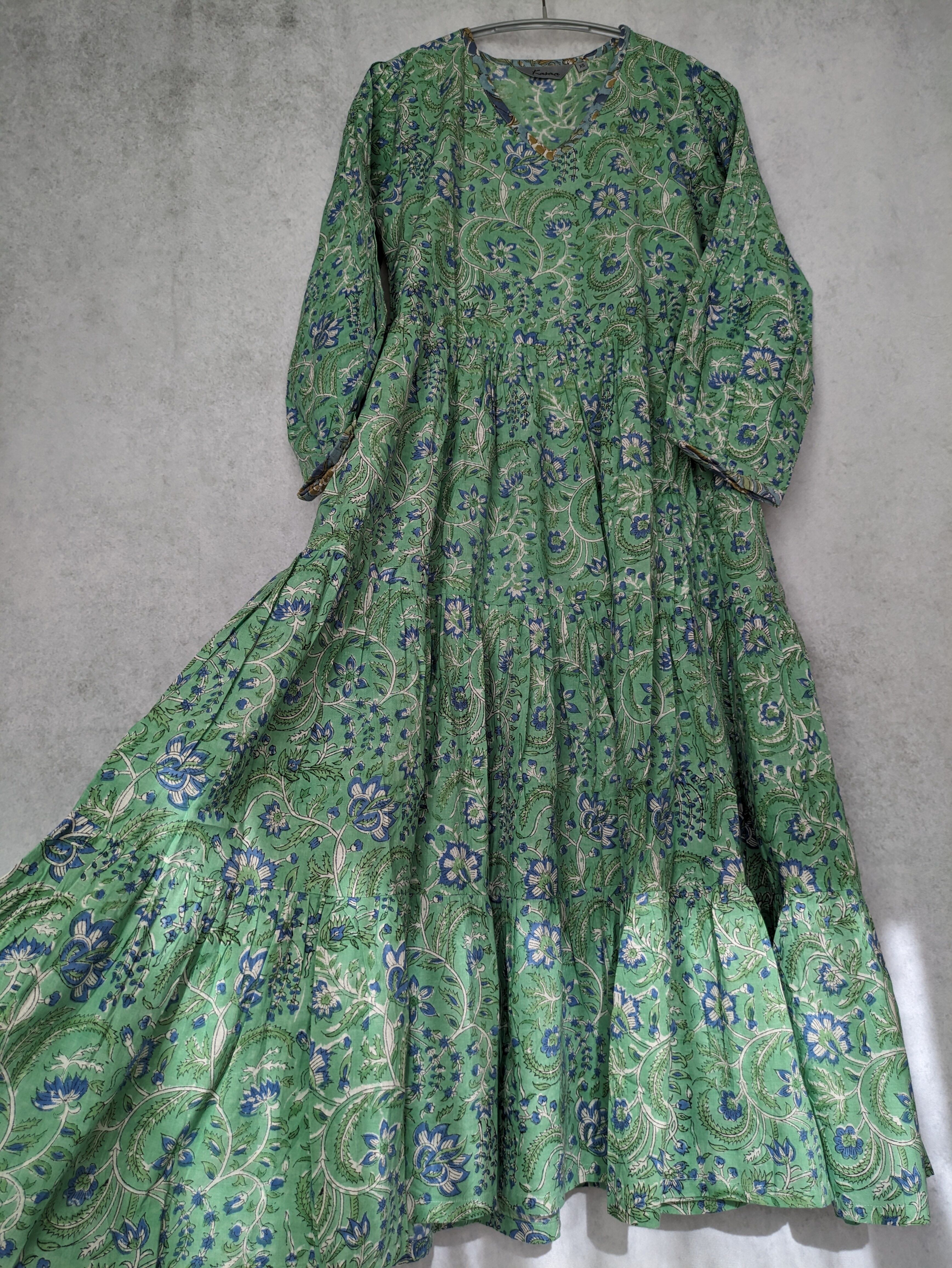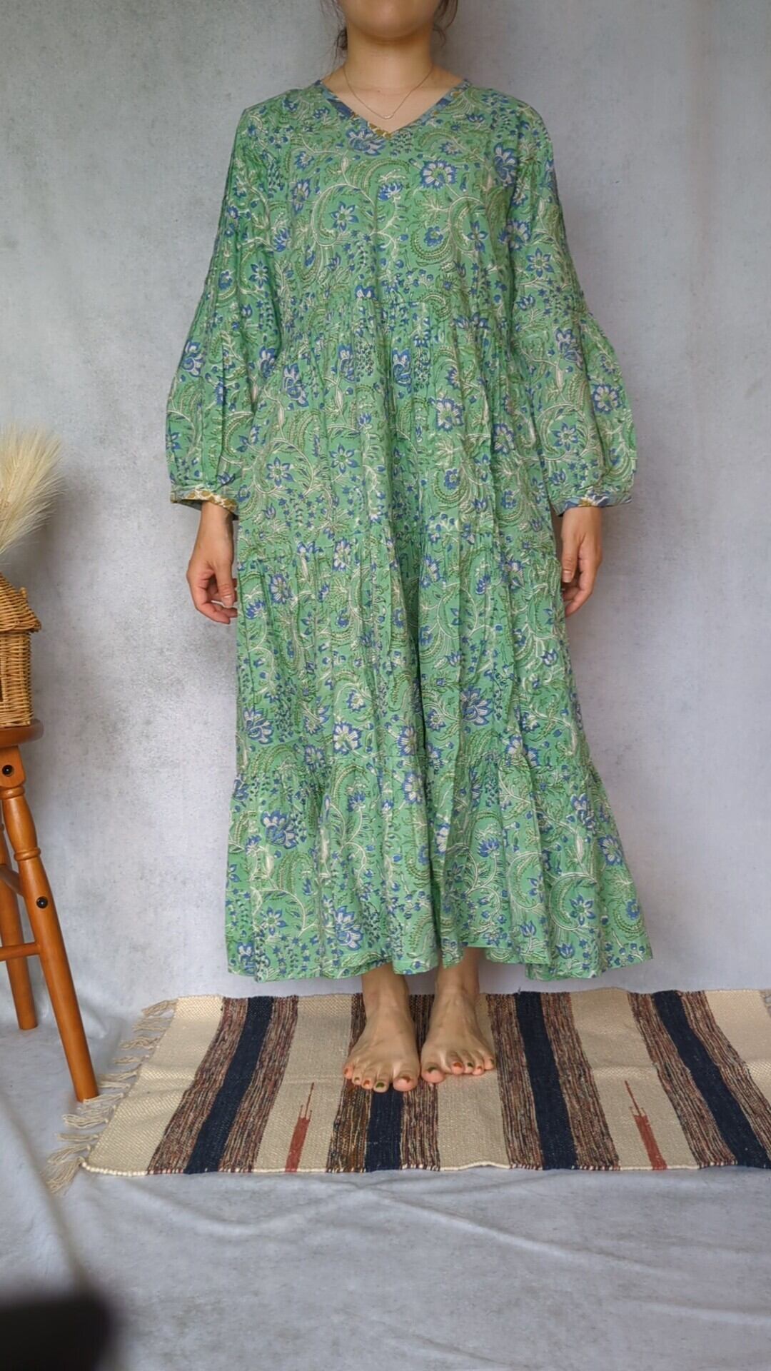 こちらは、インドの伝統工芸であるハンドブロックプリントで作られたワンピースです。