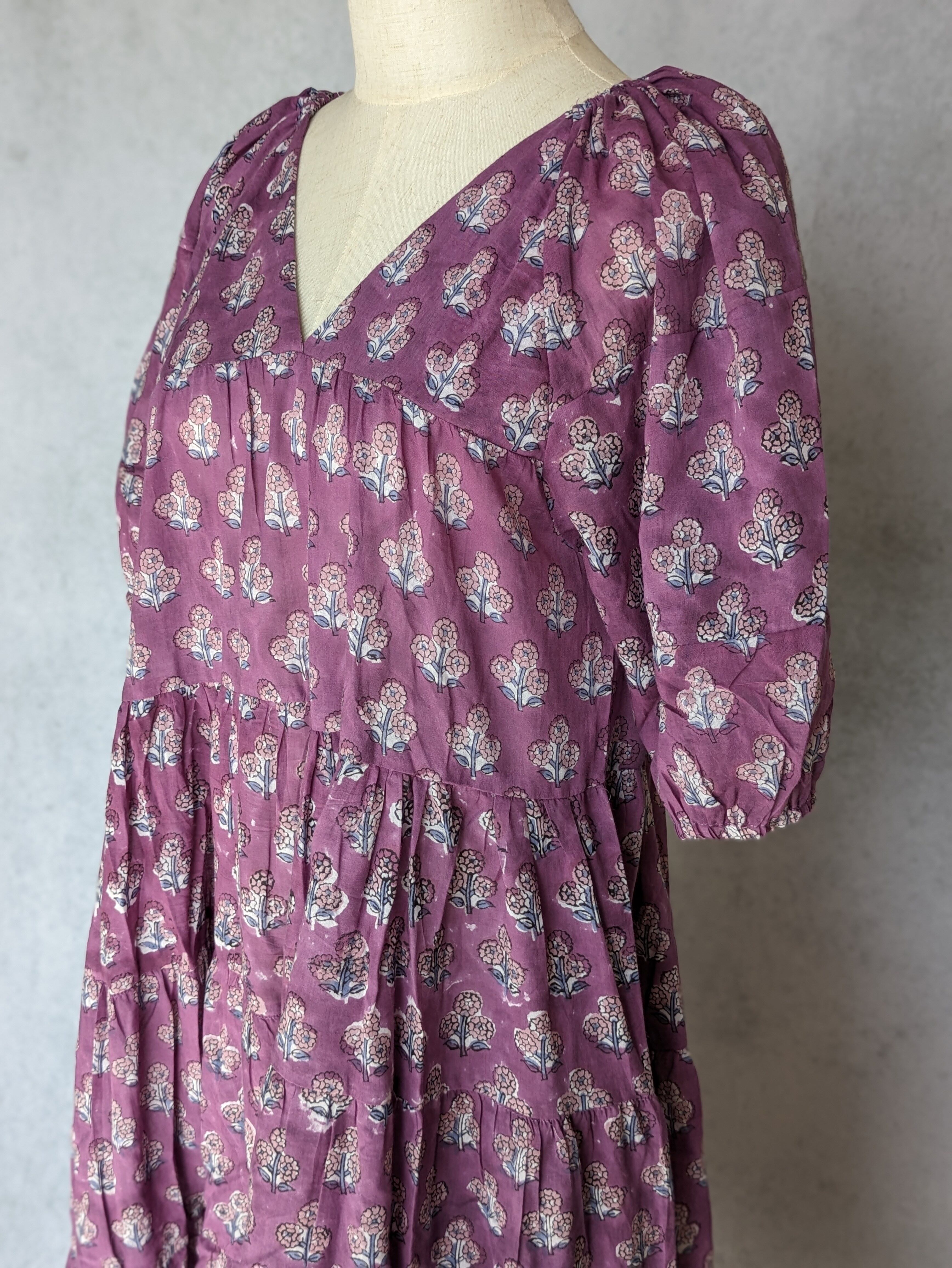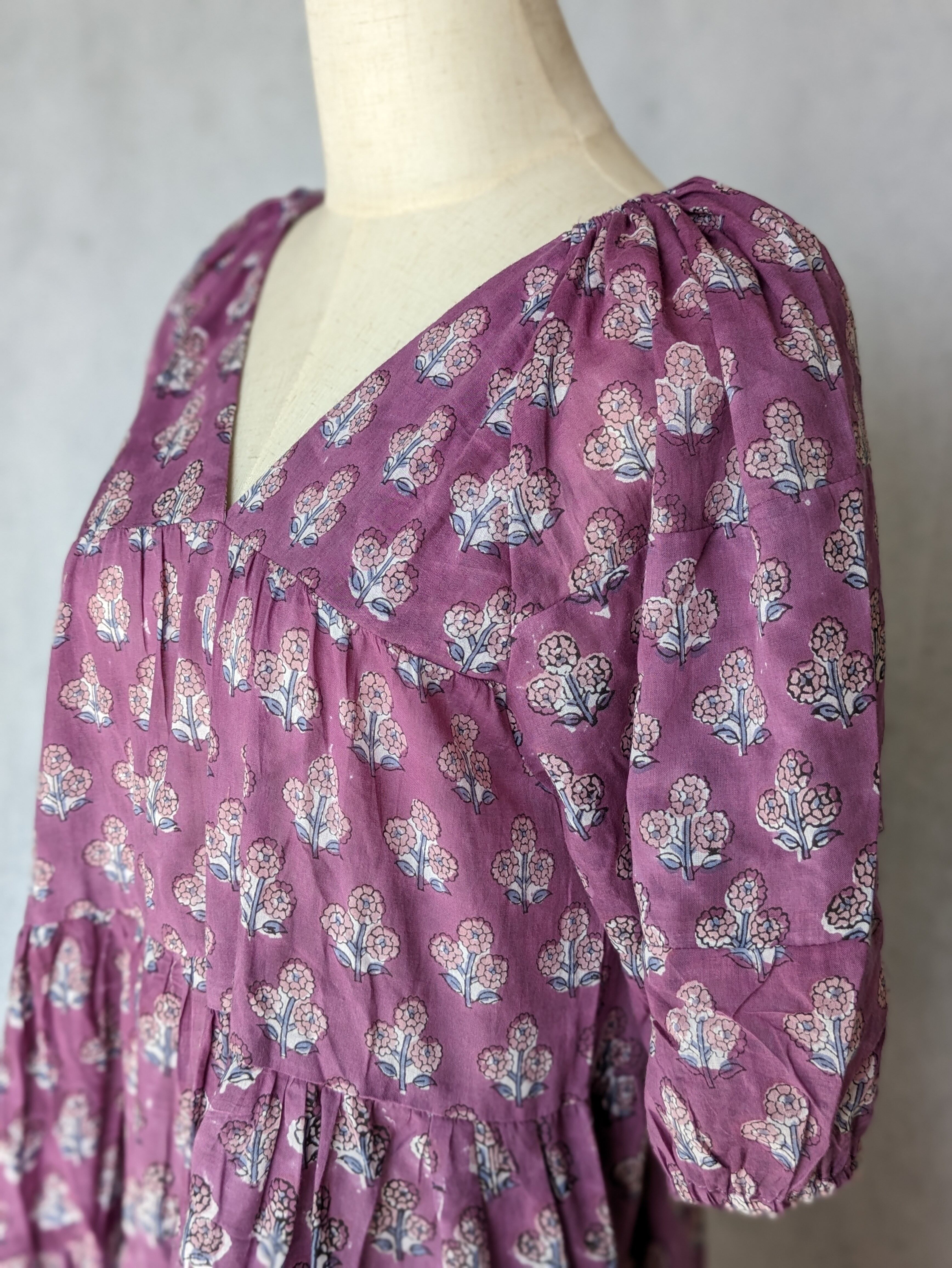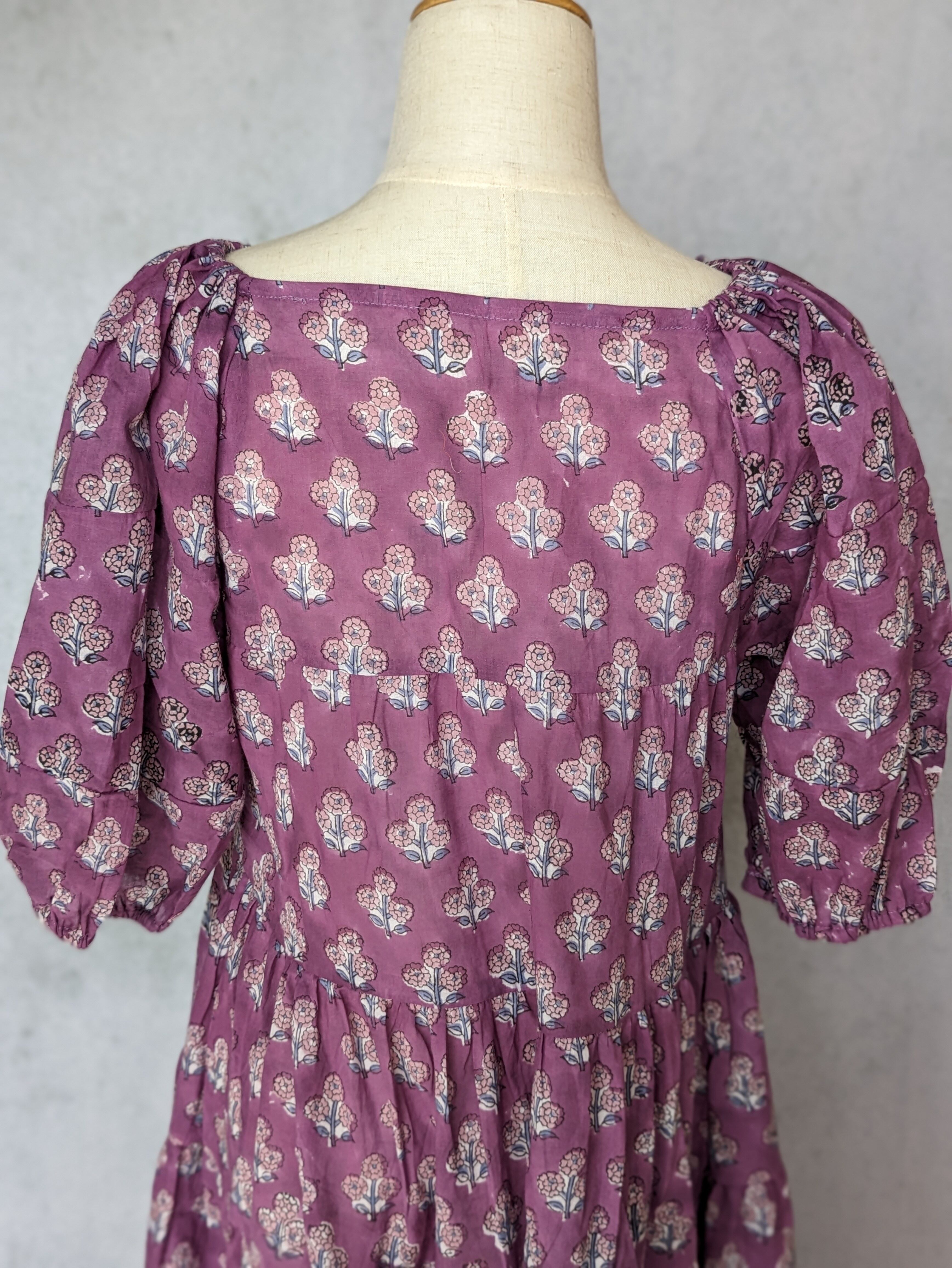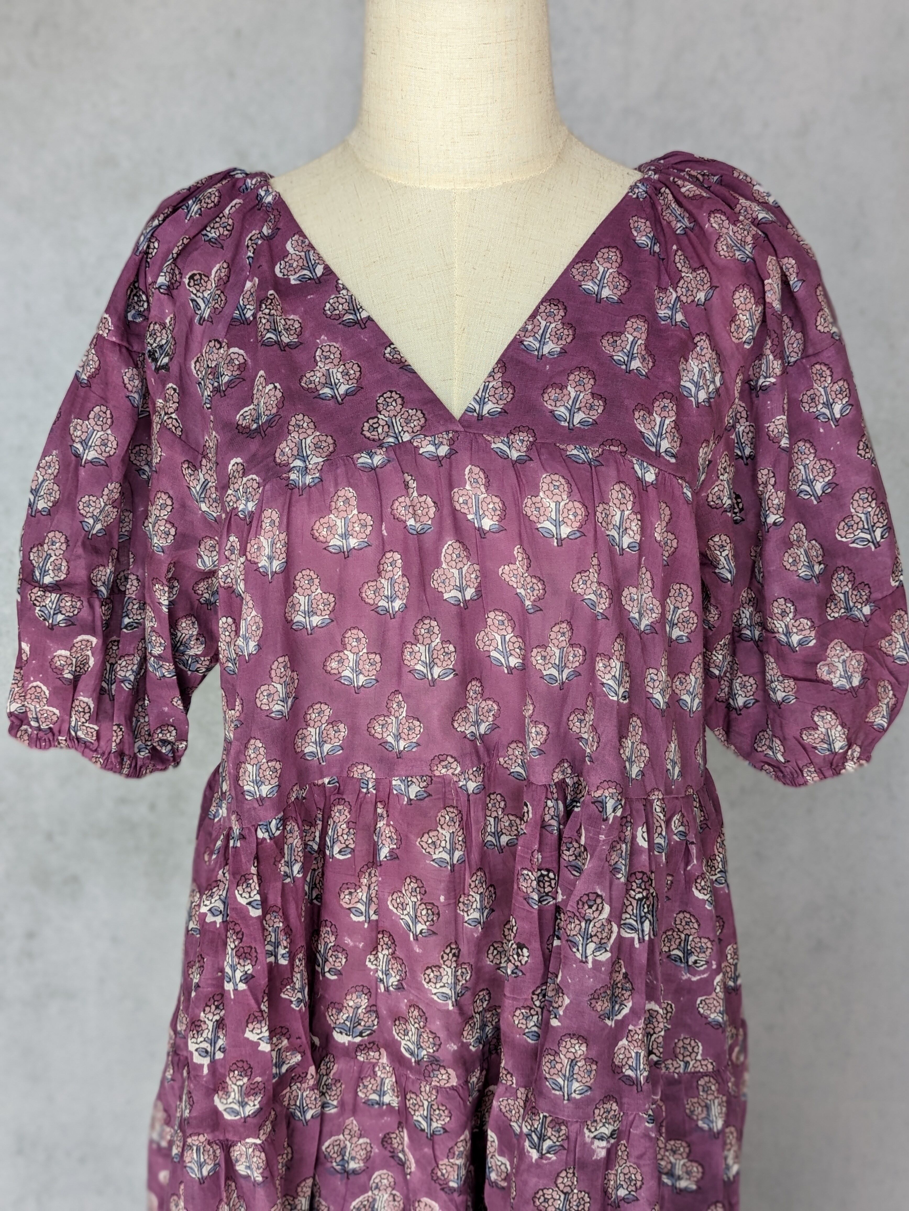 【低身長向け】ぽわん袖ティアードワンピース ブロックプリント