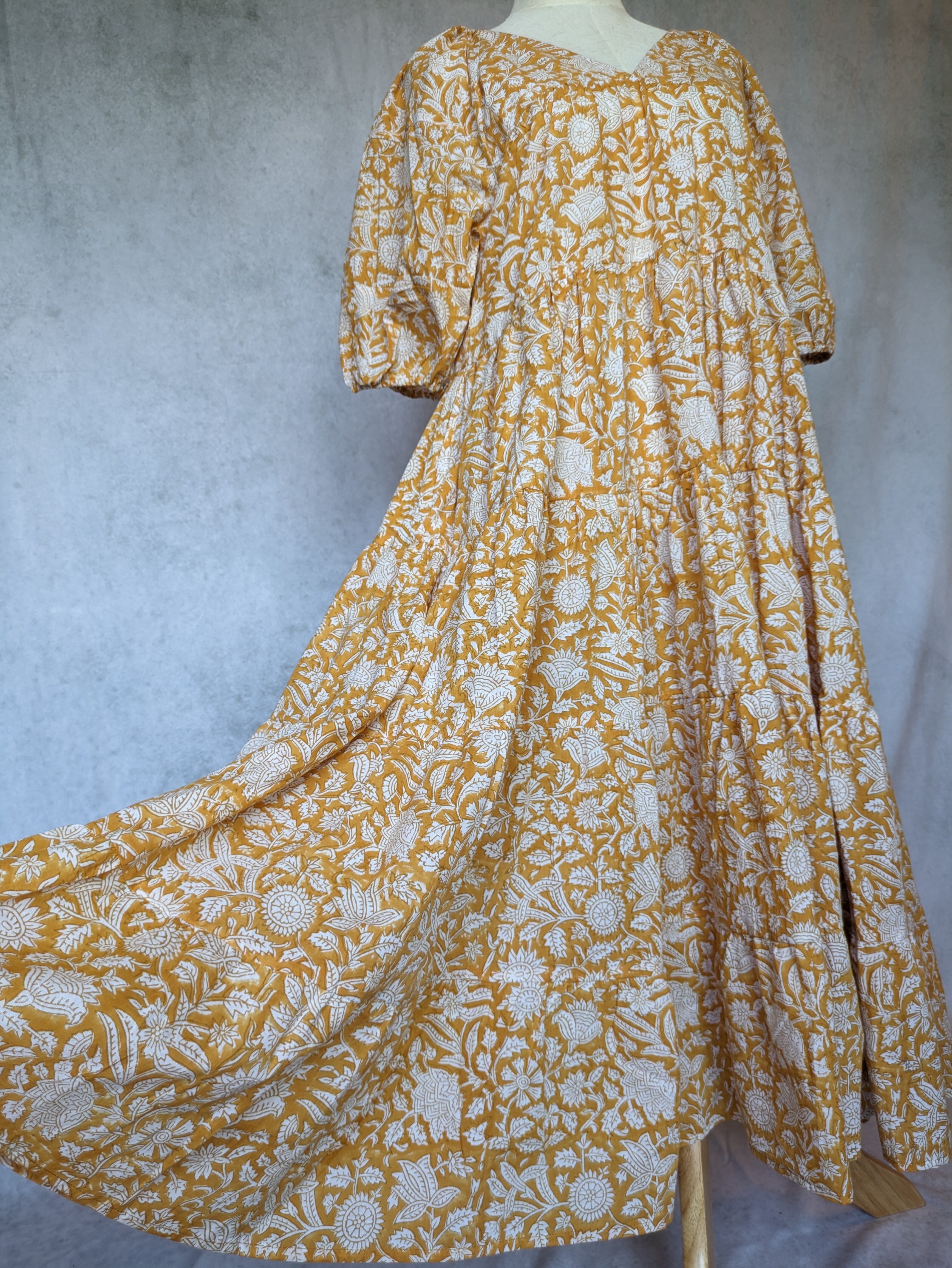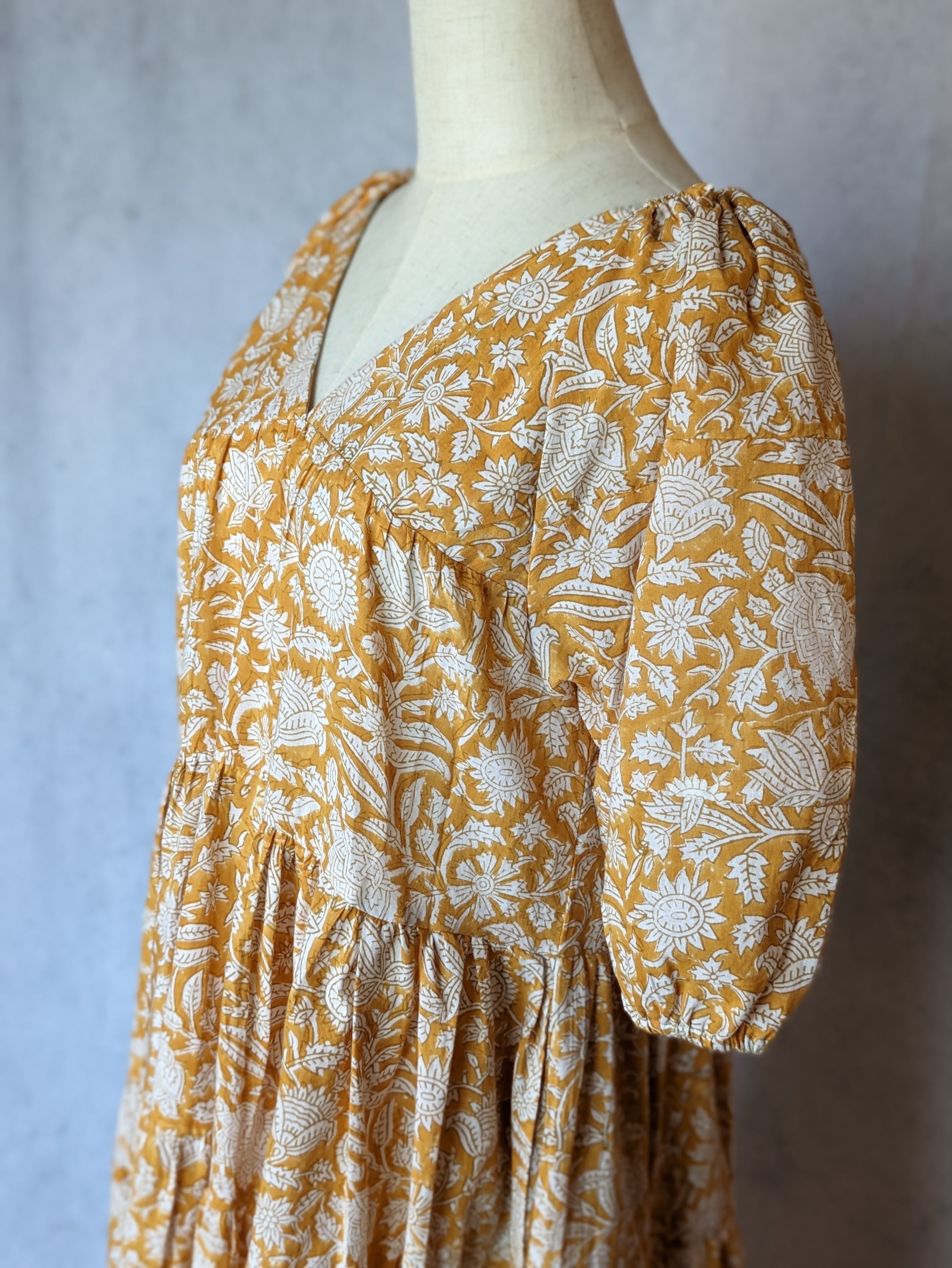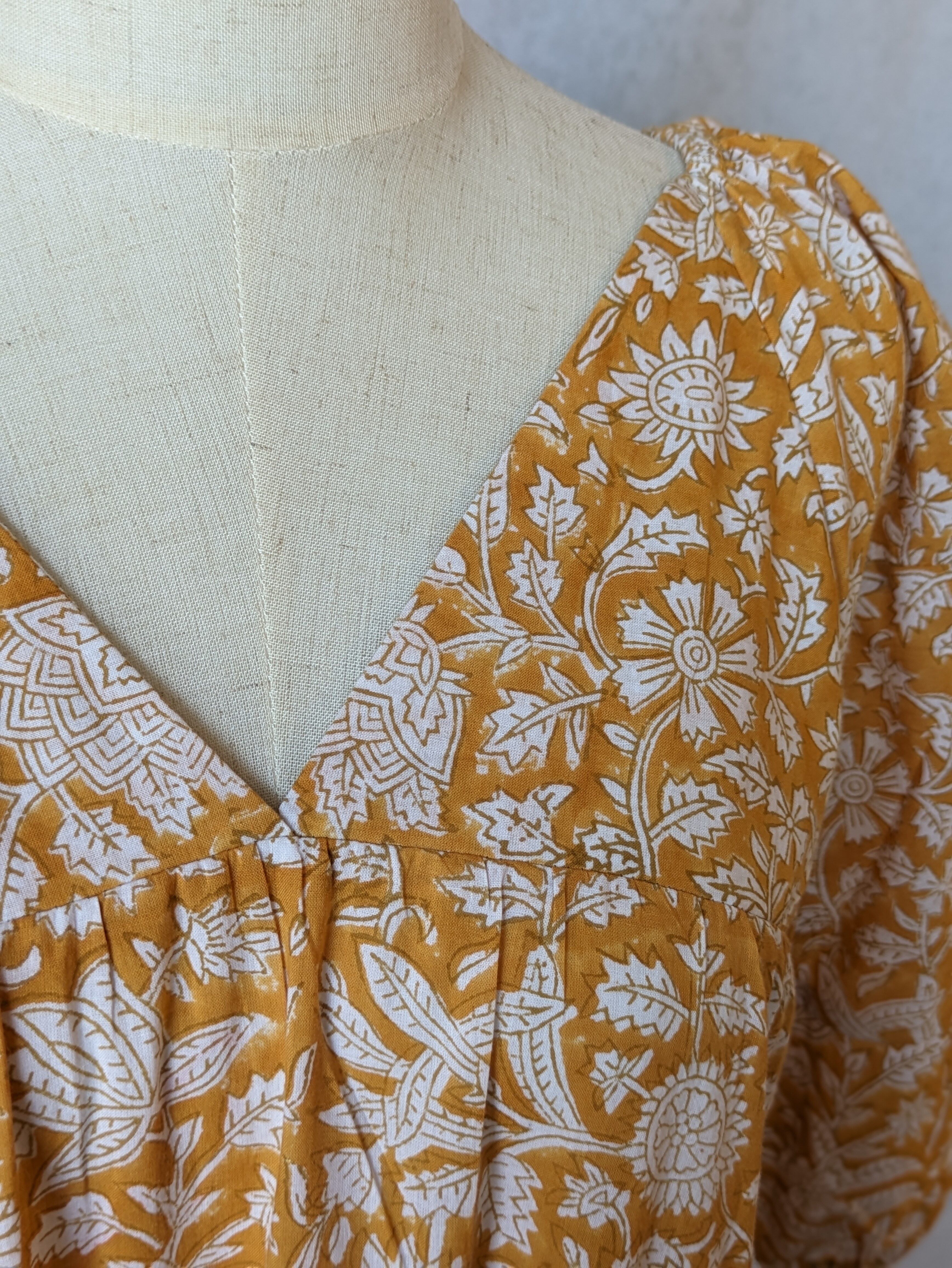こちらは、インドの伝統工芸であるハンドブロックプリントで作られたワンピースです。