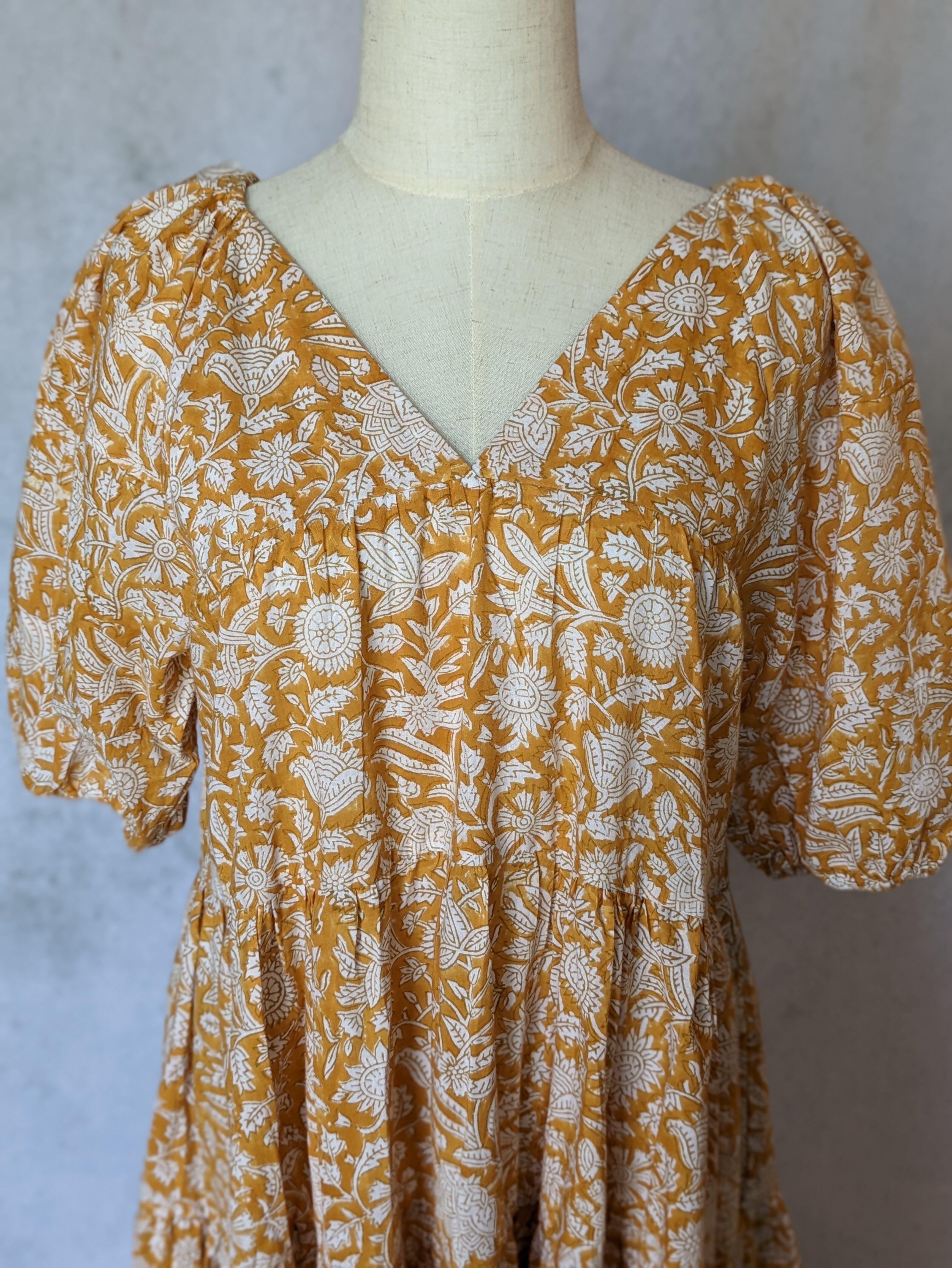 【低身長向け】ぽわん袖ティアードワンピース ブロックプリント