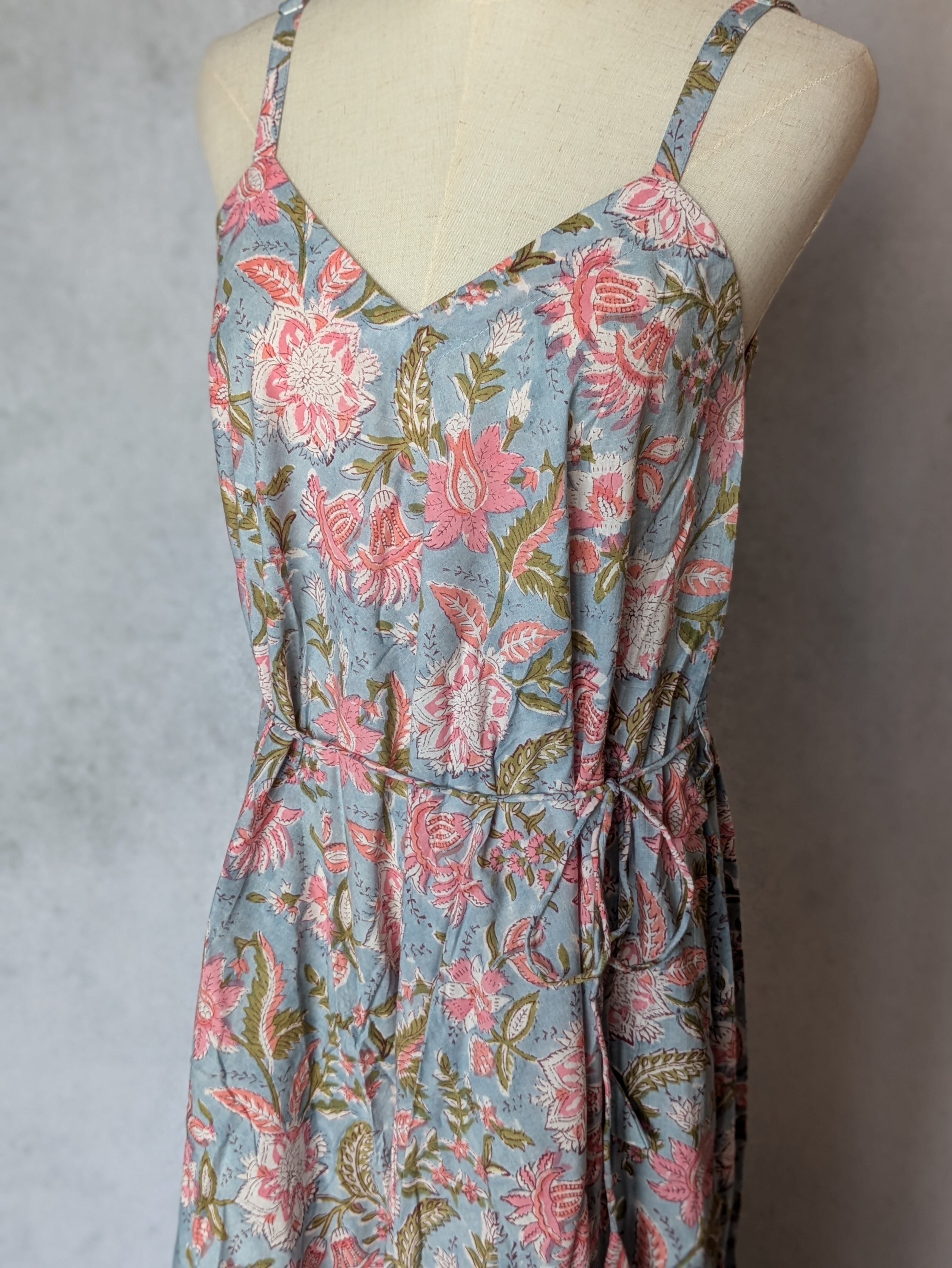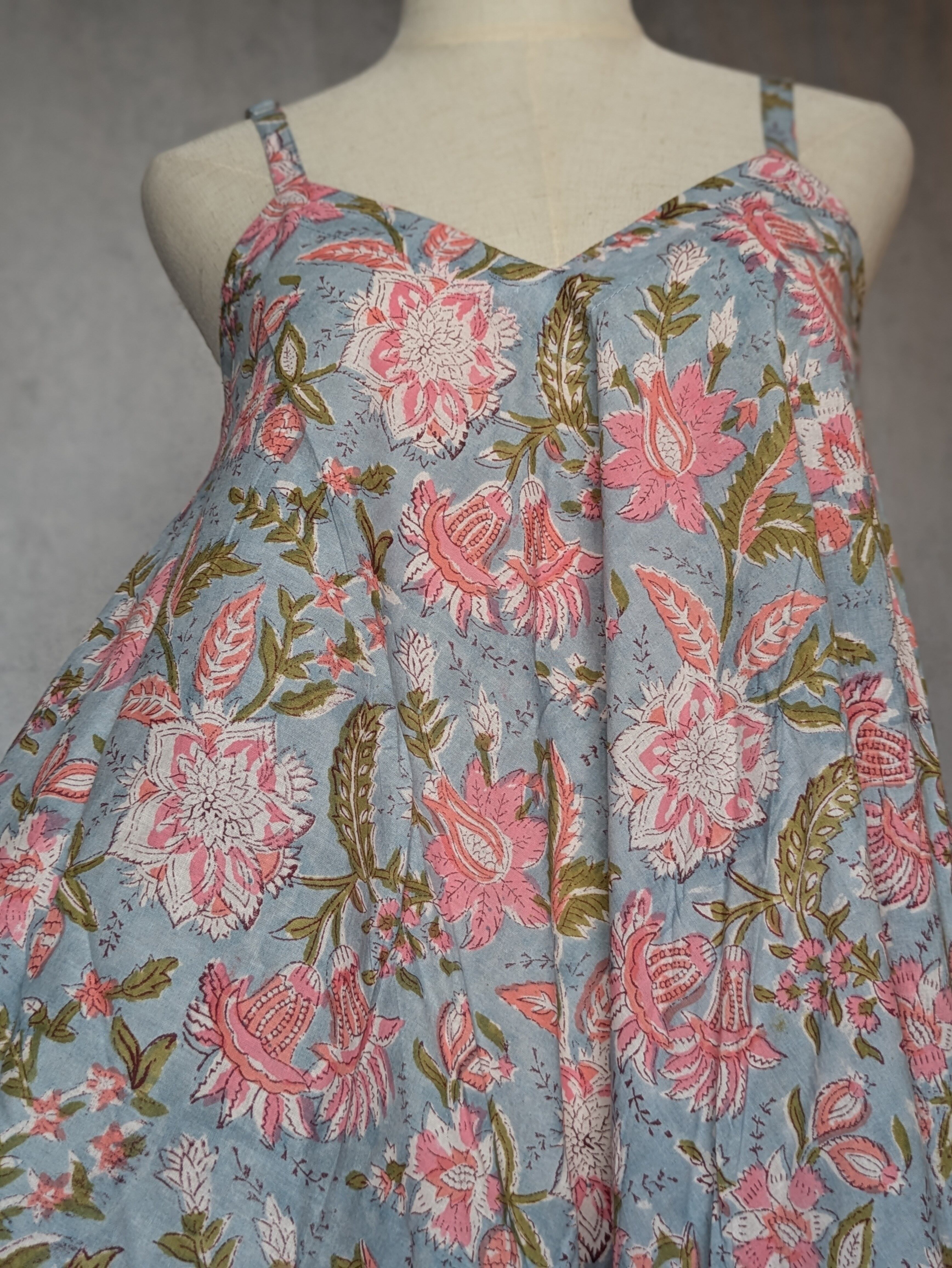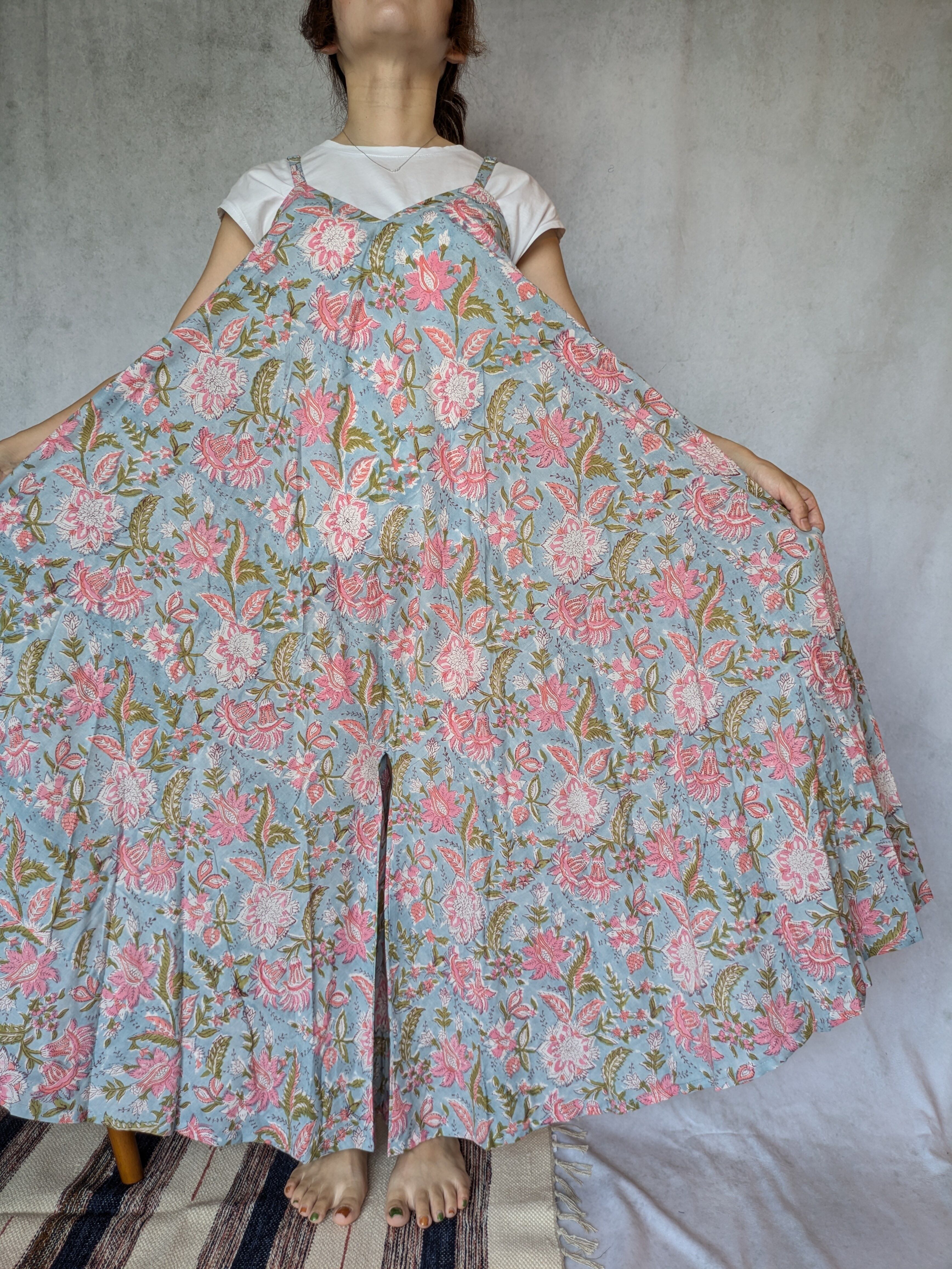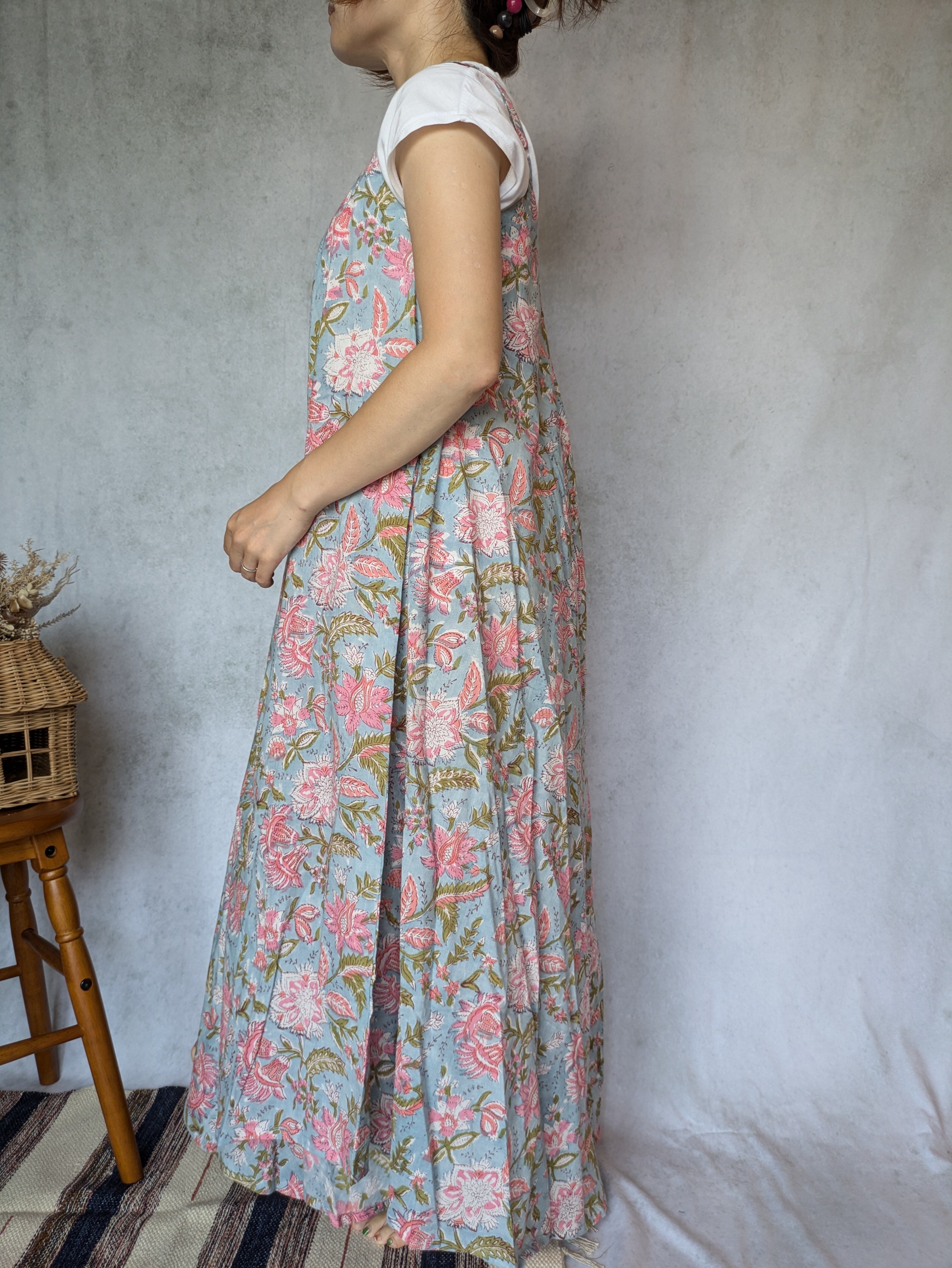 こちらは、インドの伝統工芸であるハンドブロックプリントで作られたワンピースです。