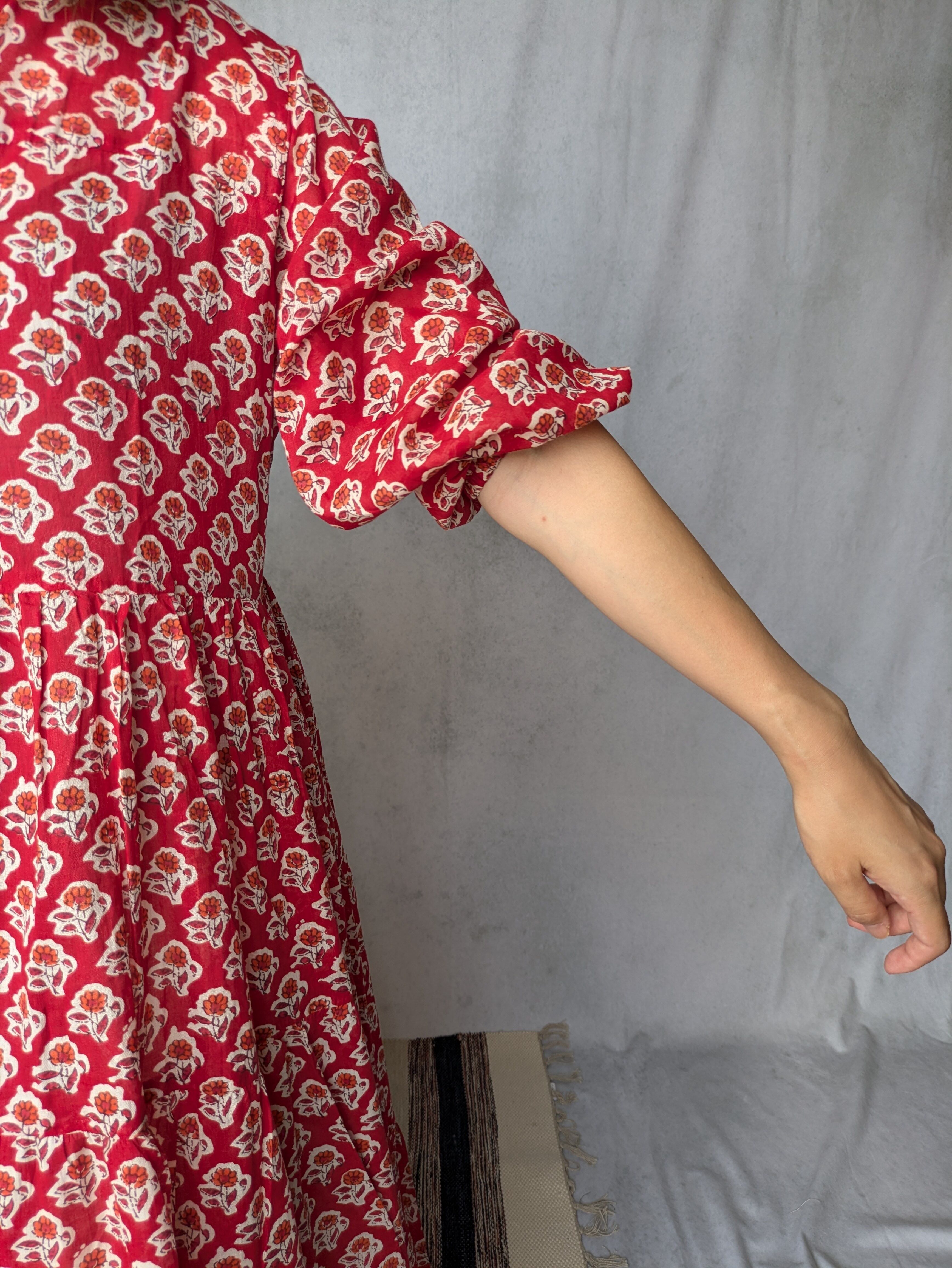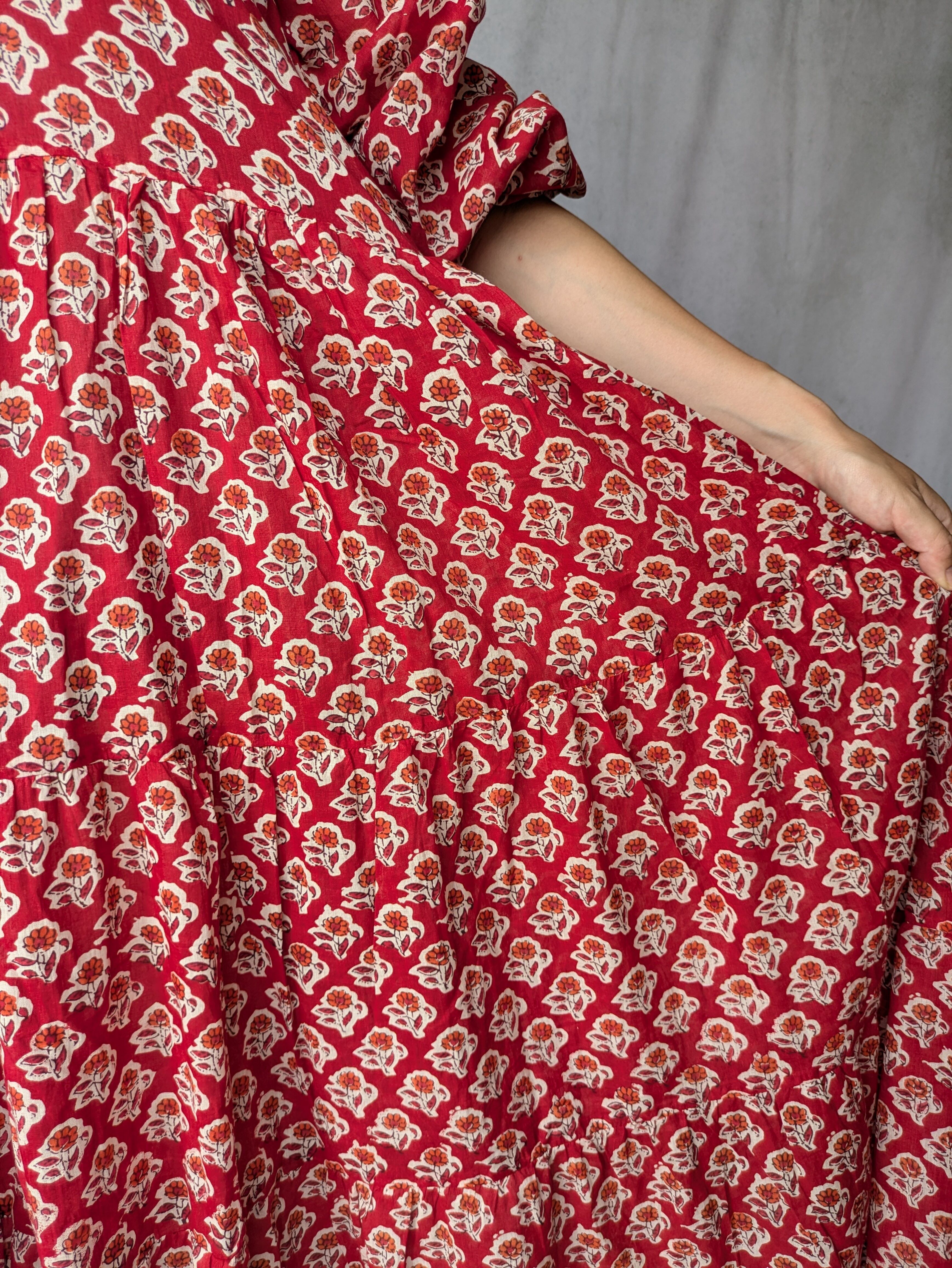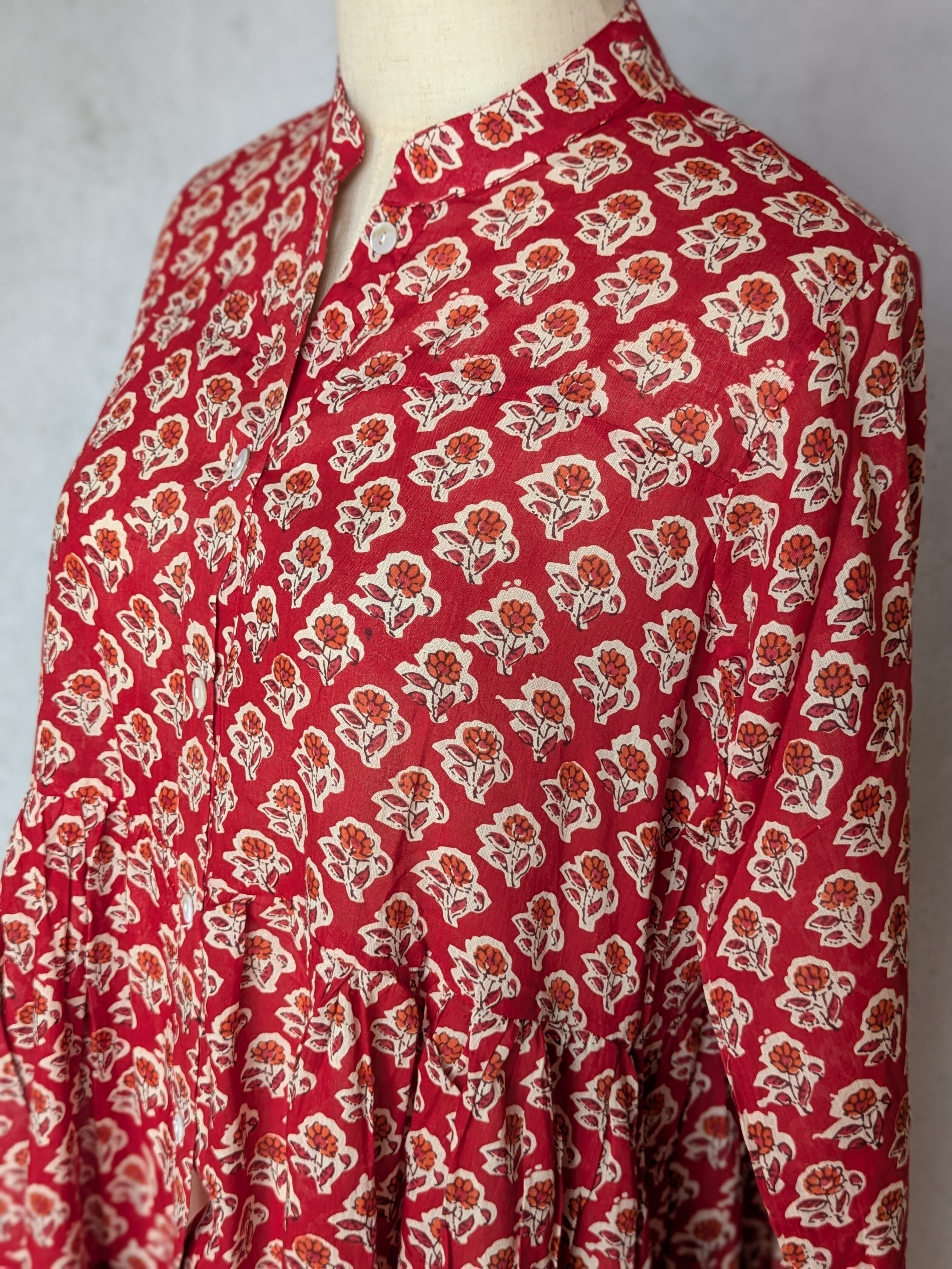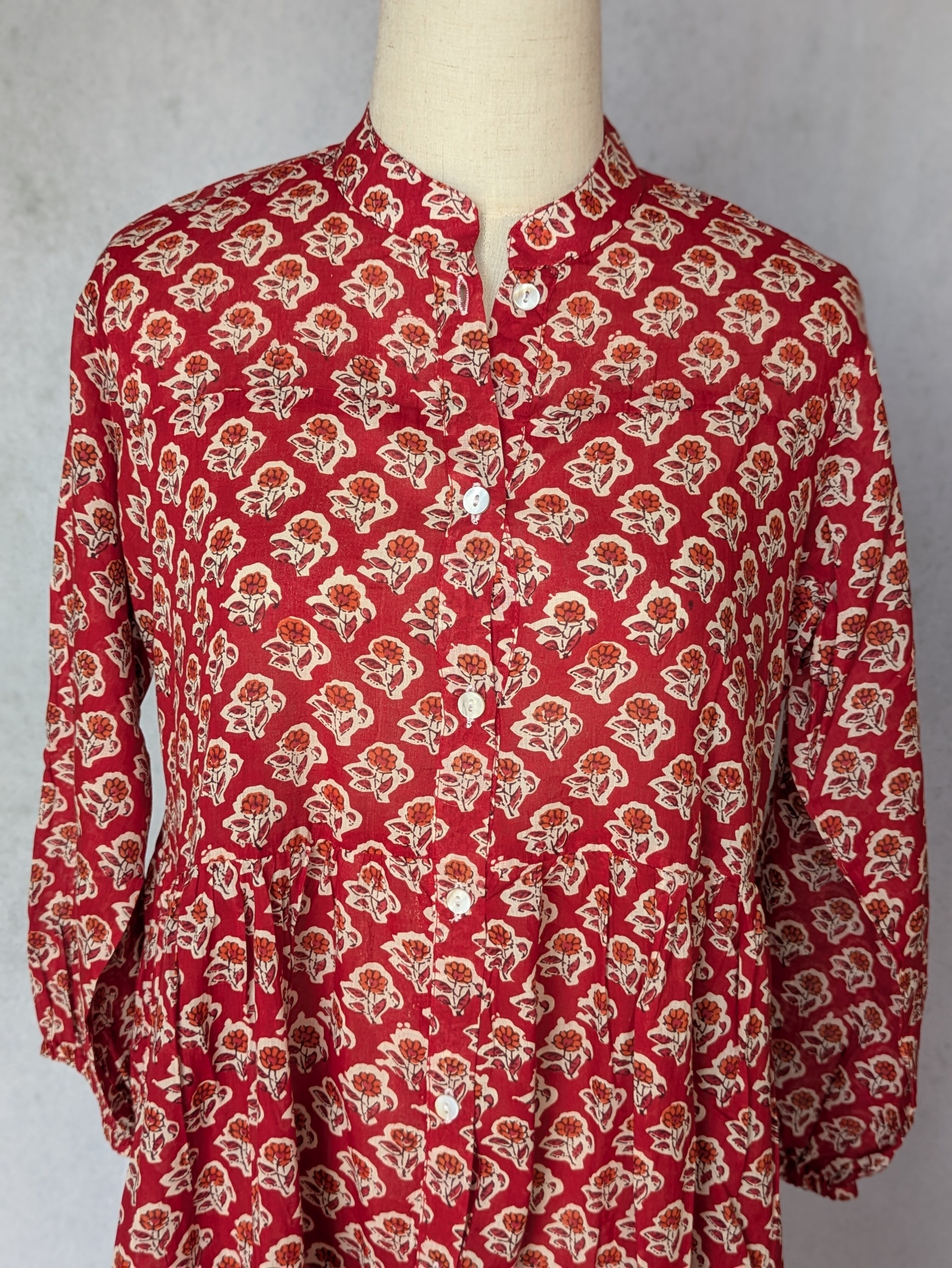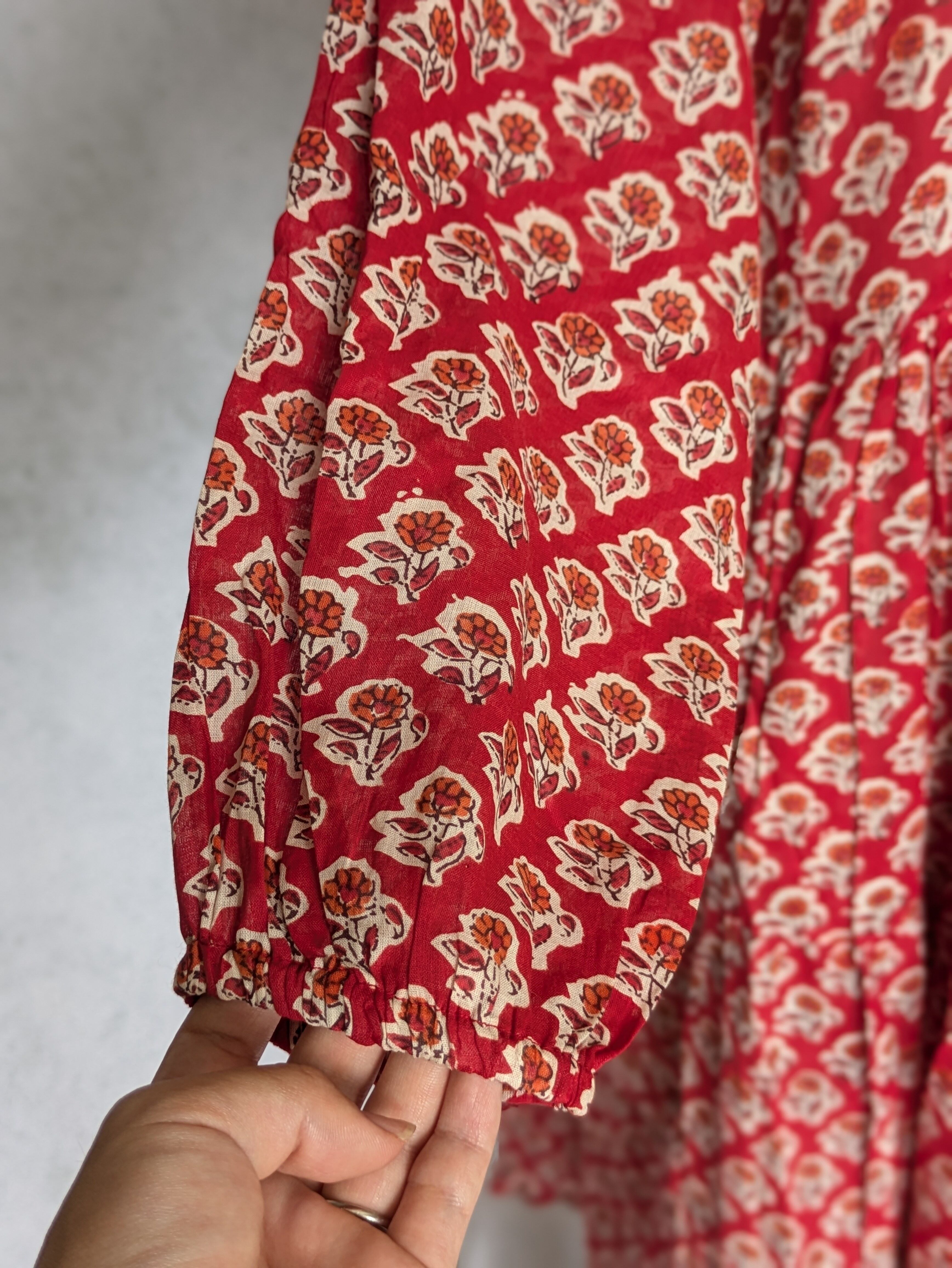 こちらは、インドの伝統工芸であるハンドブロックプリントで作られたワンピースです。