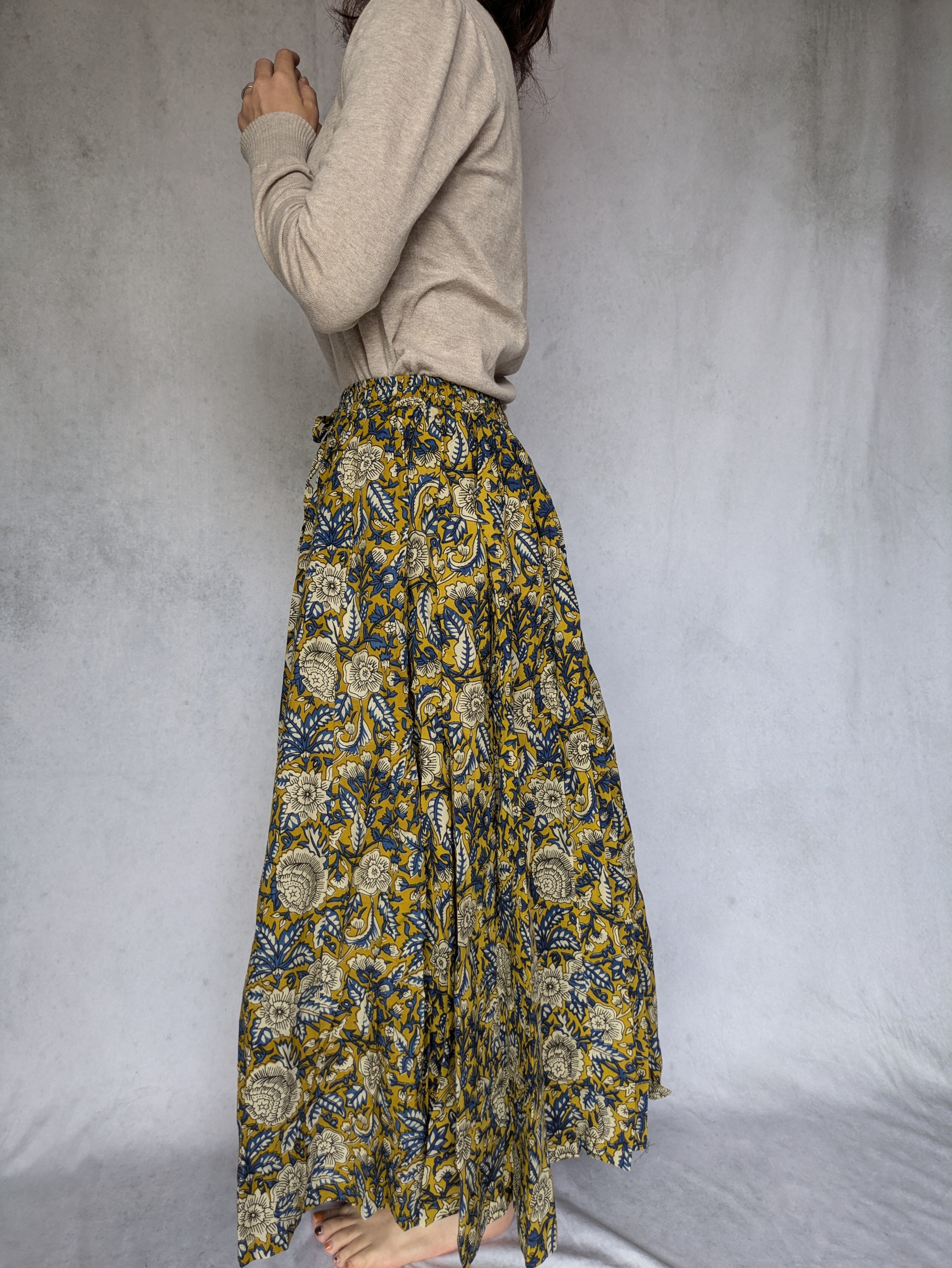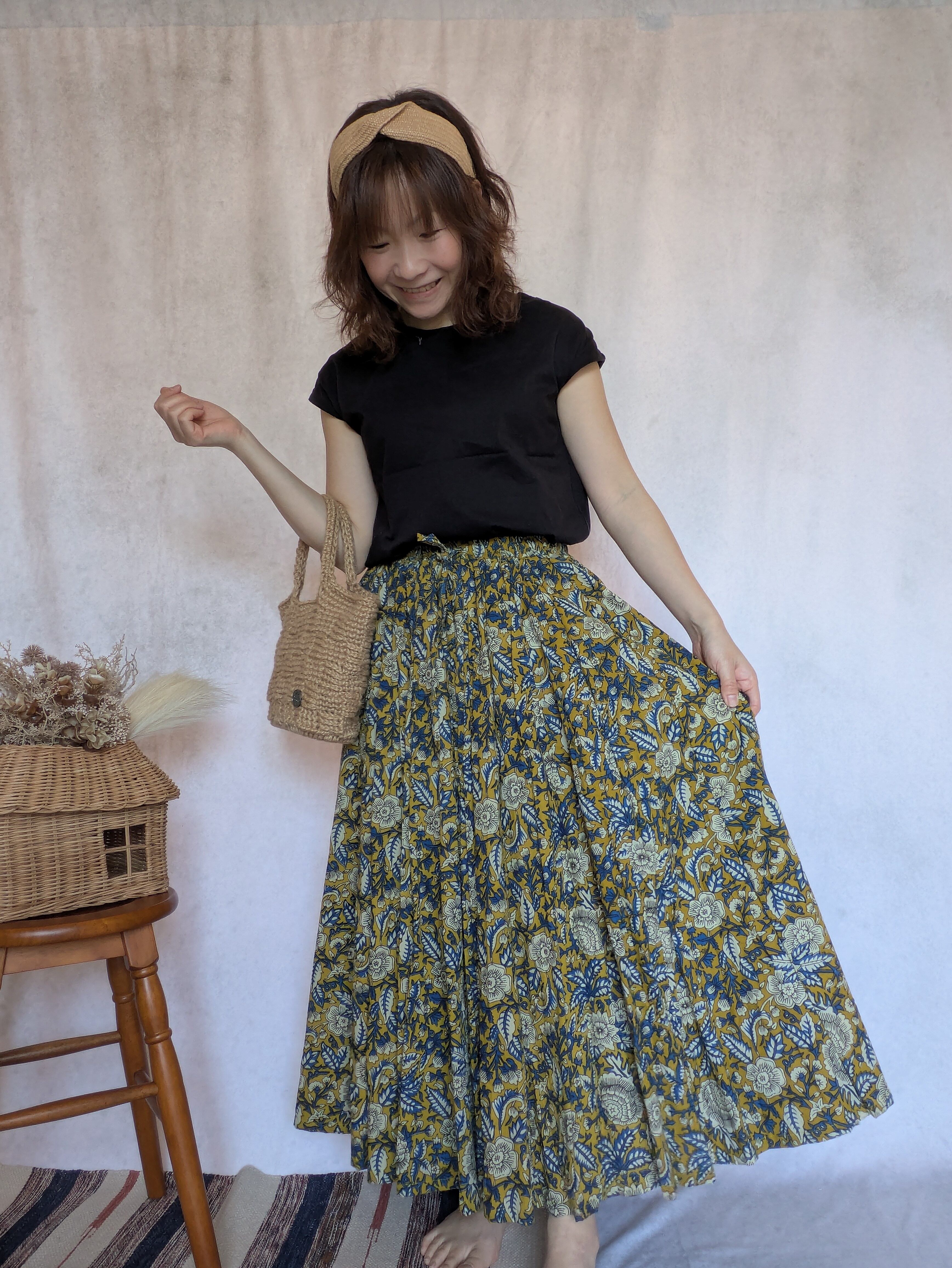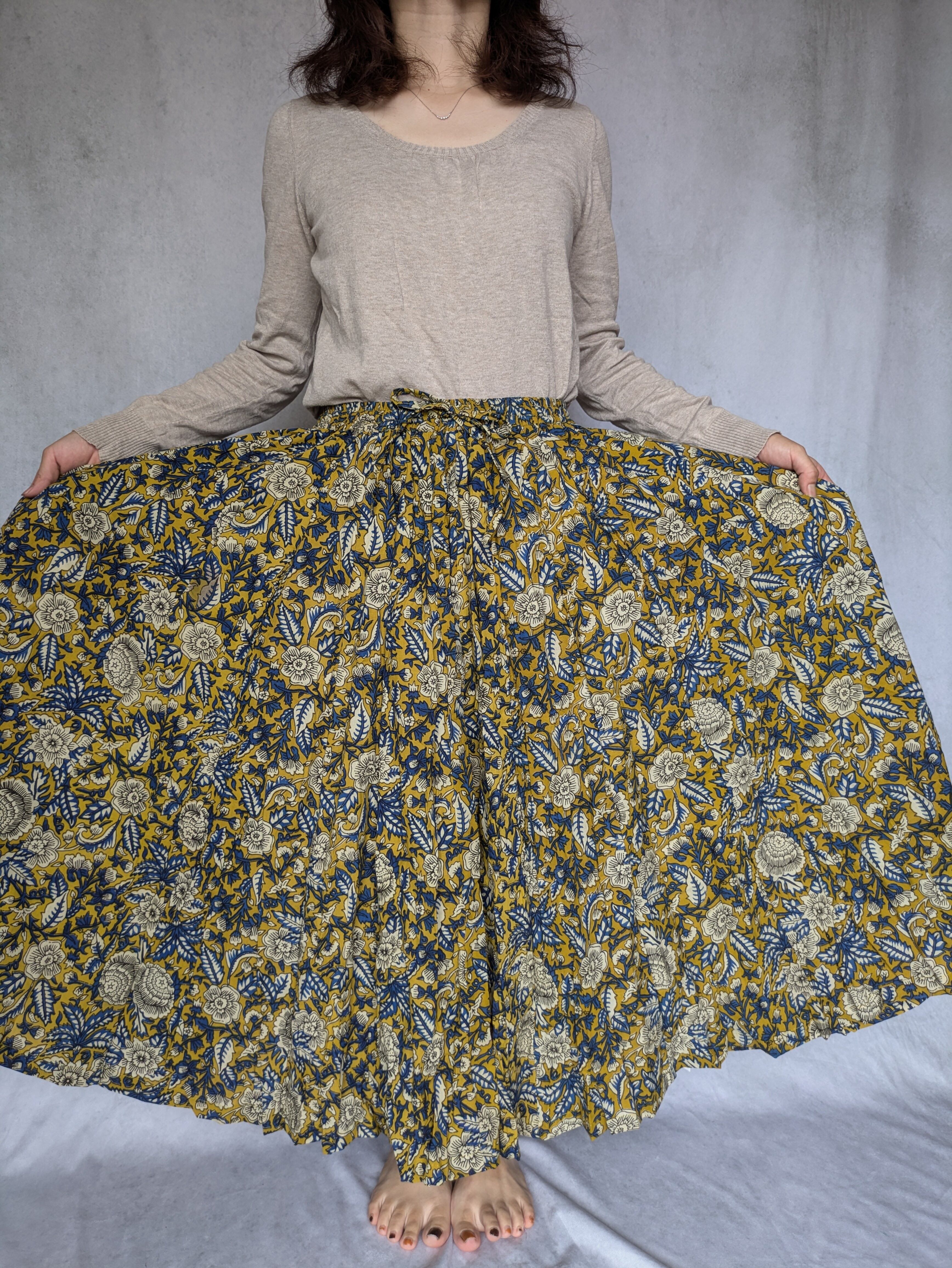 こちらは、インドの伝統工芸であるハンドブロックプリントで作られたスカートです。