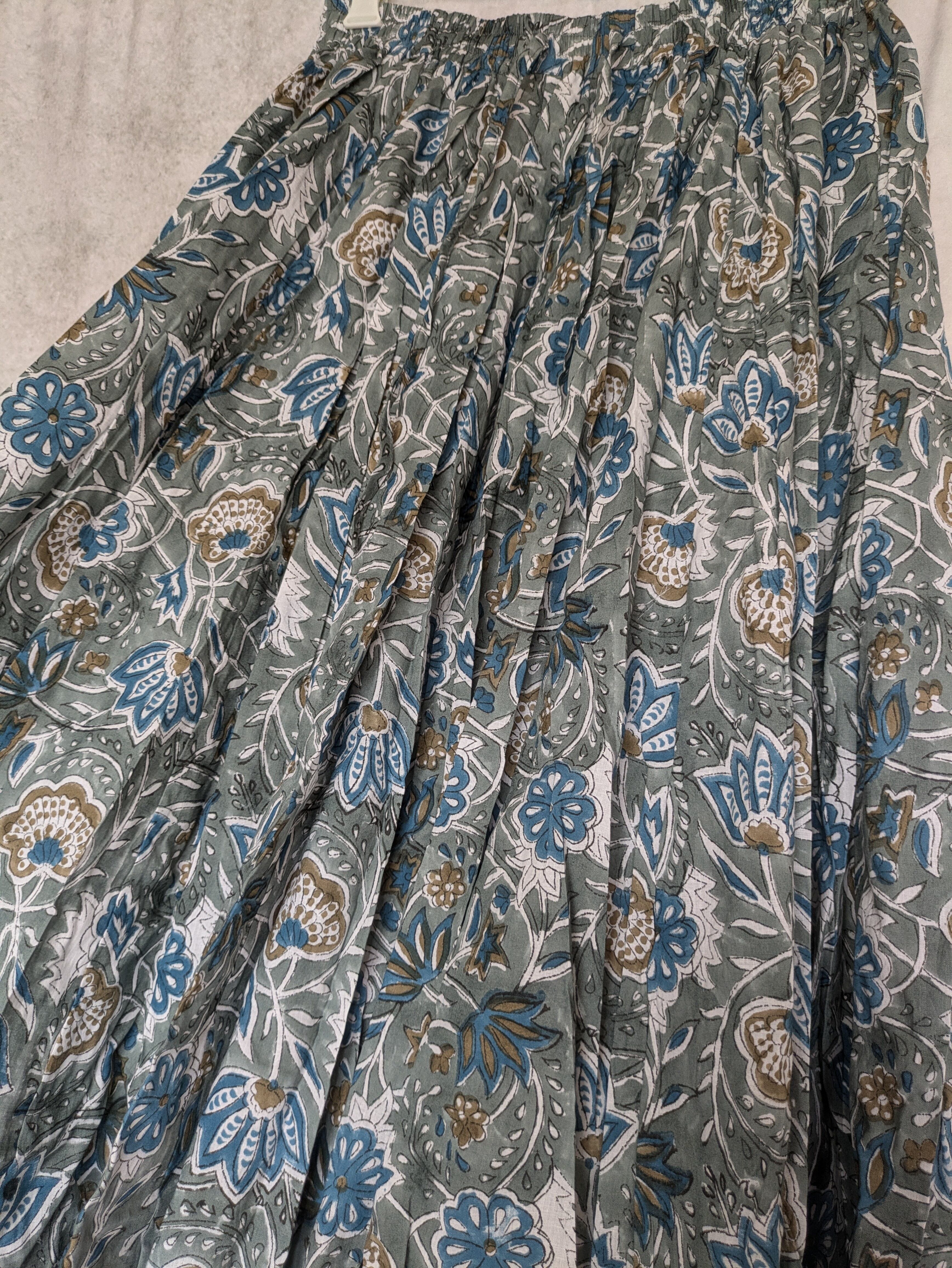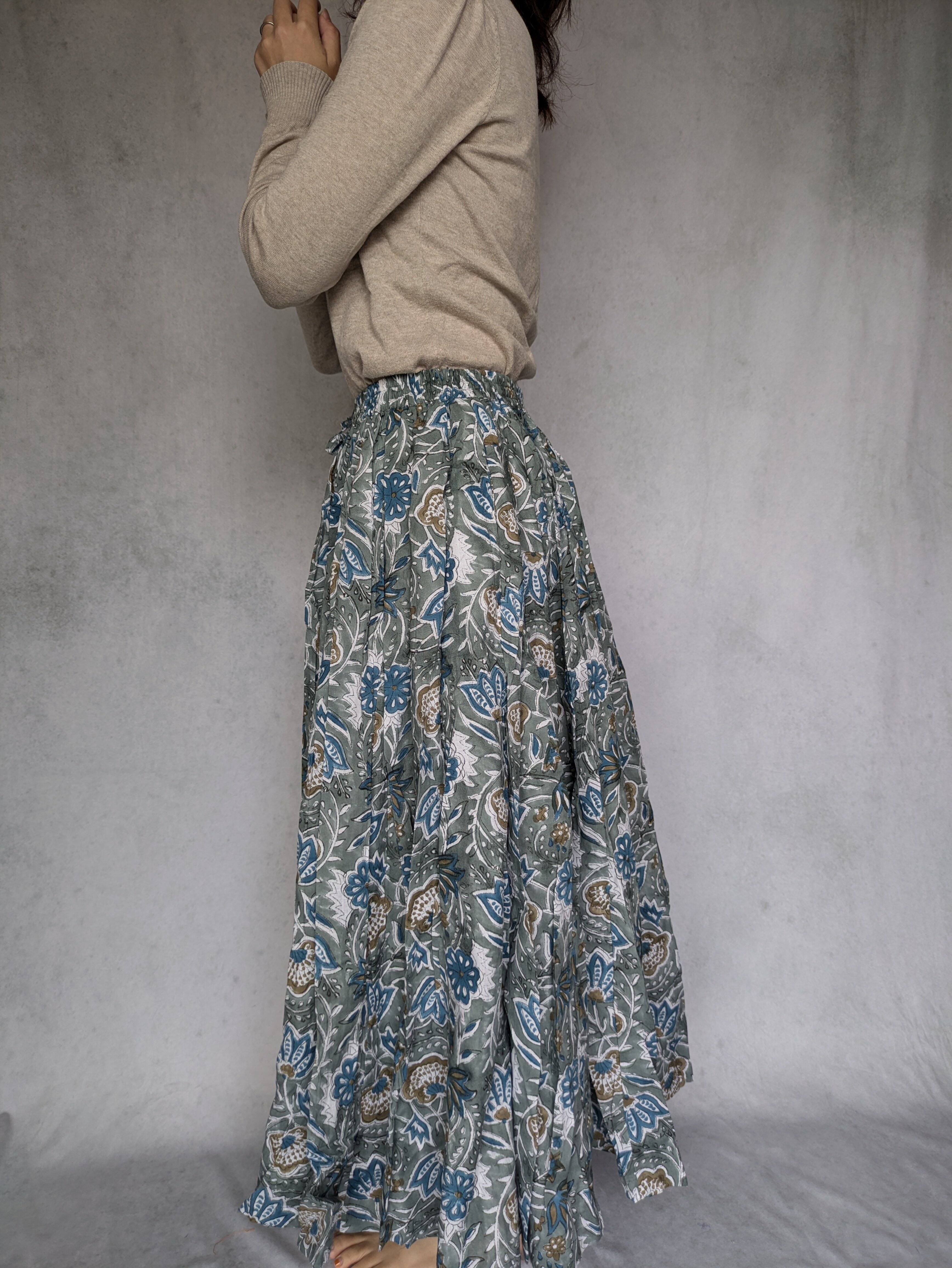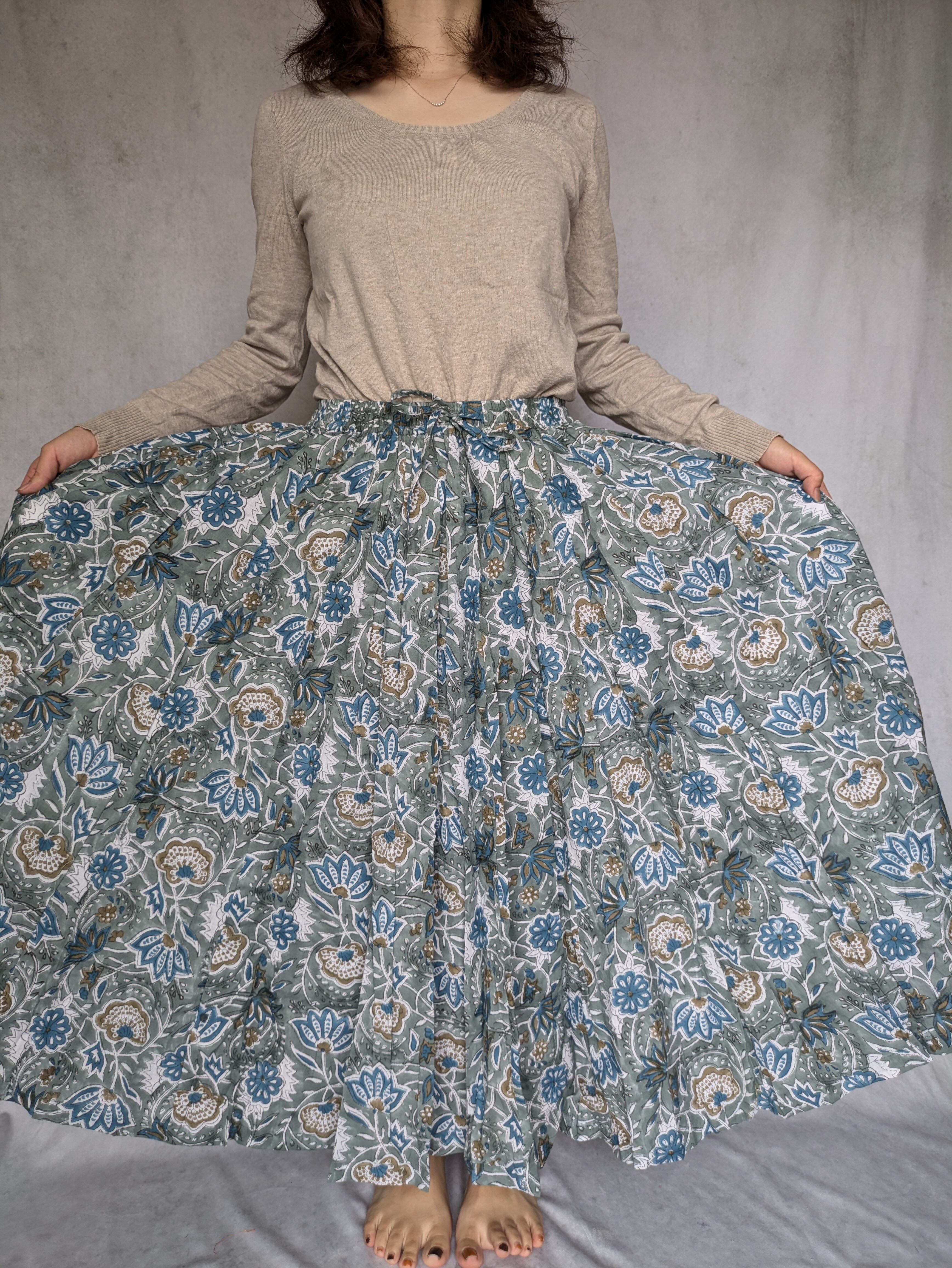 こちらは、インドの伝統工芸であるハンドブロックプリントで作られたスカートです。