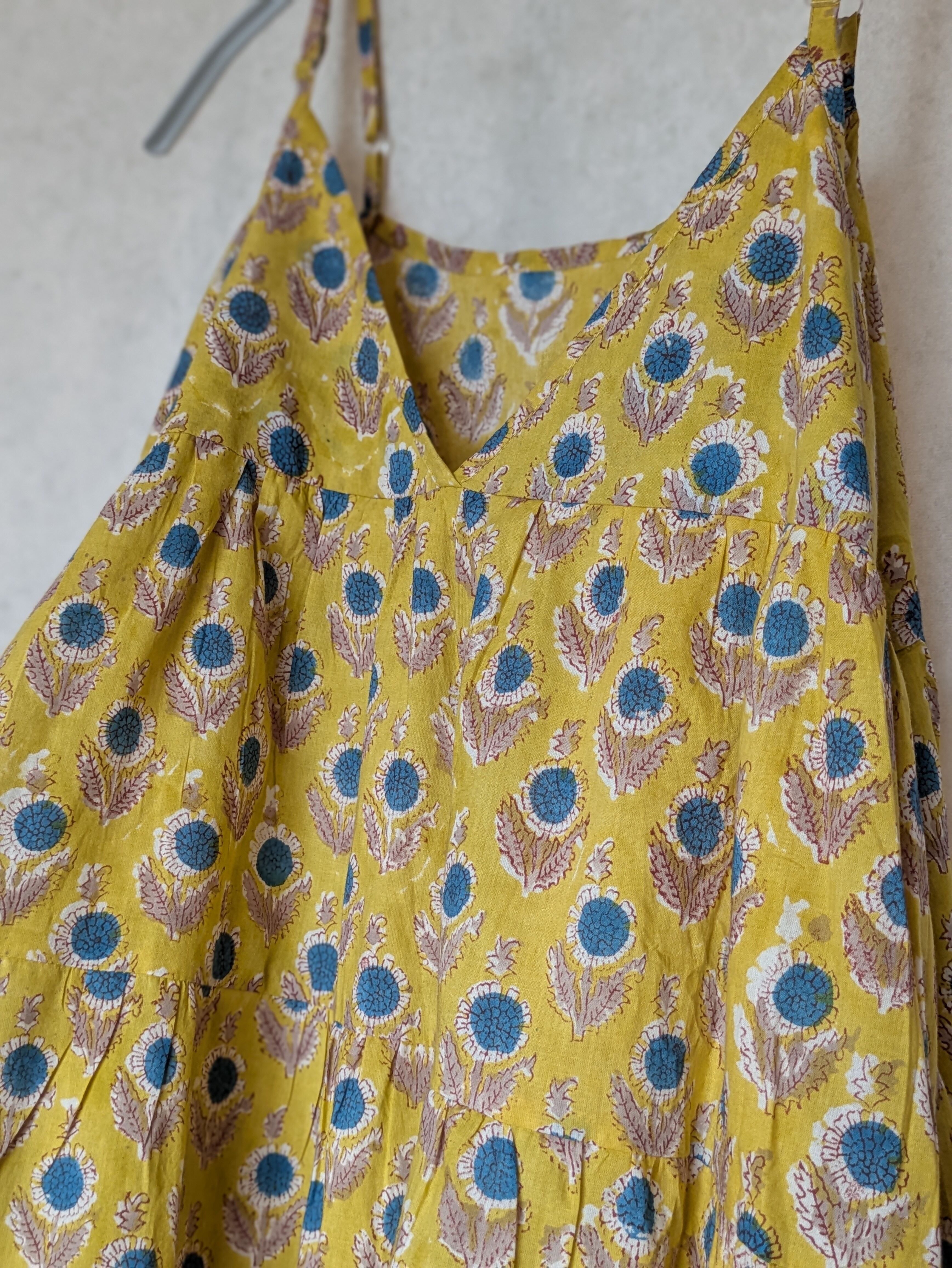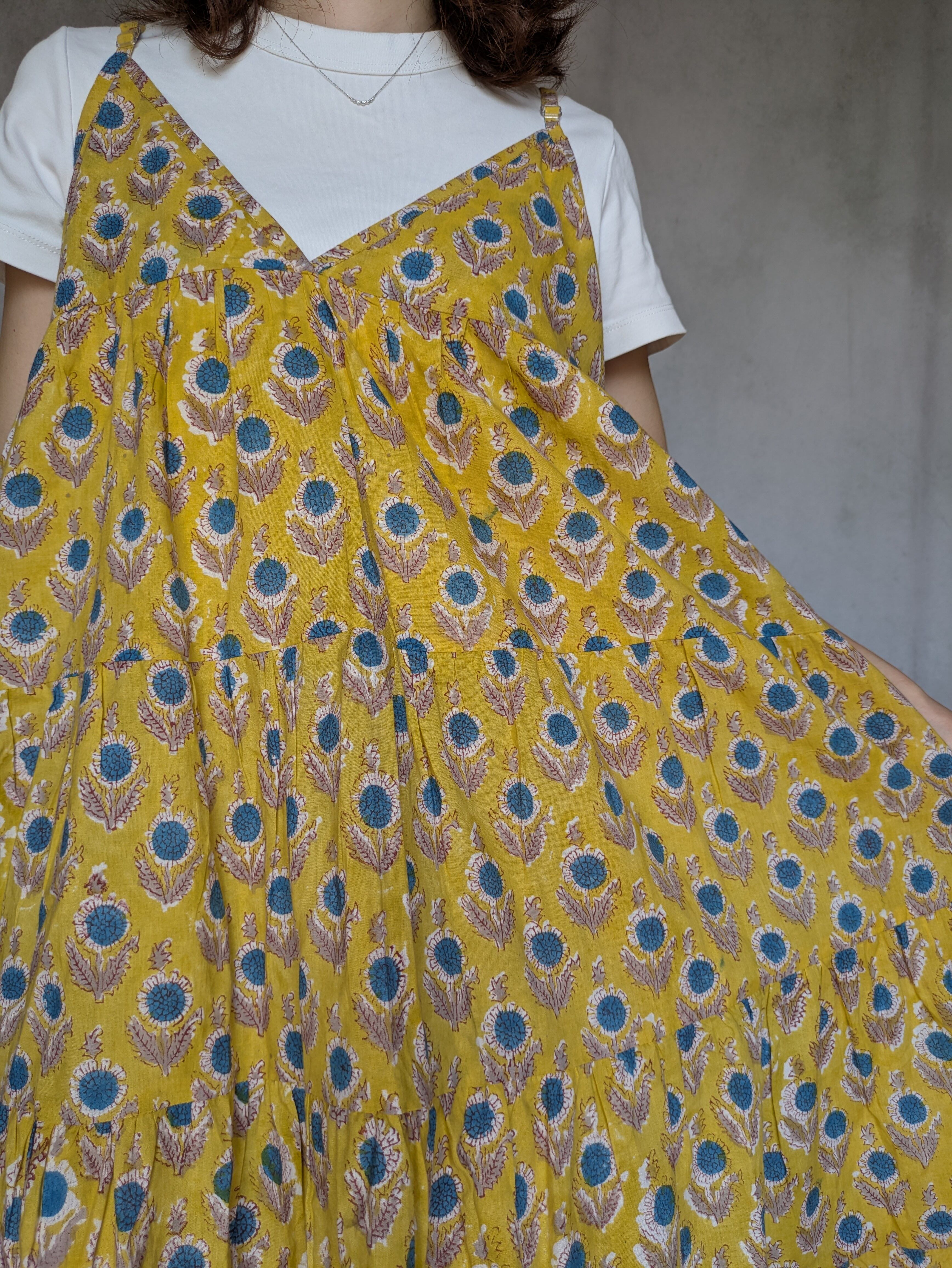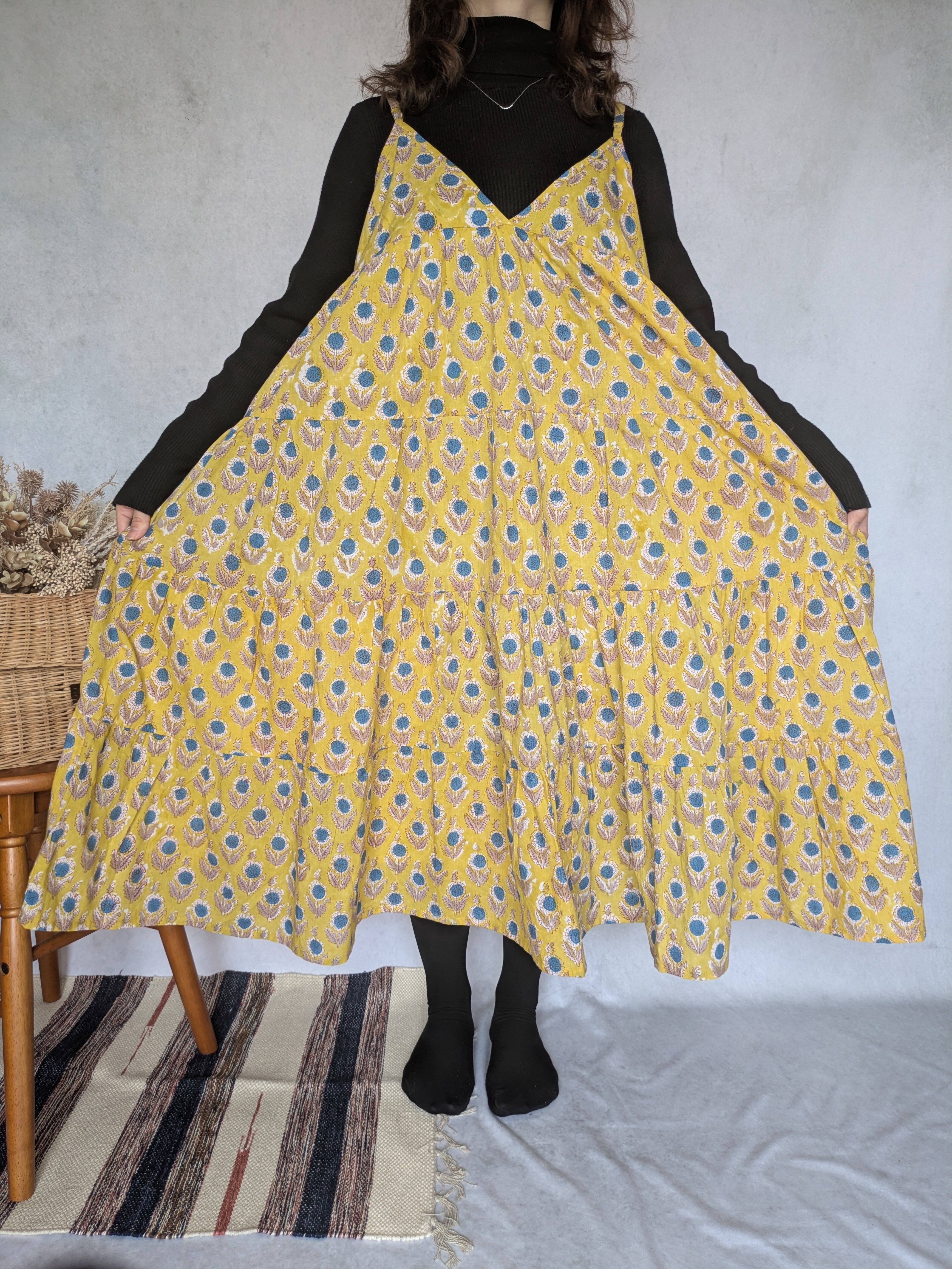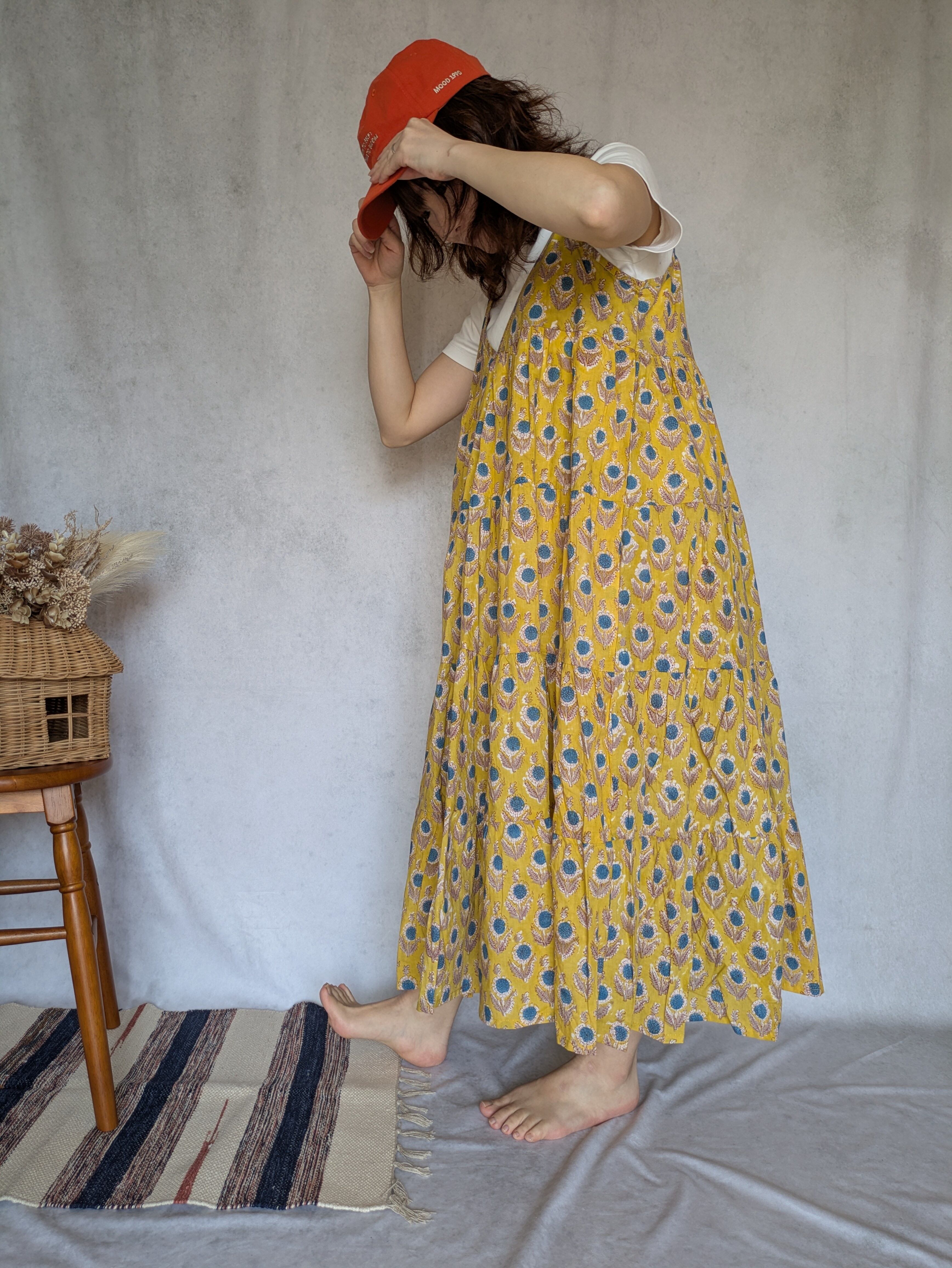 こちらは、インドの伝統工芸であるハンドブロックプリントで作られたワンピースです。