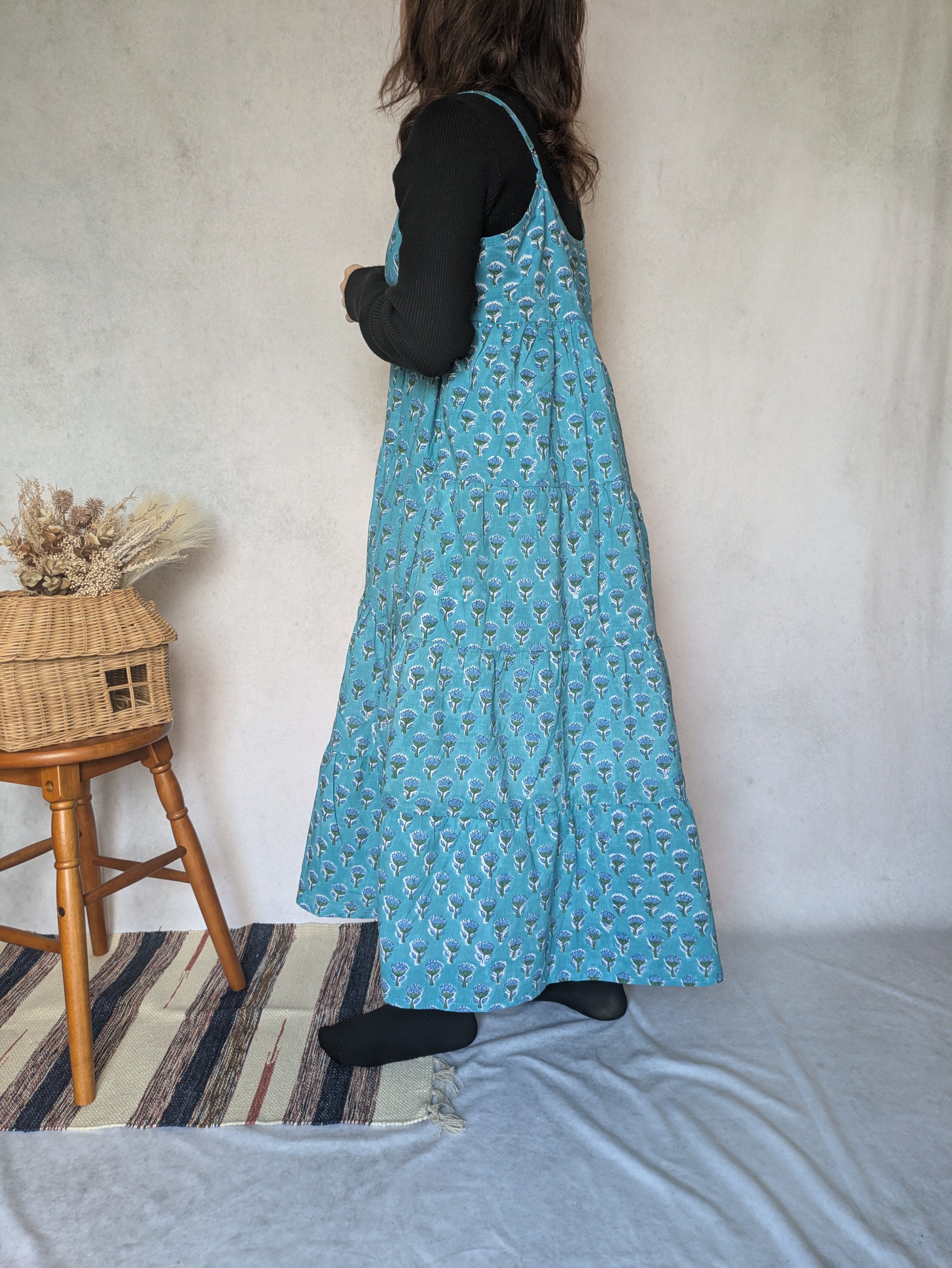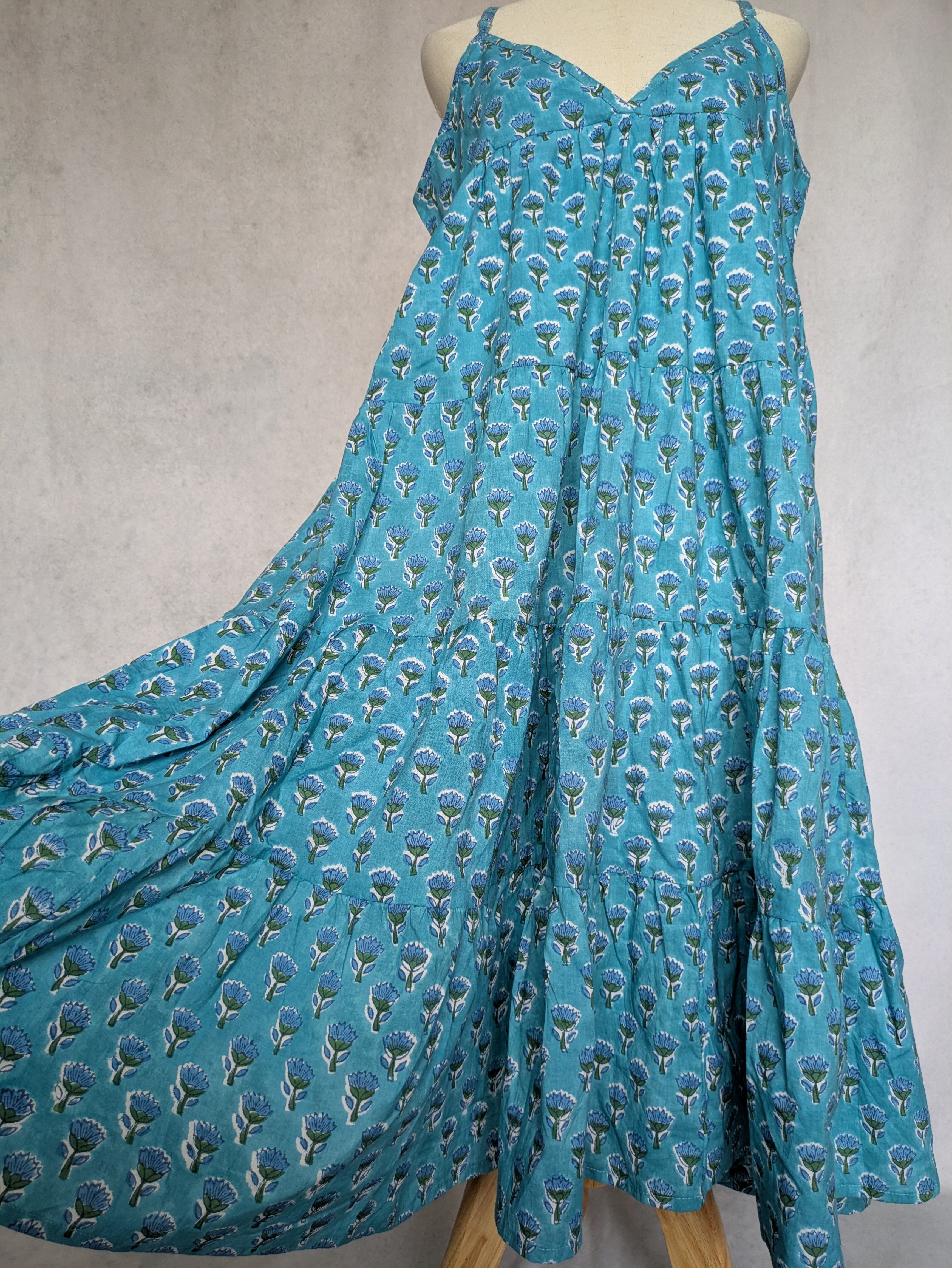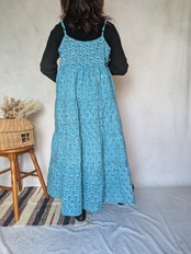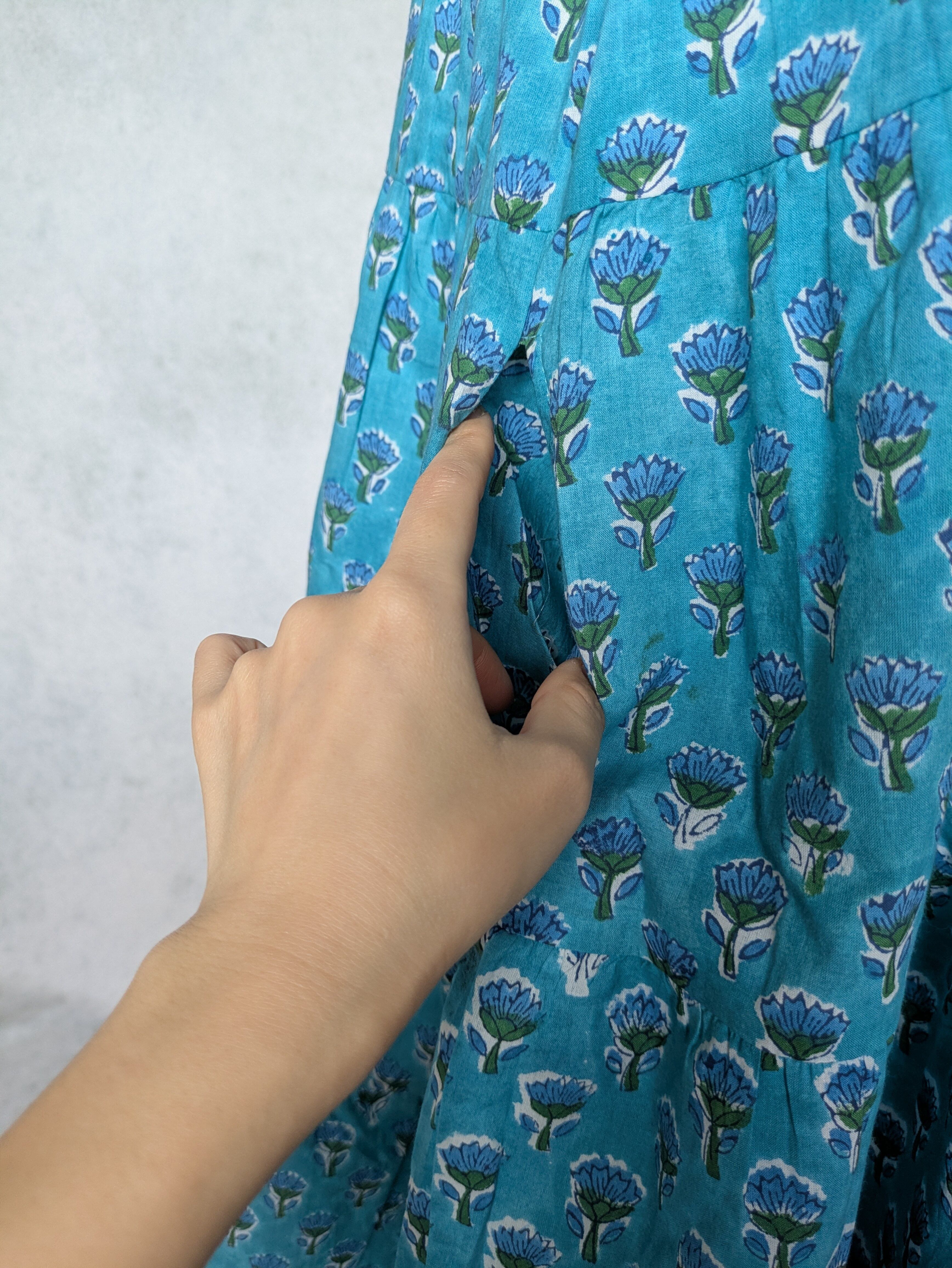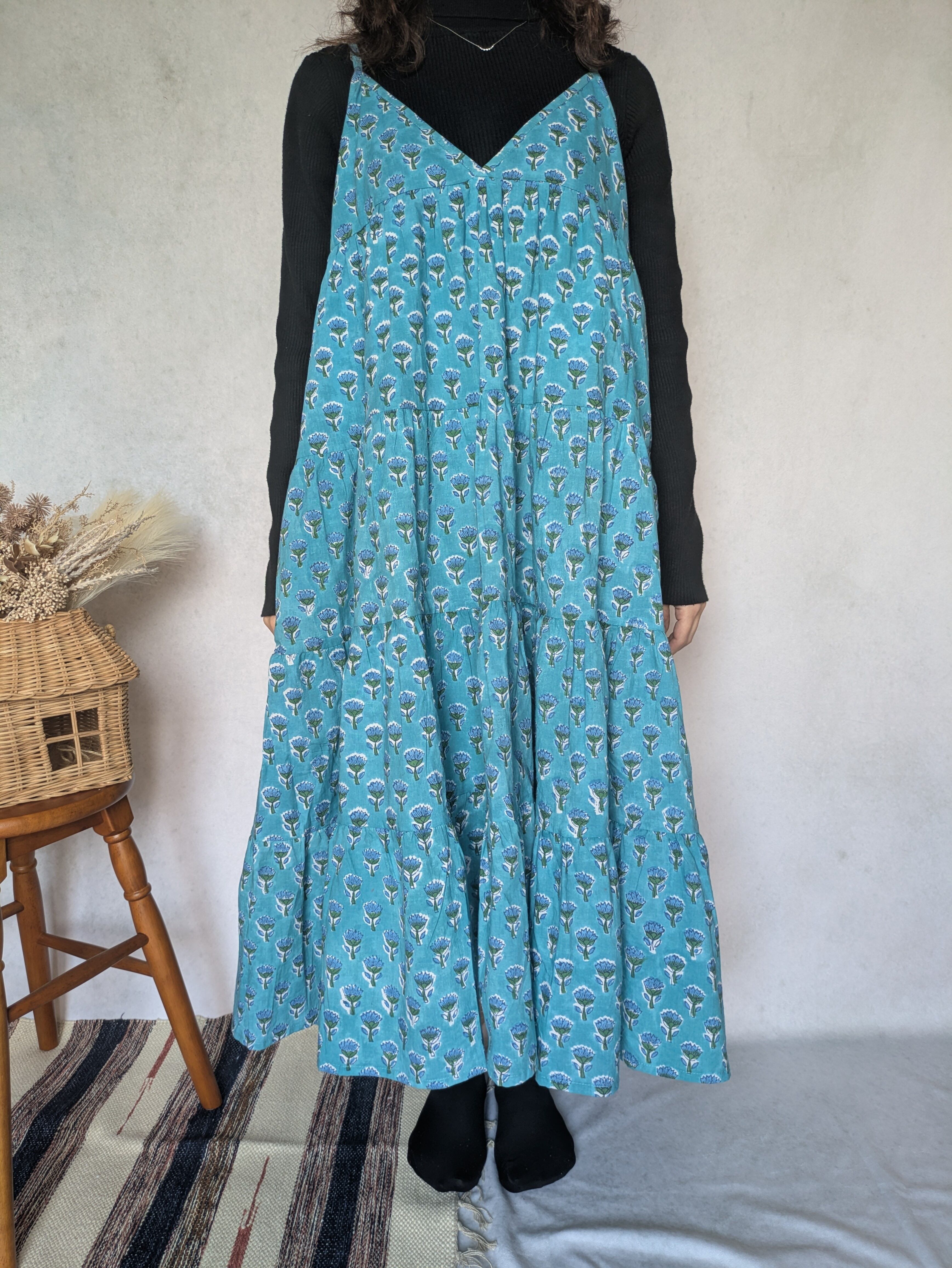 こちらは、インドの伝統工芸であるハンドブロックプリントで作られたワンピースです。